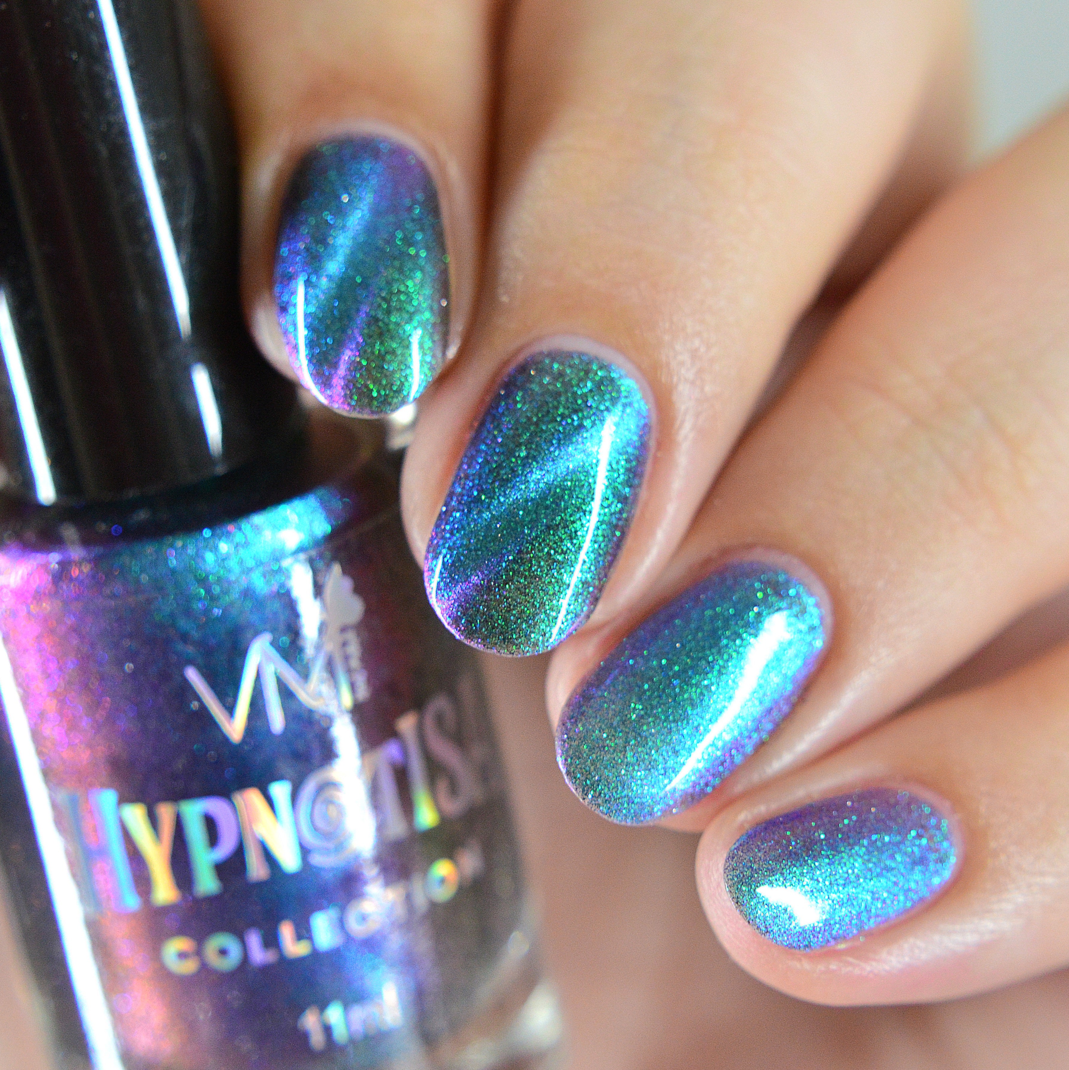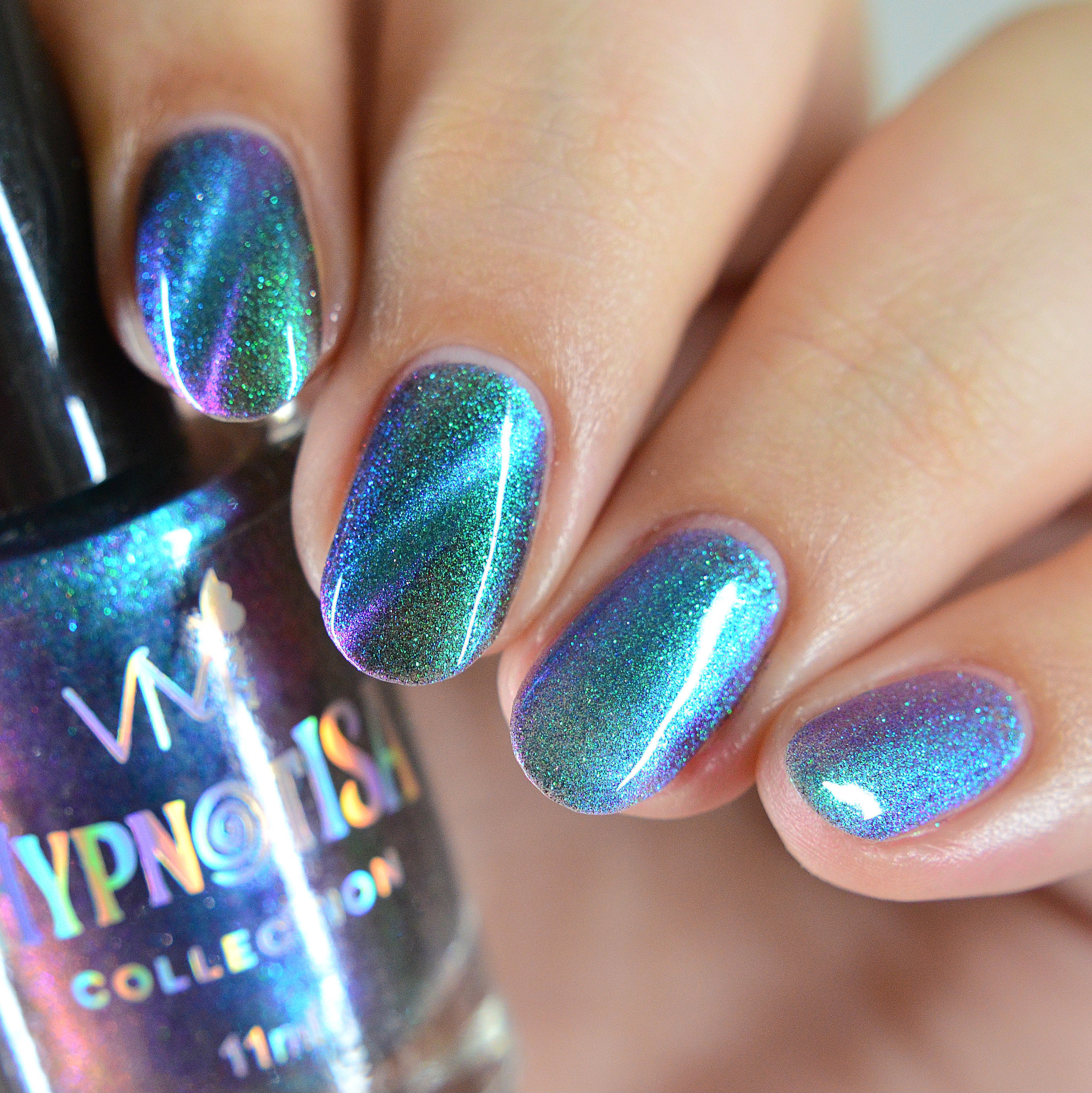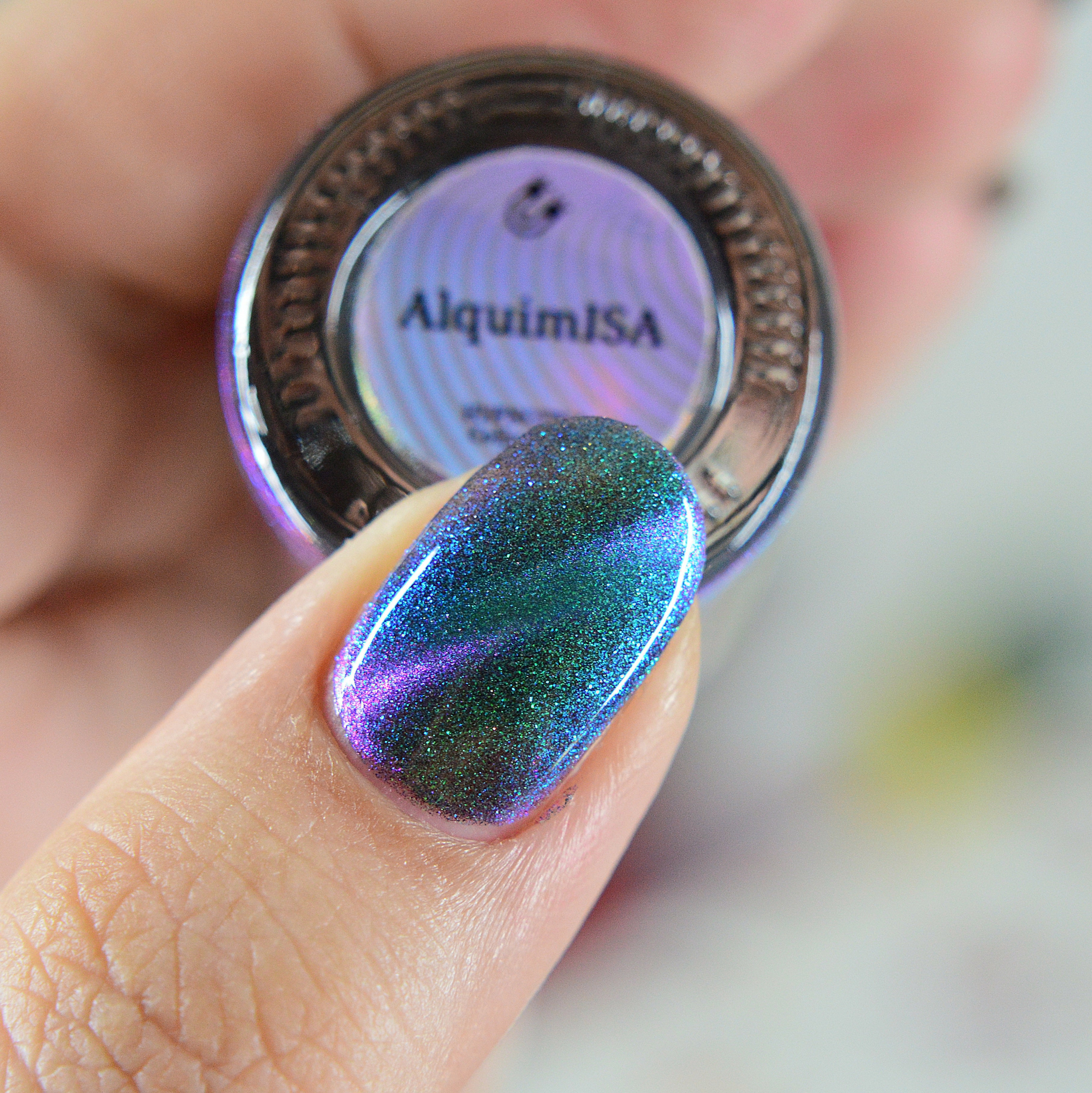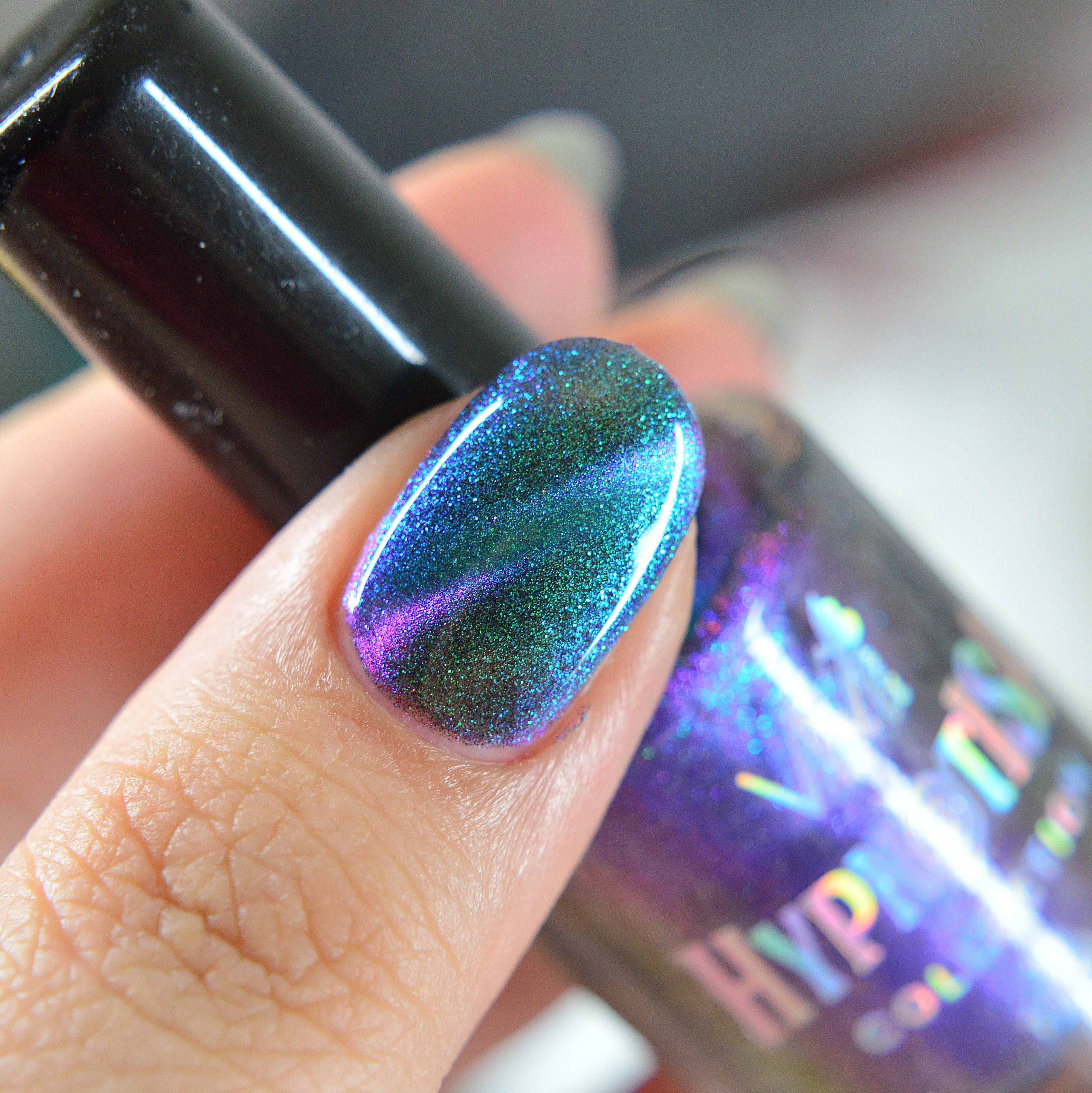 Little Star - a subtley smokey base with bright blue-purple shifting iridescent shimmer and holographic micro flakes.
