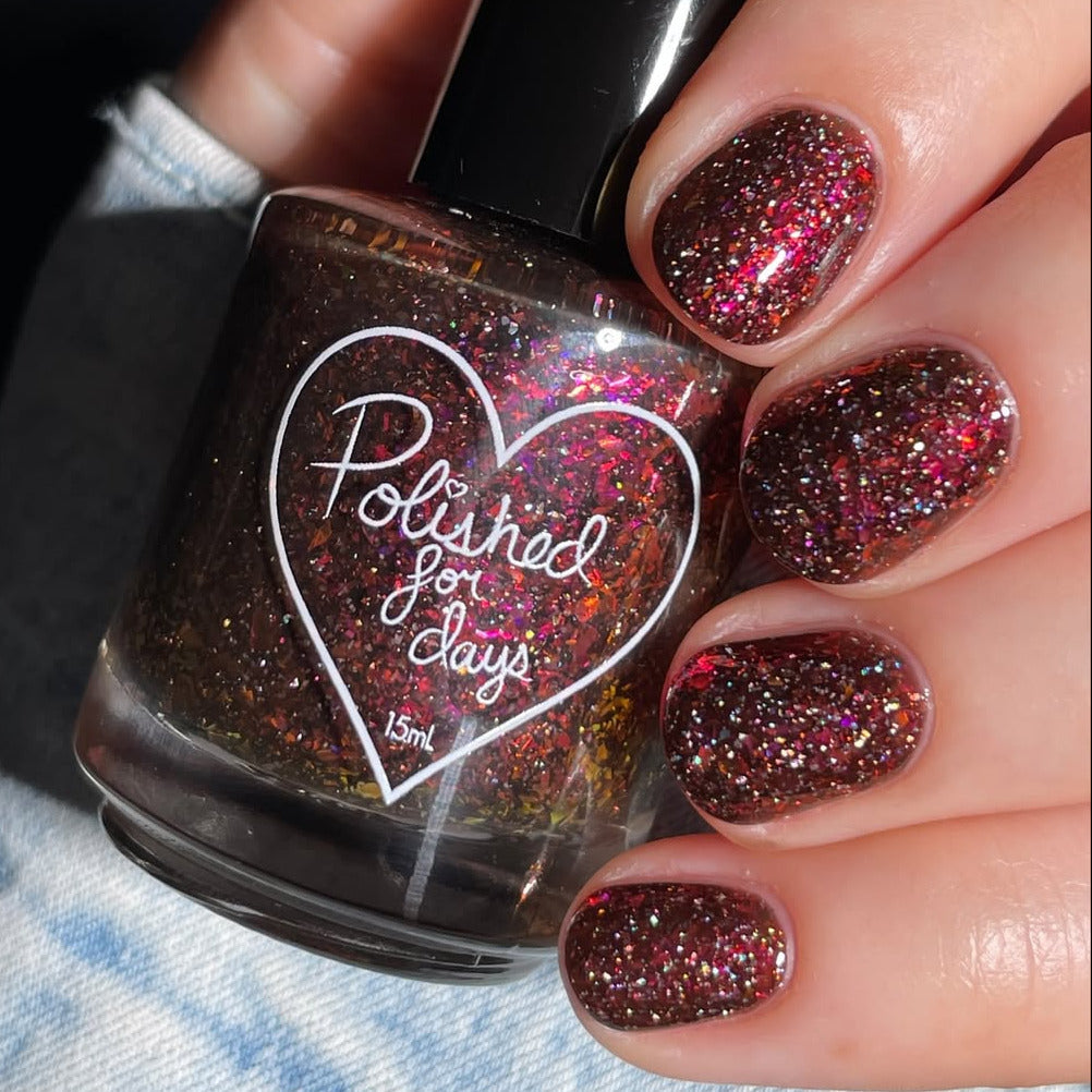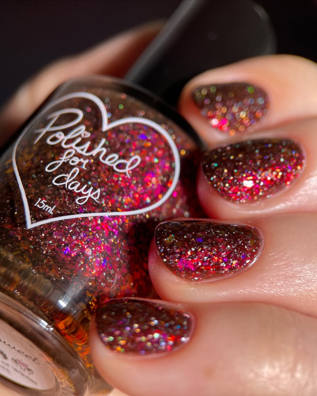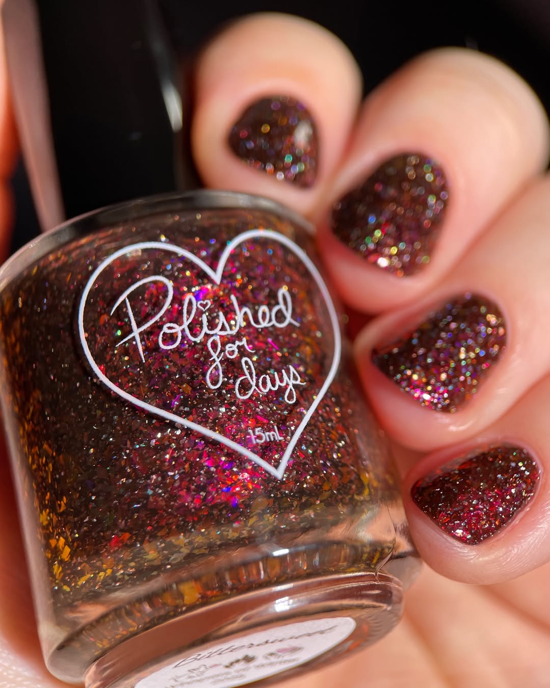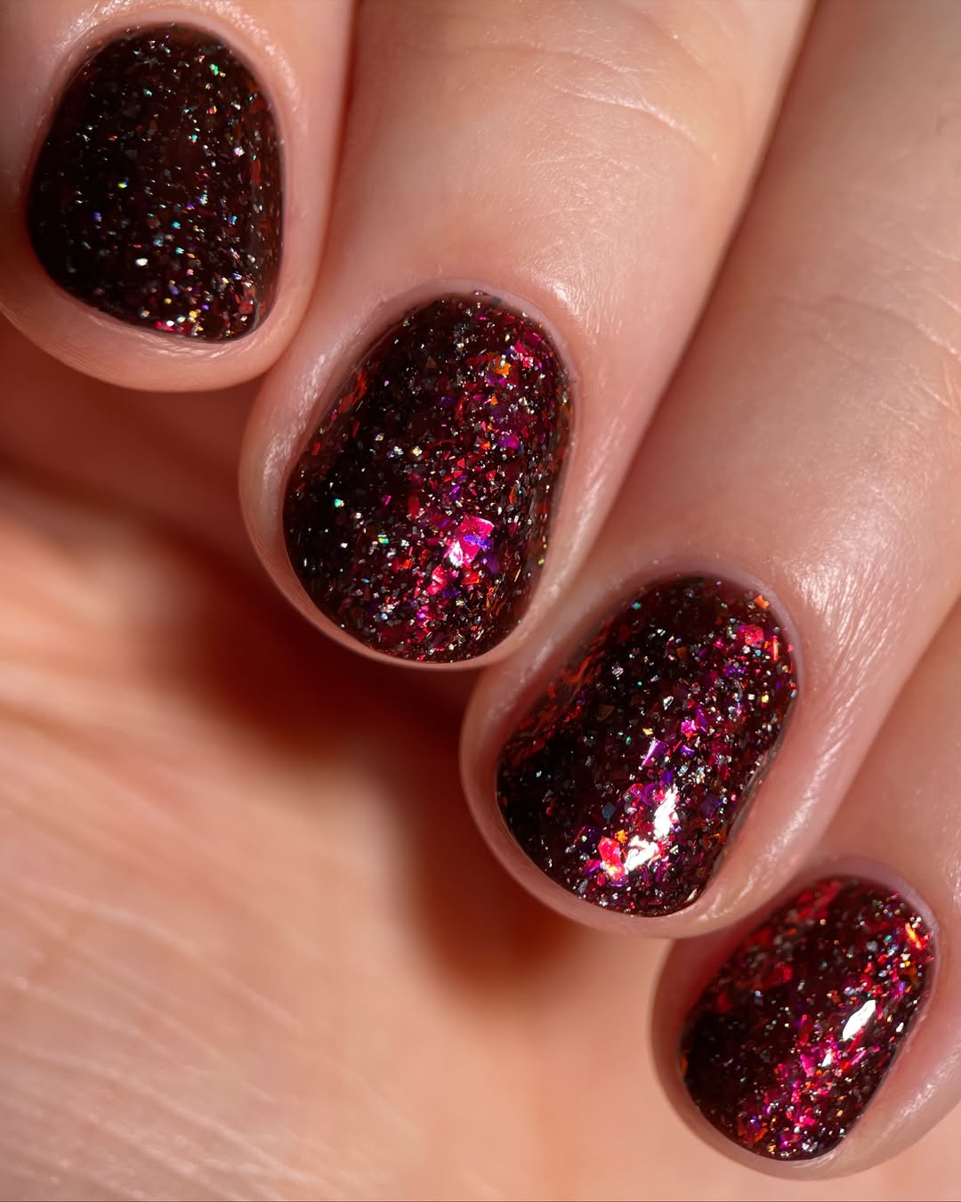 Bittersweet - a chocolate base with pink-orange-yellow shifting iridescent flakes and holographic silver flakes.