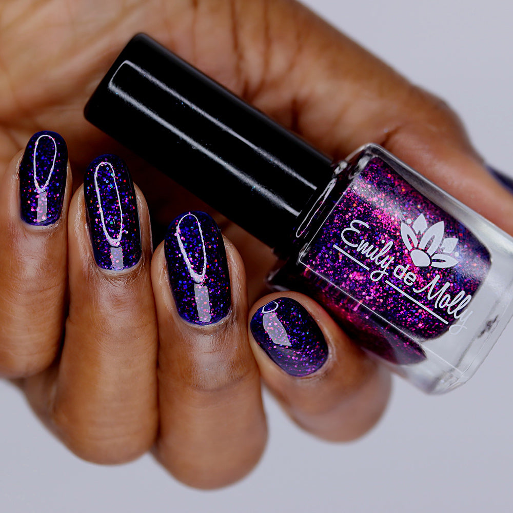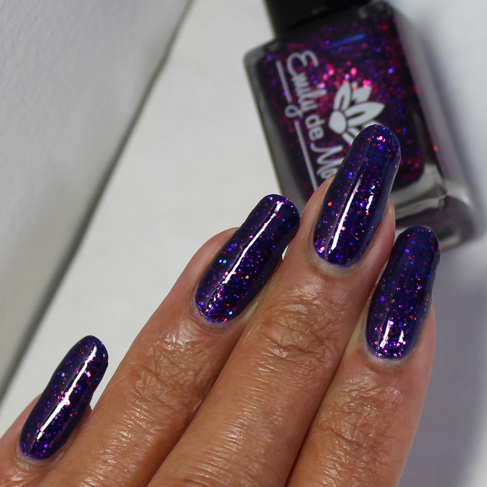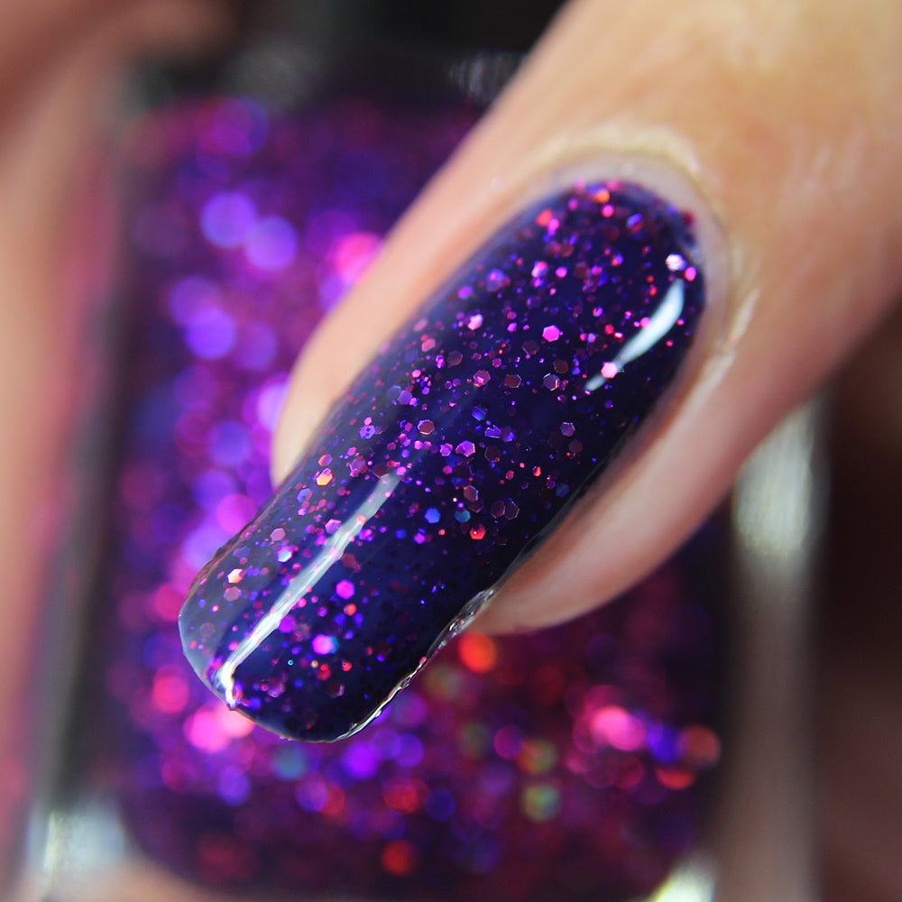 A deep blurple jelly nail polish packed with fuchsia holographic glitters.