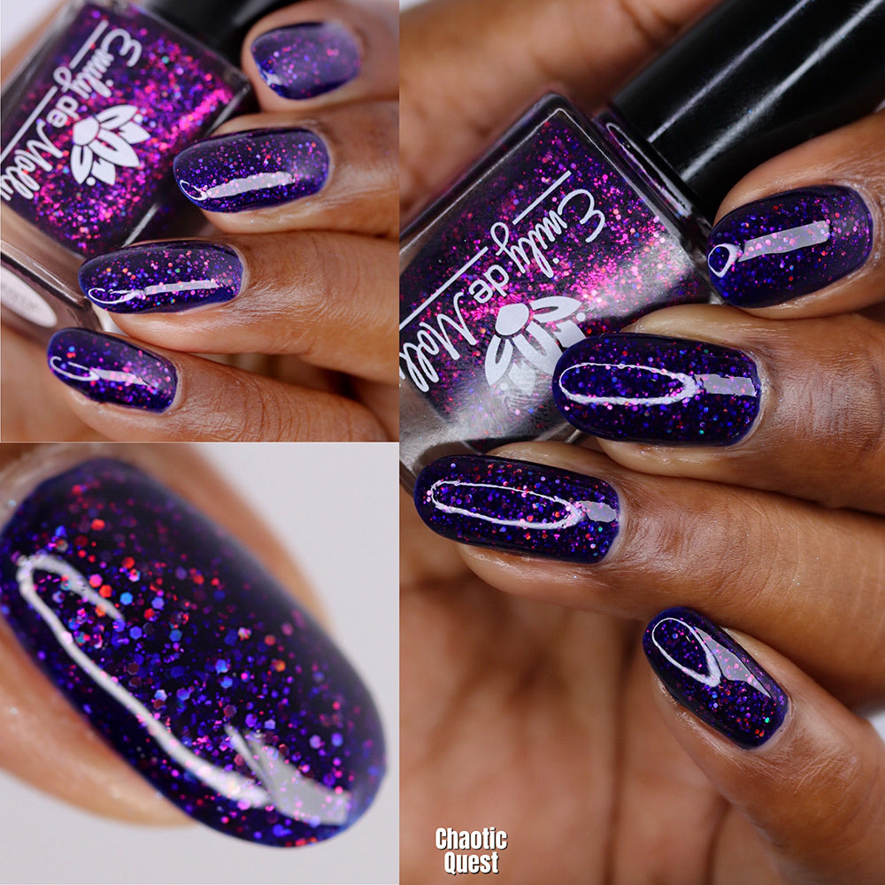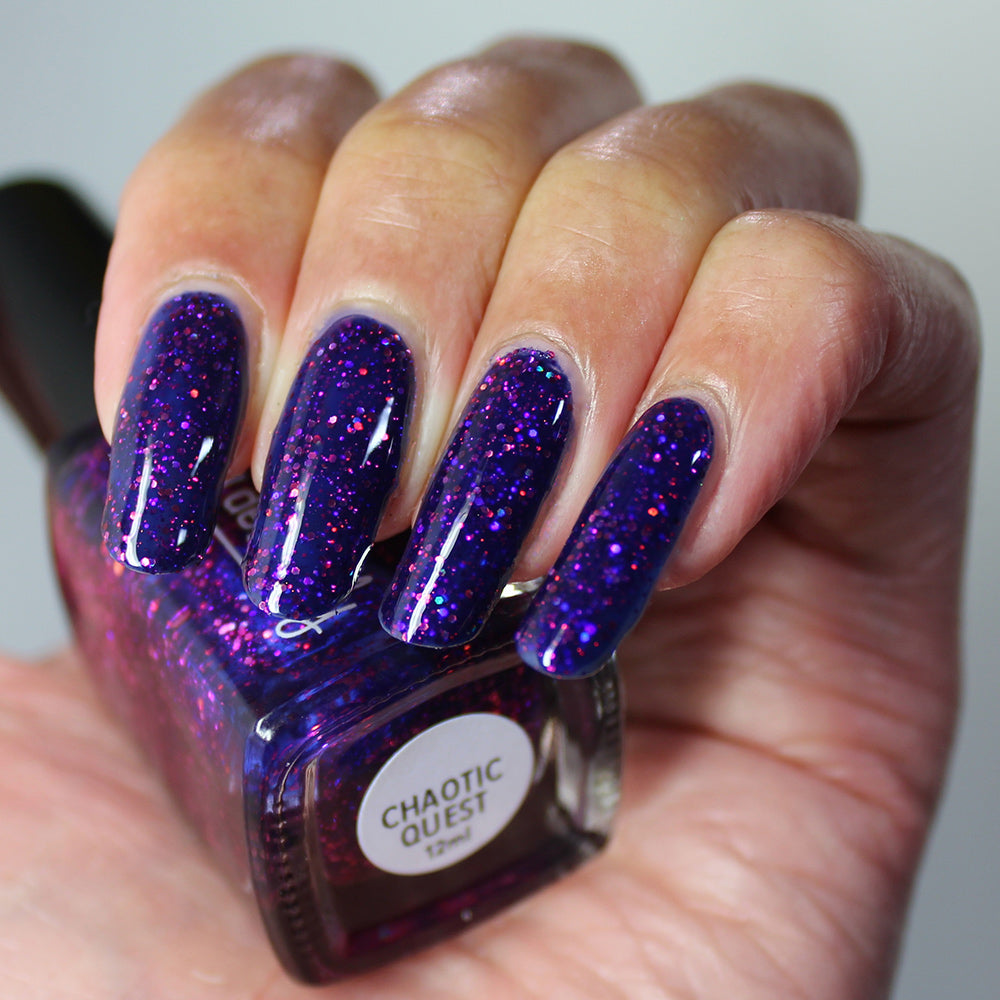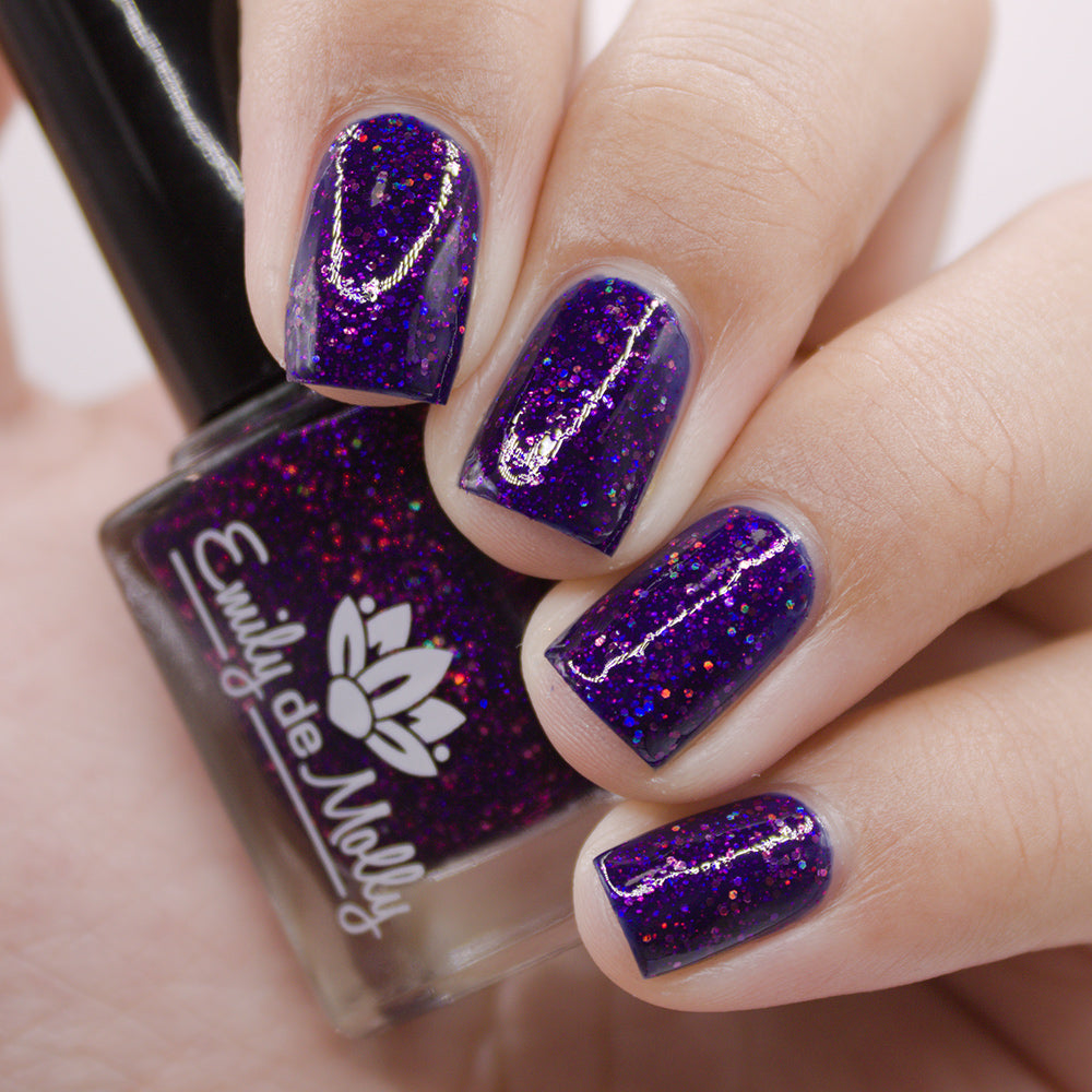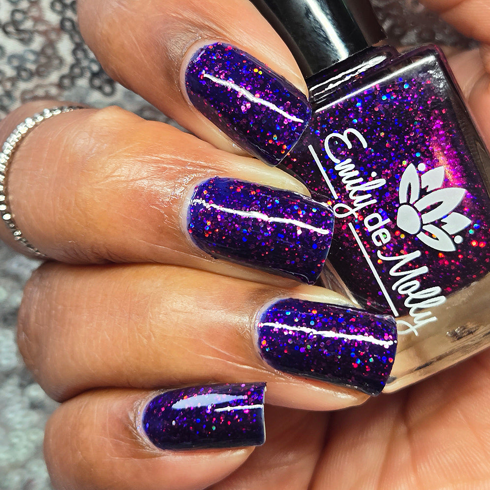 A deep blurple jelly nail polish packed with fuchsia holographic glitters.
