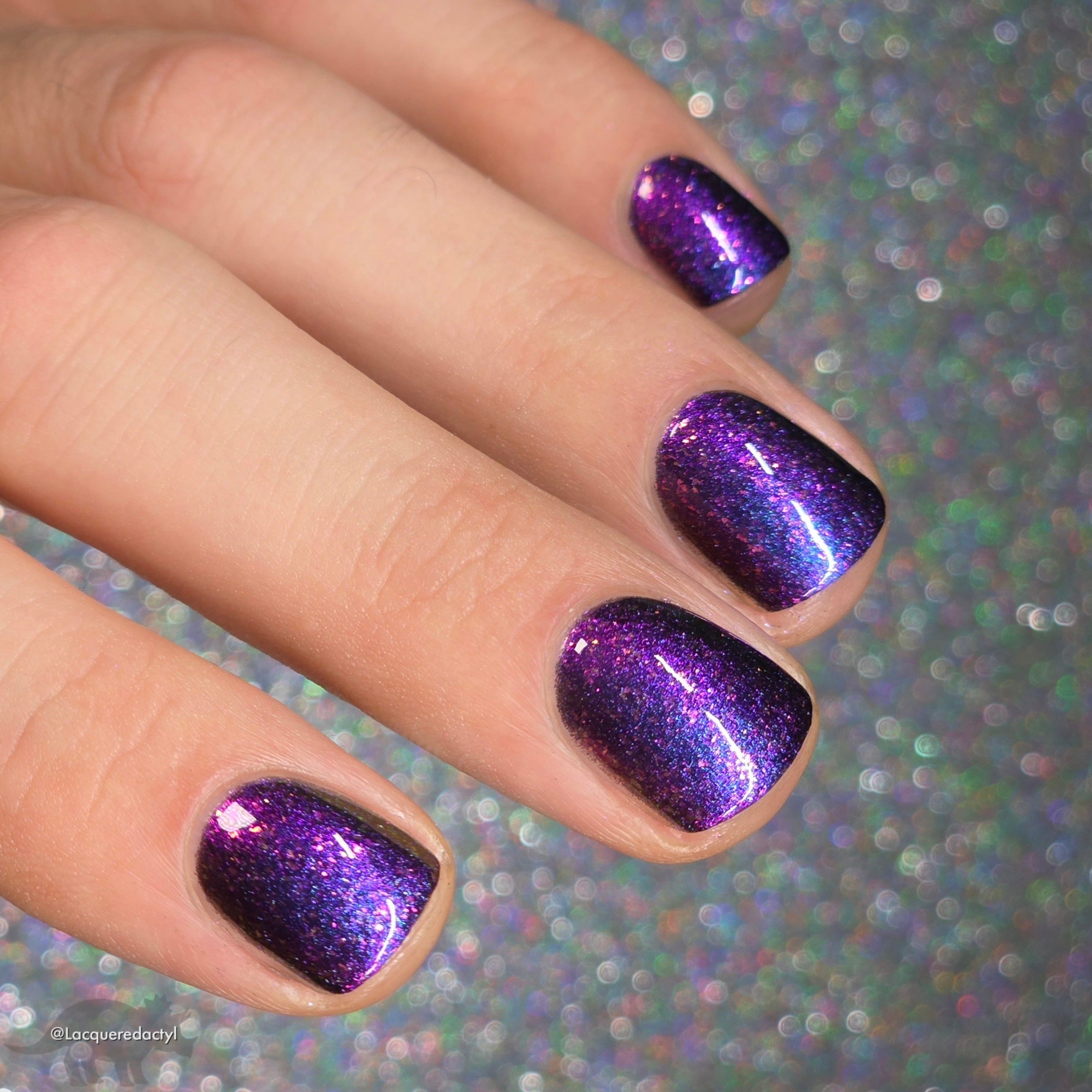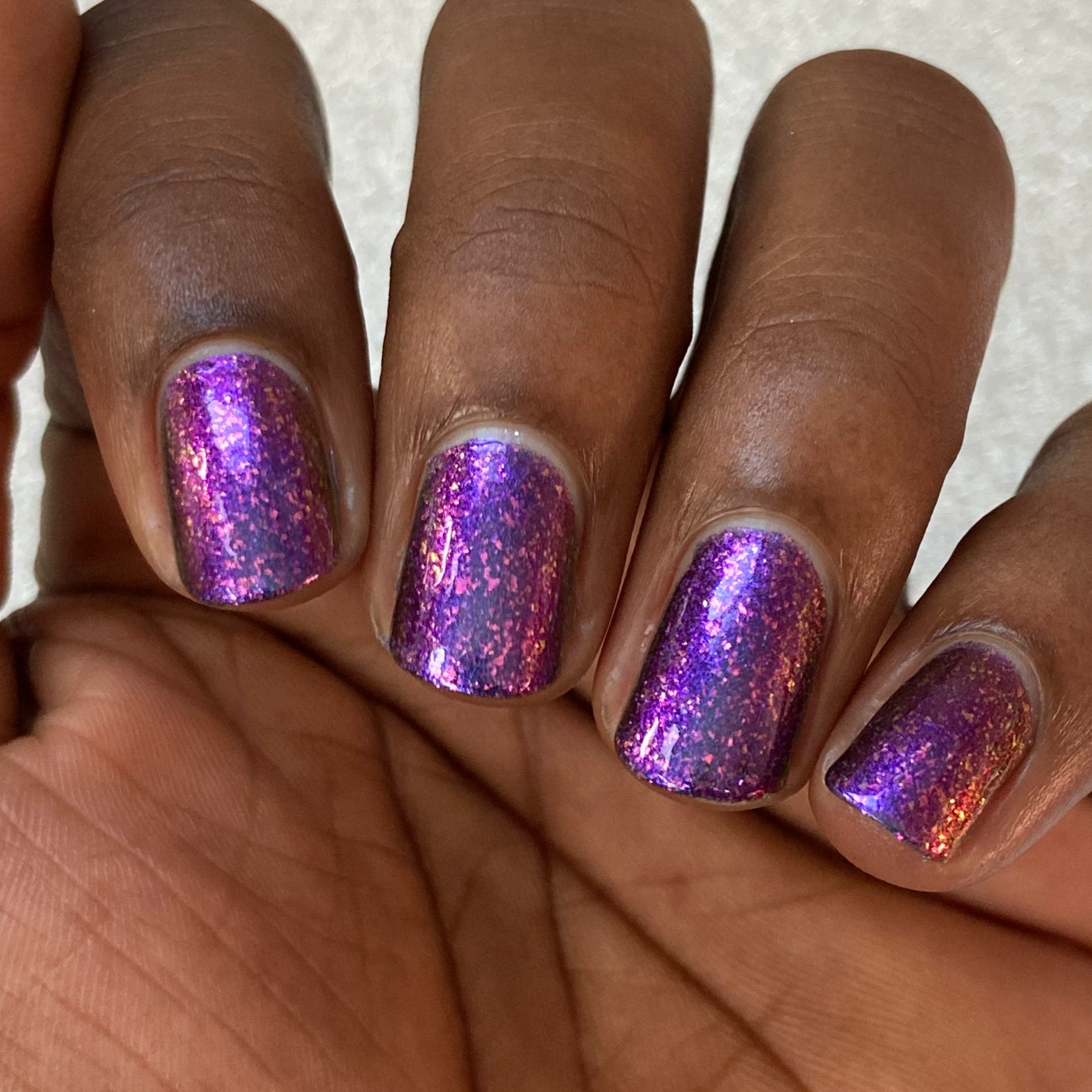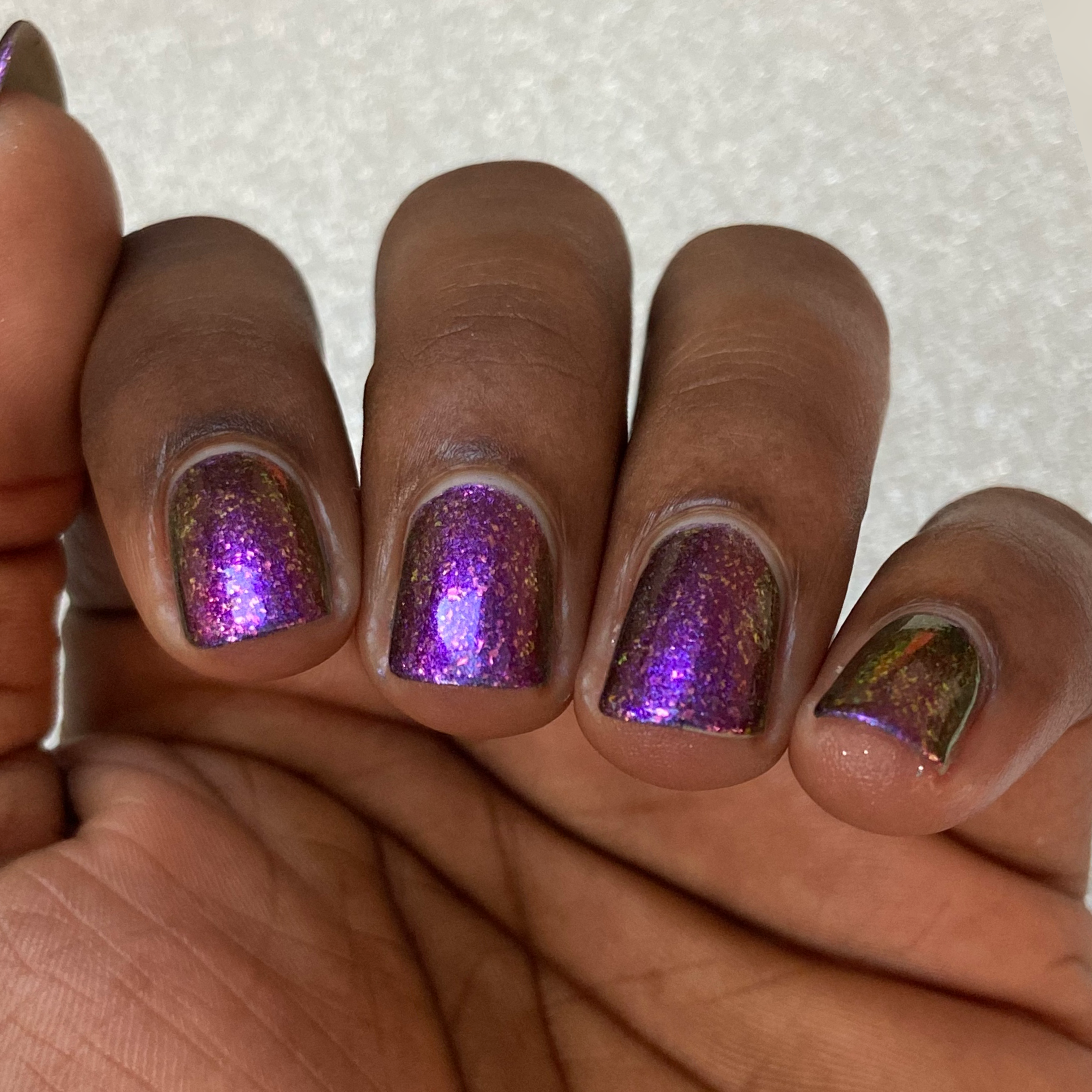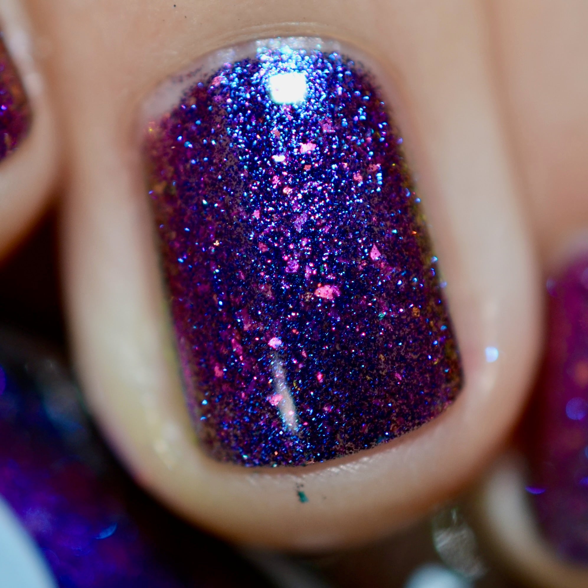 Little Star - a subtley smokey base with bright blue-purple shifting iridescent shimmer and holographic micro flakes.