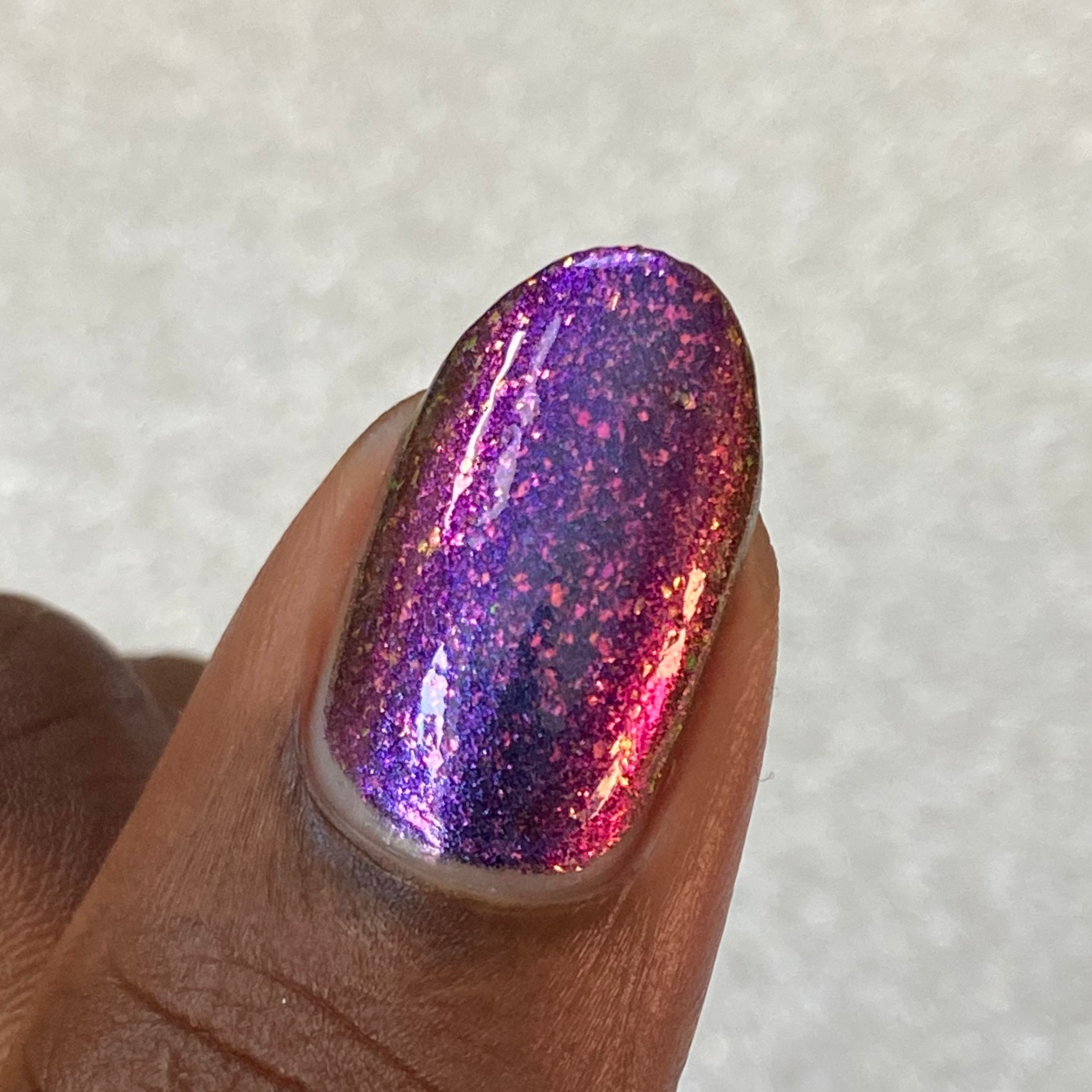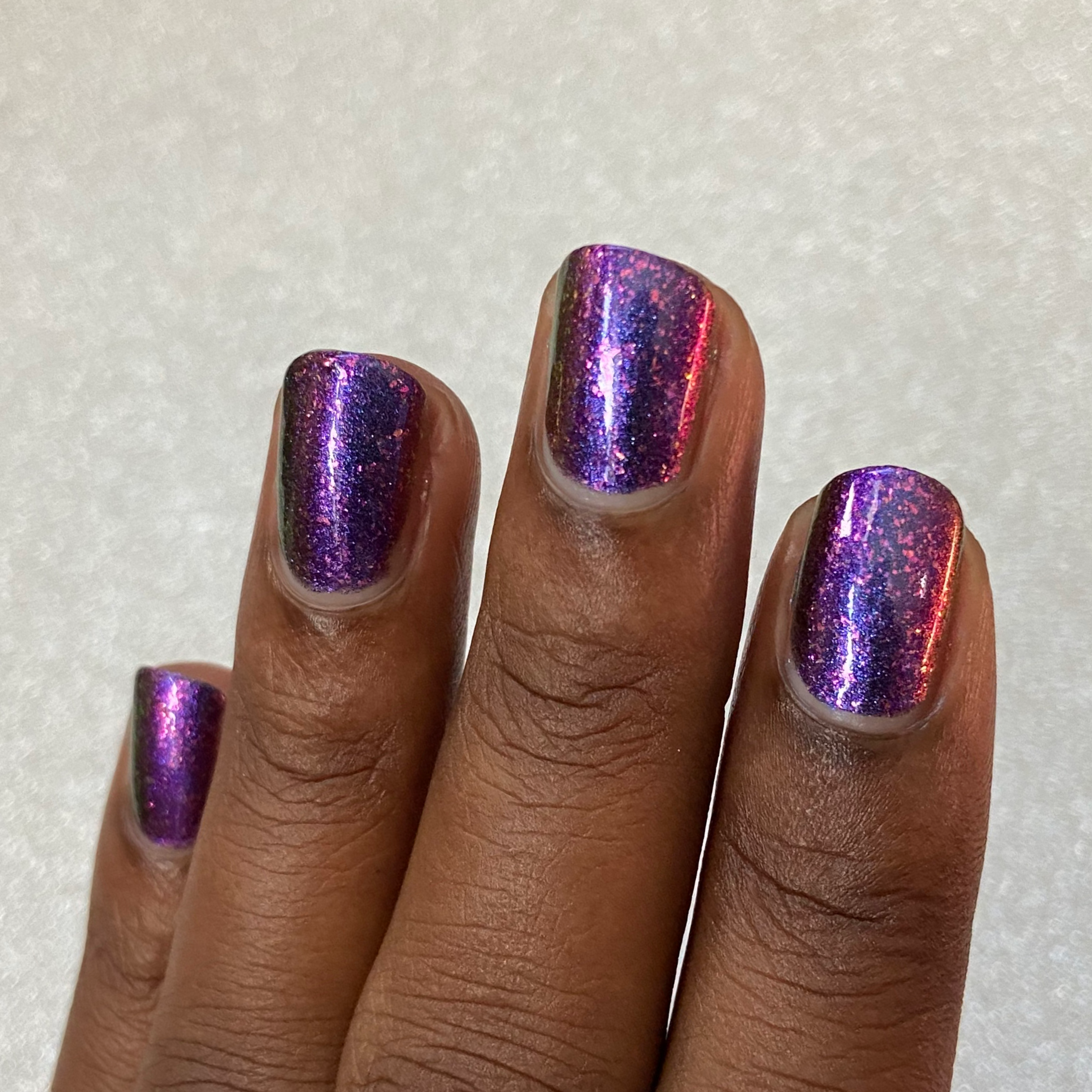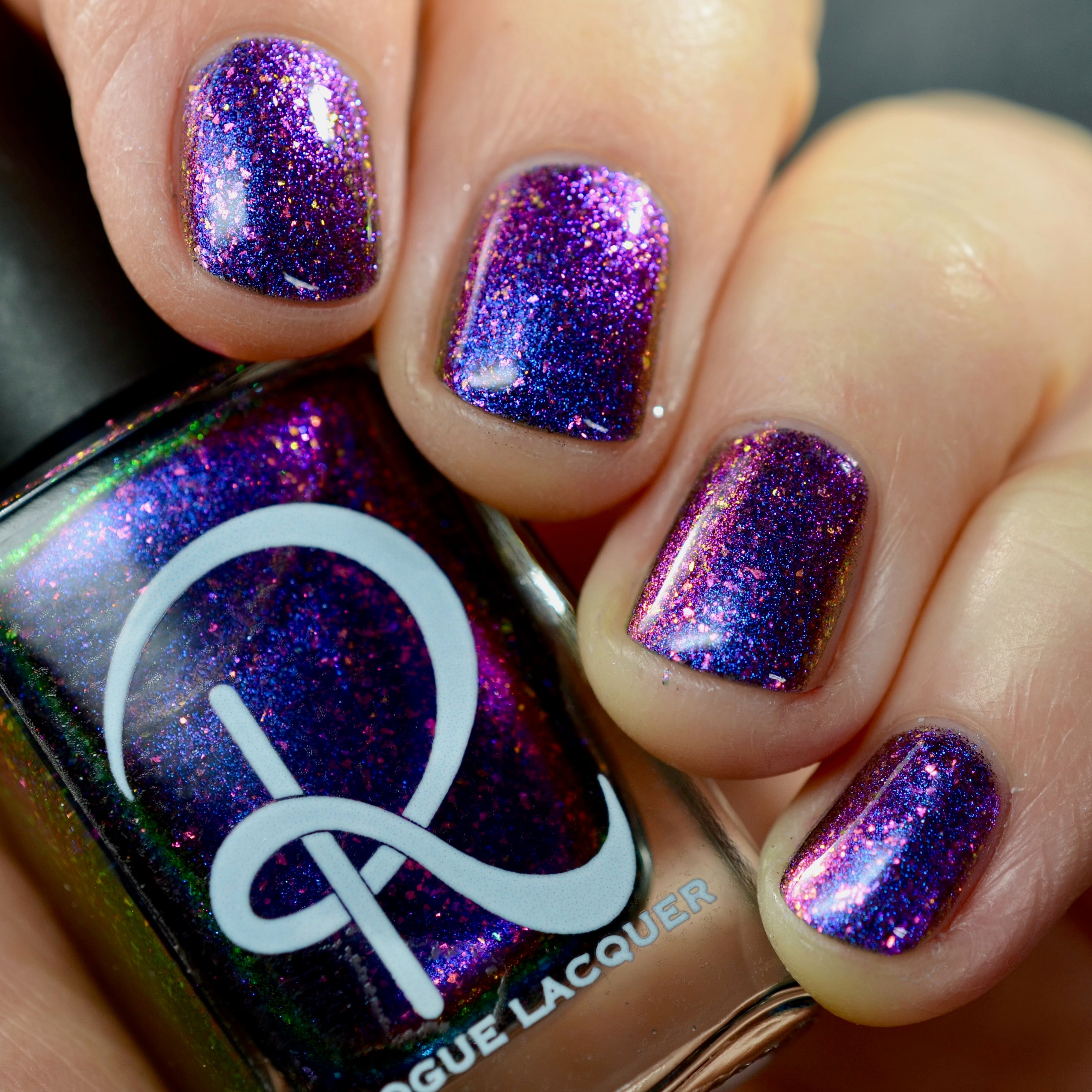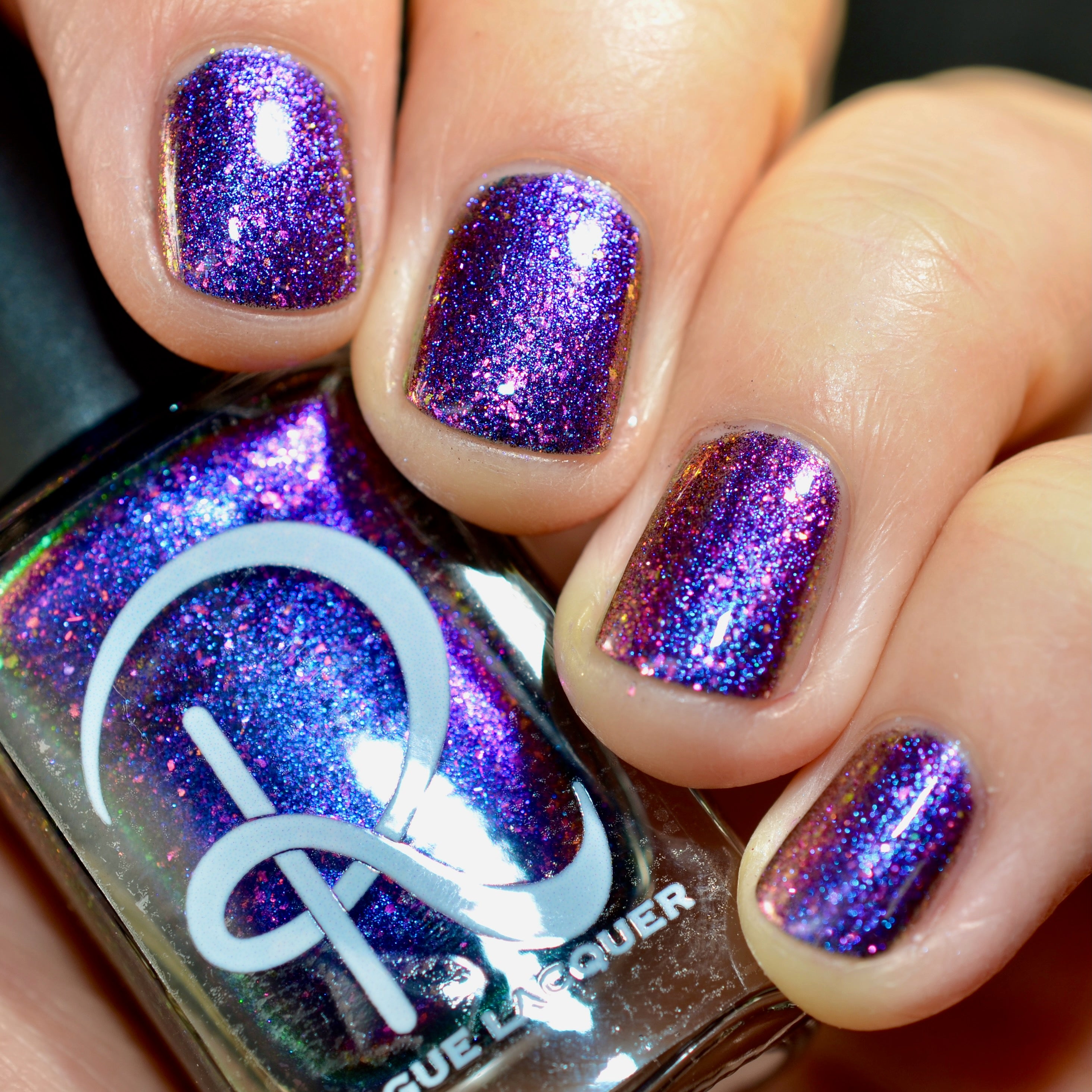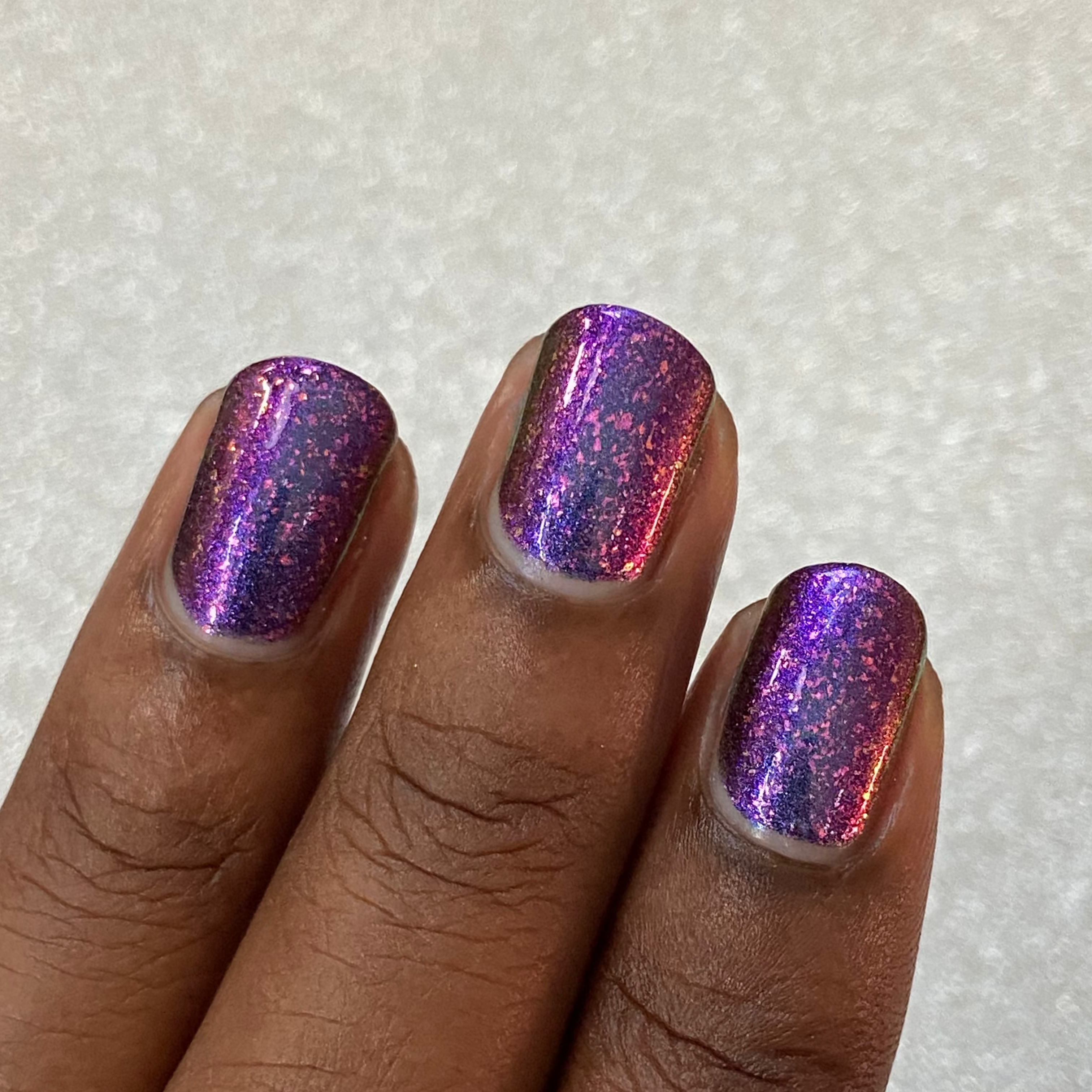 Little Star - a subtley smokey base with bright blue-purple shifting iridescent shimmer and holographic micro flakes.
