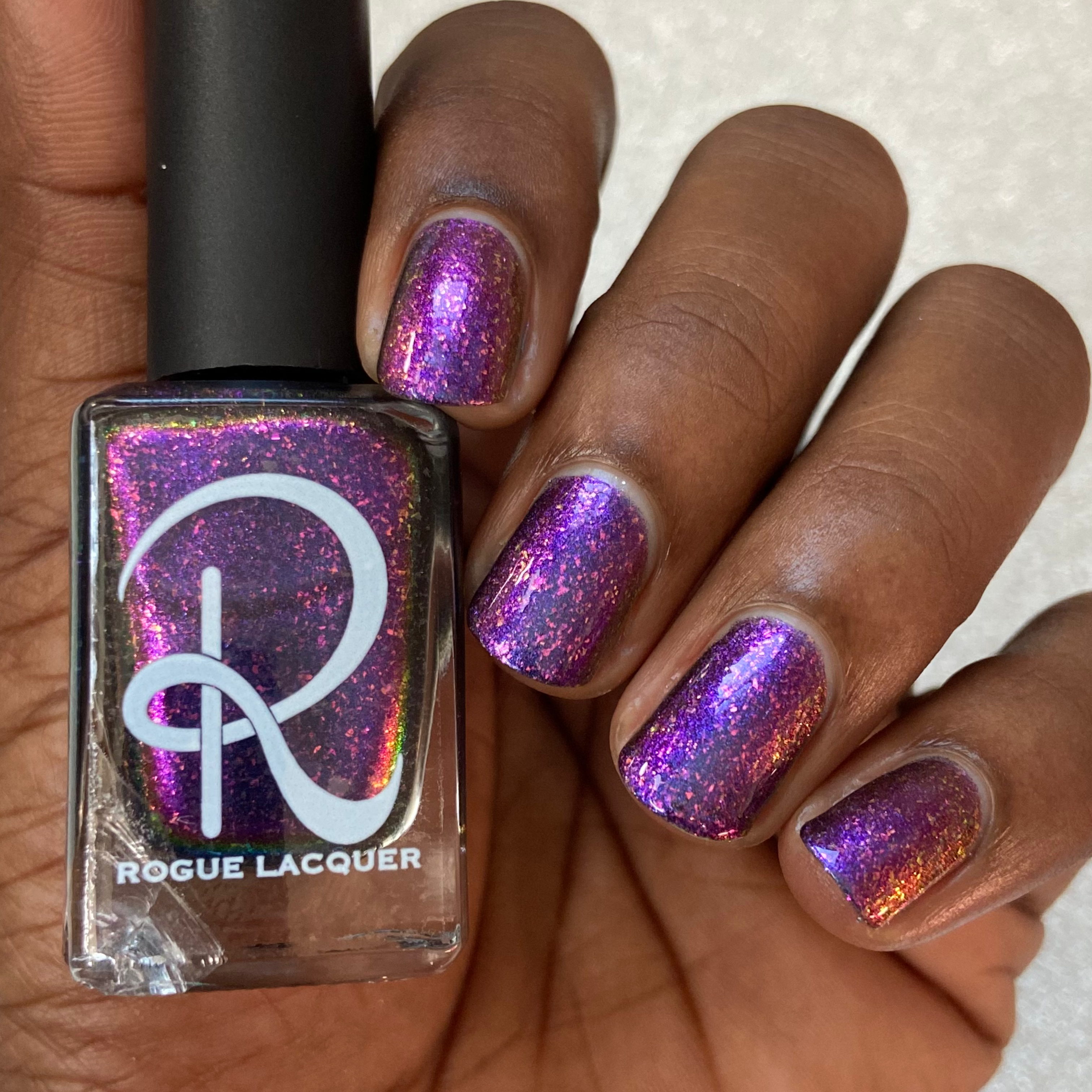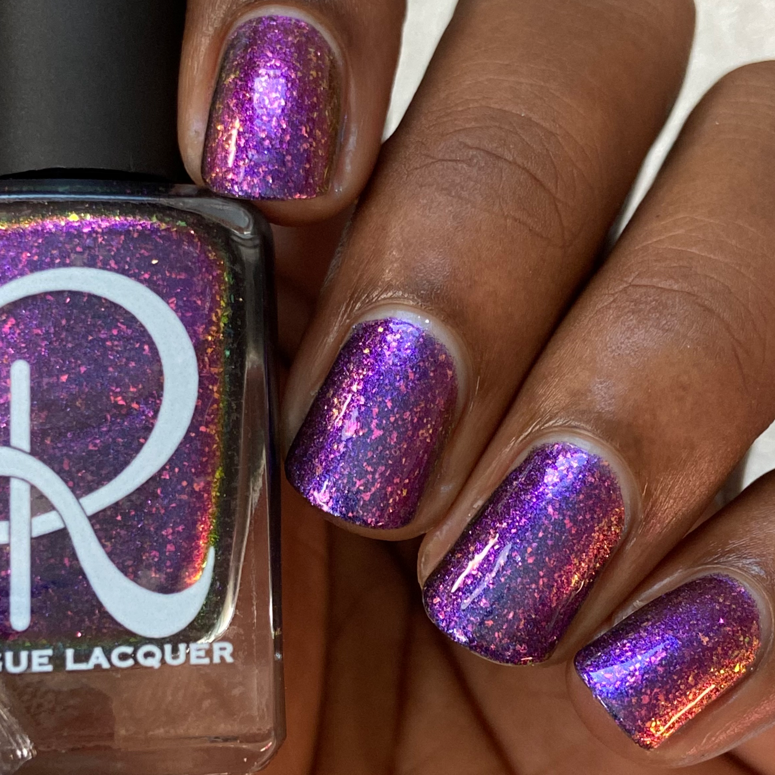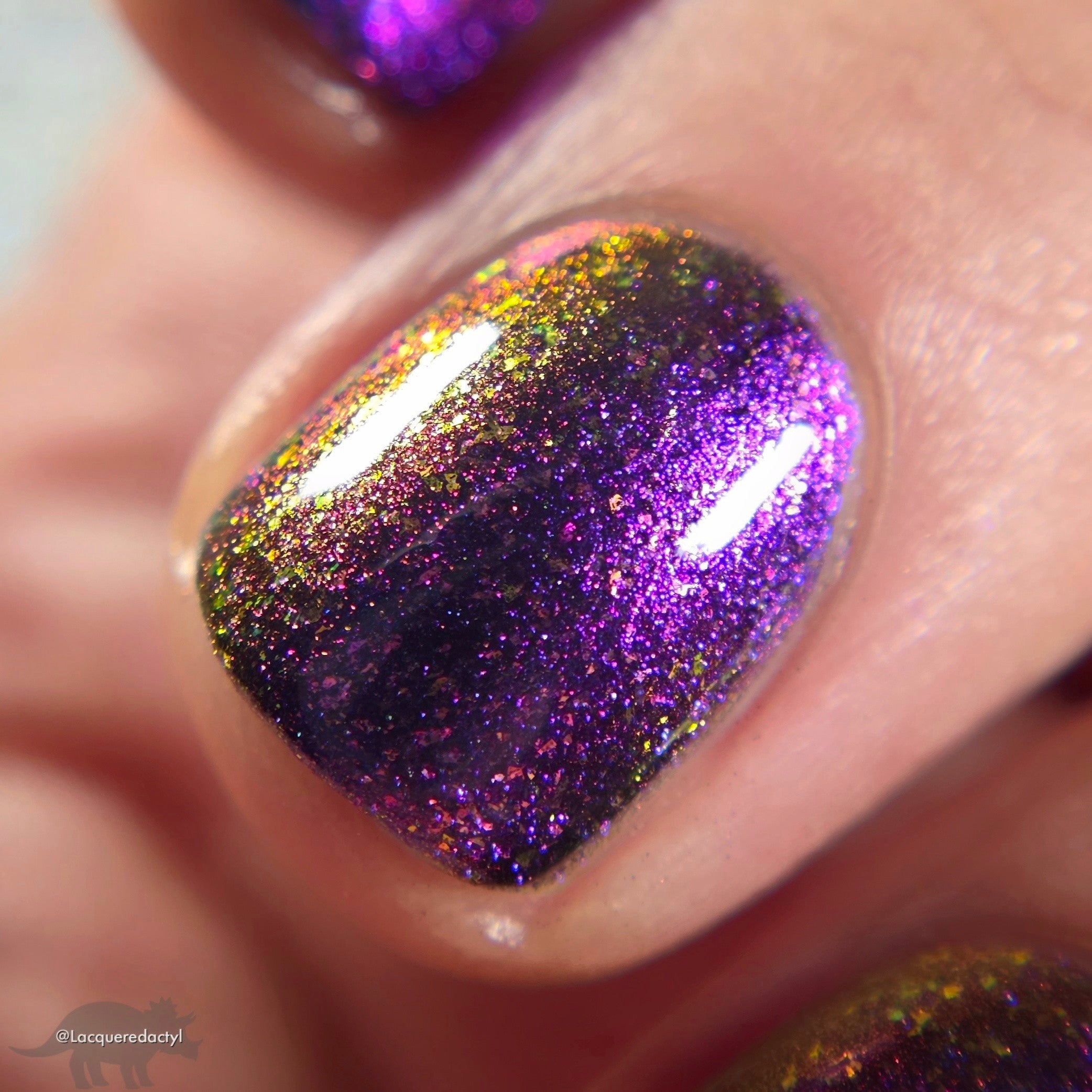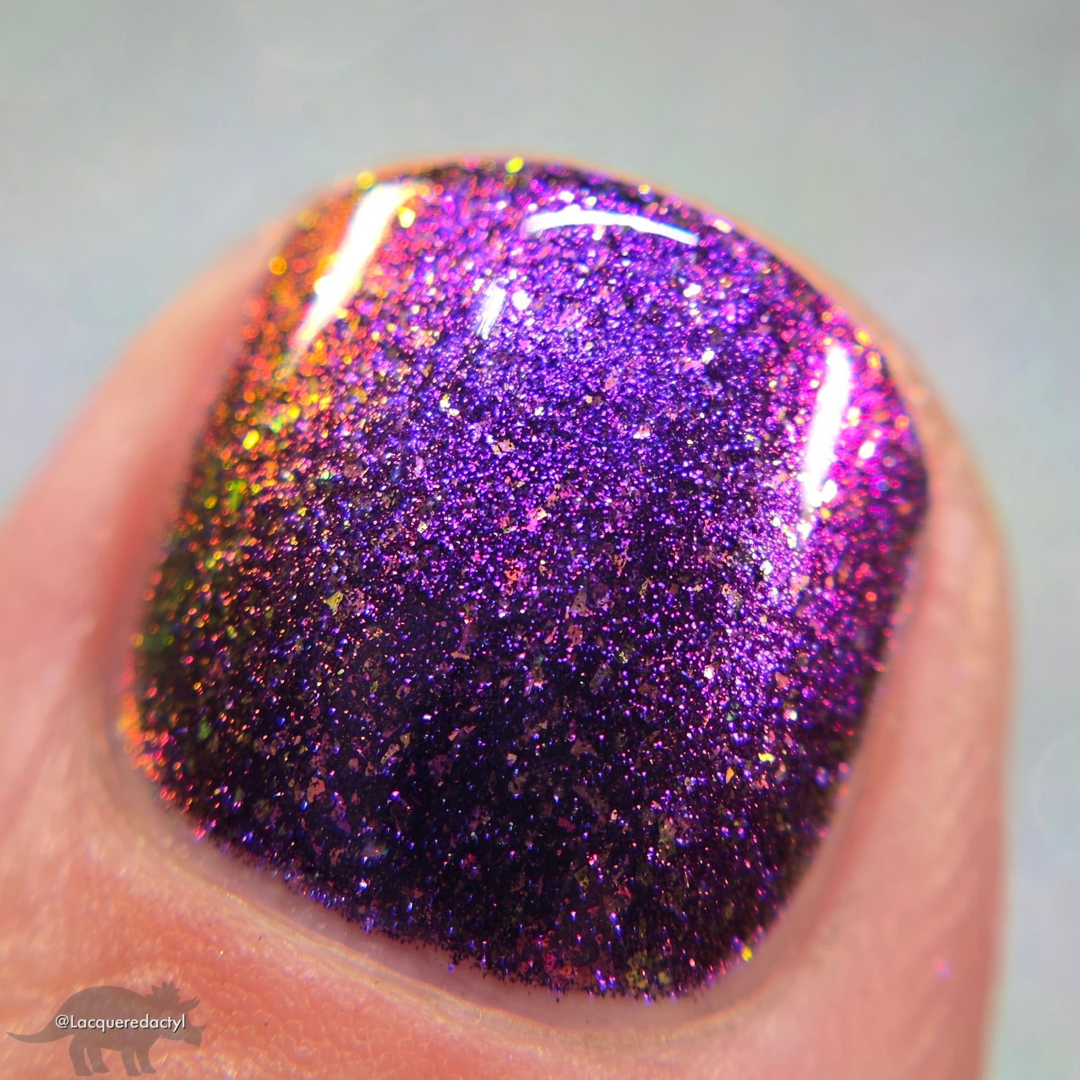 Little Star - a subtley smokey base with bright blue-purple shifting iridescent shimmer and holographic micro flakes.