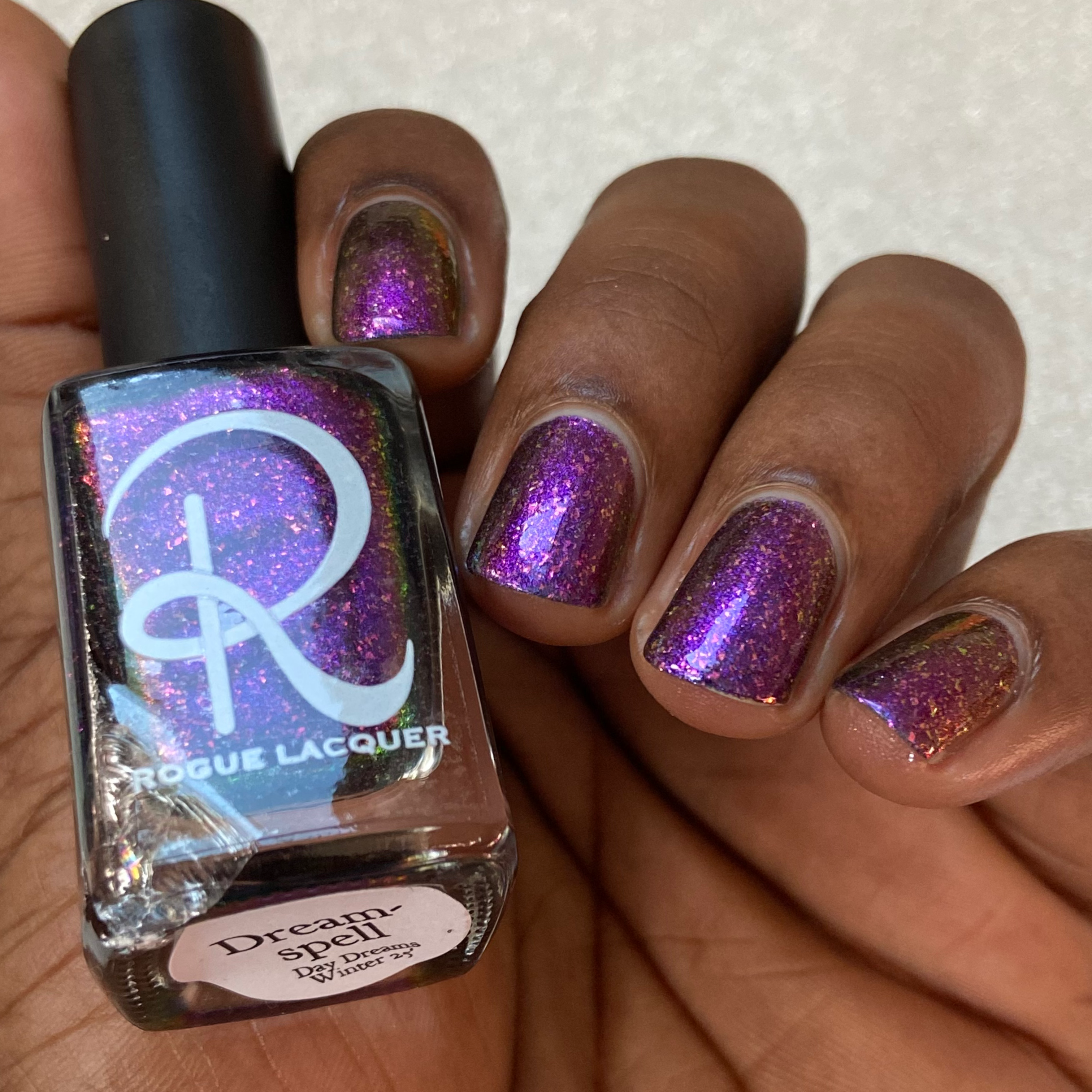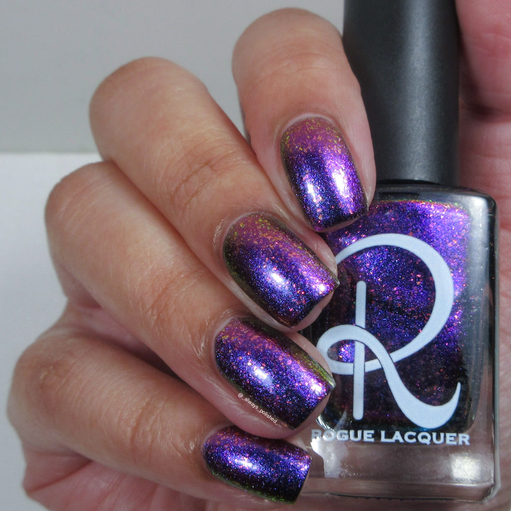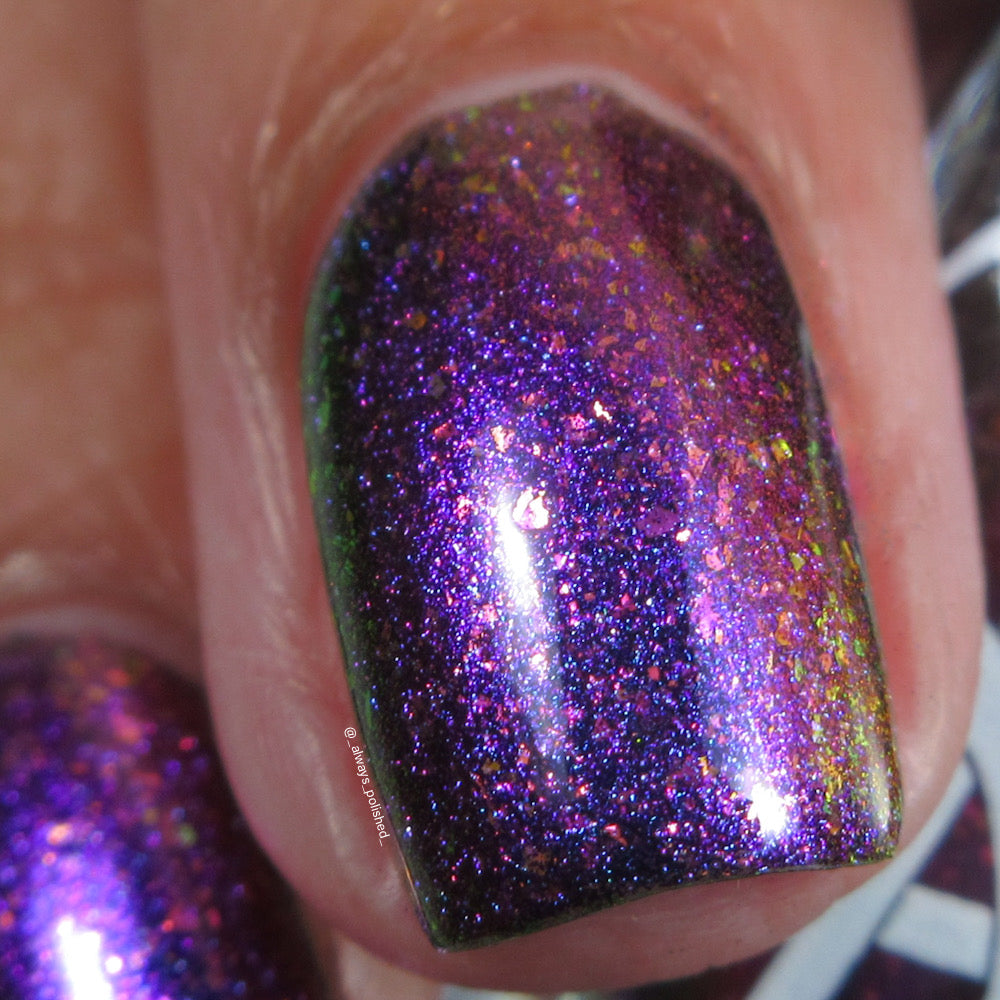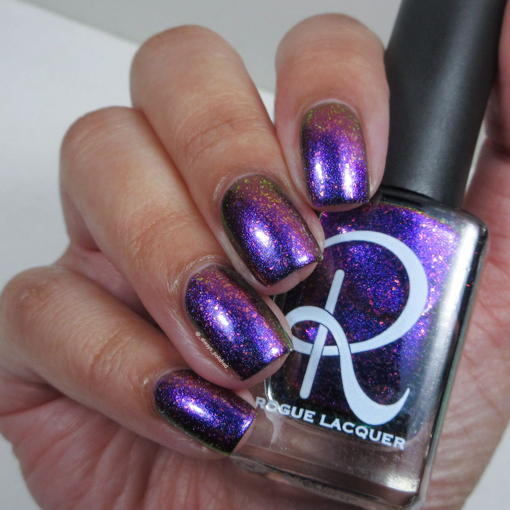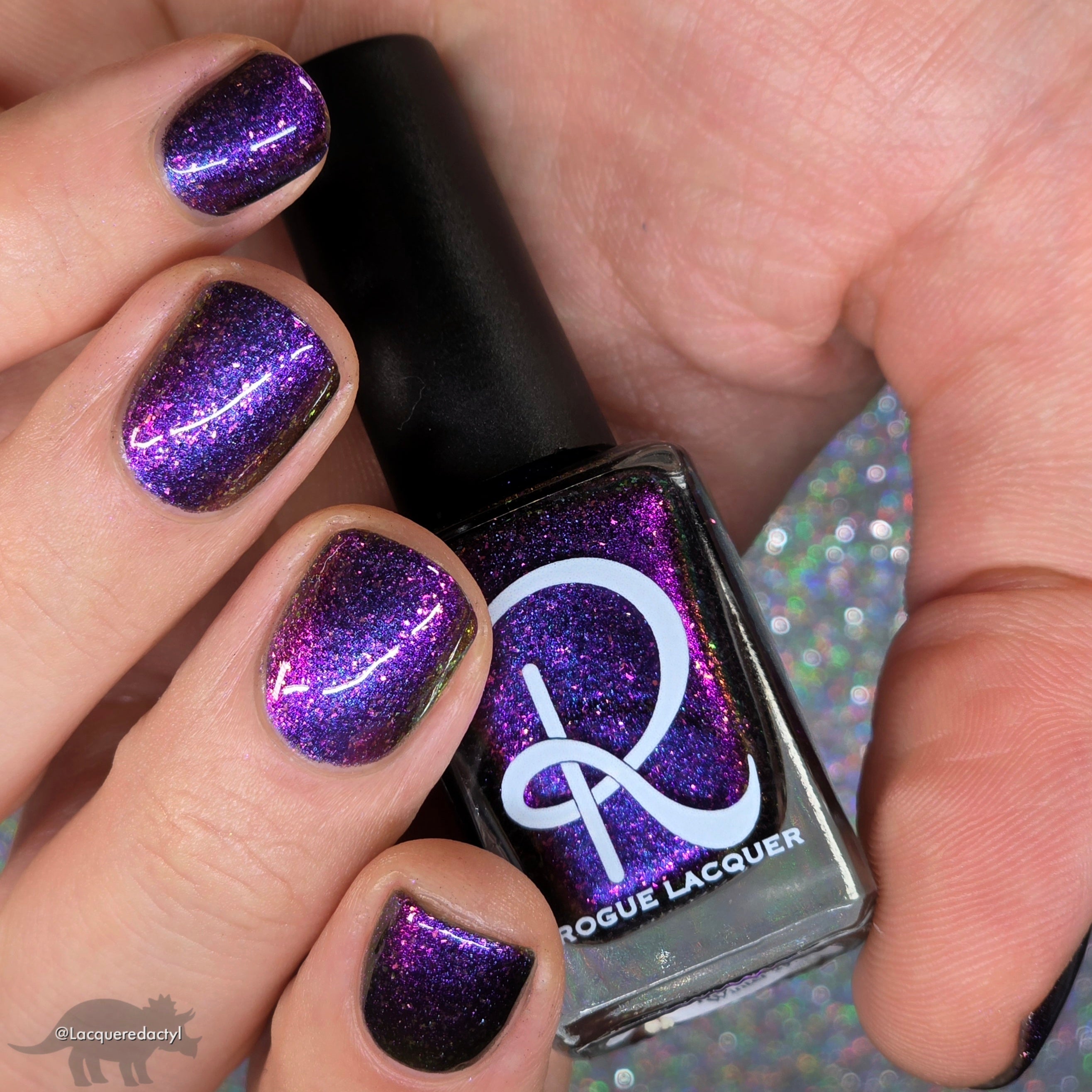 Little Star - a subtley smokey base with bright blue-purple shifting iridescent shimmer and holographic micro flakes.