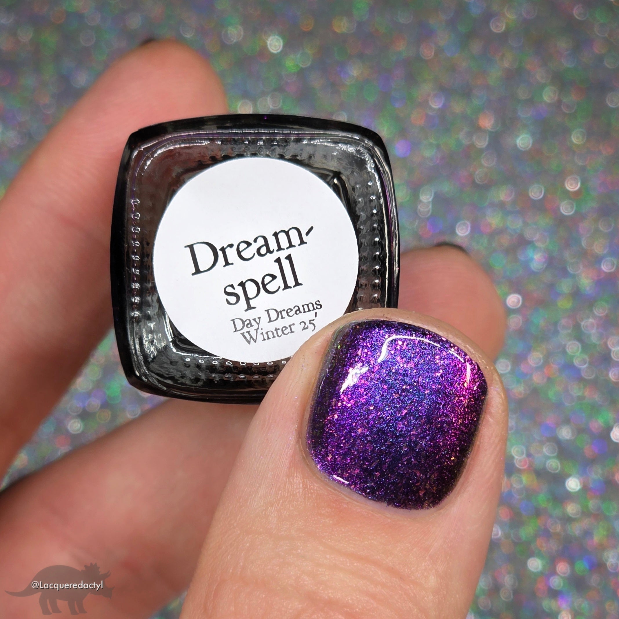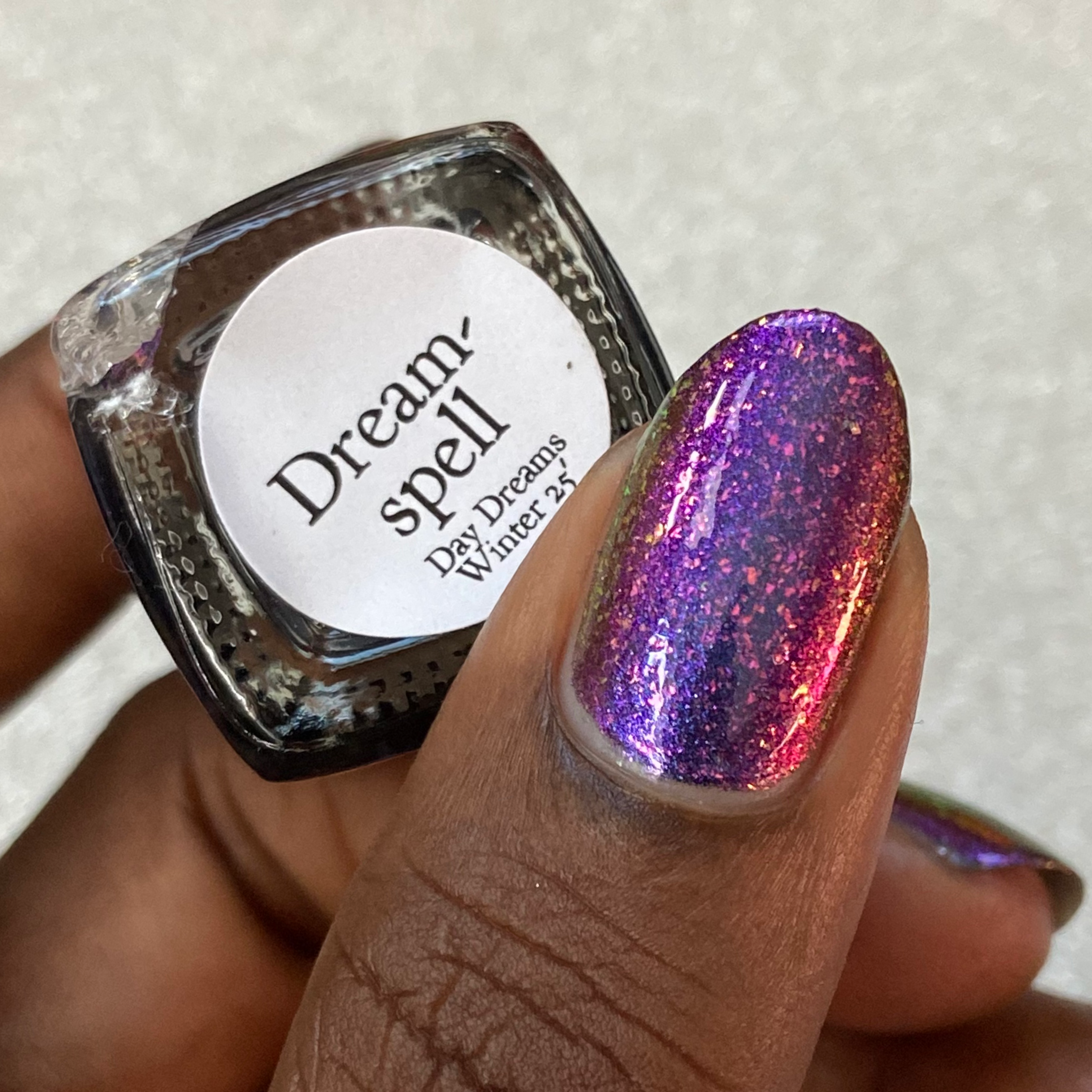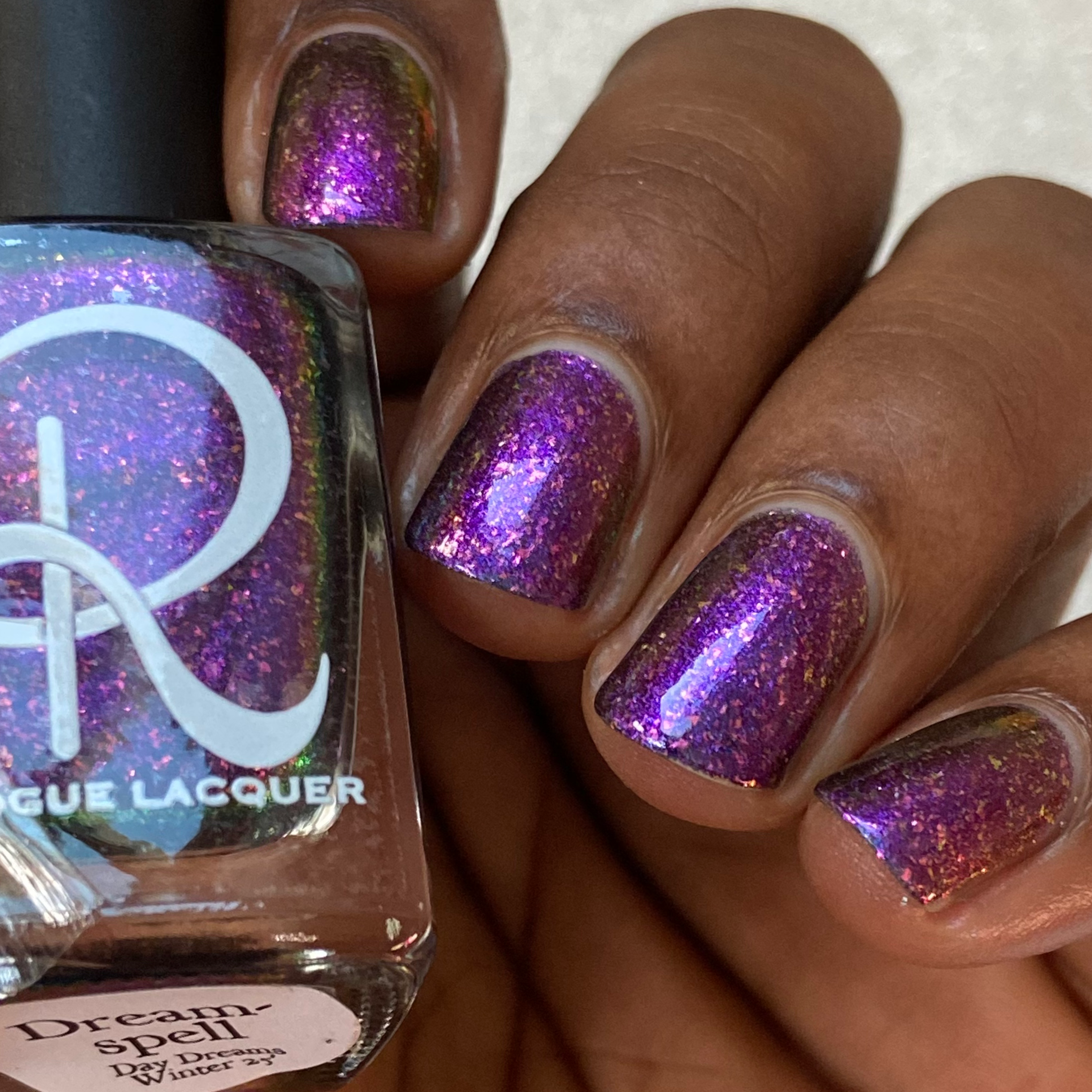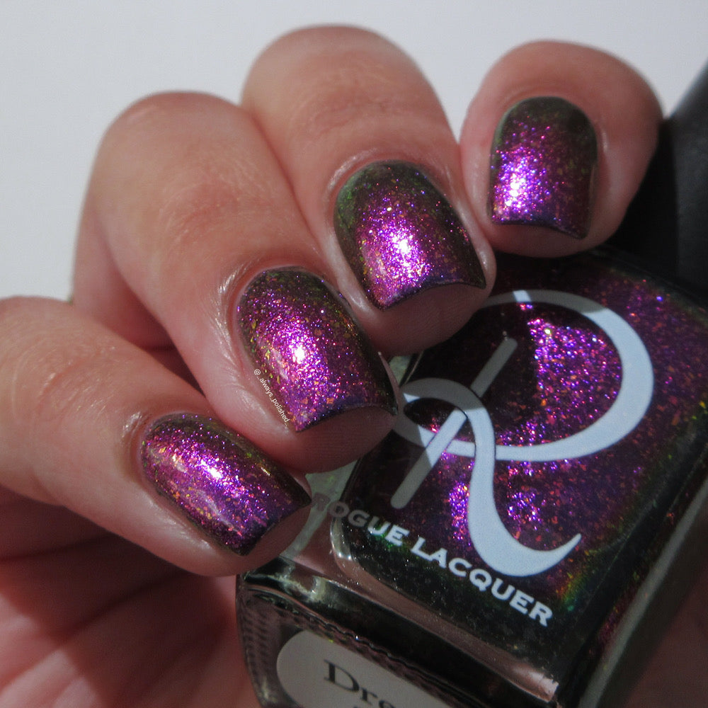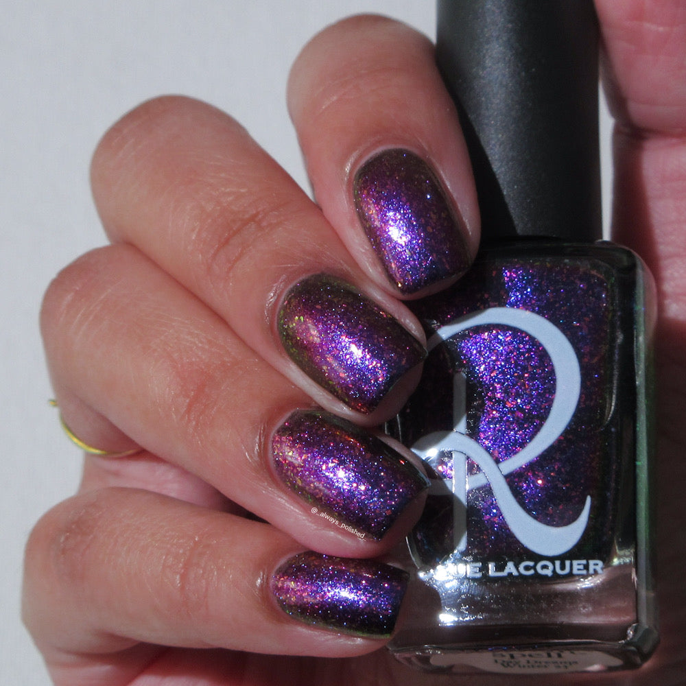 Little Star - a subtley smokey base with bright blue-purple shifting iridescent shimmer and holographic micro flakes.