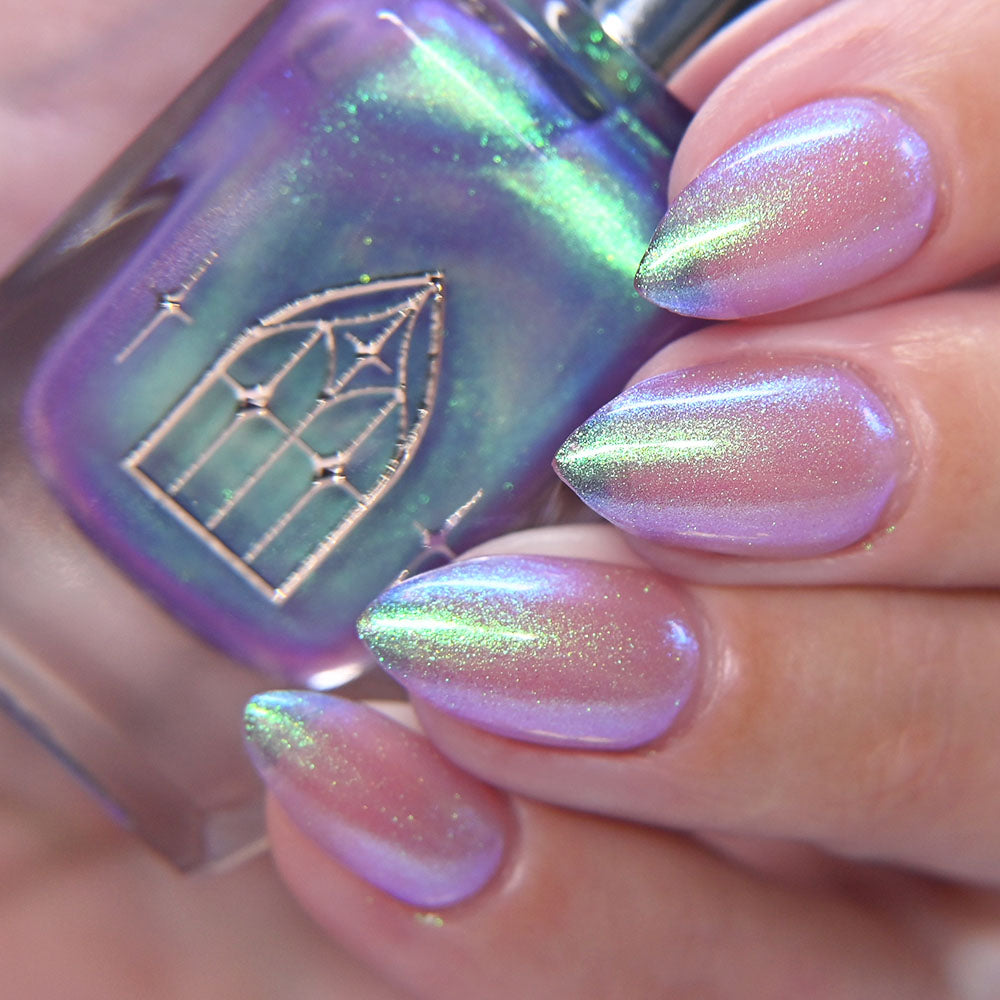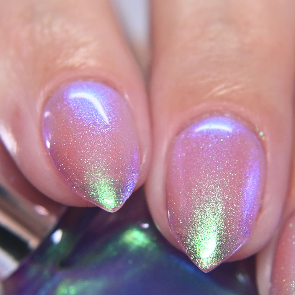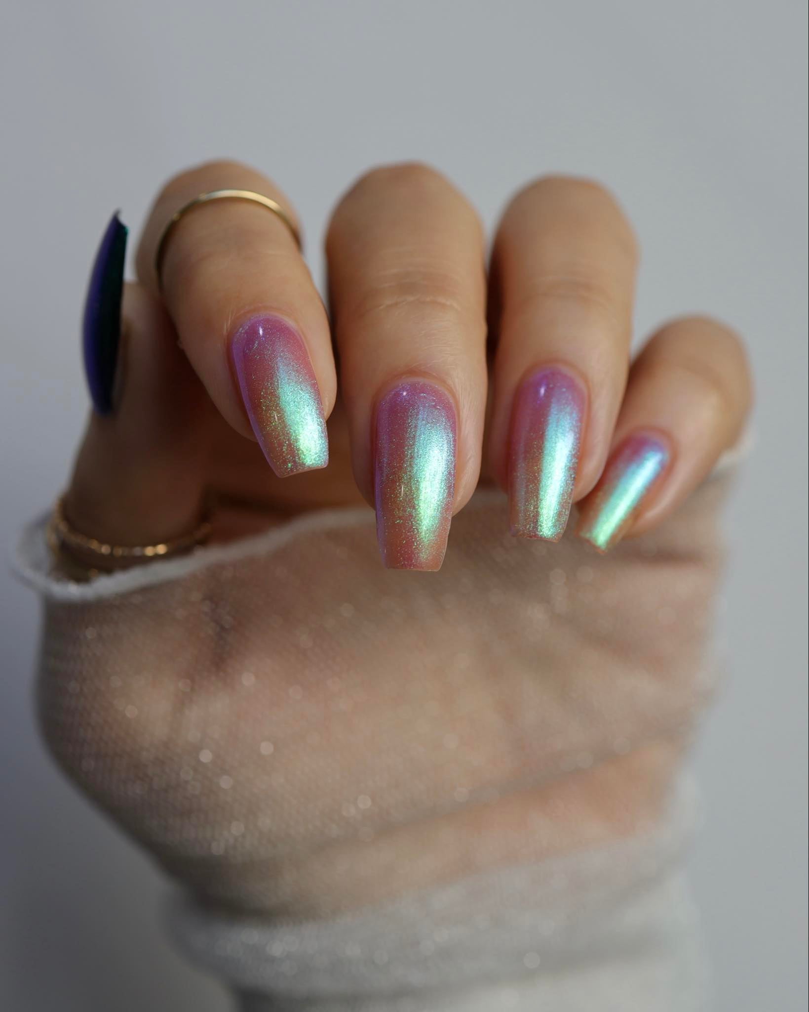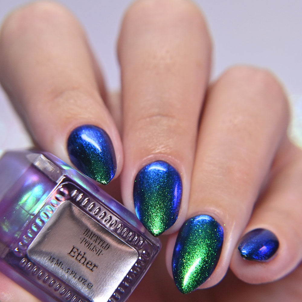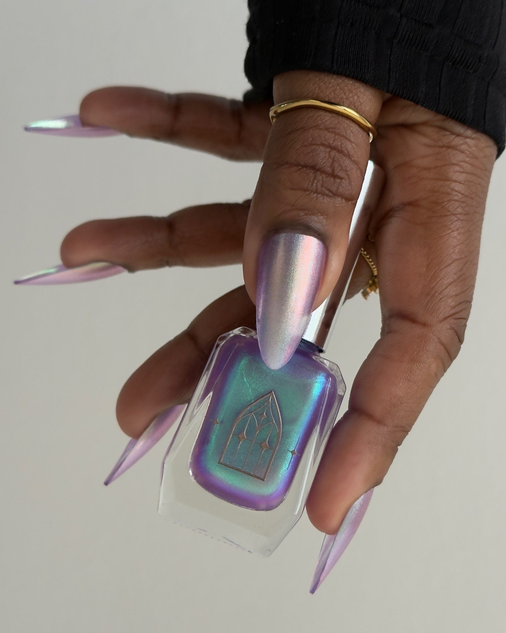 can be worn alone in three thin coats for a sheer finish or can add enchantment over any polish in one coat. Some swatches are shown over a black base