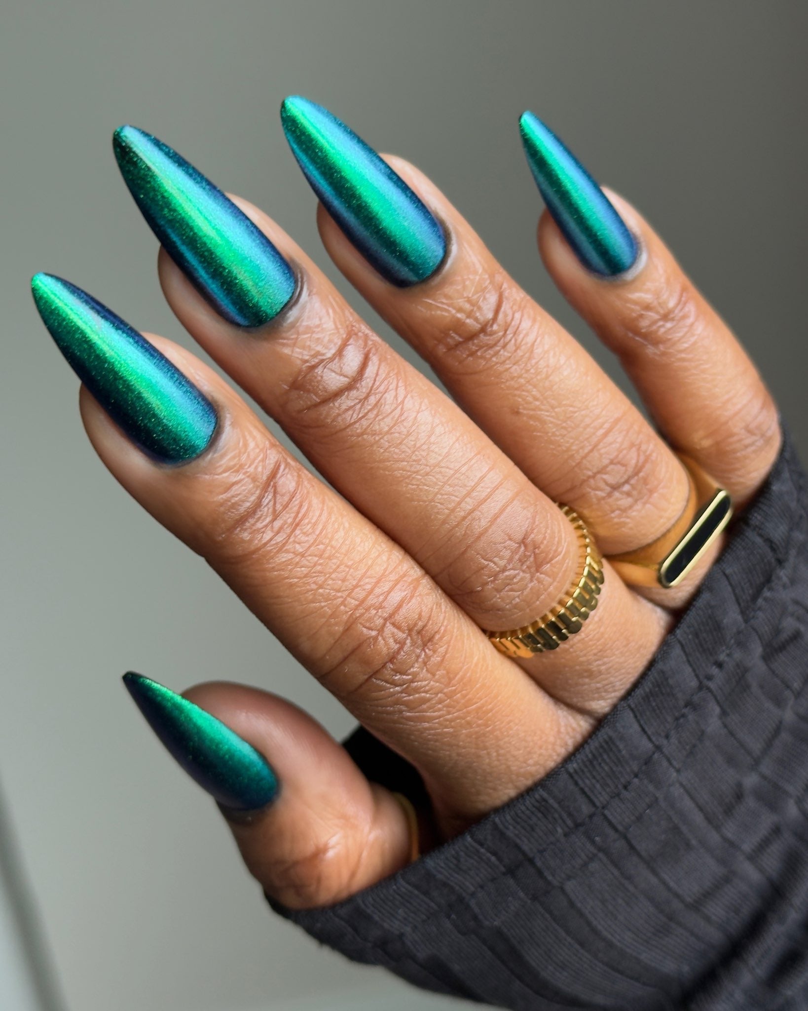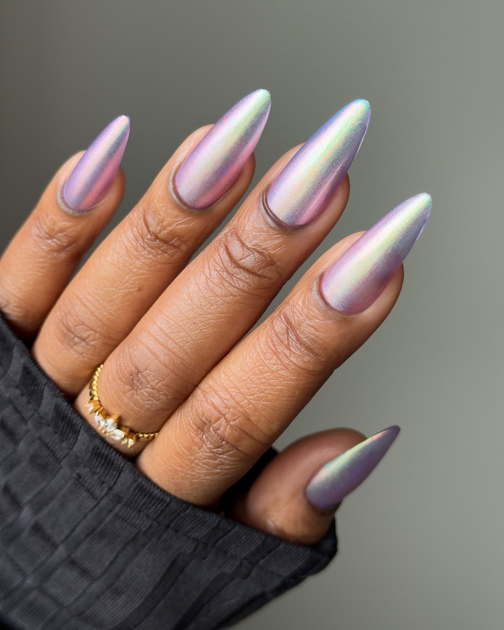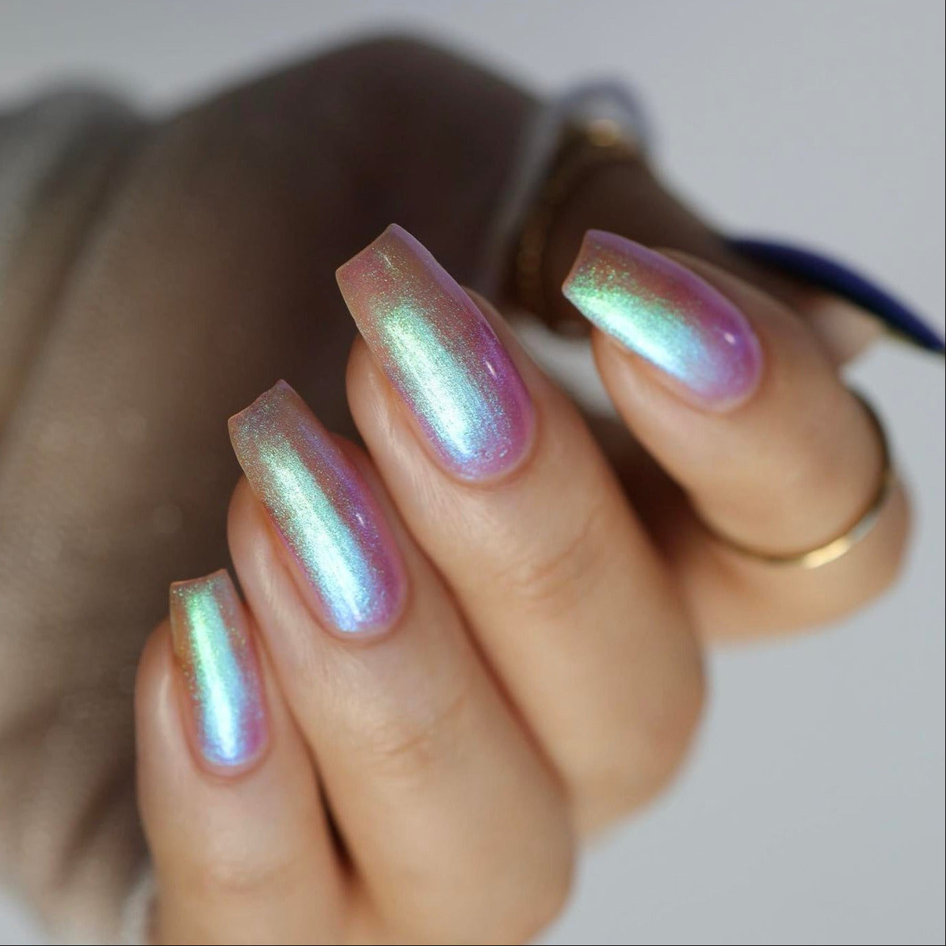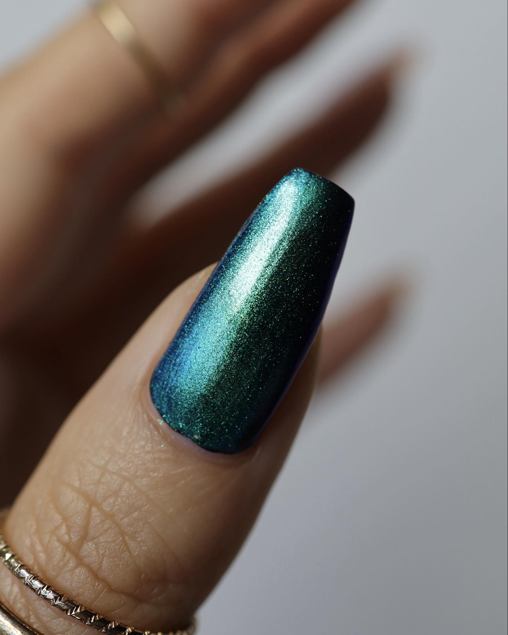 can be worn alone in three thin coats for a sheer finish or can add enchantment over any polish in one coat. Some swatches are shown over a black base