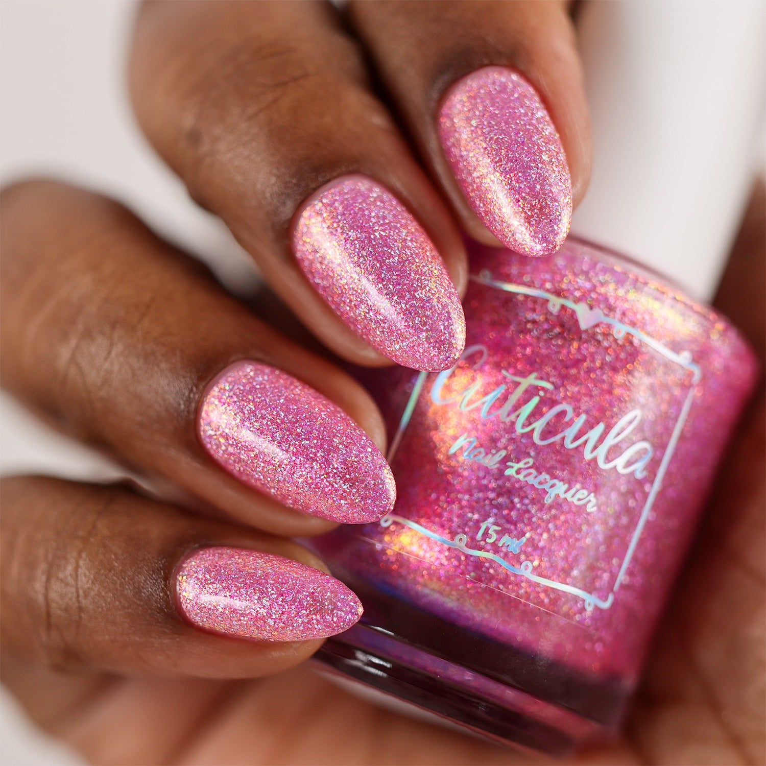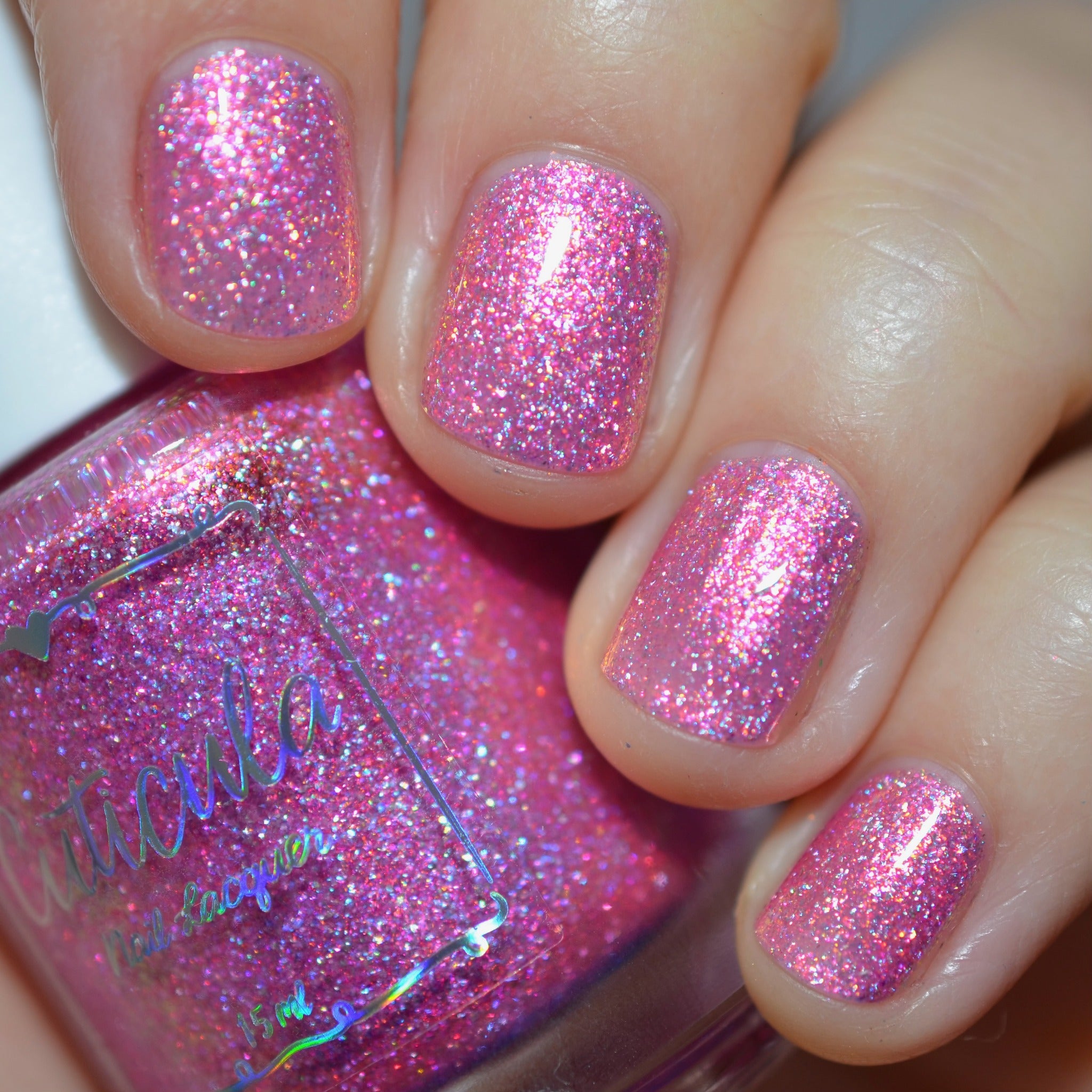 'Ever After' a pink/orange/gold shifting shimmer base with holographic flakes.