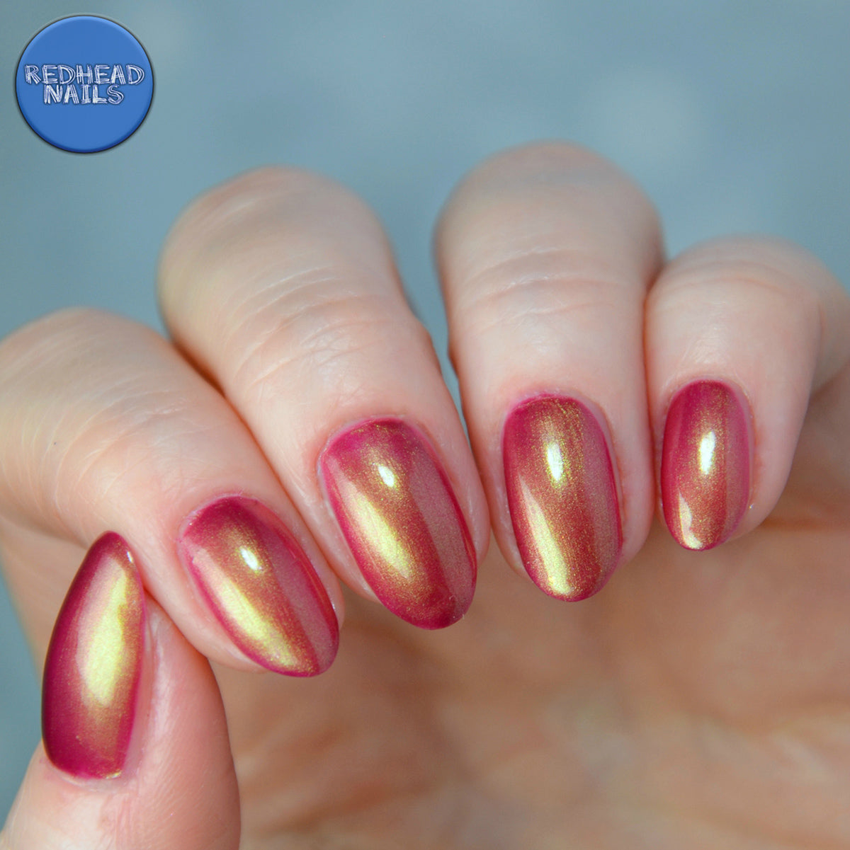 A red nail polish with strong greeny gold to pink shifting overlay.