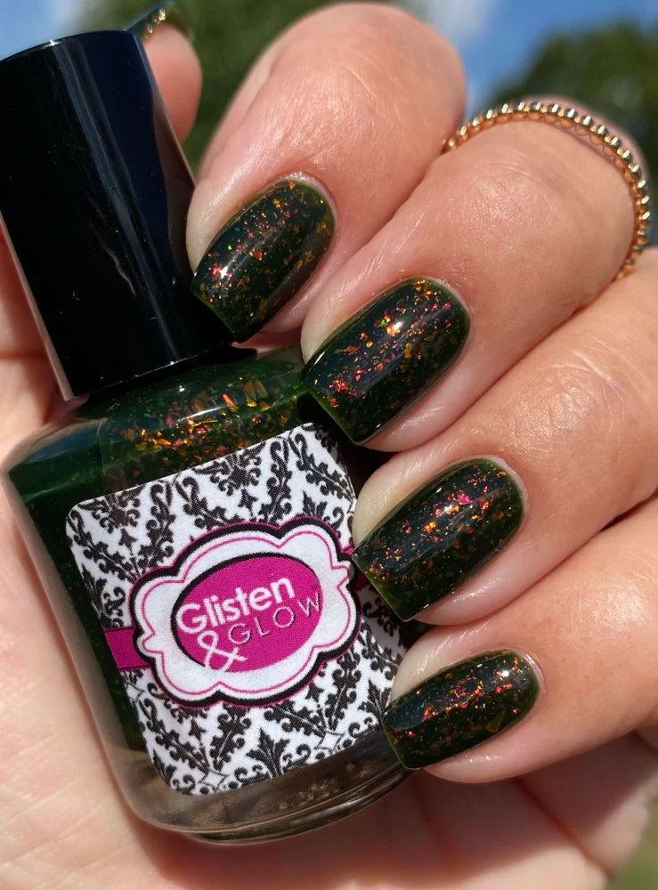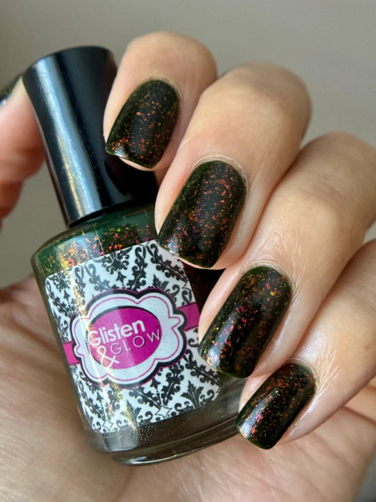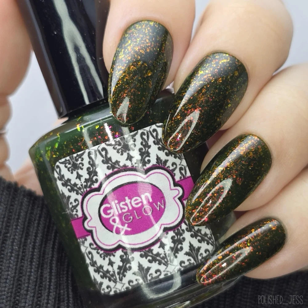 Headstone Sparkle – dark grey jellie polish loaded with various shapes and sizes of glitters in shades of orange, purple and copper Add a layer of Glisten & Glow Glitter...