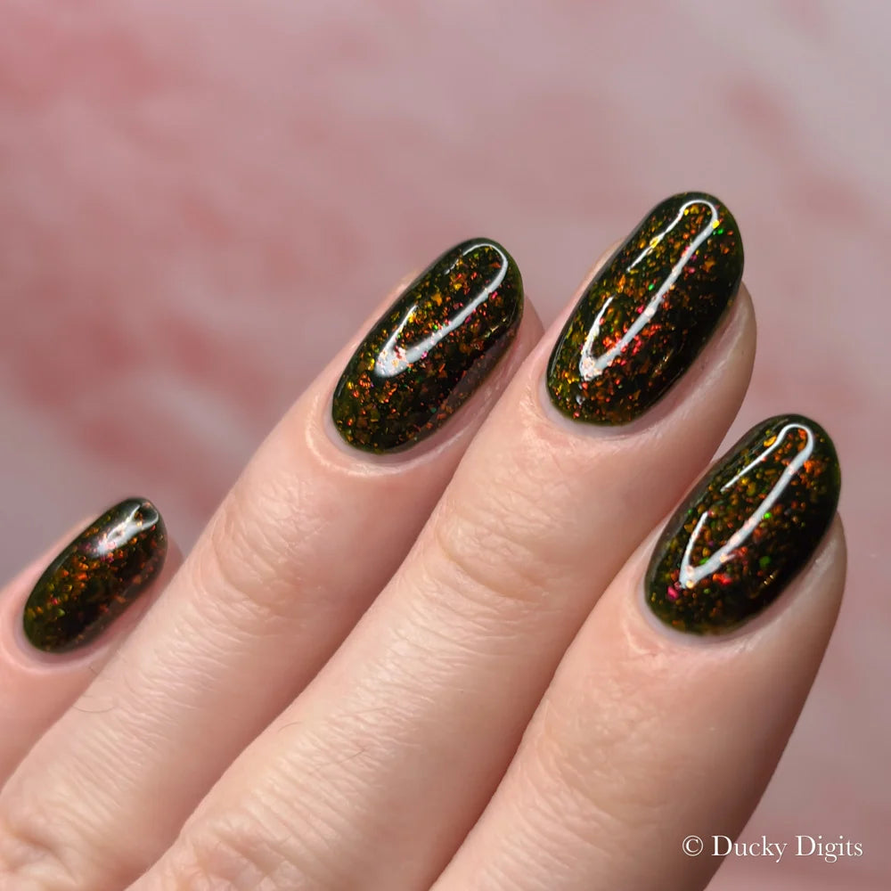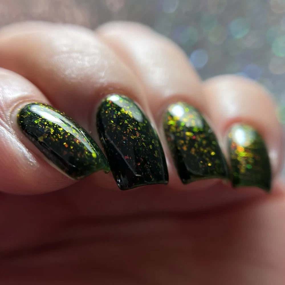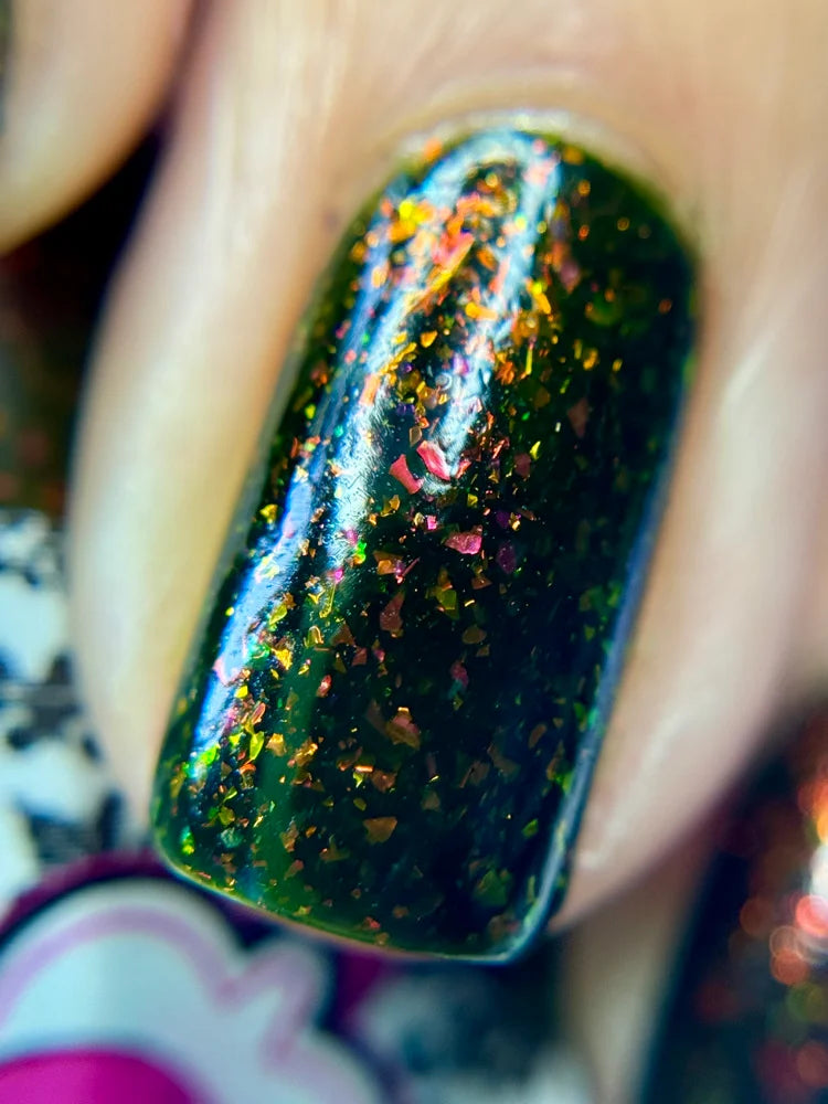 Rest in Polish – black based MAGNETIC polish with a dusting of shimmer that shifts pink/purple and scatter holo flakes, that once magnetized reveals blue/purple/pink/red Magnetic tools sold separately – Magnetic Tools...