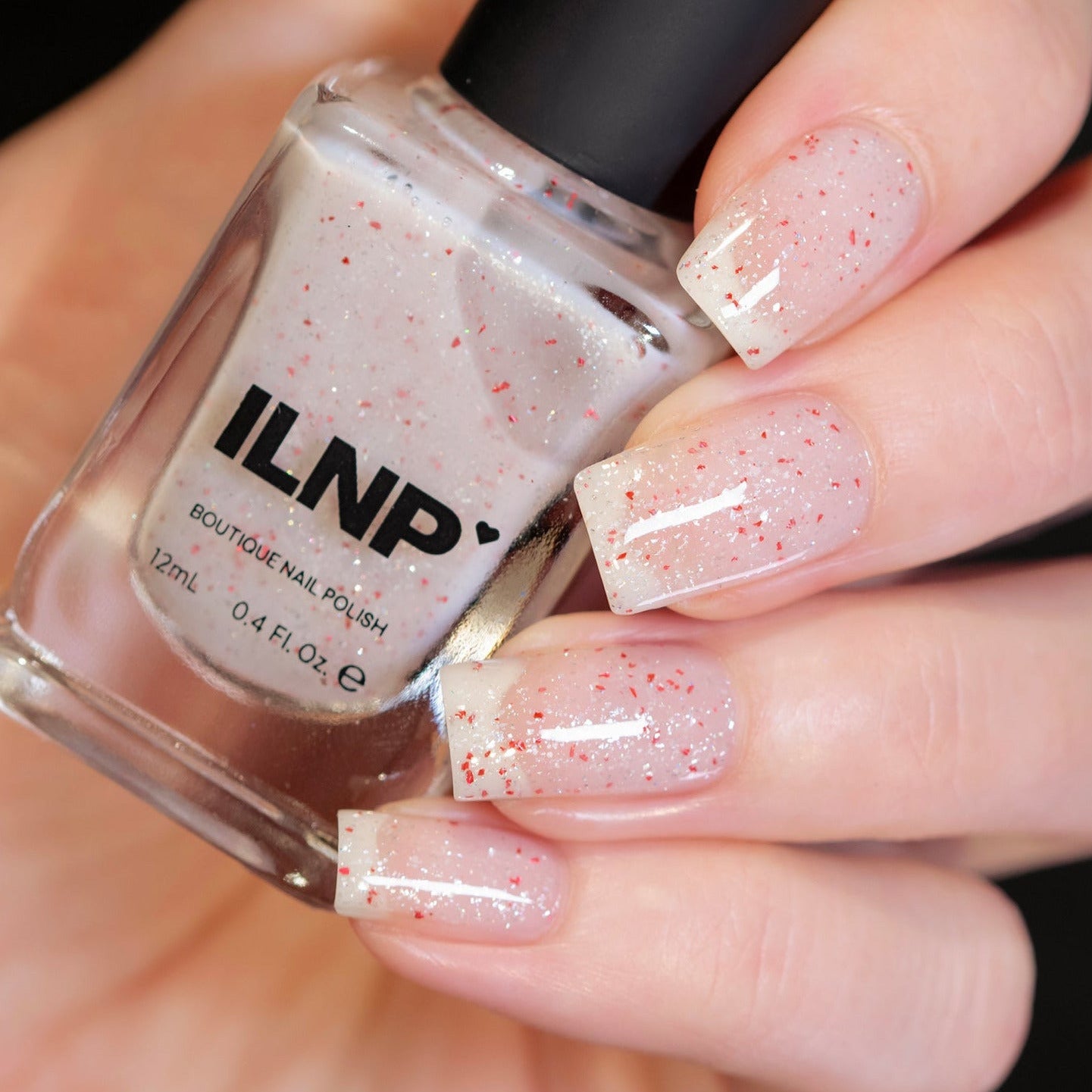 North Pole’s milky white base effortlessly shimmers, its frosted scattered sparkle gliding softly between each layer. Reflective red flakes skitter across the surface, bright against the snow-kissed backdrop. Delicate with a touch of contrast, North Pole glows with sweetness and sparkle in perfect balance.