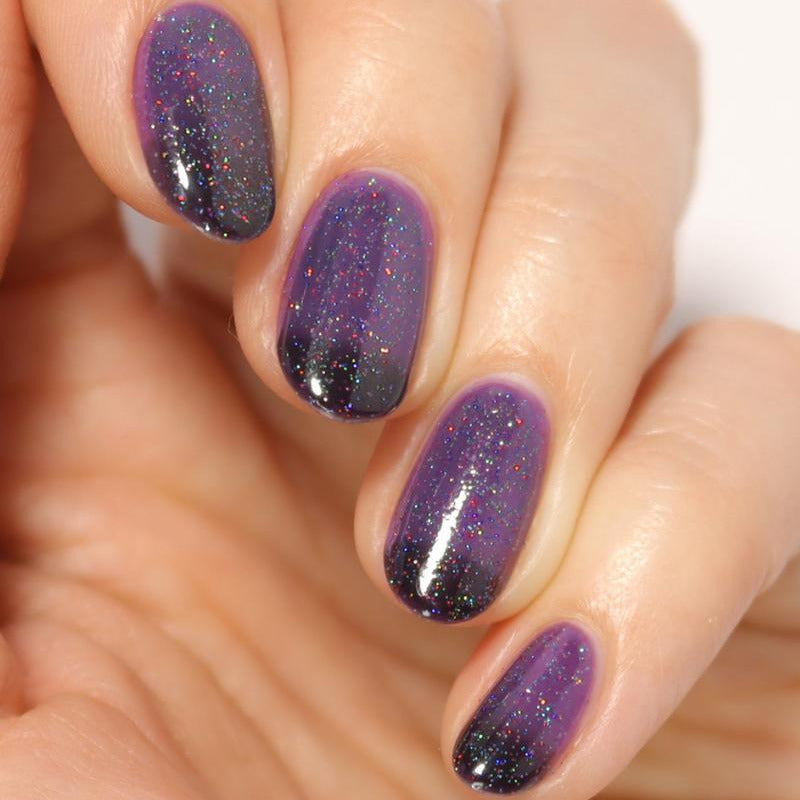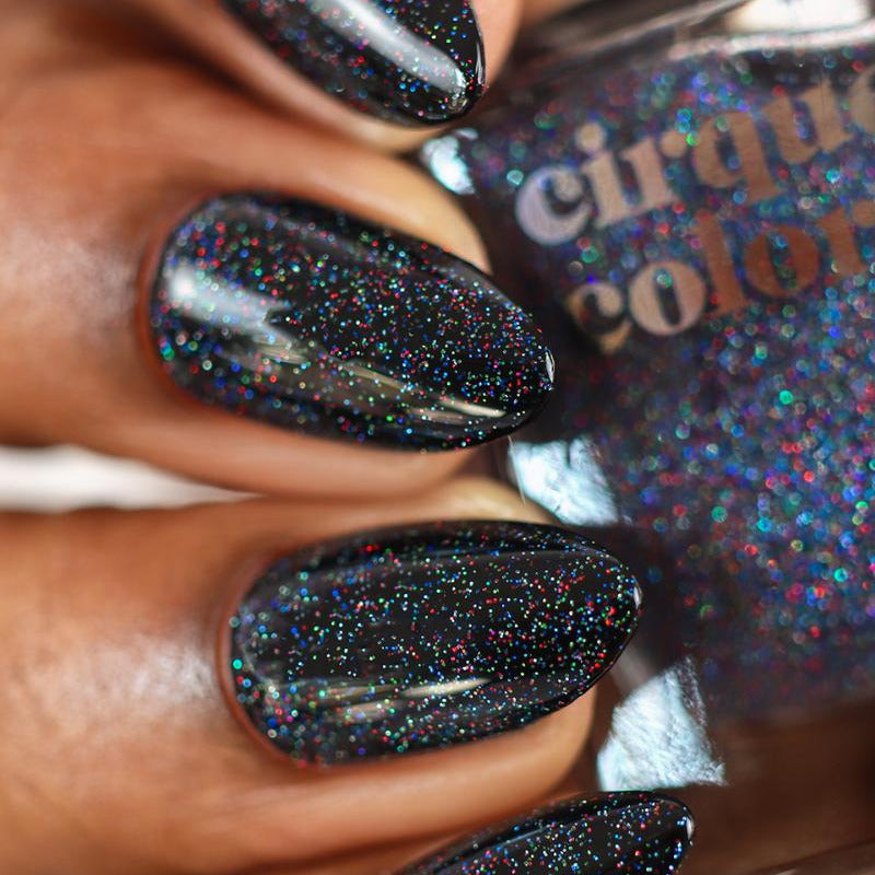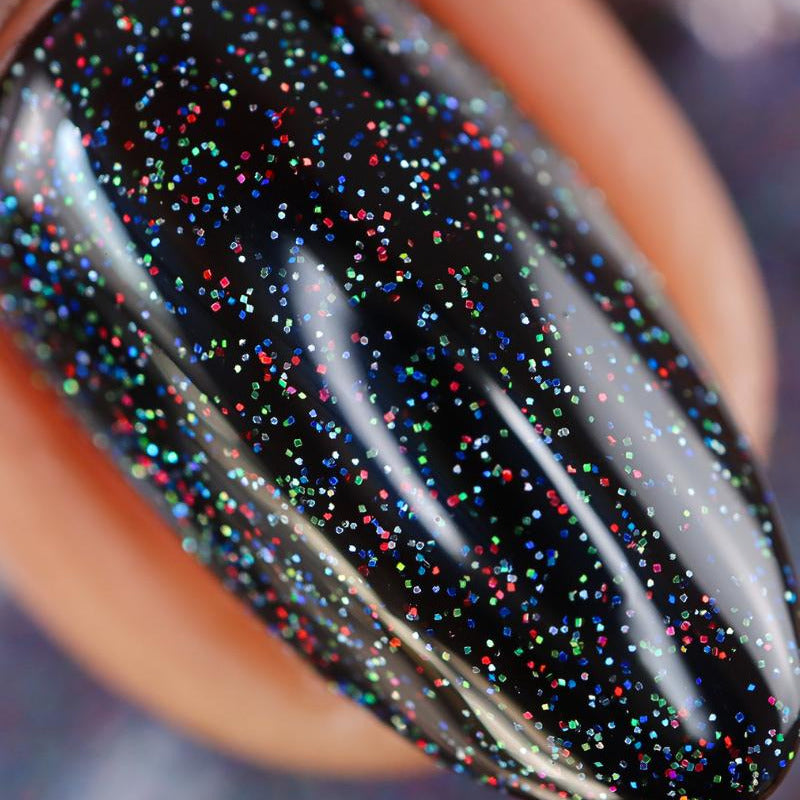 Notetorious is a rainbow holographic glitter nail polish topper in a clear base. Please note glitter polishes dry slightly textured. We recommend applying 2 layers of top coat to smooth out the finish.