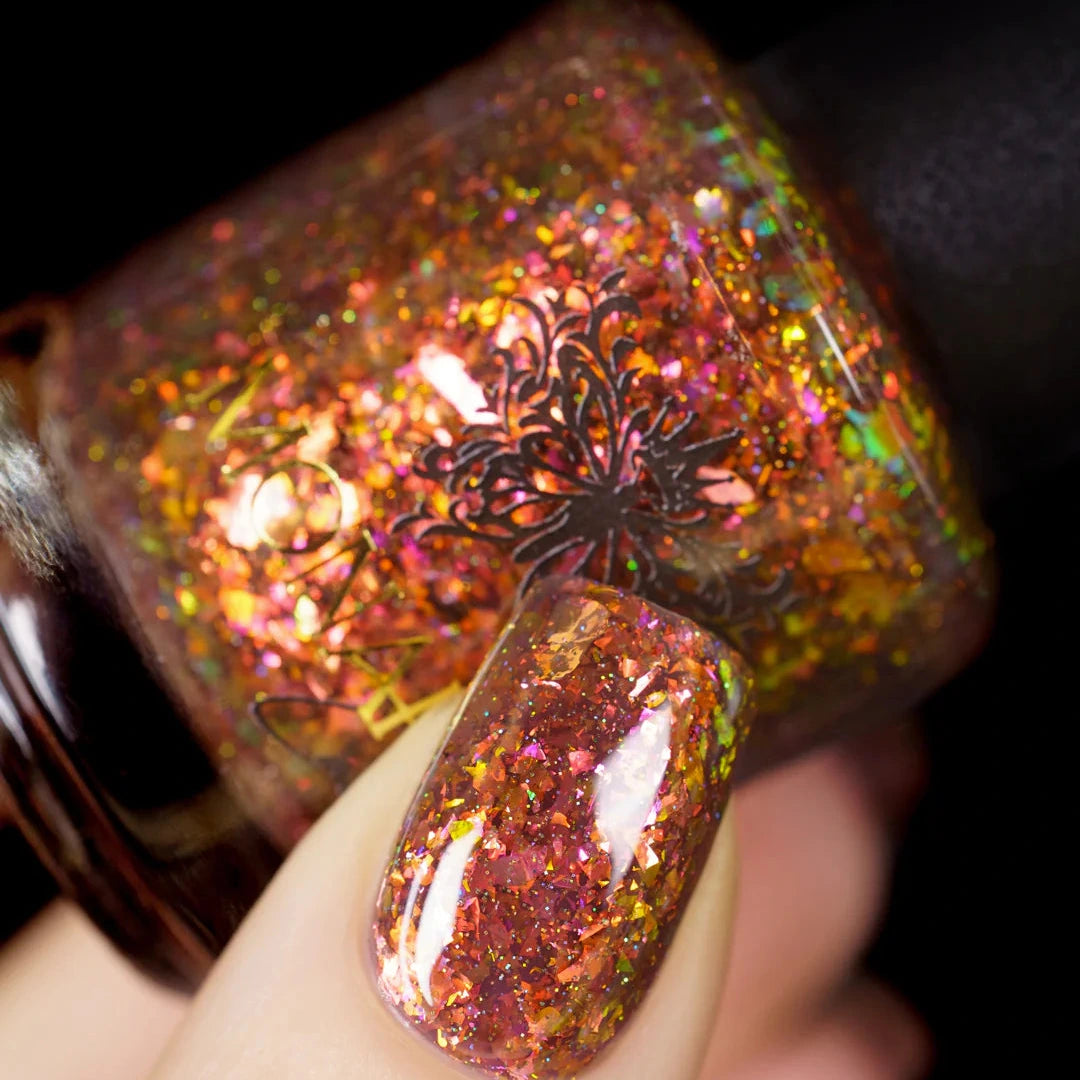 A taupe brown jelly base with red orange yellow green blue chameleon flake and hints of gold holo sparkle