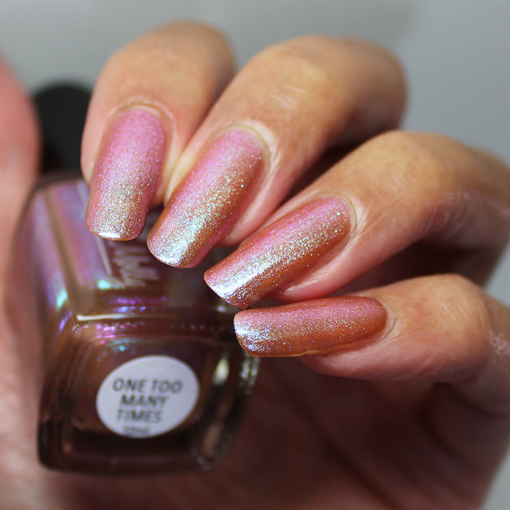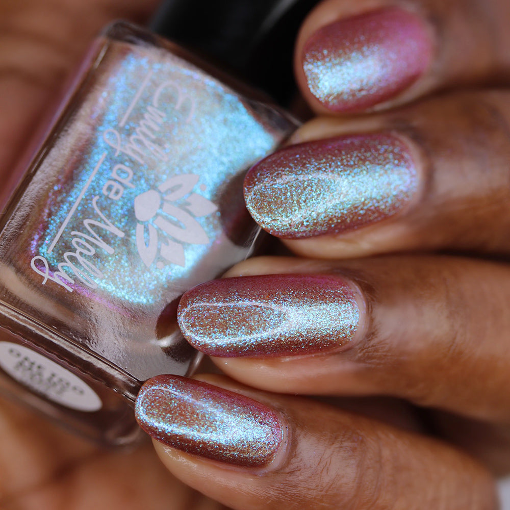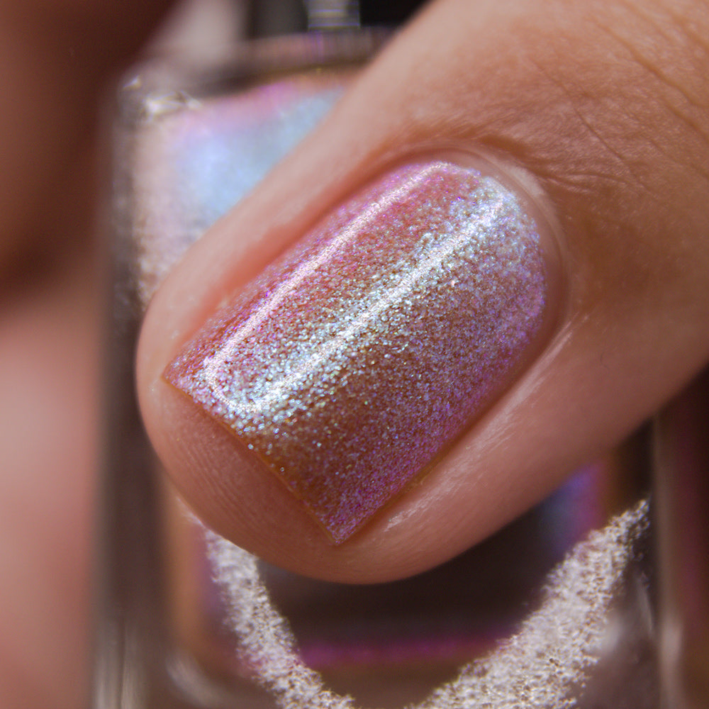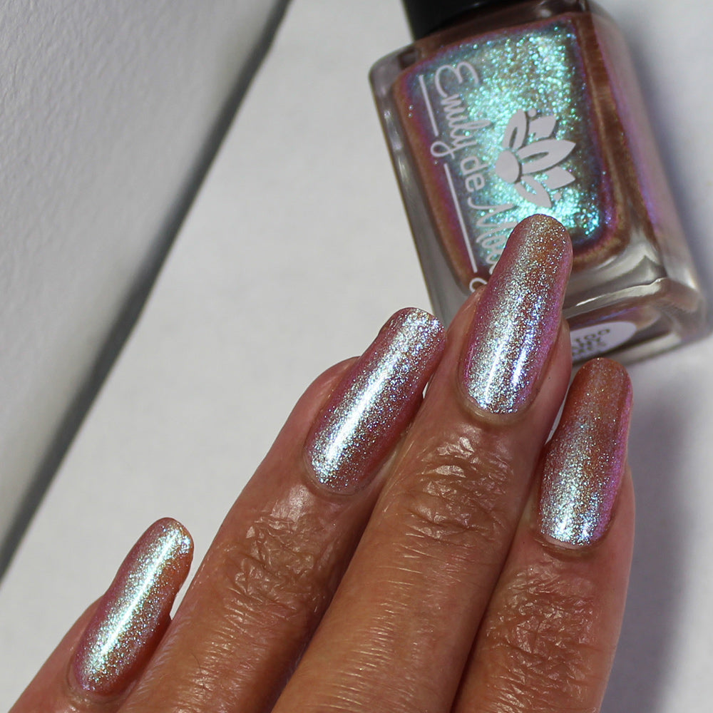 A light sandy brown nail polish with an aqua to purple shifting, large particle shimmer.