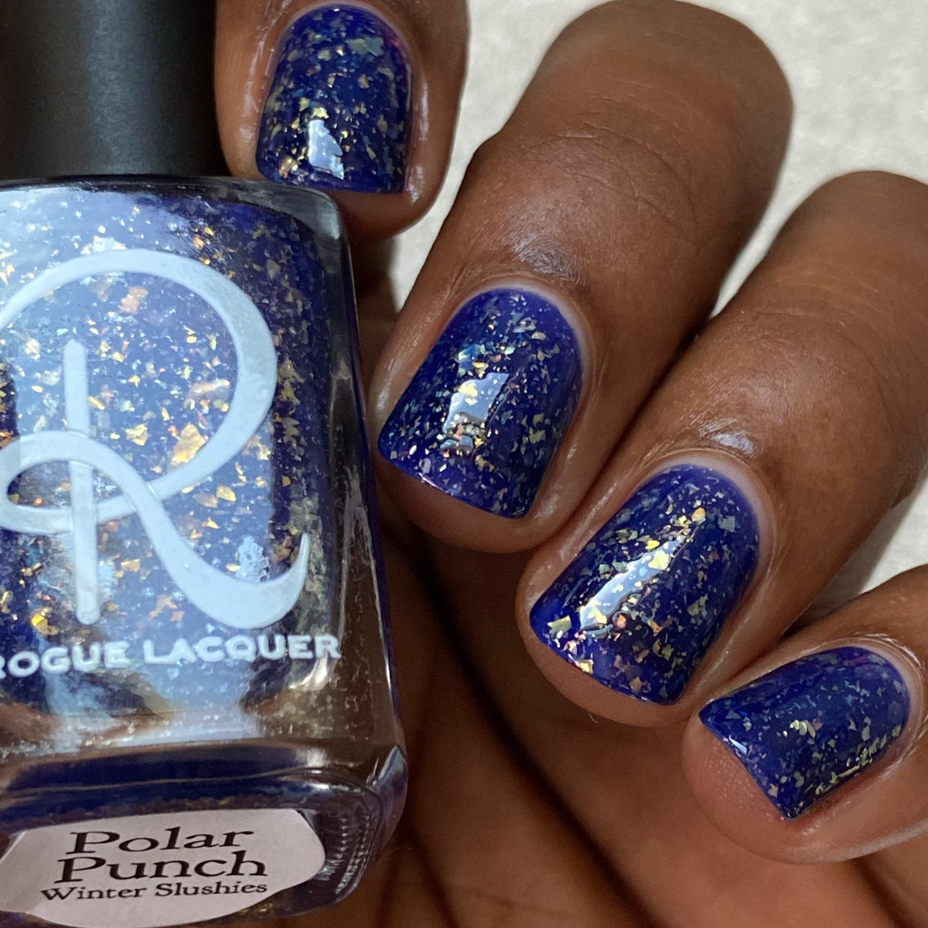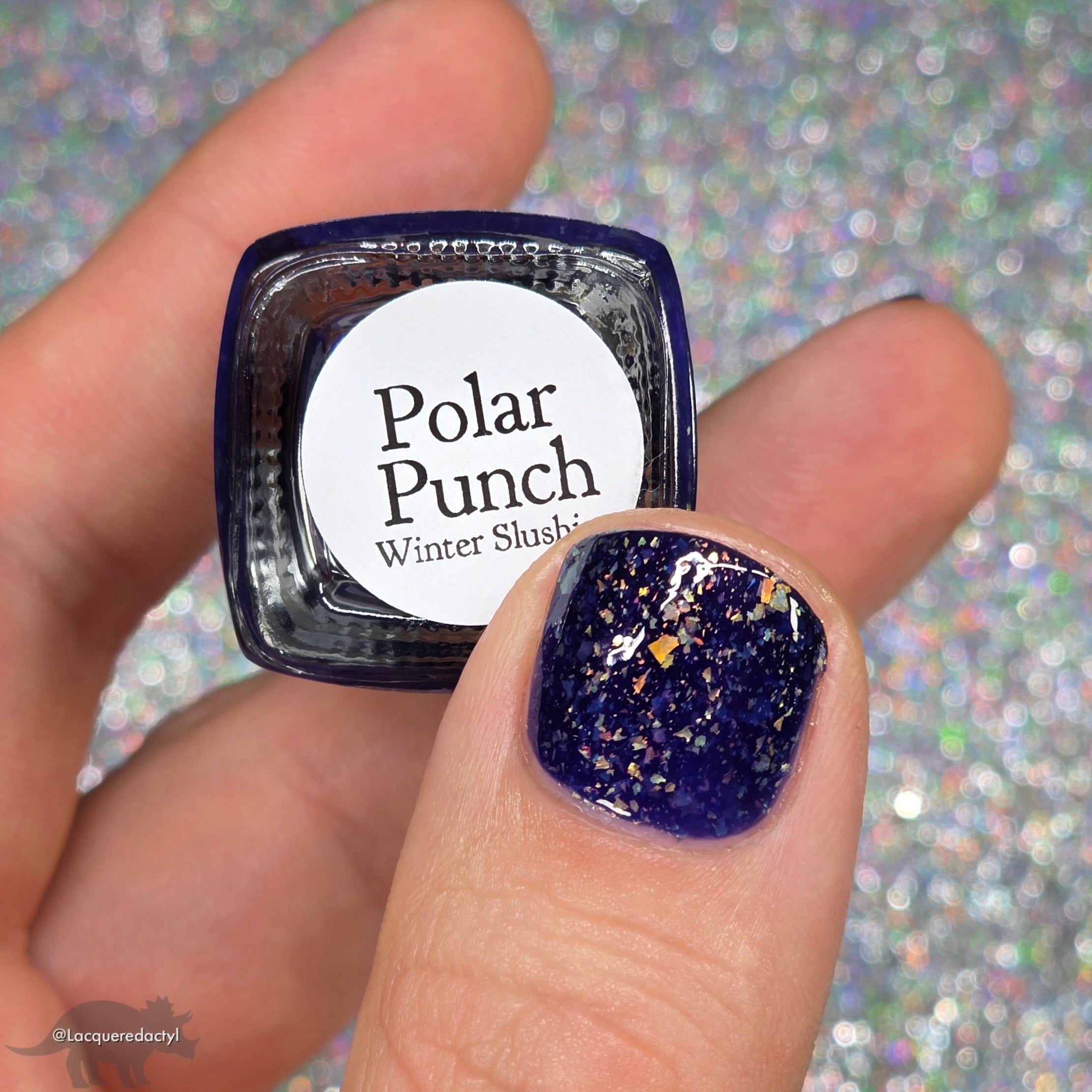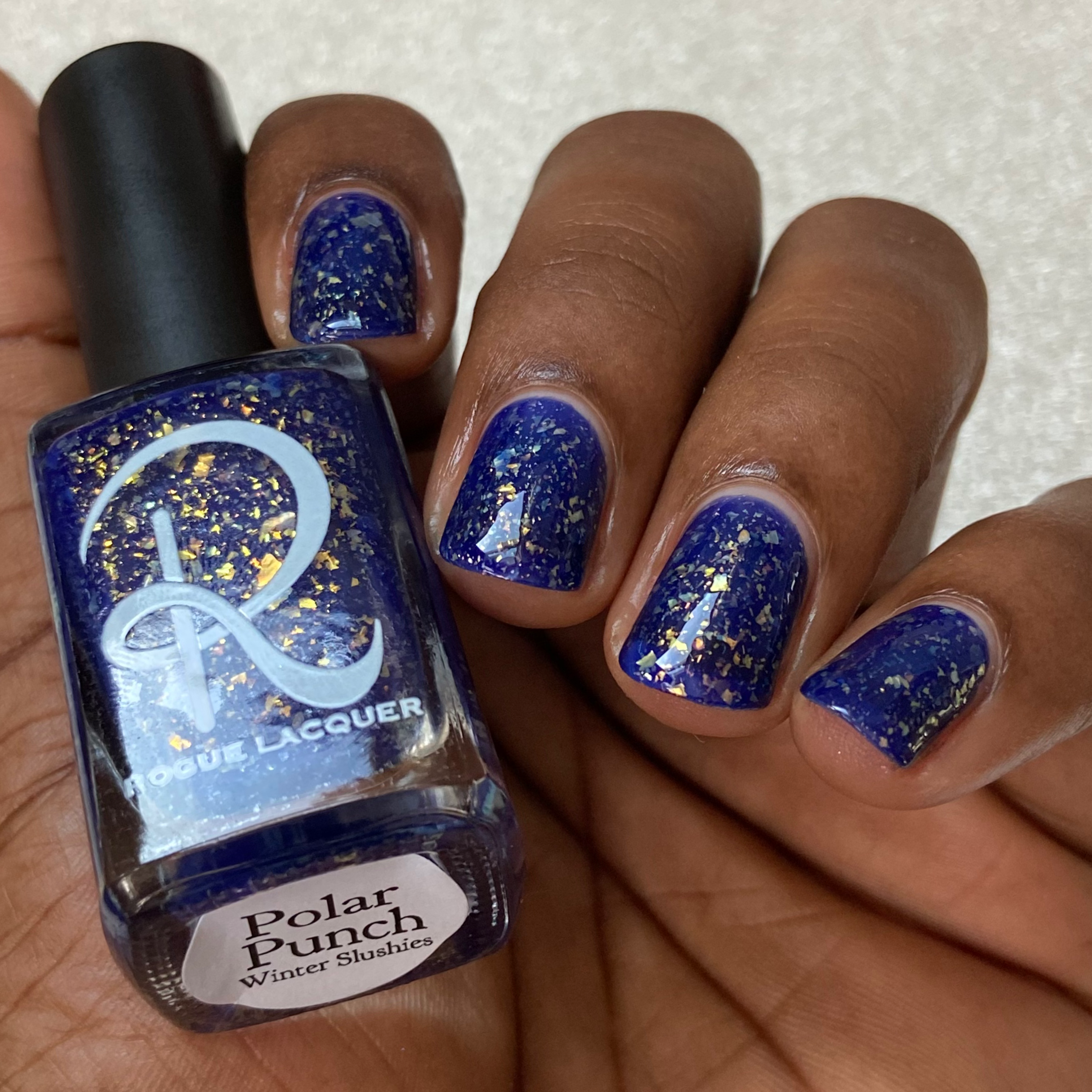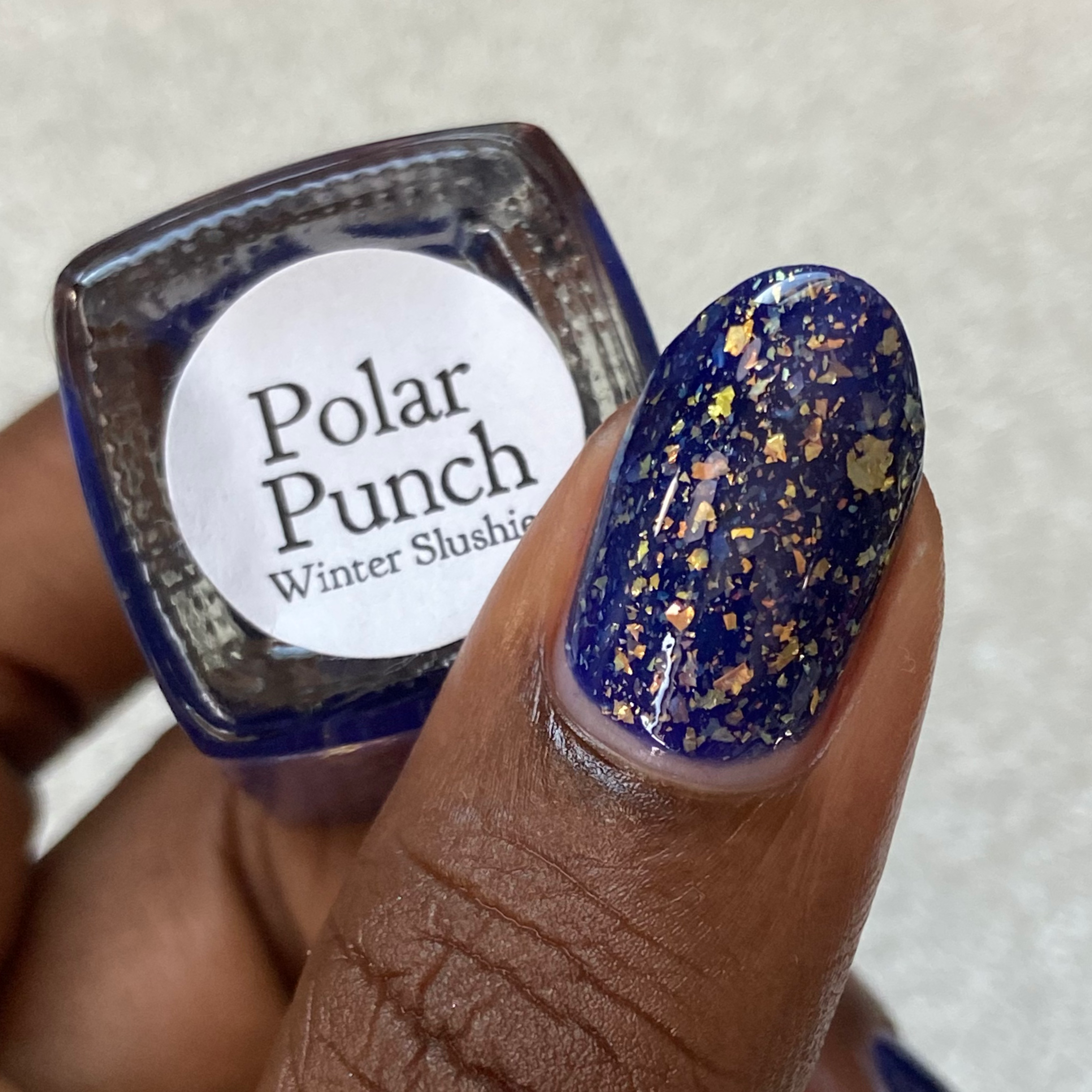 Polar punch - like a deep freeze with deep blue polish is like the sunshine hitting those ice cubes with golden glass flakes