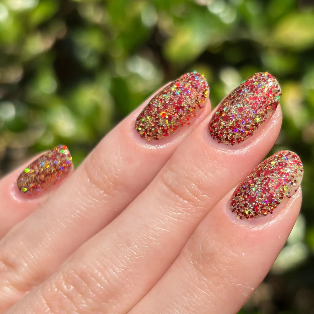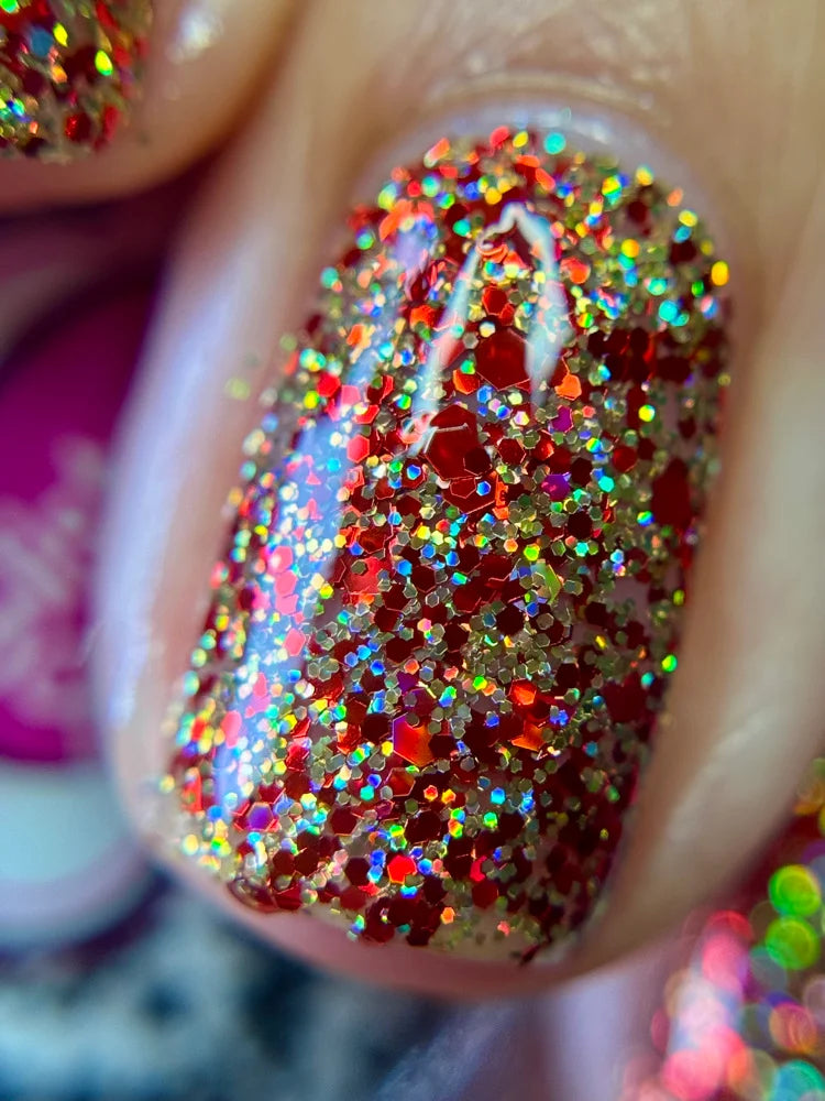Nail in the Coffin – dark green jellie polish loaded with color shifting iridescent flakes that shift red/orange/pink/yellow/green