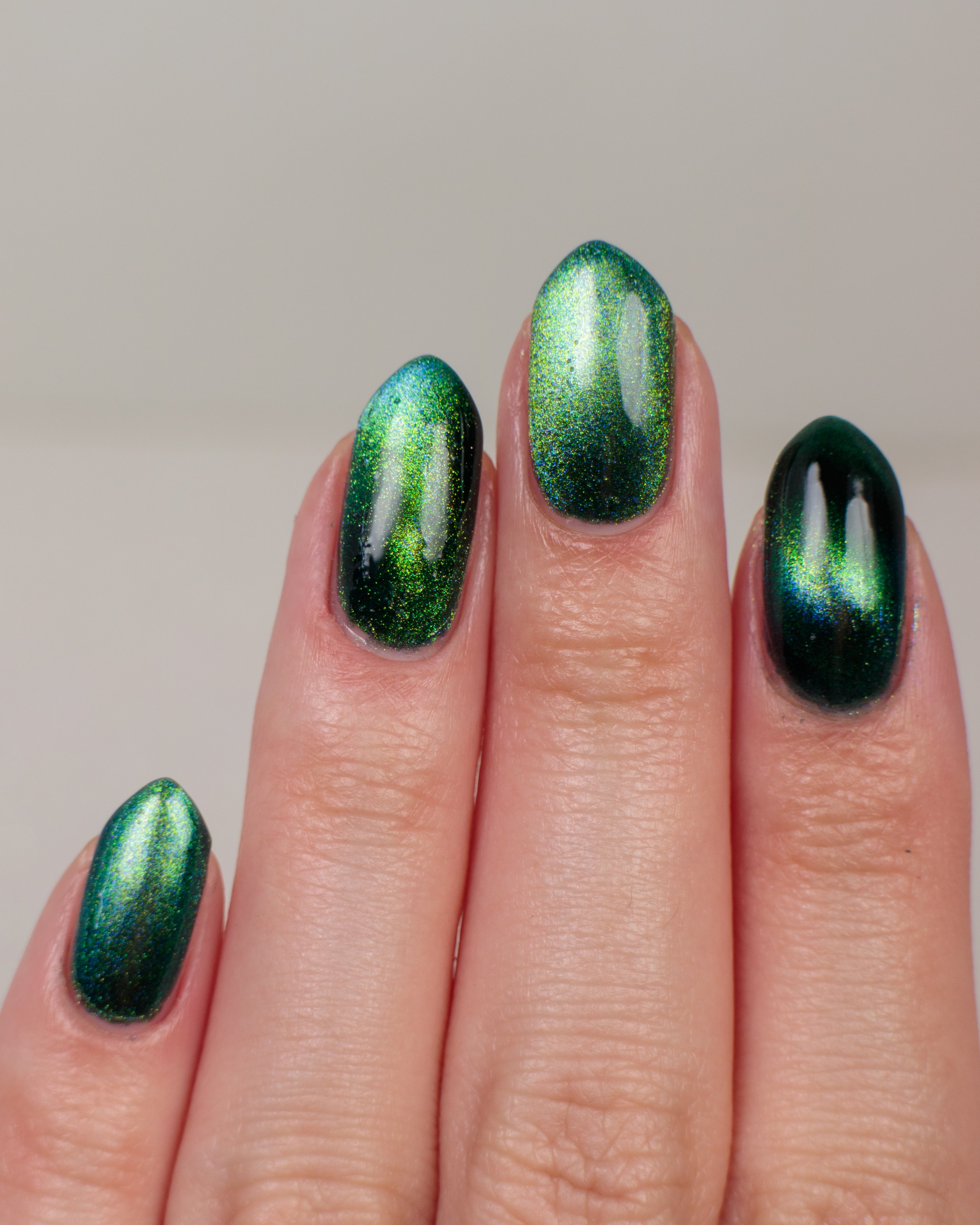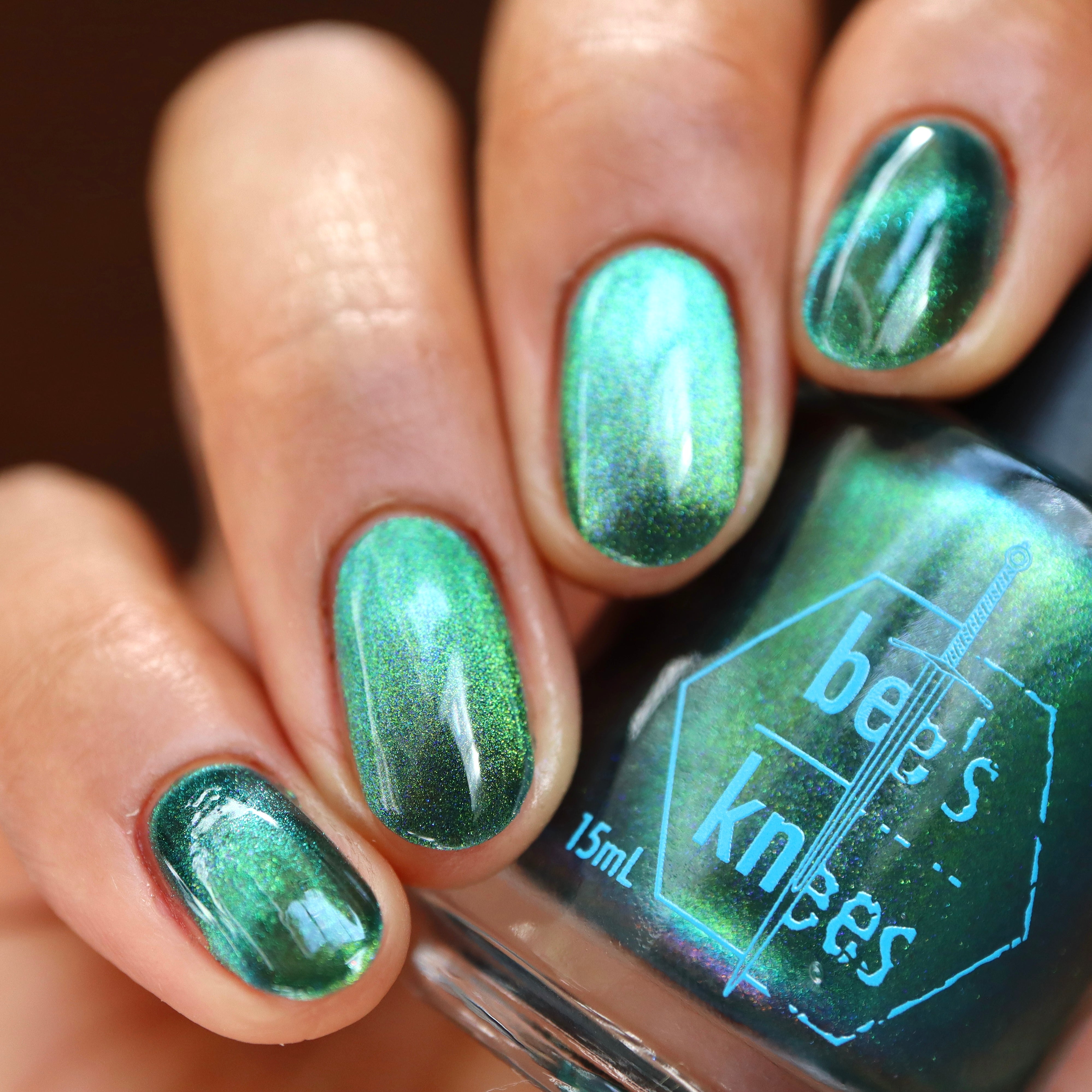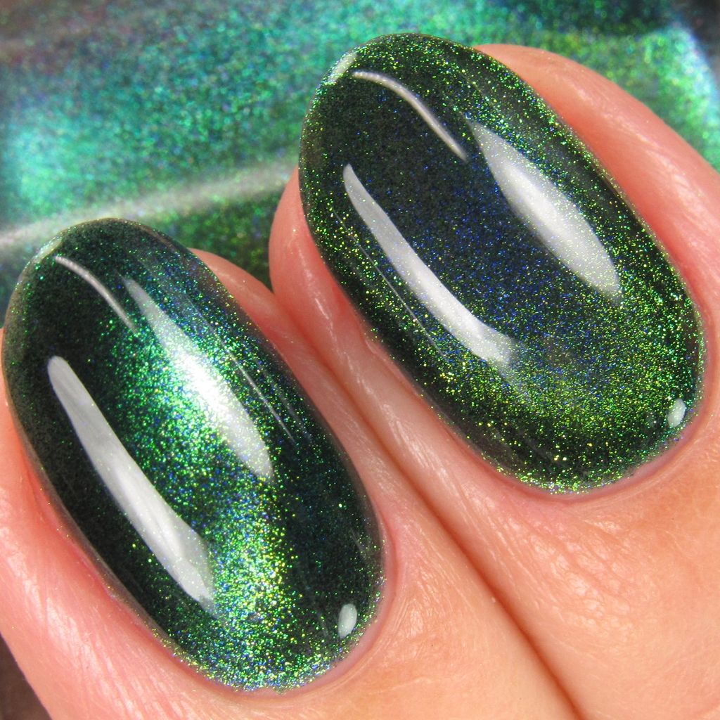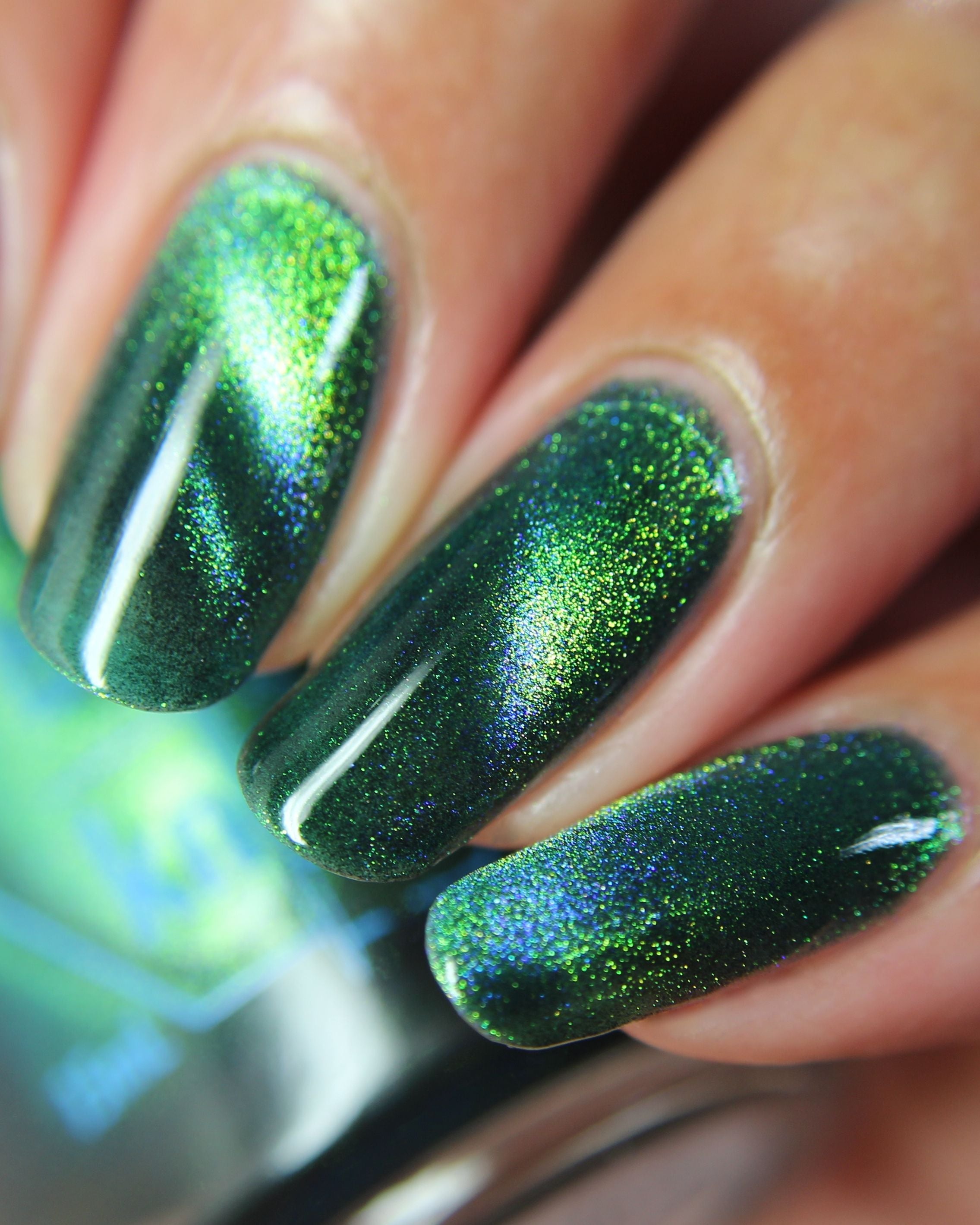 a deep turquoise with a mosaic magnetic that upon first glance looks like an ordinary green multichrome. When magnetized you will see both a bright green as well as a powder blue magnetic pigment