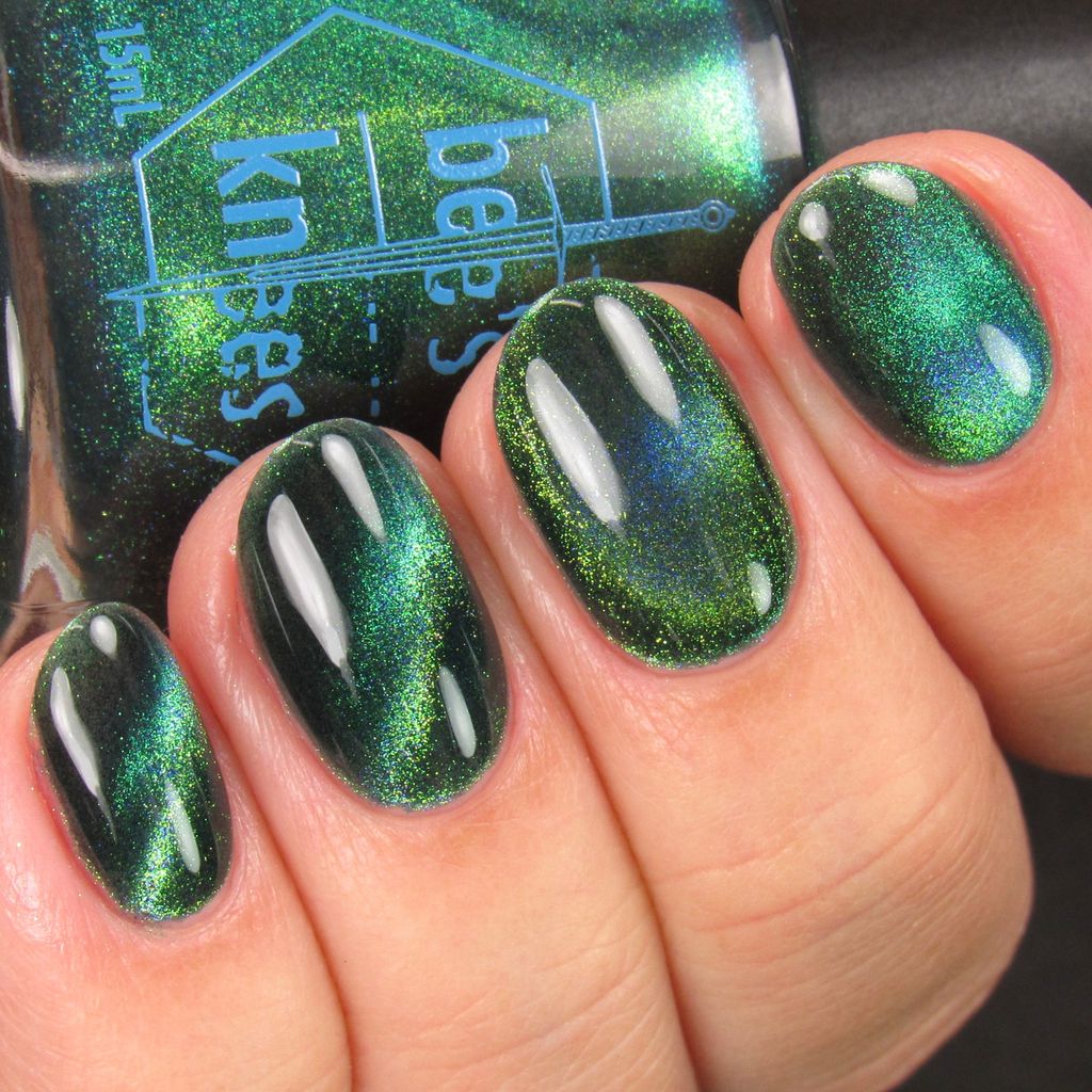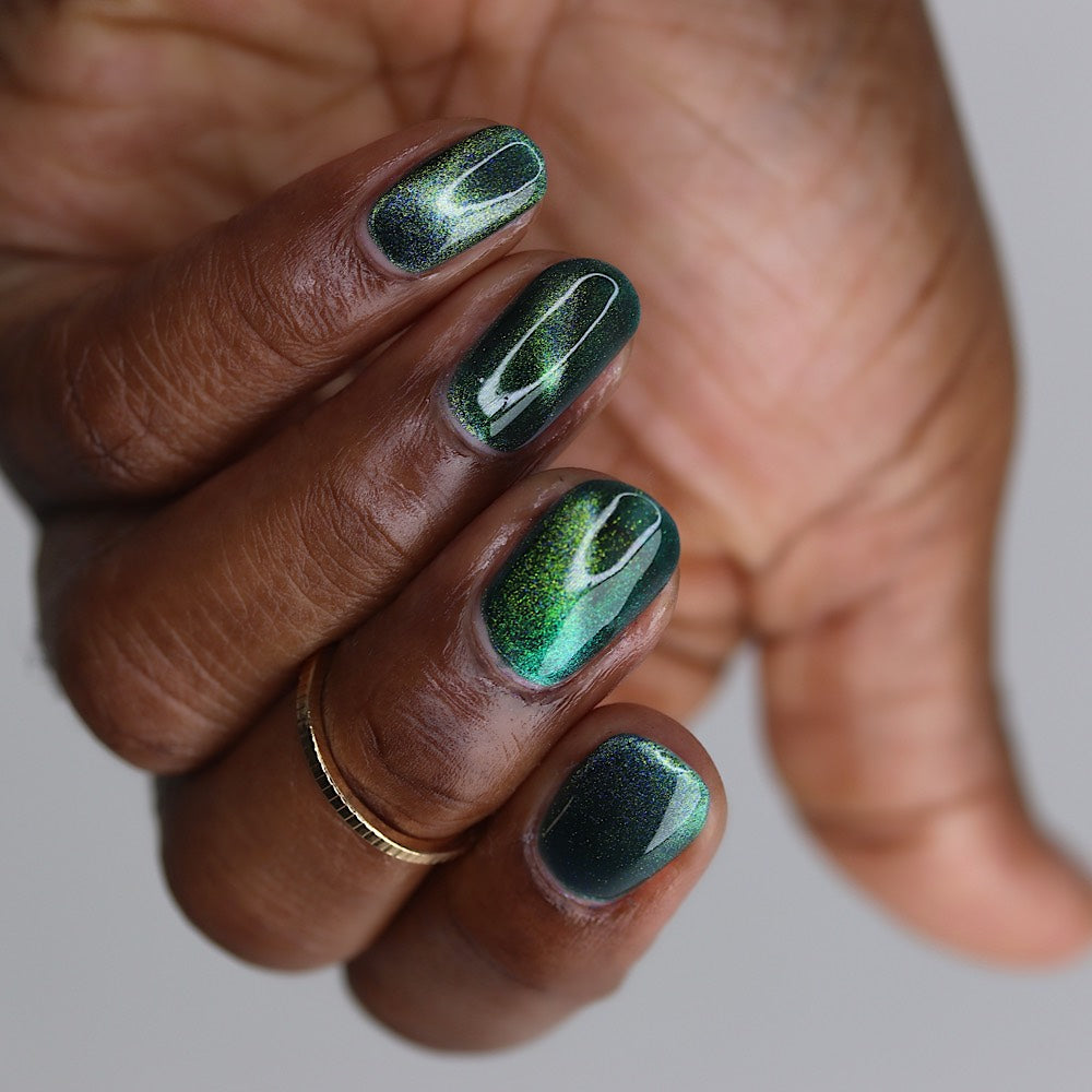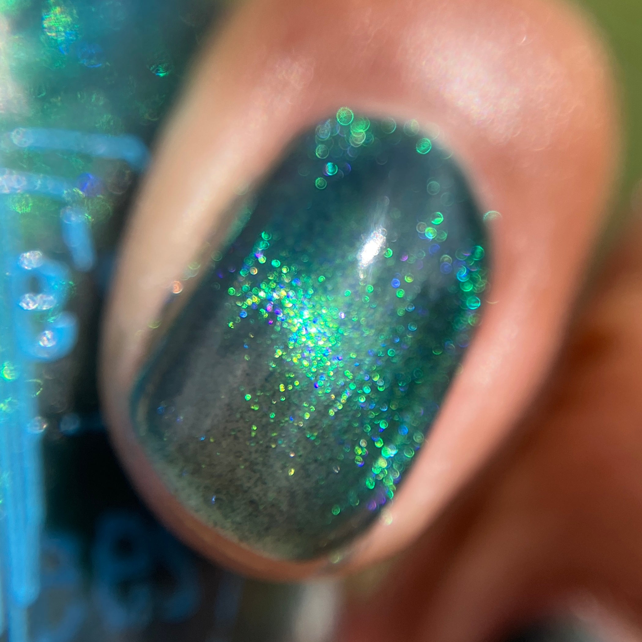a deep turquoise with a mosaic magnetic that upon first glance looks like an ordinary green multichrome. When magnetized you will see both a bright green as well as a powder blue magnetic pigment