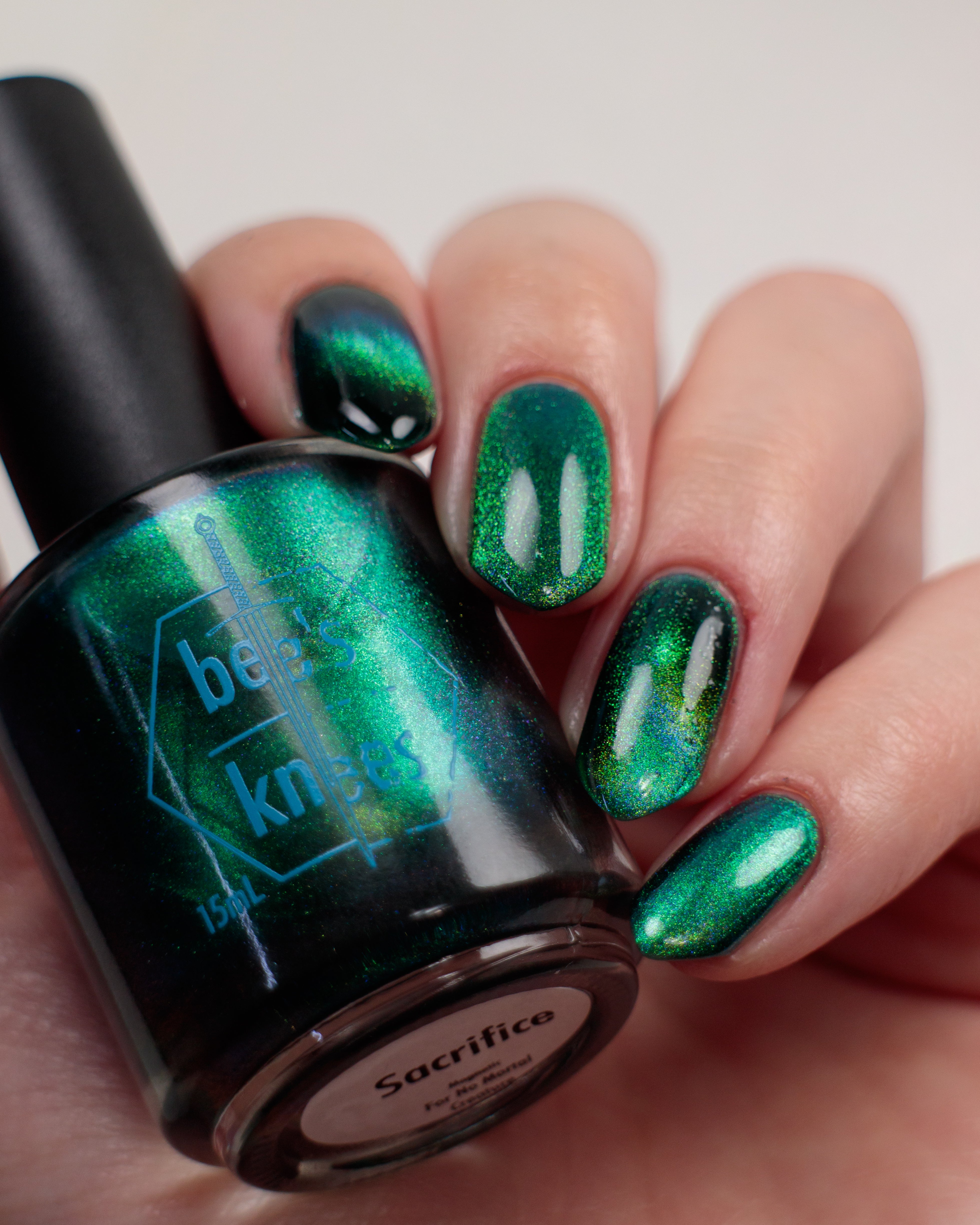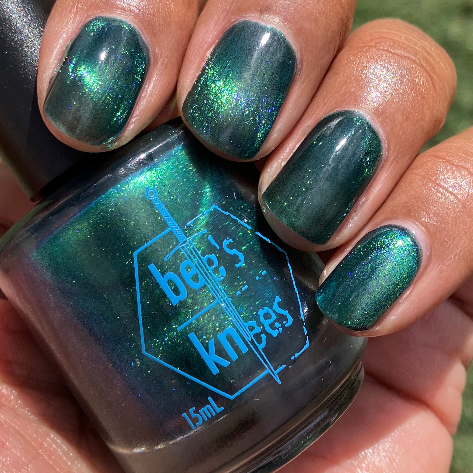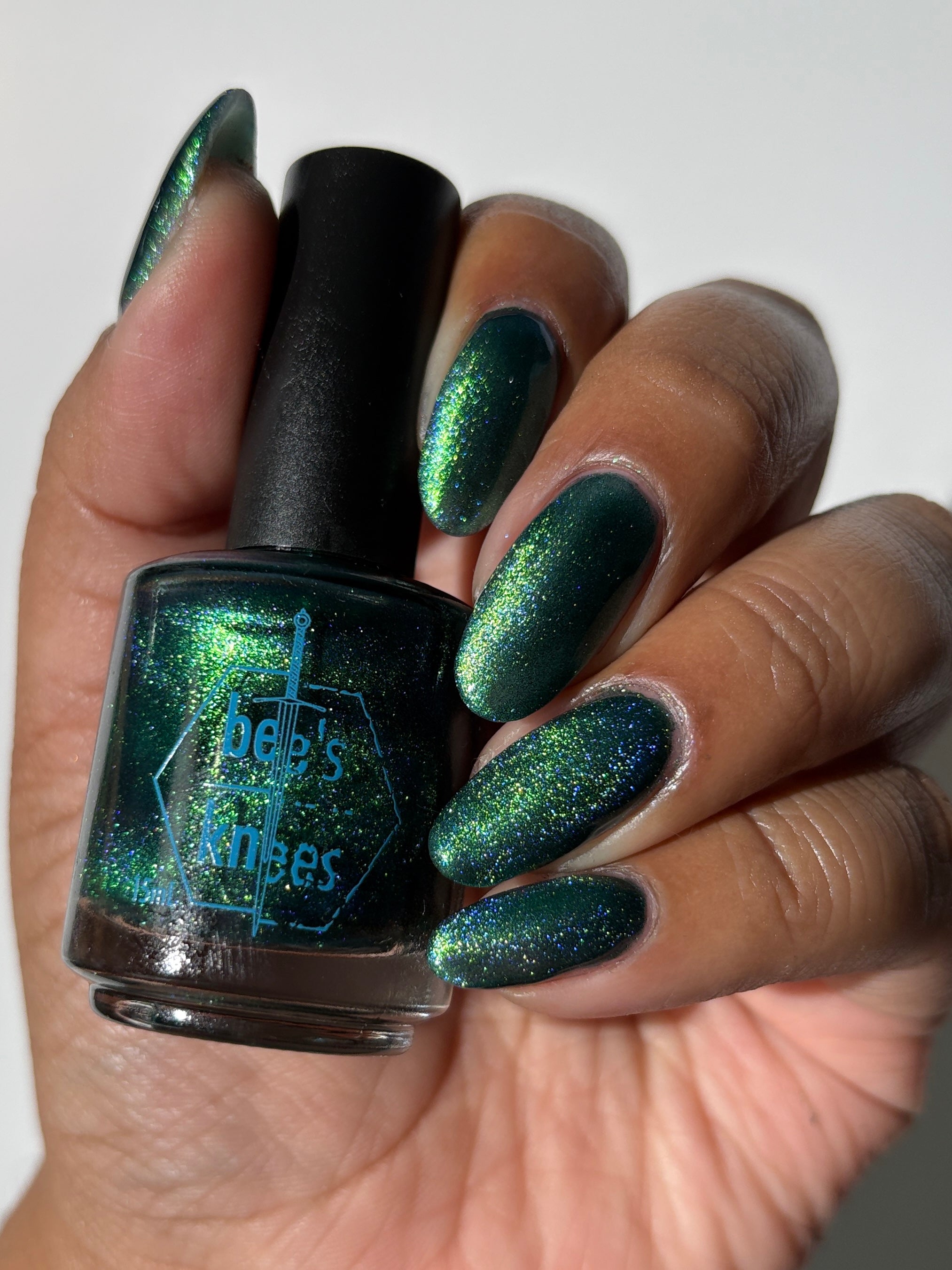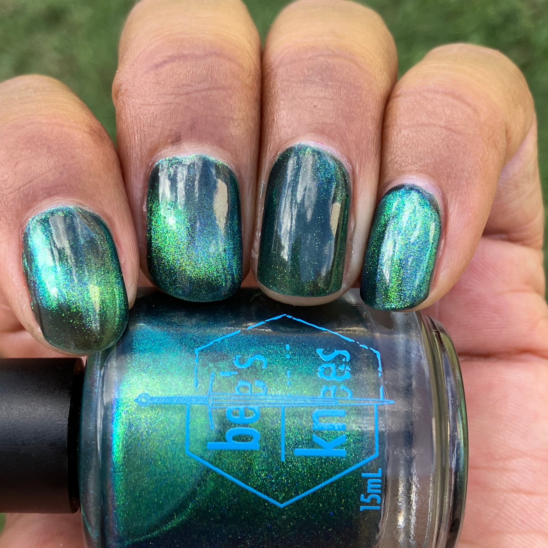 a deep turquoise with a mosaic magnetic that upon first glance looks like an ordinary green multichrome. When magnetized you will see both a bright green as well as a powder blue magnetic pigment