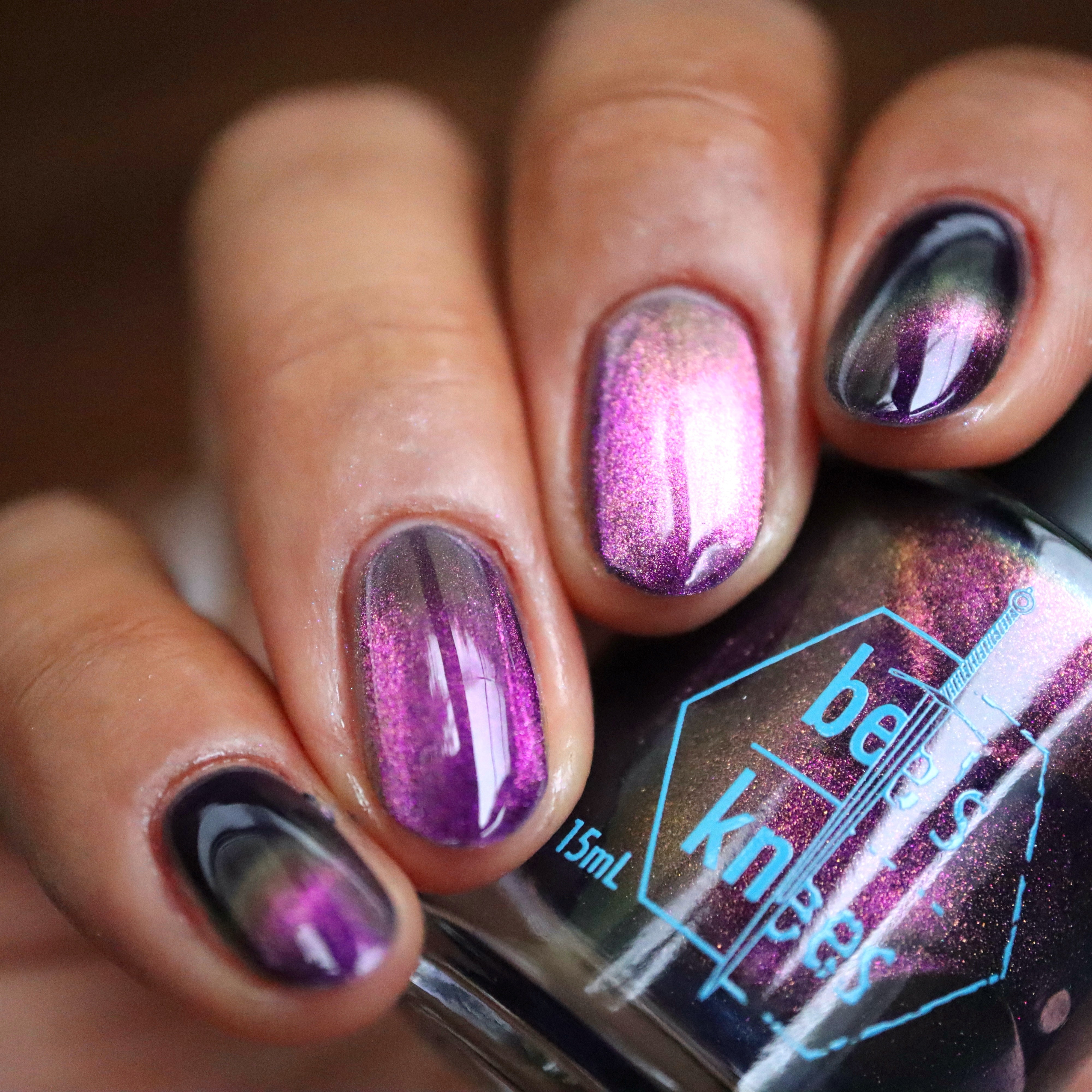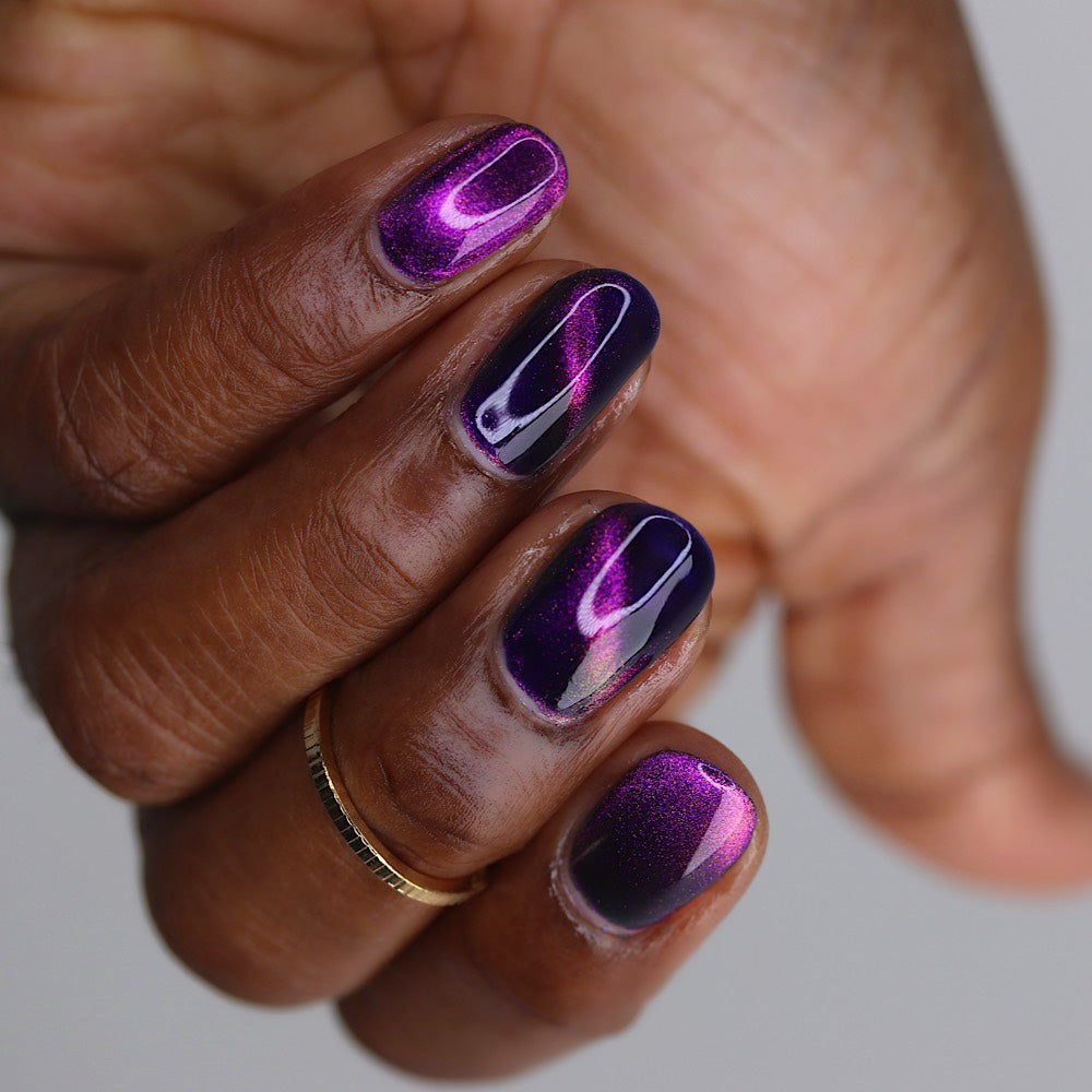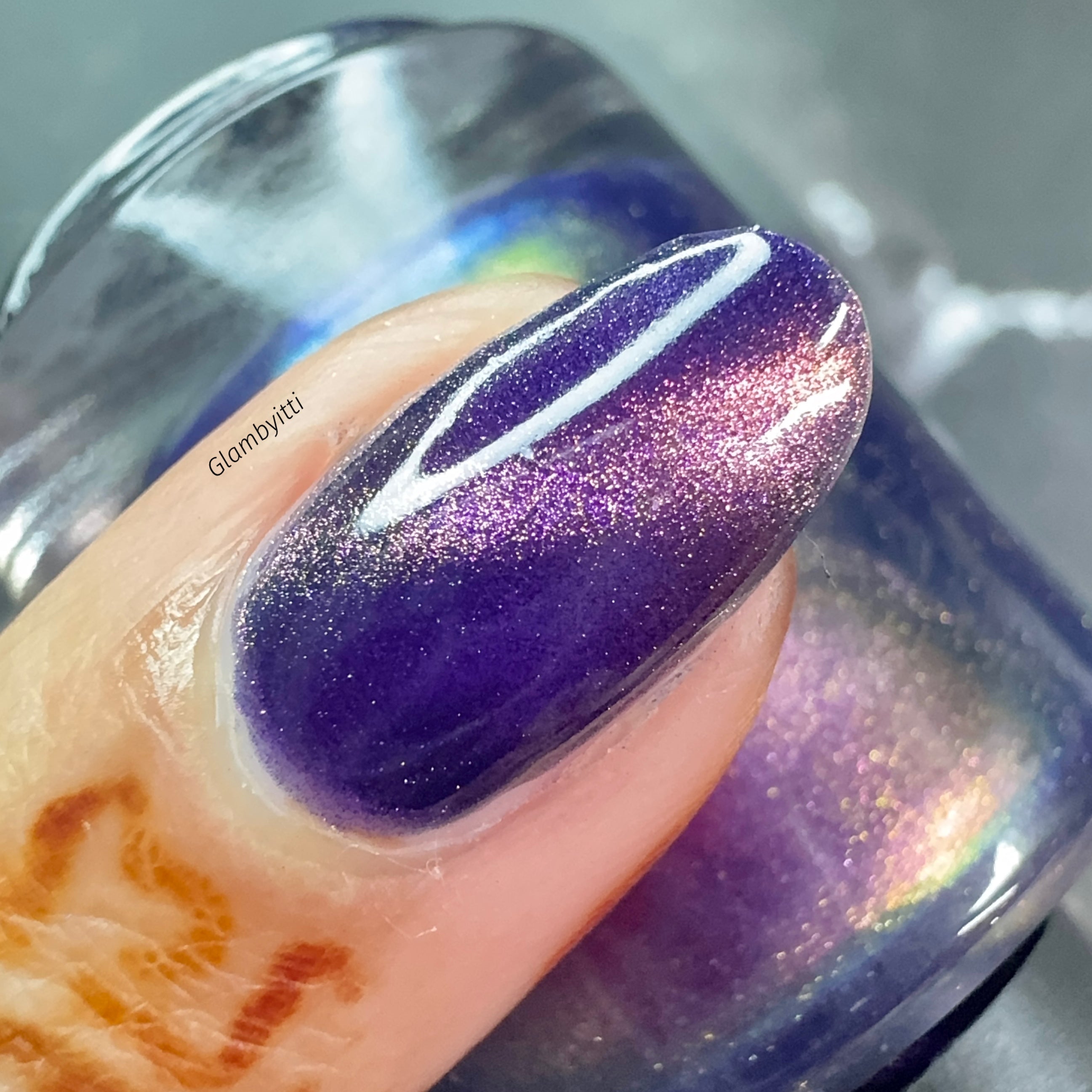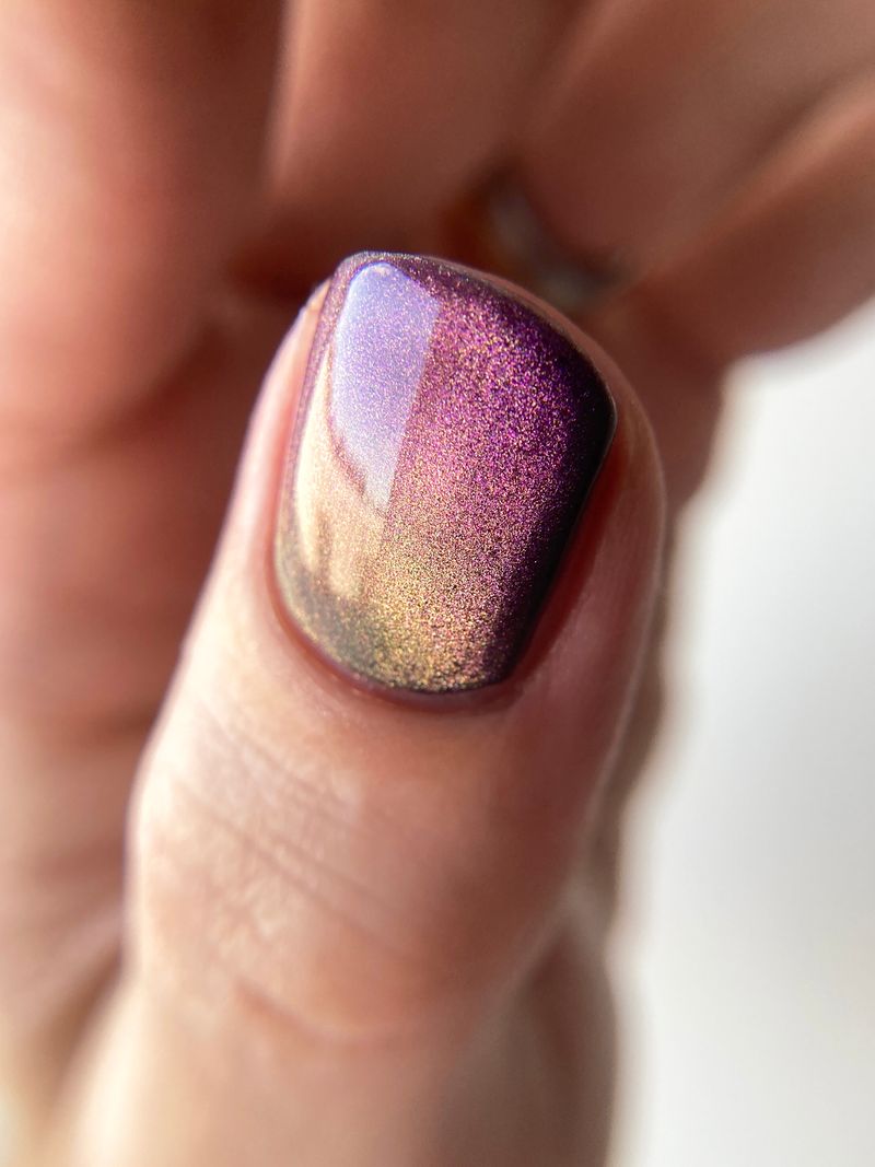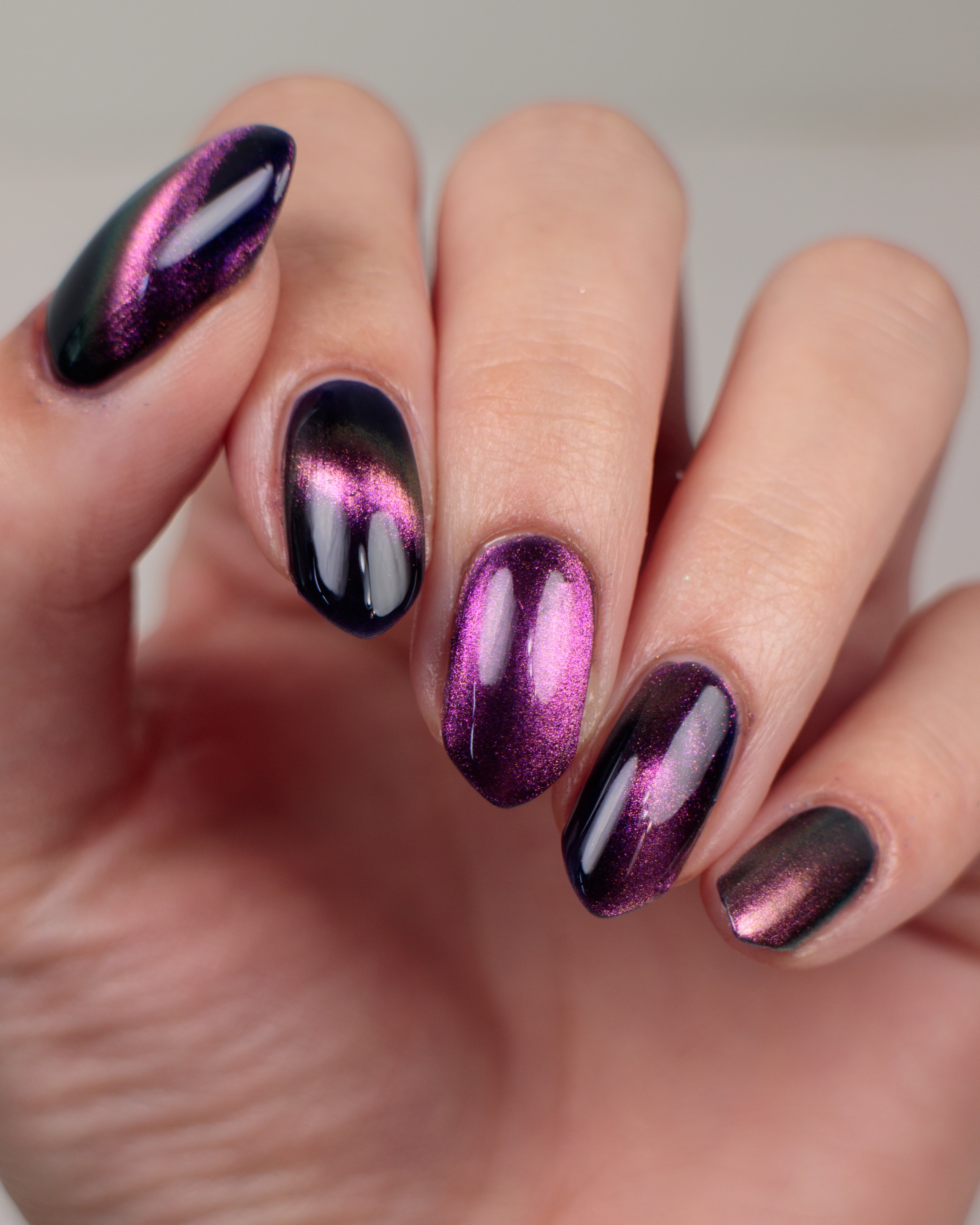 a violet base with a mosaic magnetic that upon first glance looks like an ordinary pink multichrome. When magnetized you will see both a bright pink as well as a rich gold magnetic pigment