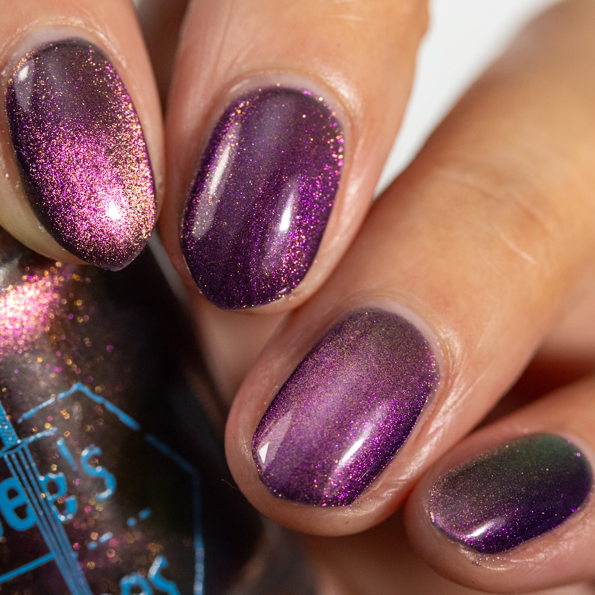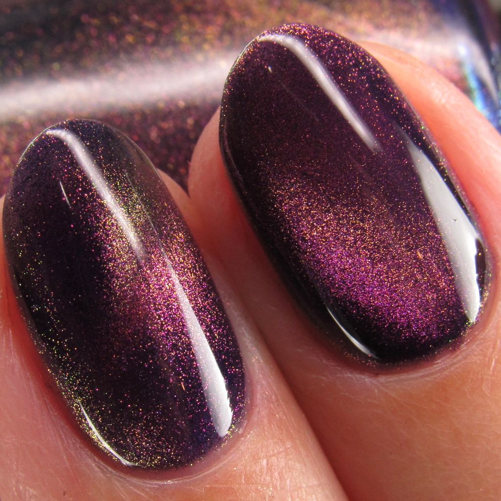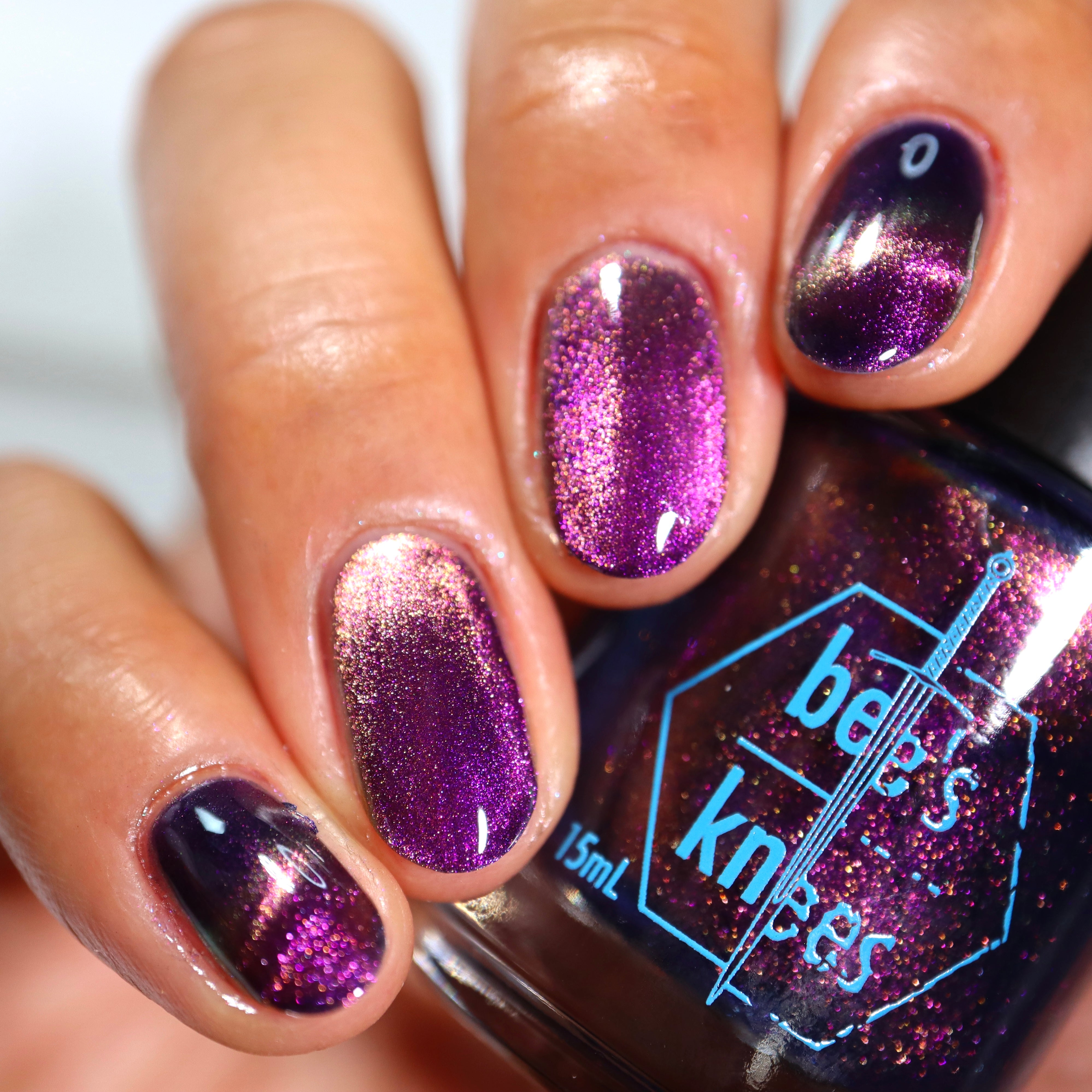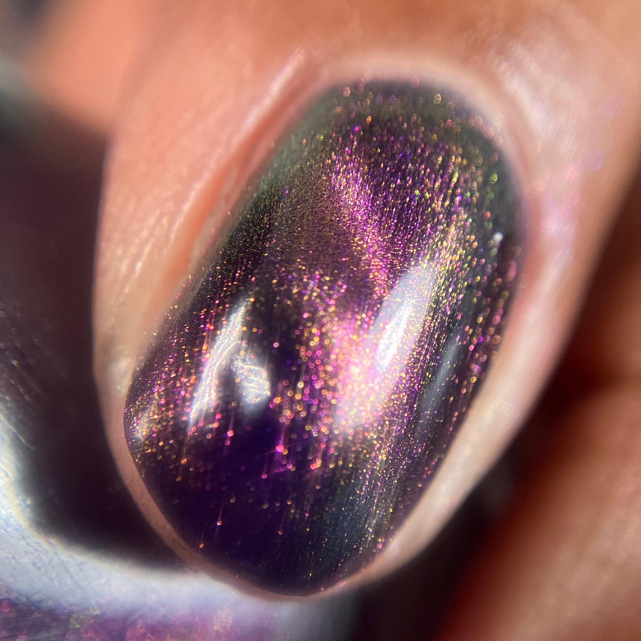 a violet base with a mosaic magnetic that upon first glance looks like an ordinary pink multichrome. When magnetized you will see both a bright pink as well as a rich gold magnetic pigment