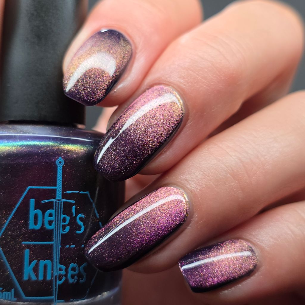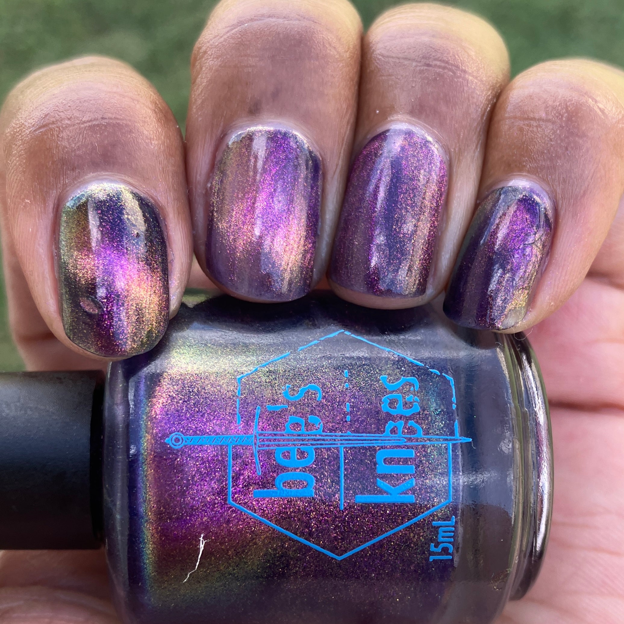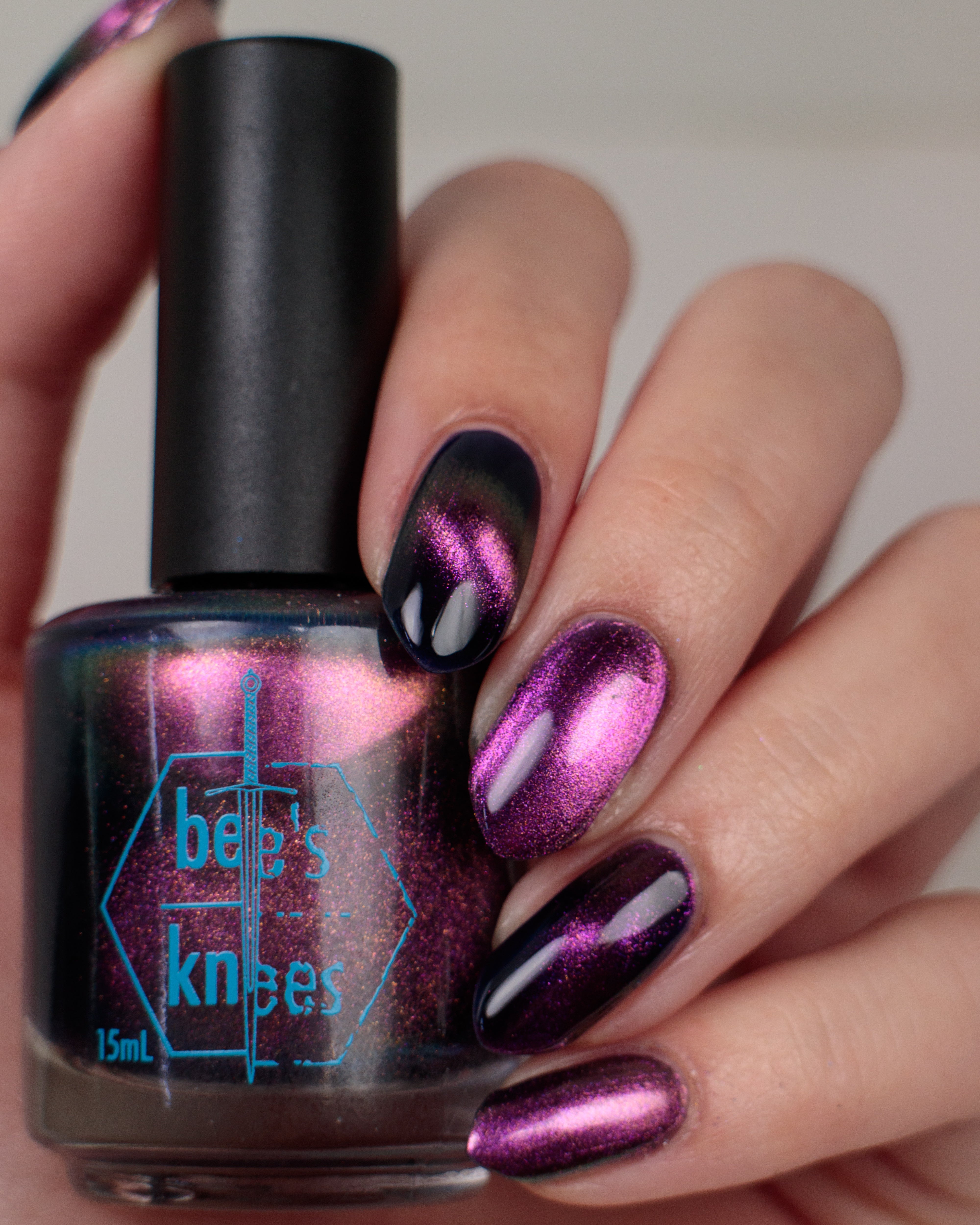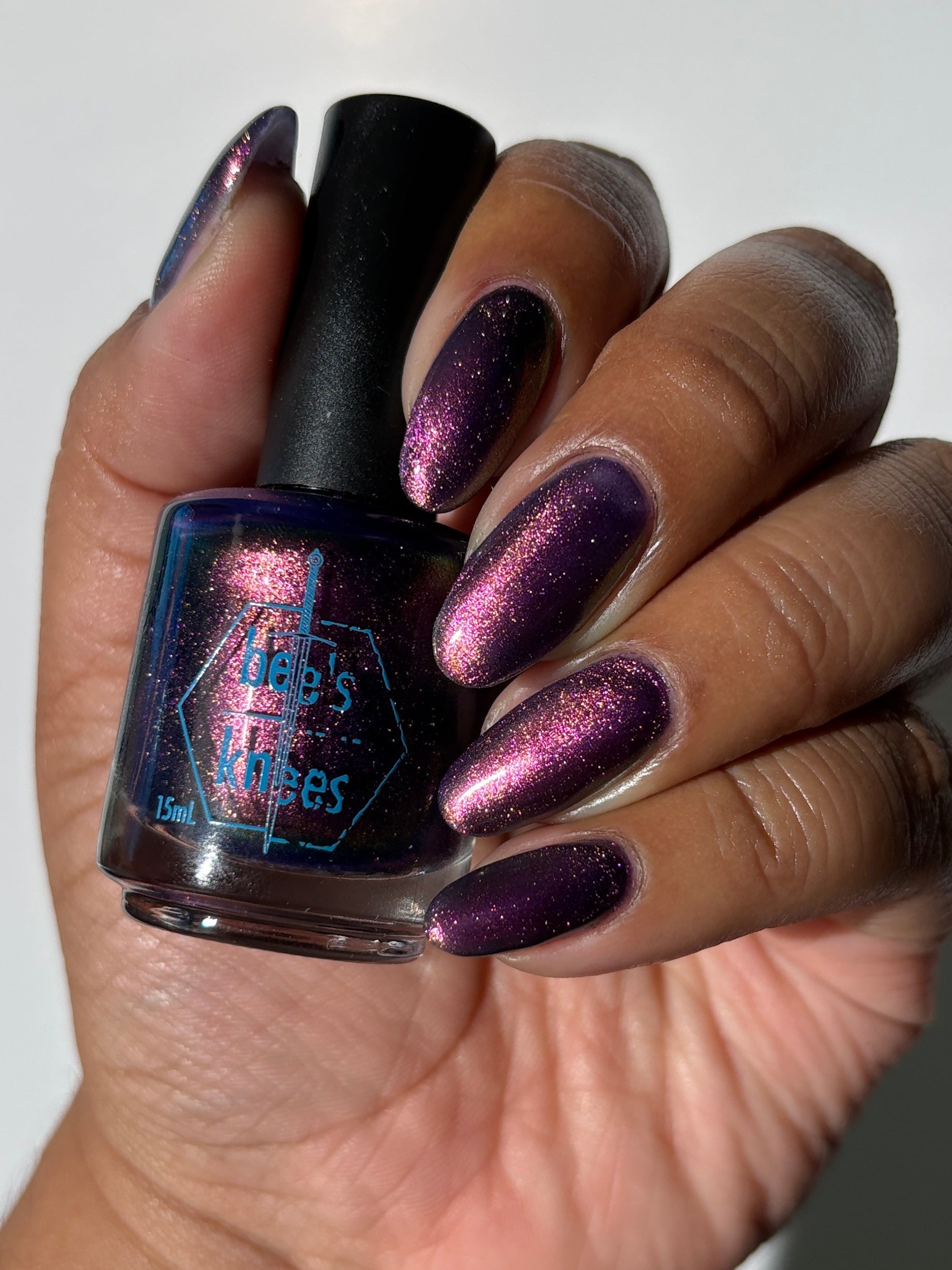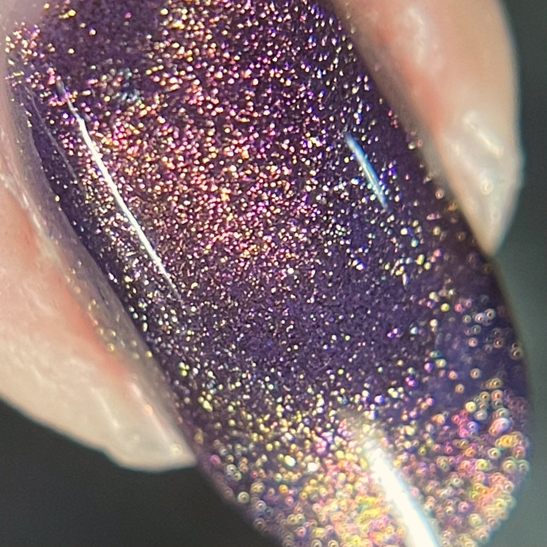 a violet base with a mosaic magnetic that upon first glance looks like an ordinary pink multichrome. When magnetized you will see both a bright pink as well as a rich gold magnetic pigment