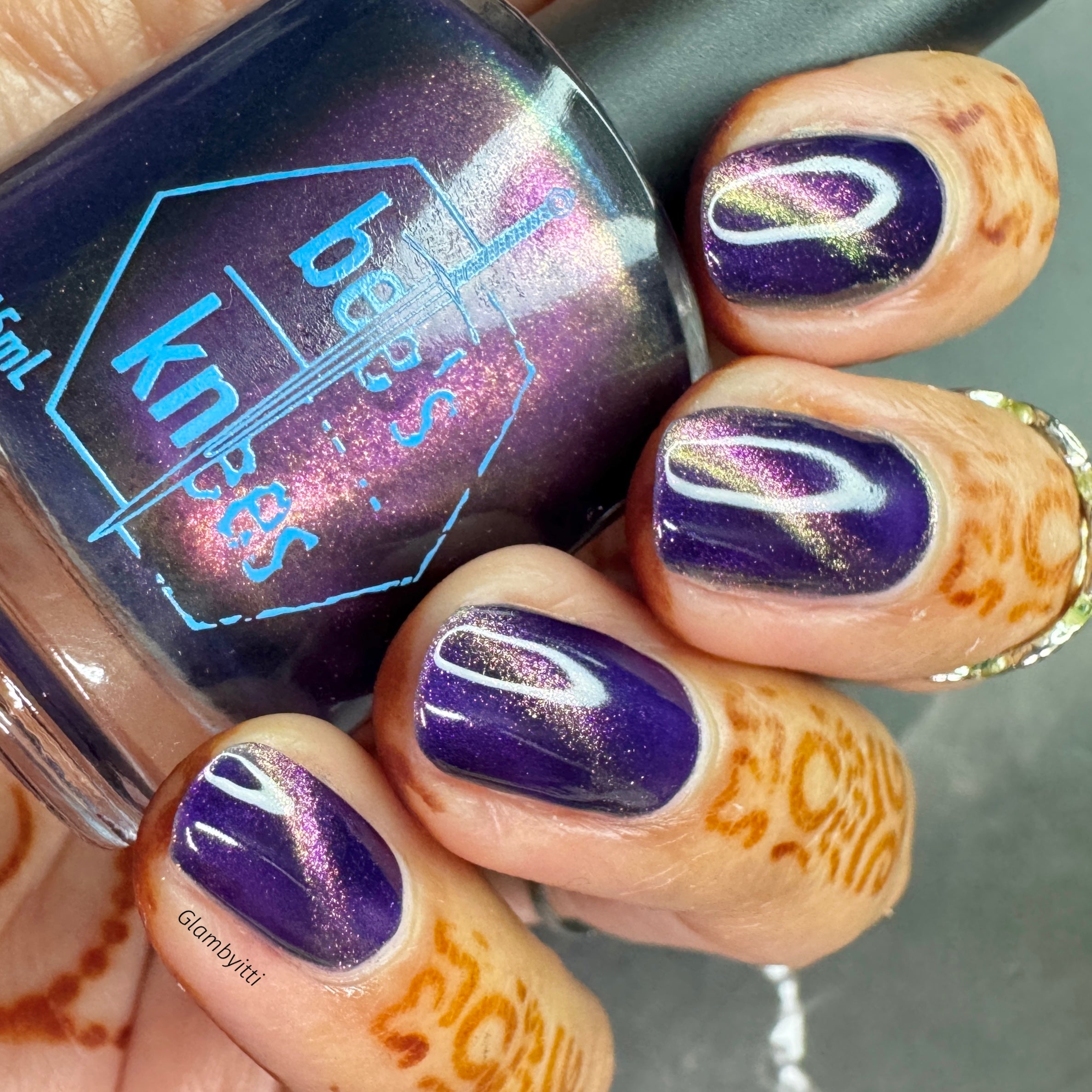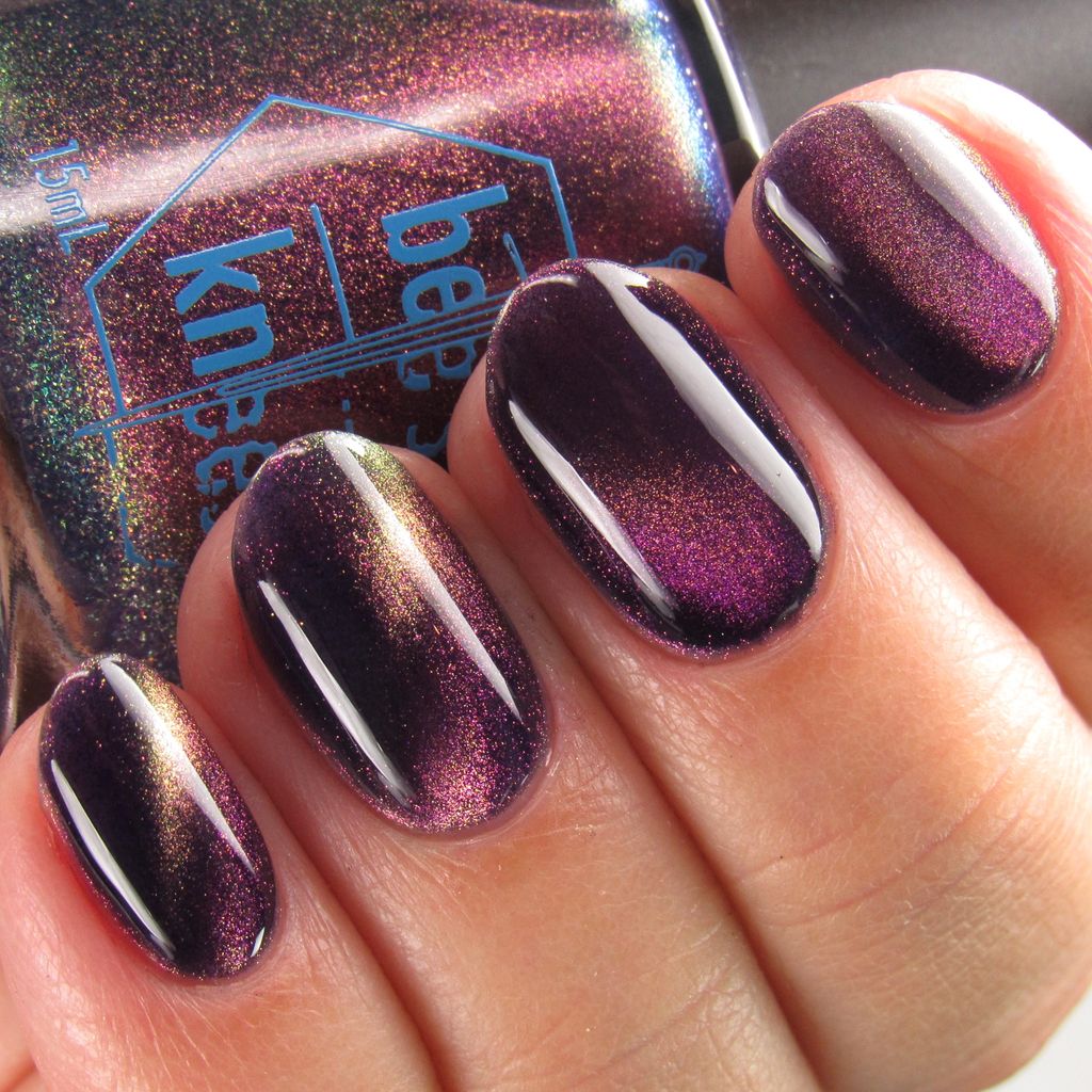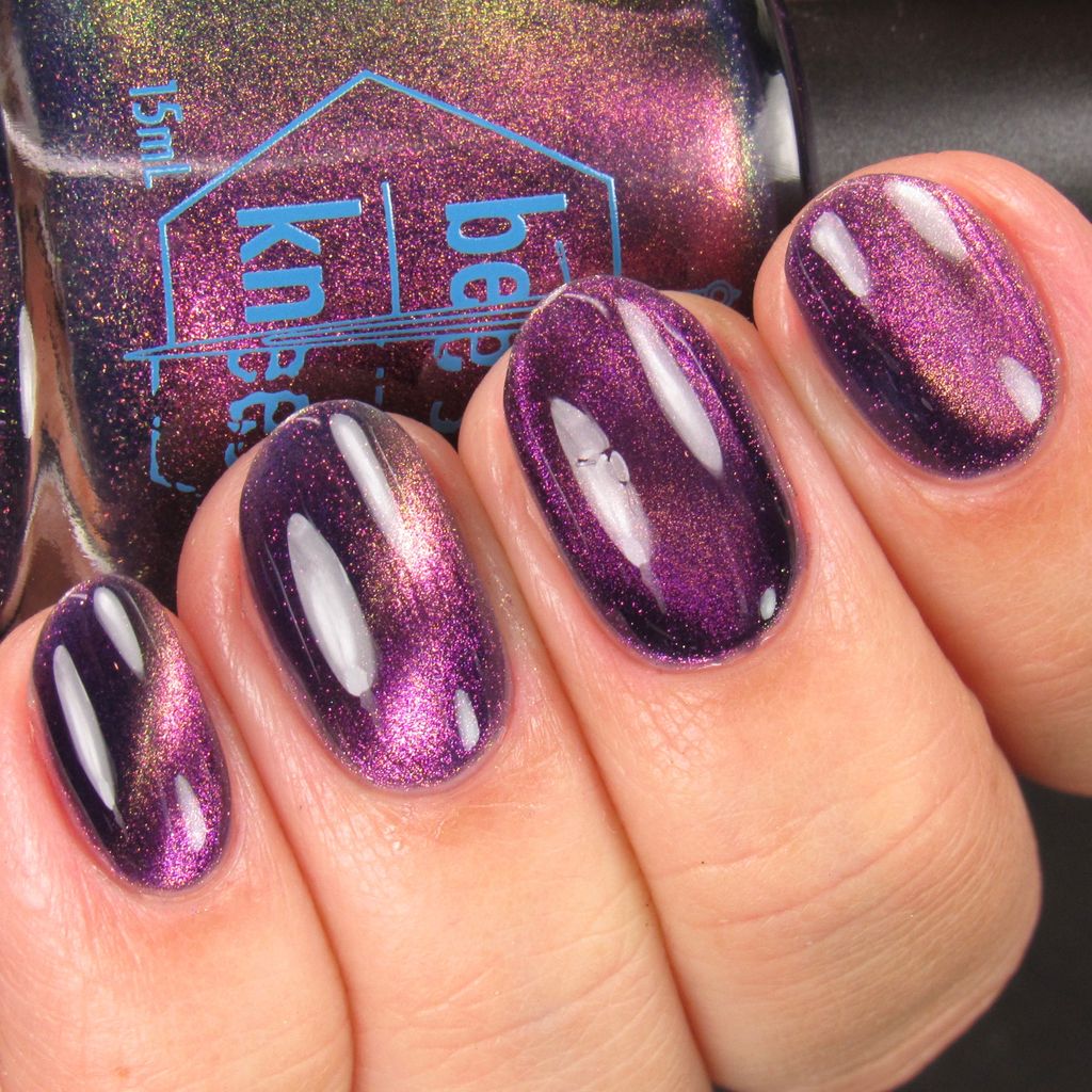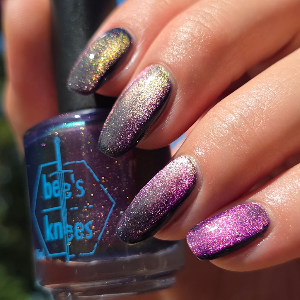 a violet base with a mosaic magnetic that upon first glance looks like an ordinary pink multichrome. When magnetized you will see both a bright pink as well as a rich gold magnetic pigment