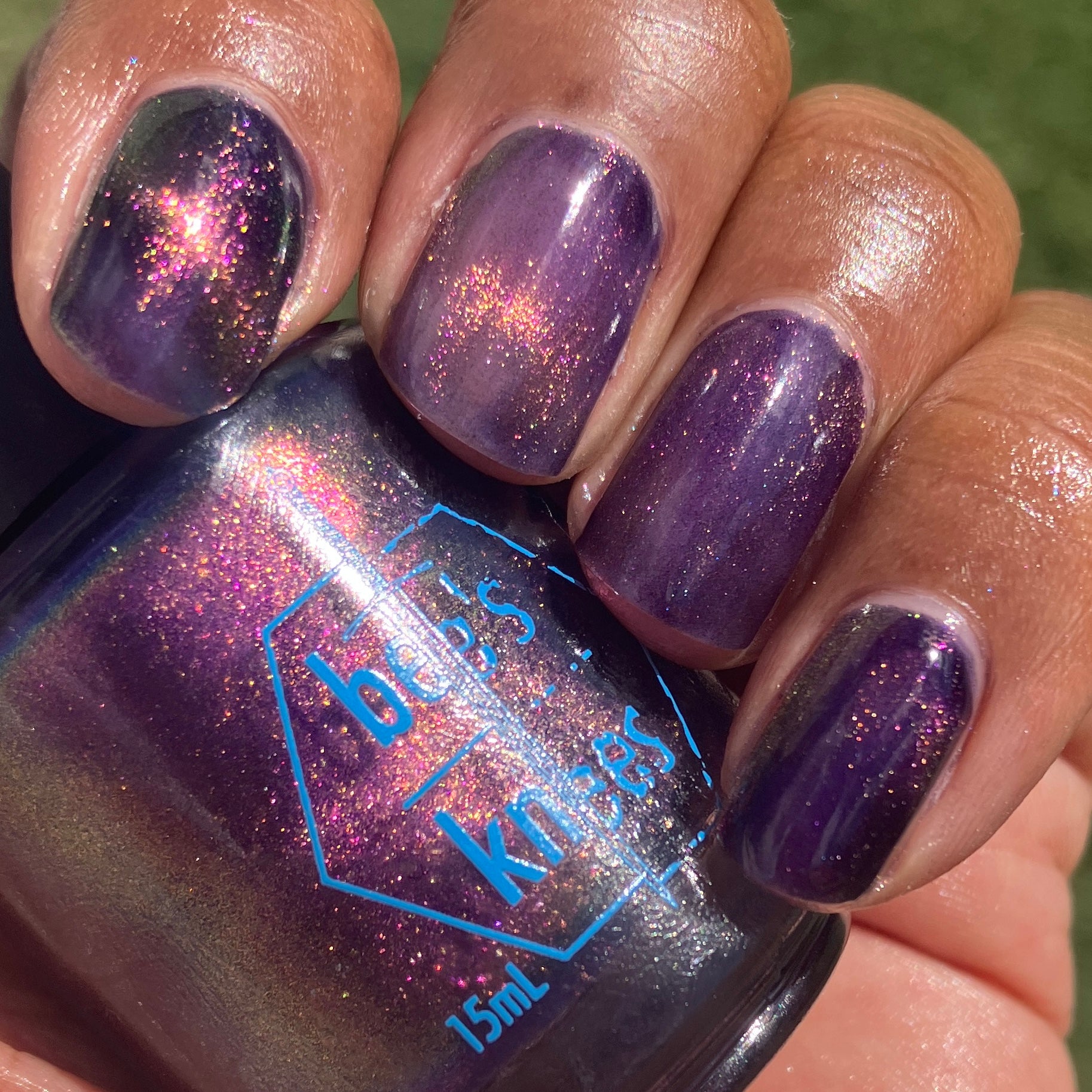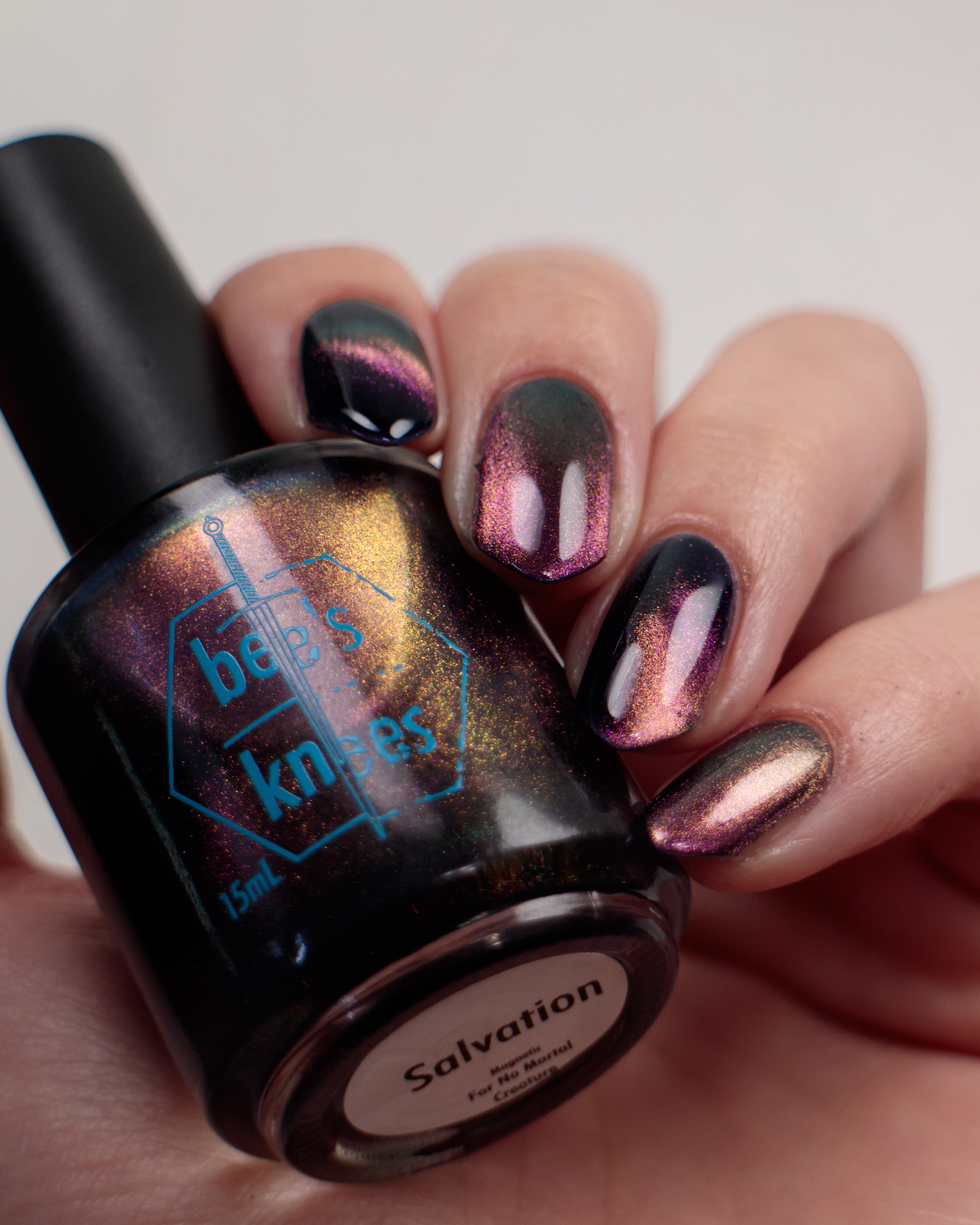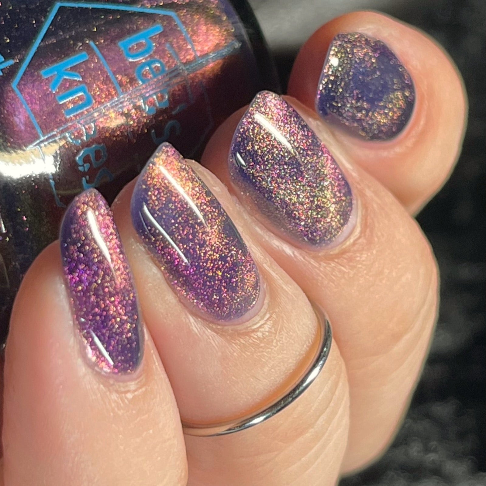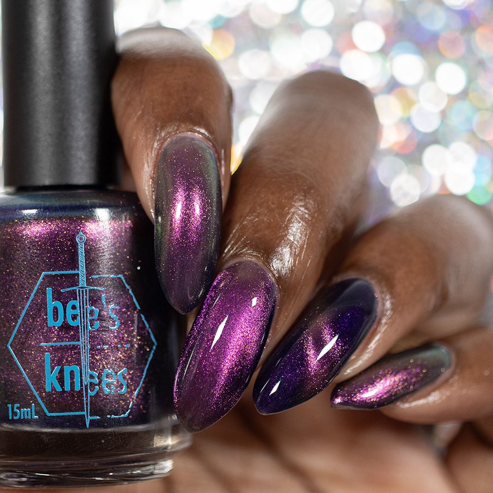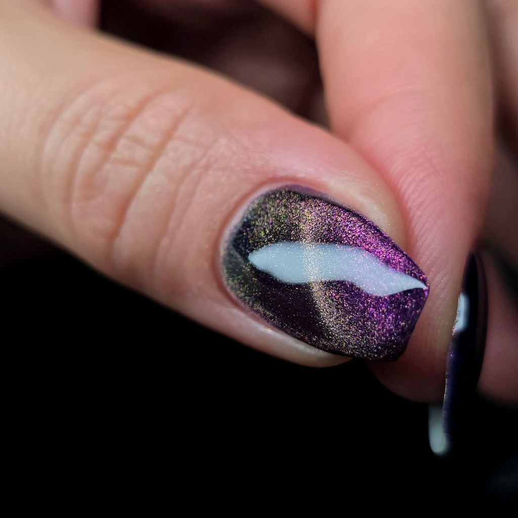 a violet base with a mosaic magnetic that upon first glance looks like an ordinary pink multichrome. When magnetized you will see both a bright pink as well as a rich gold magnetic pigment
