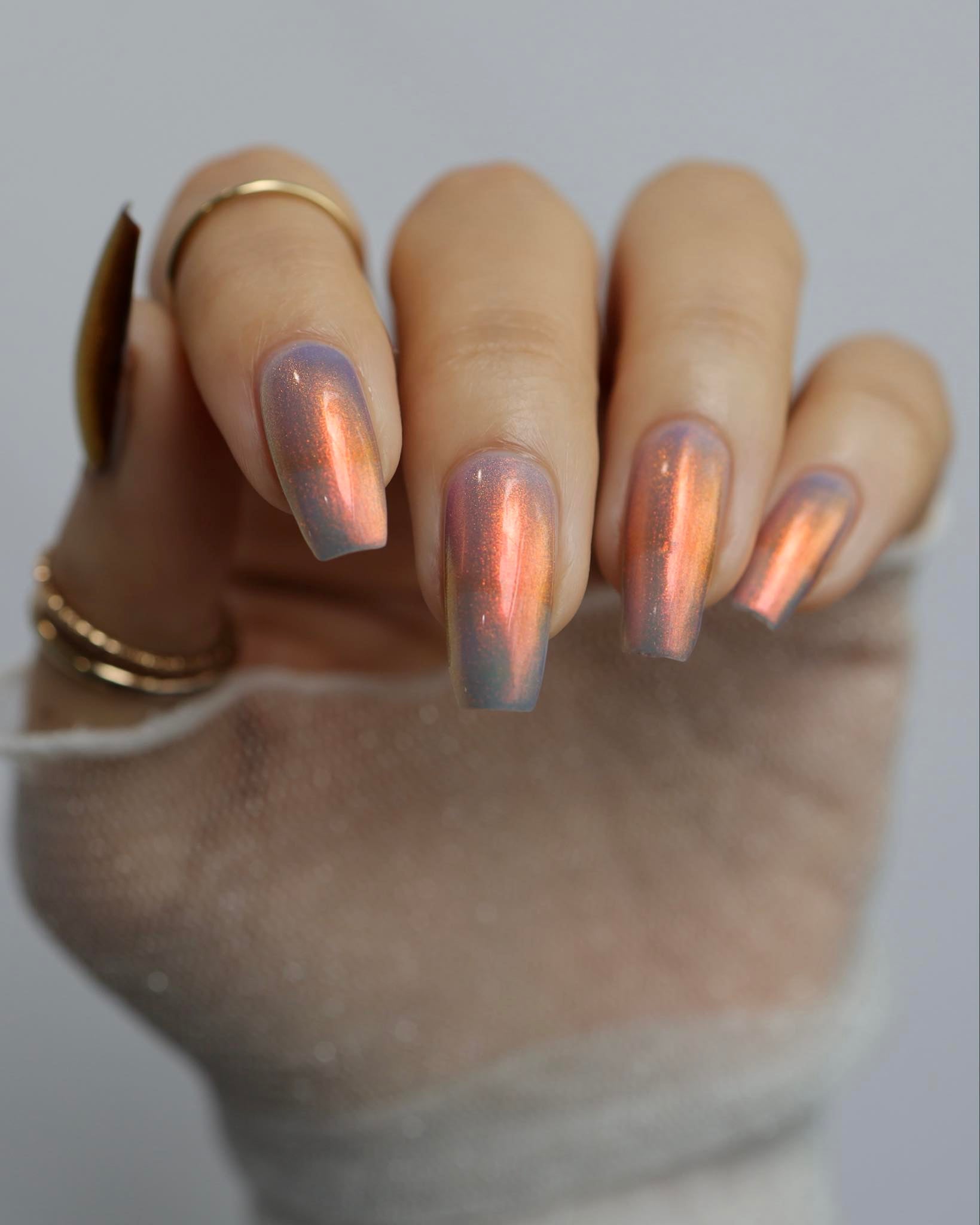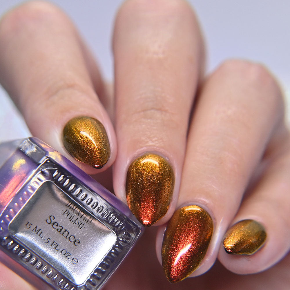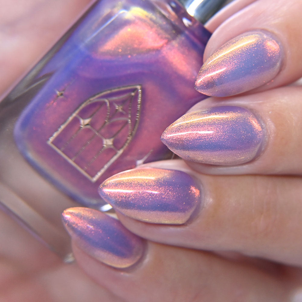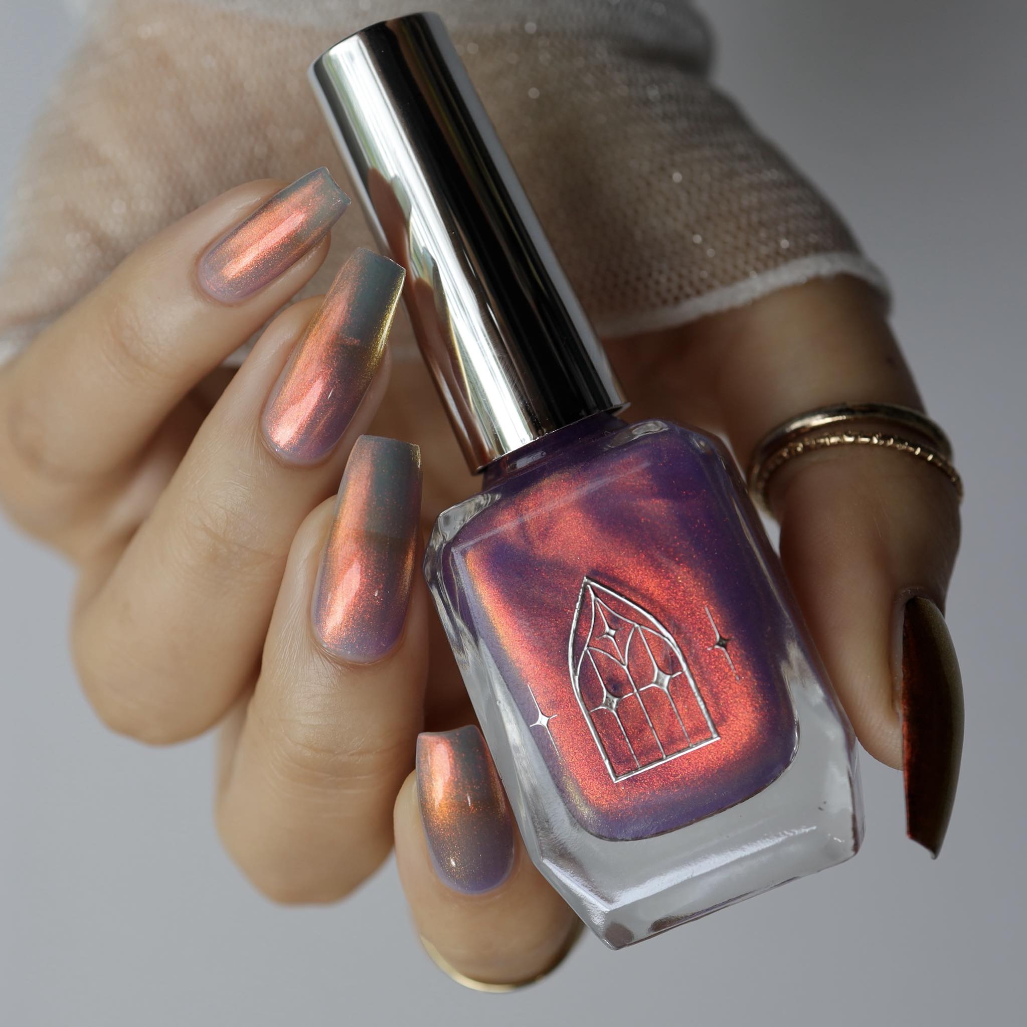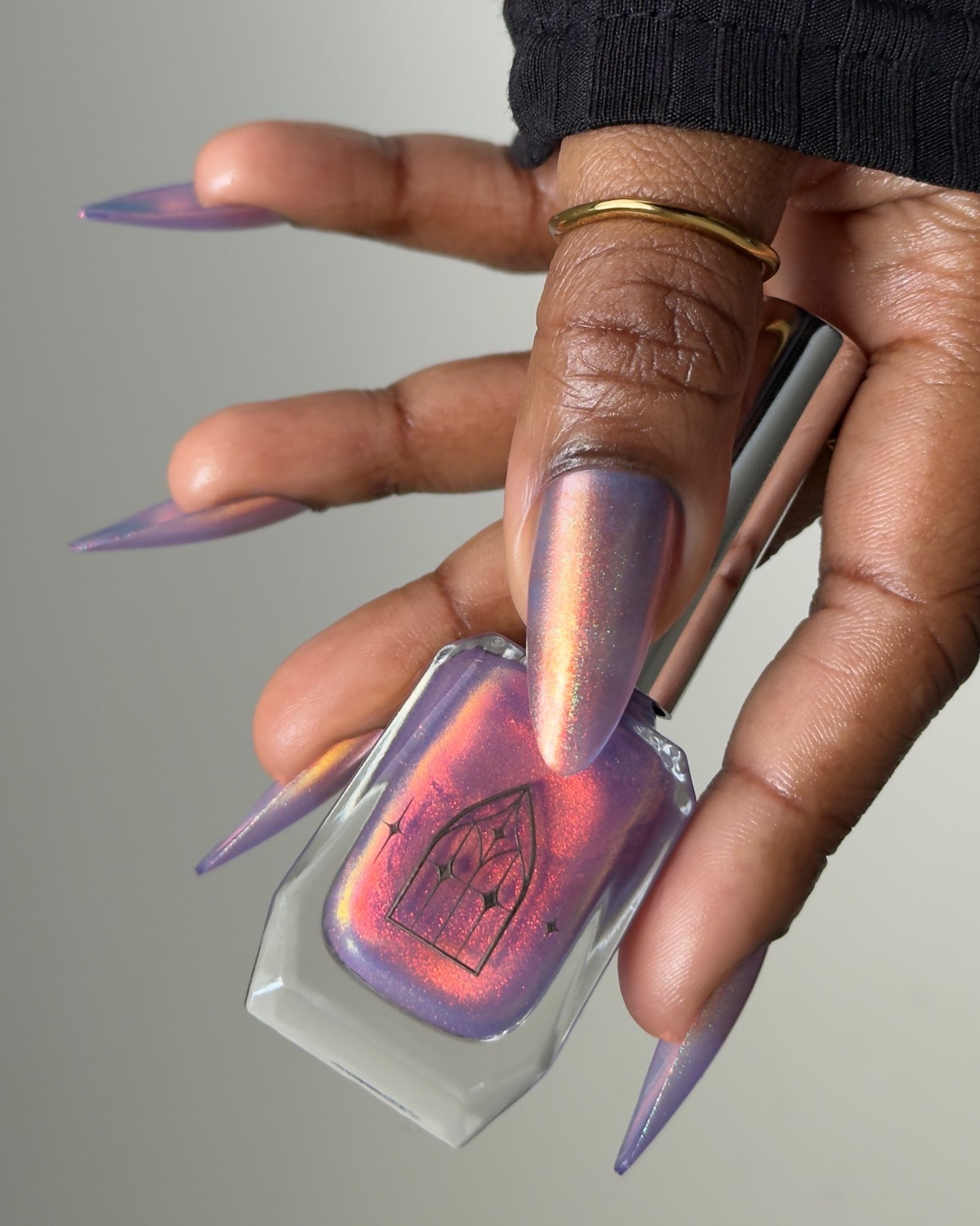can be worn alone in two to three coats for a sheer finish or can add enchantment over any polish in one coat. Some swatches are shown over a black base