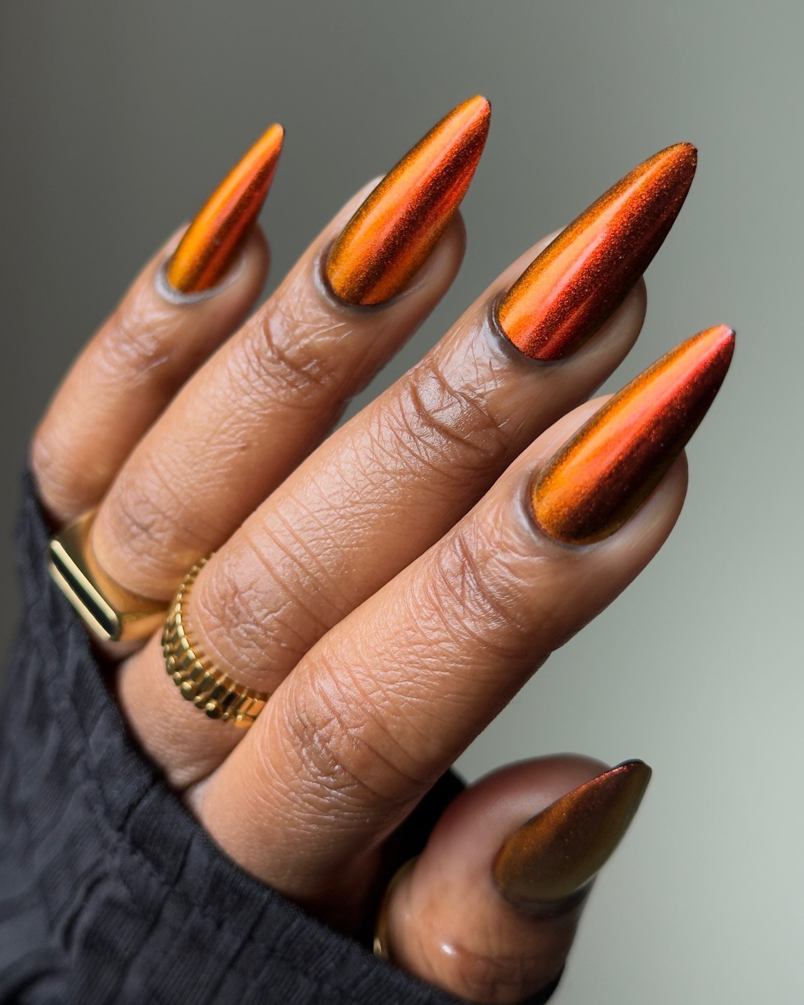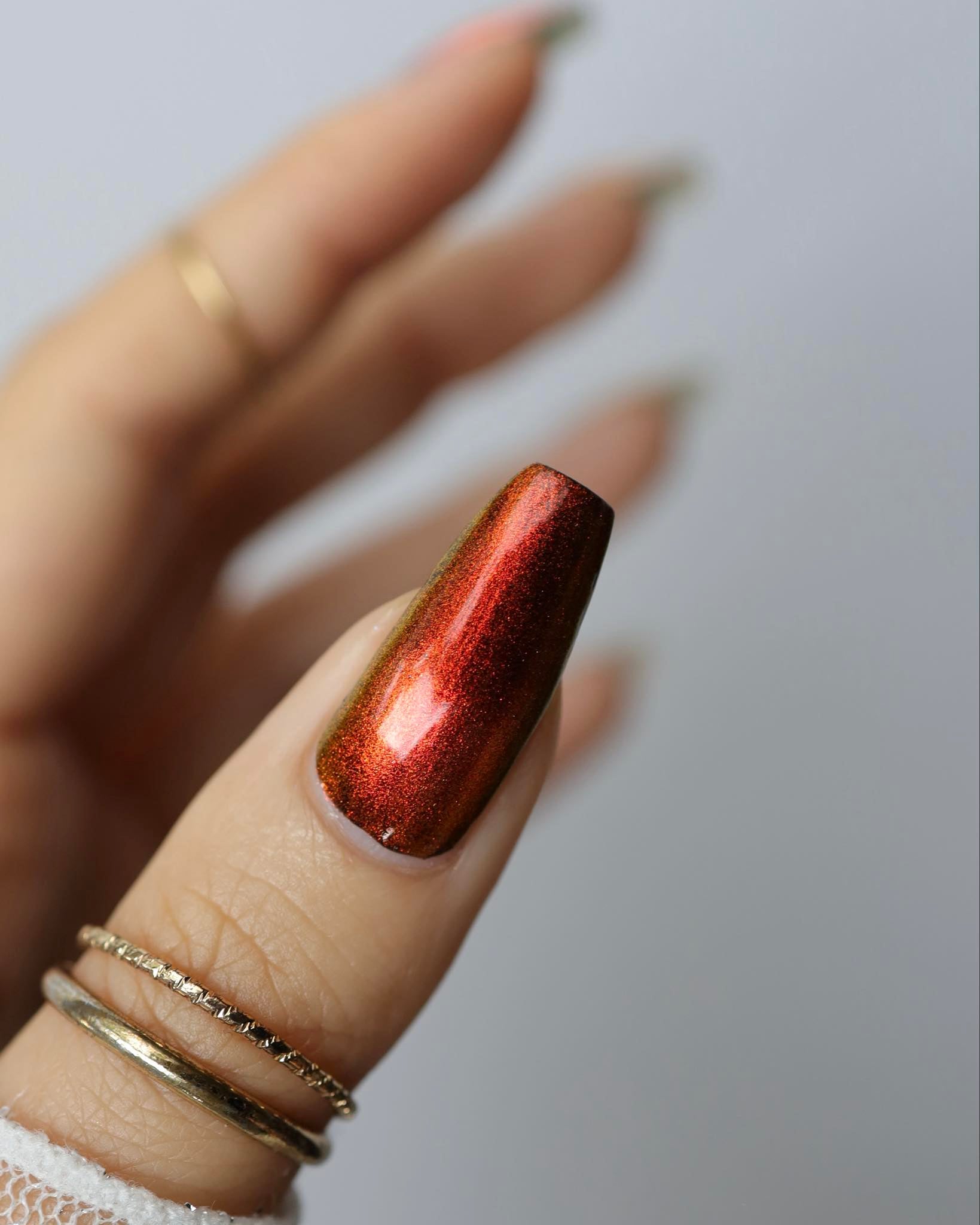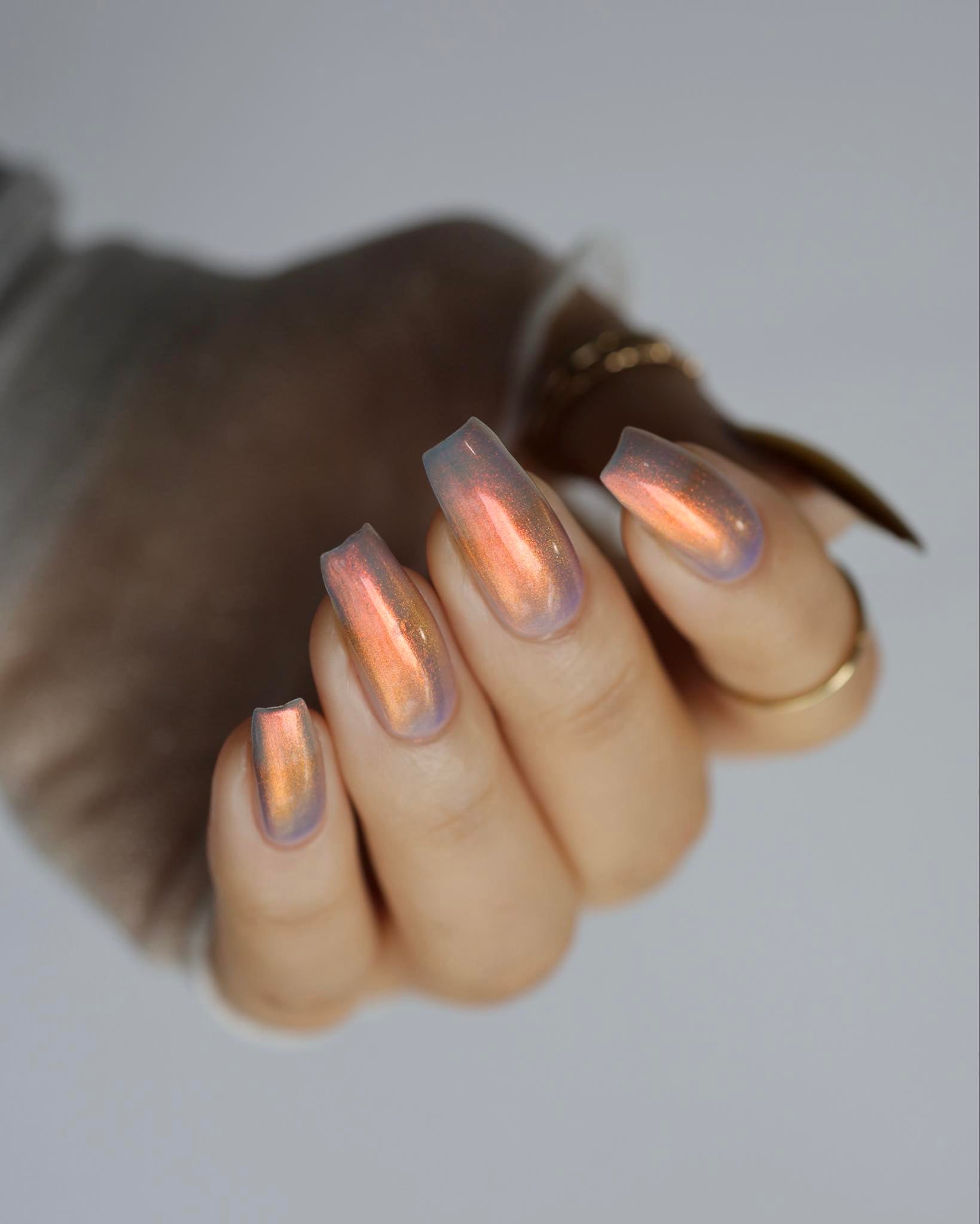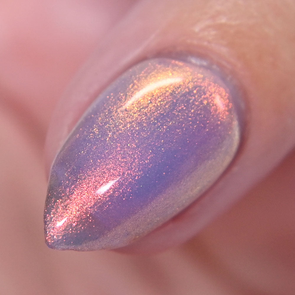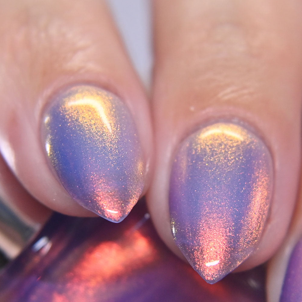 can be worn alone in two to three coats for a sheer finish or can add enchantment over any polish in one coat. Some swatches are shown over a black base