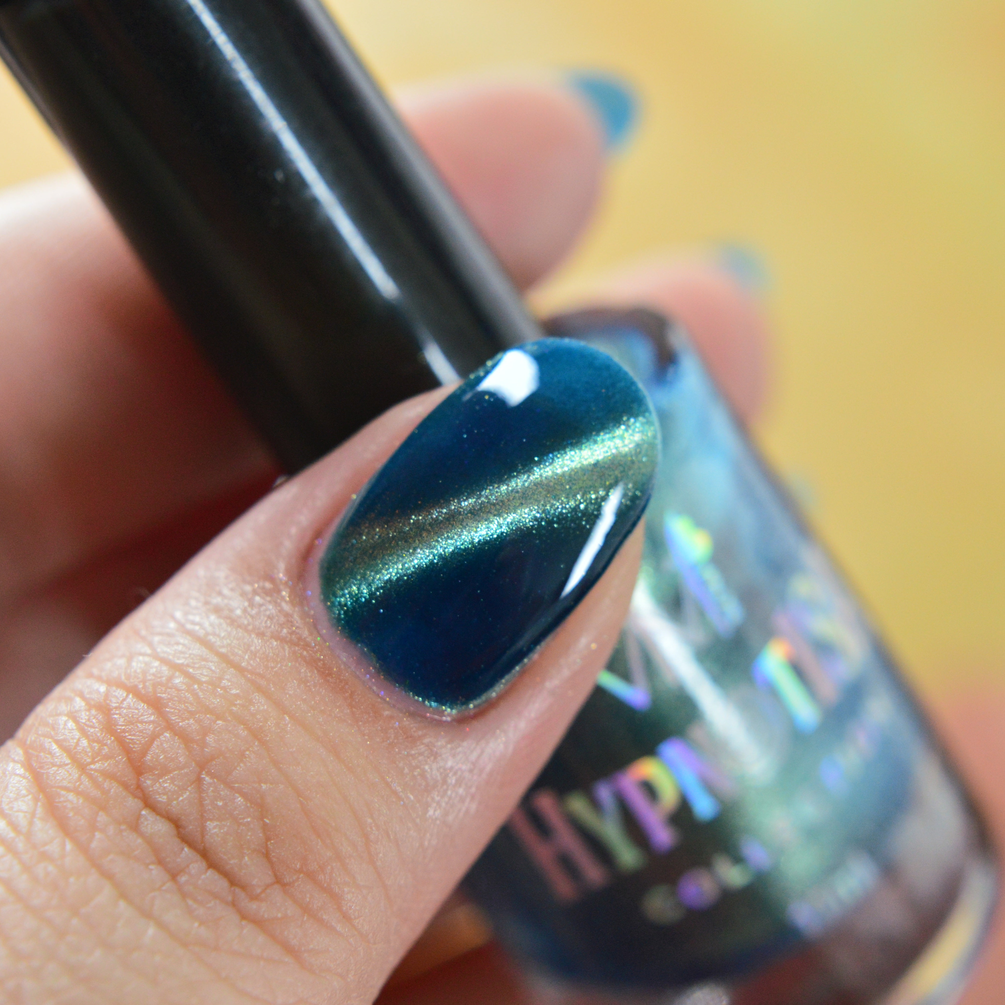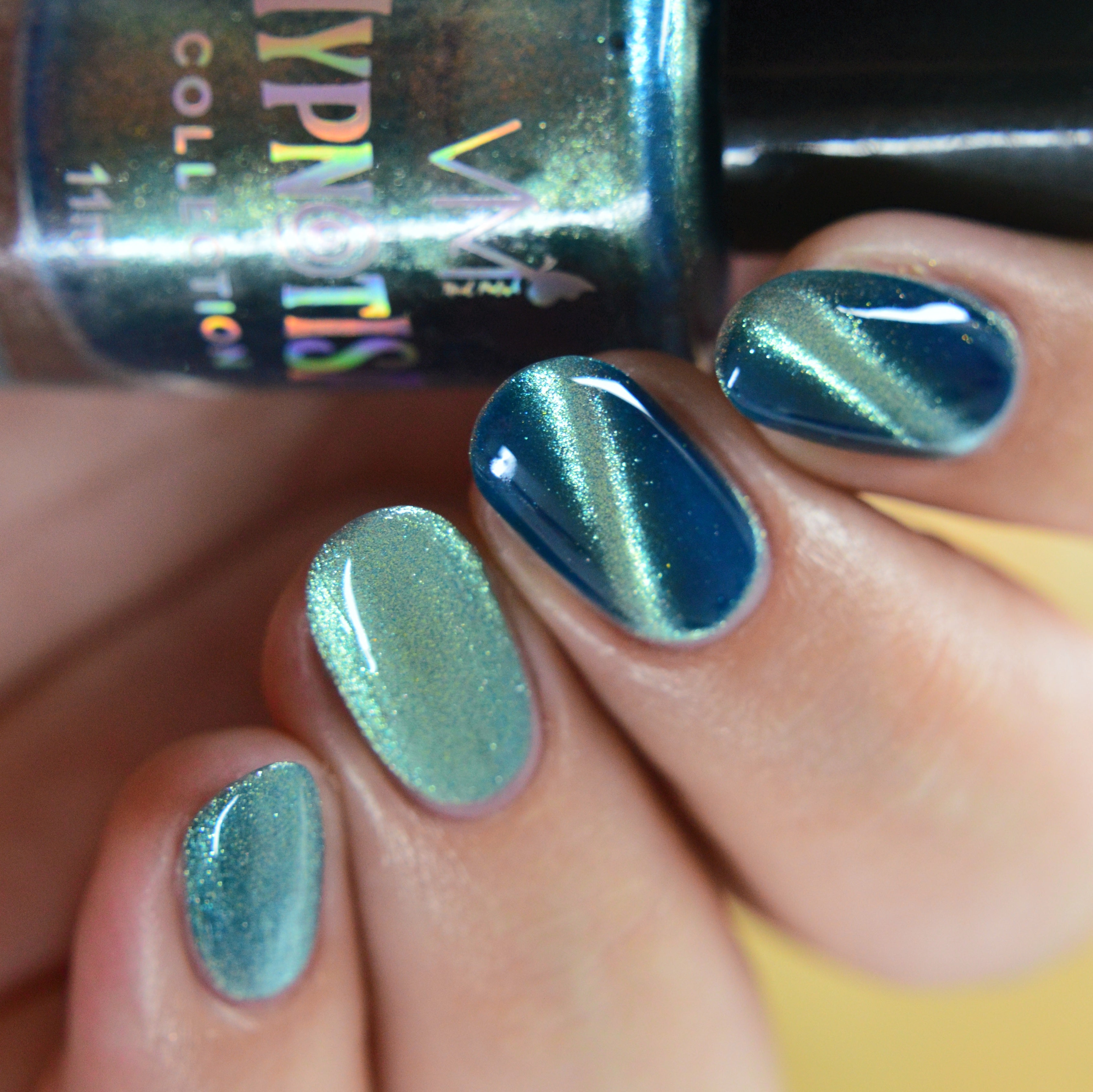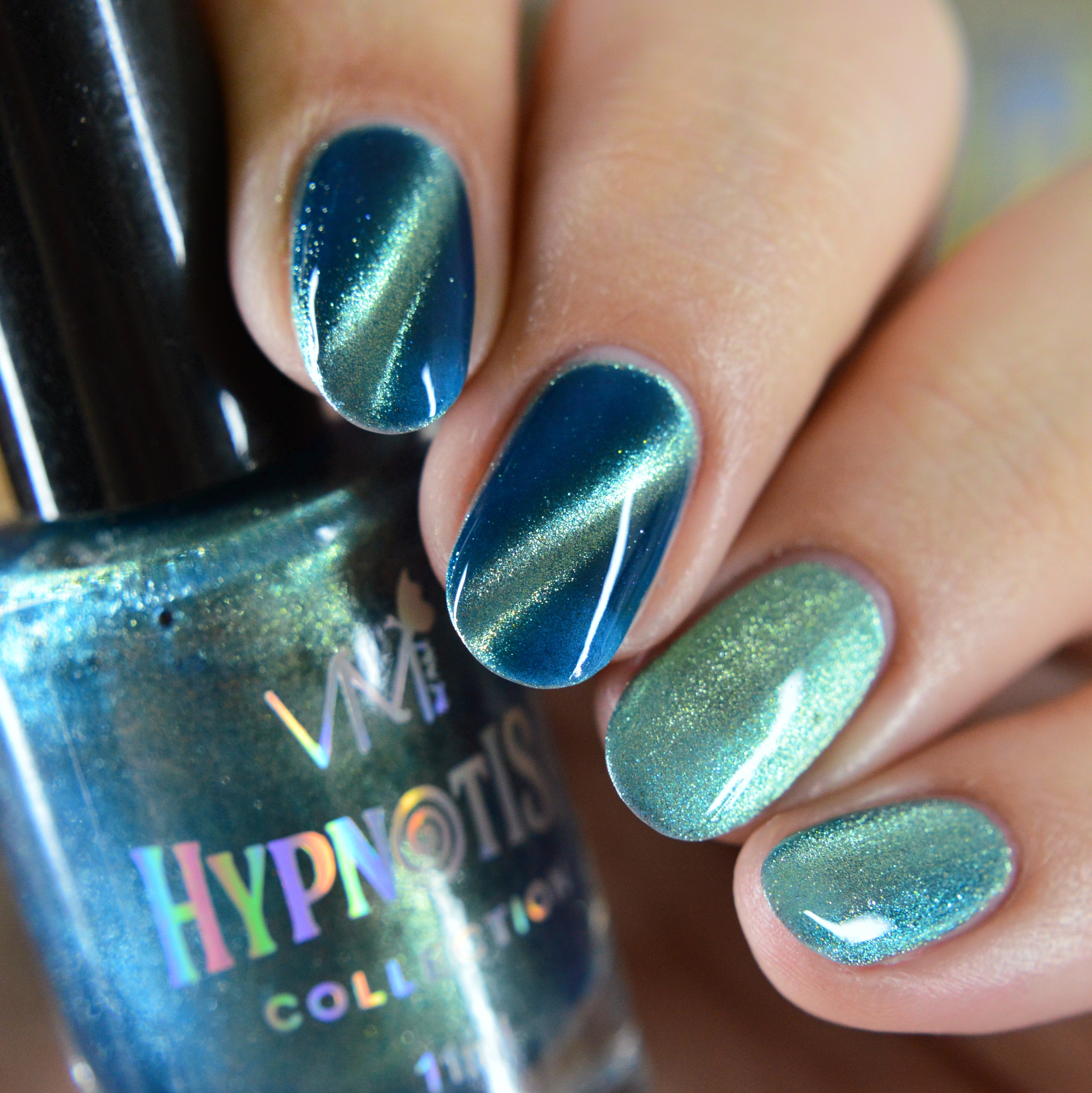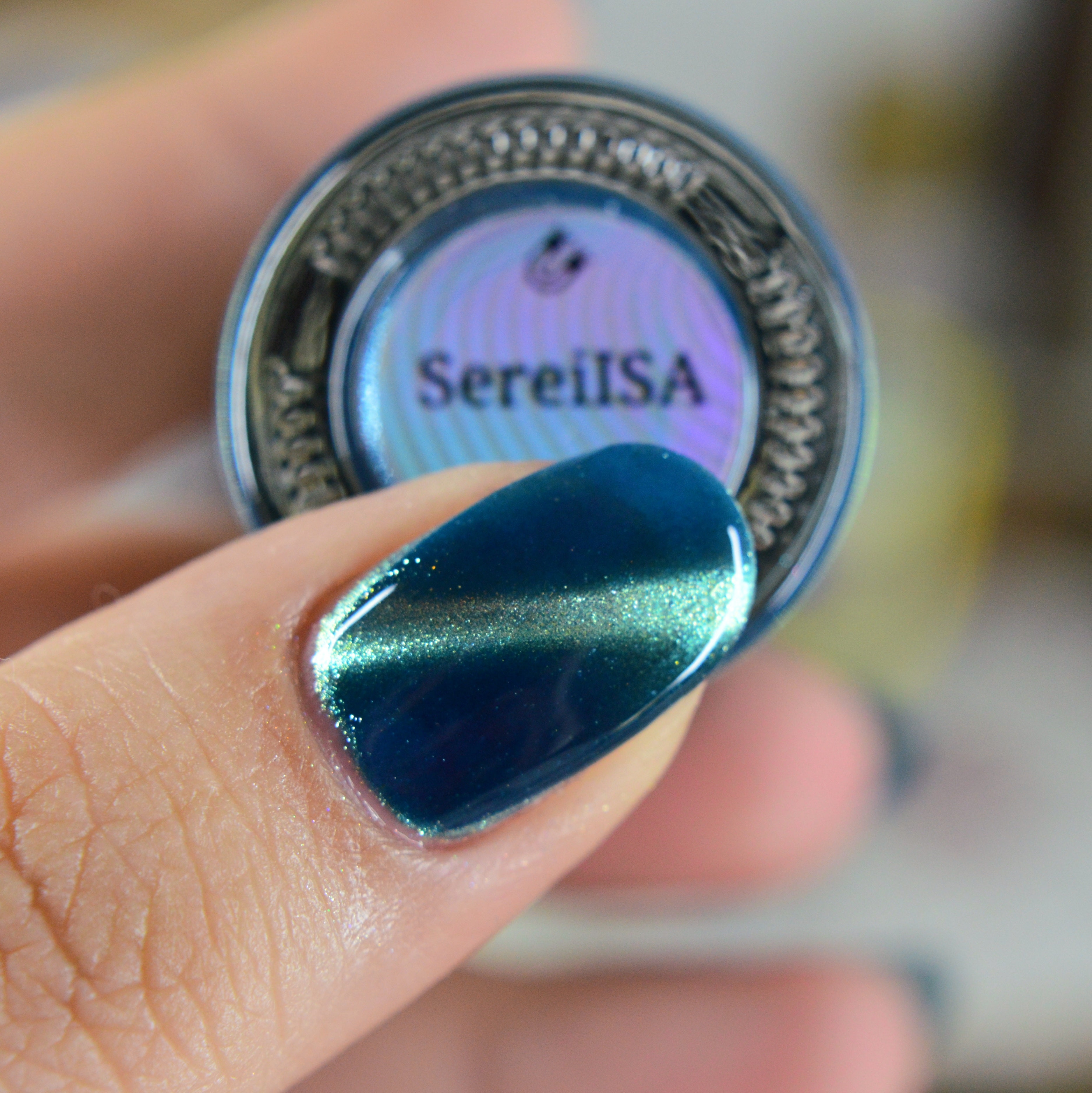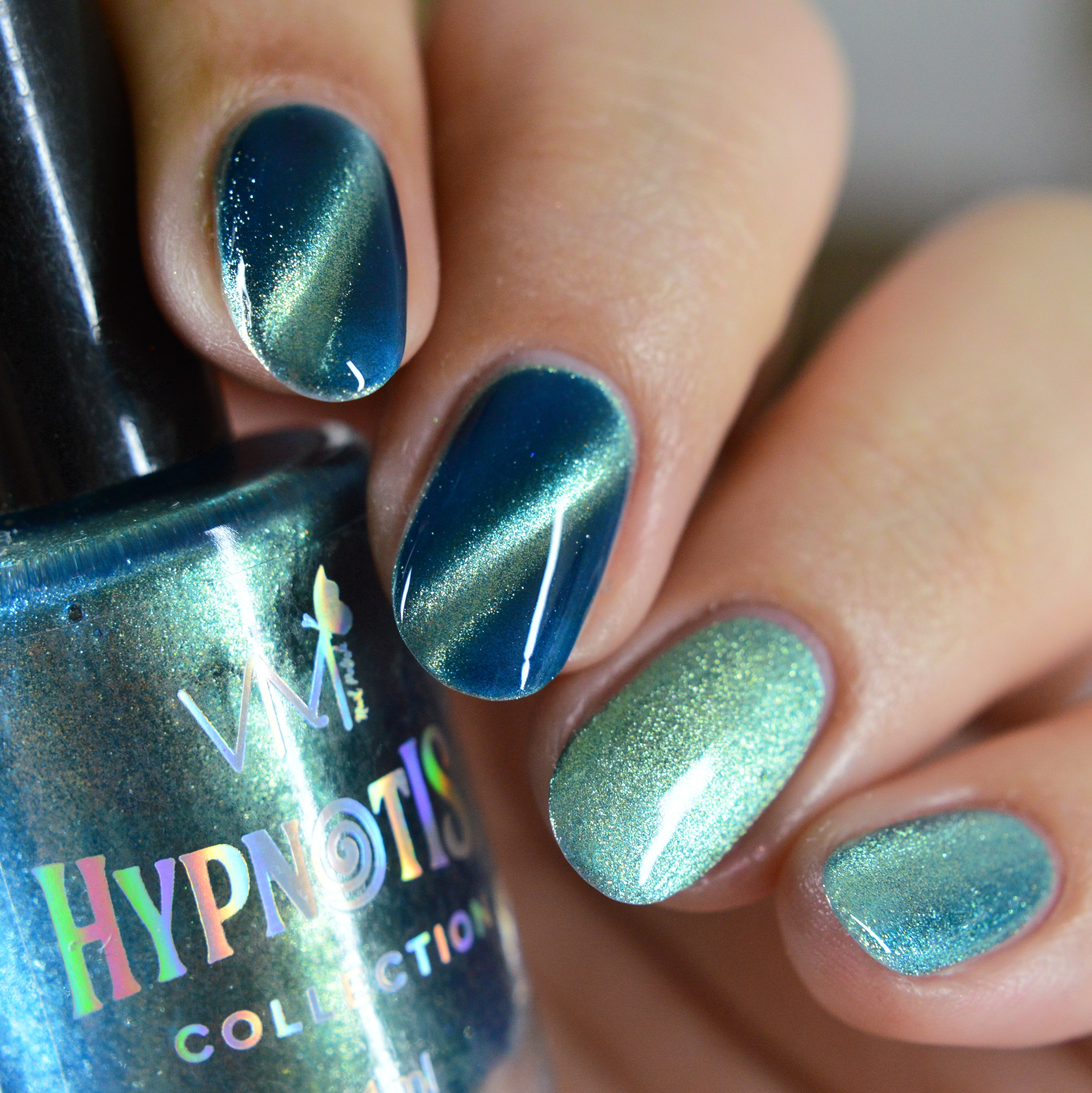 Sereisa: Jelly blue base with champagne magnetic pigment. The mixture visually renders the enamel with turquoise tones.