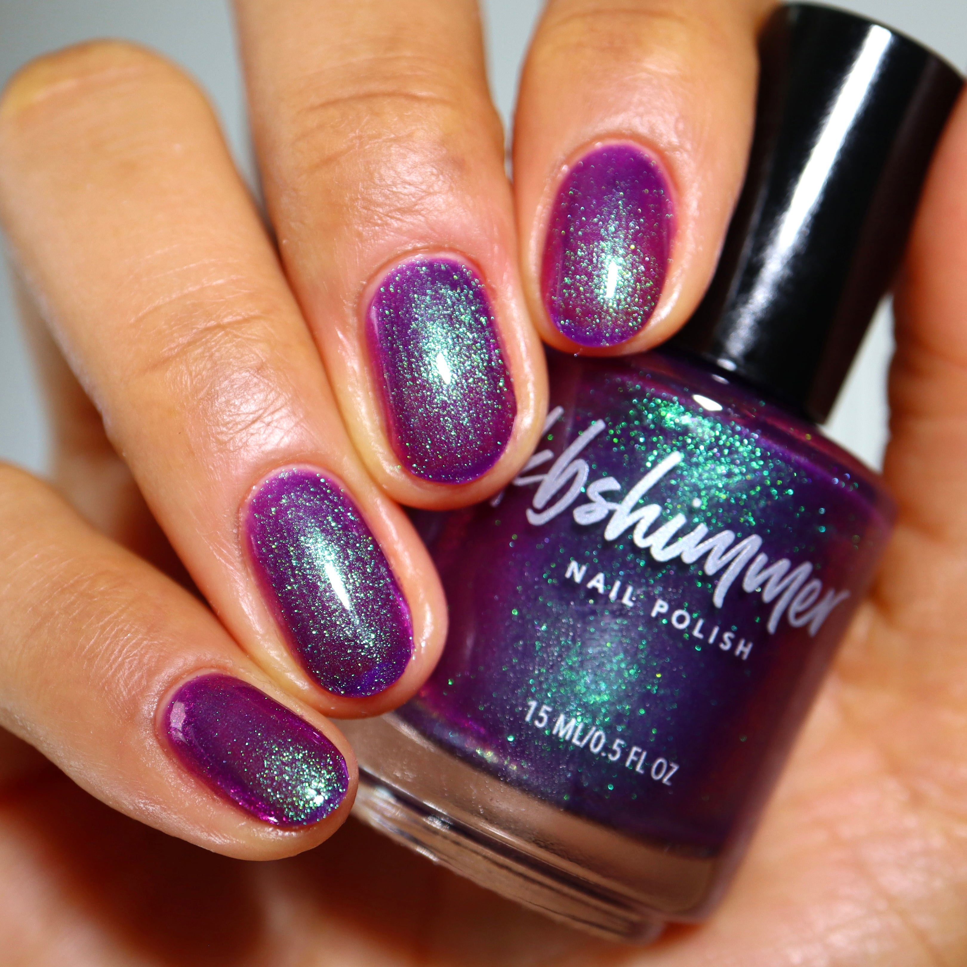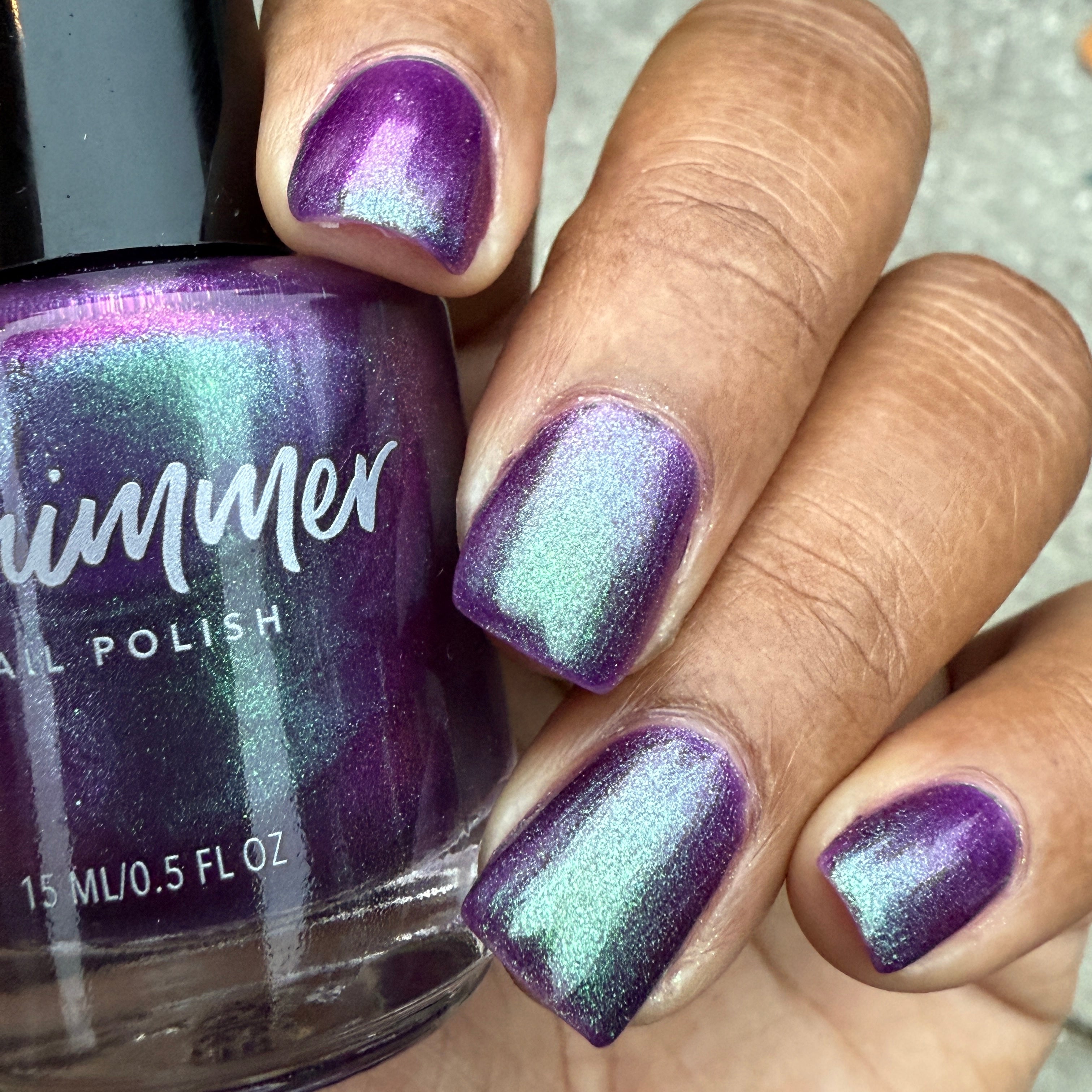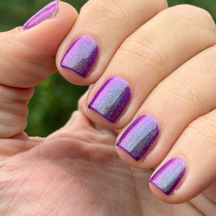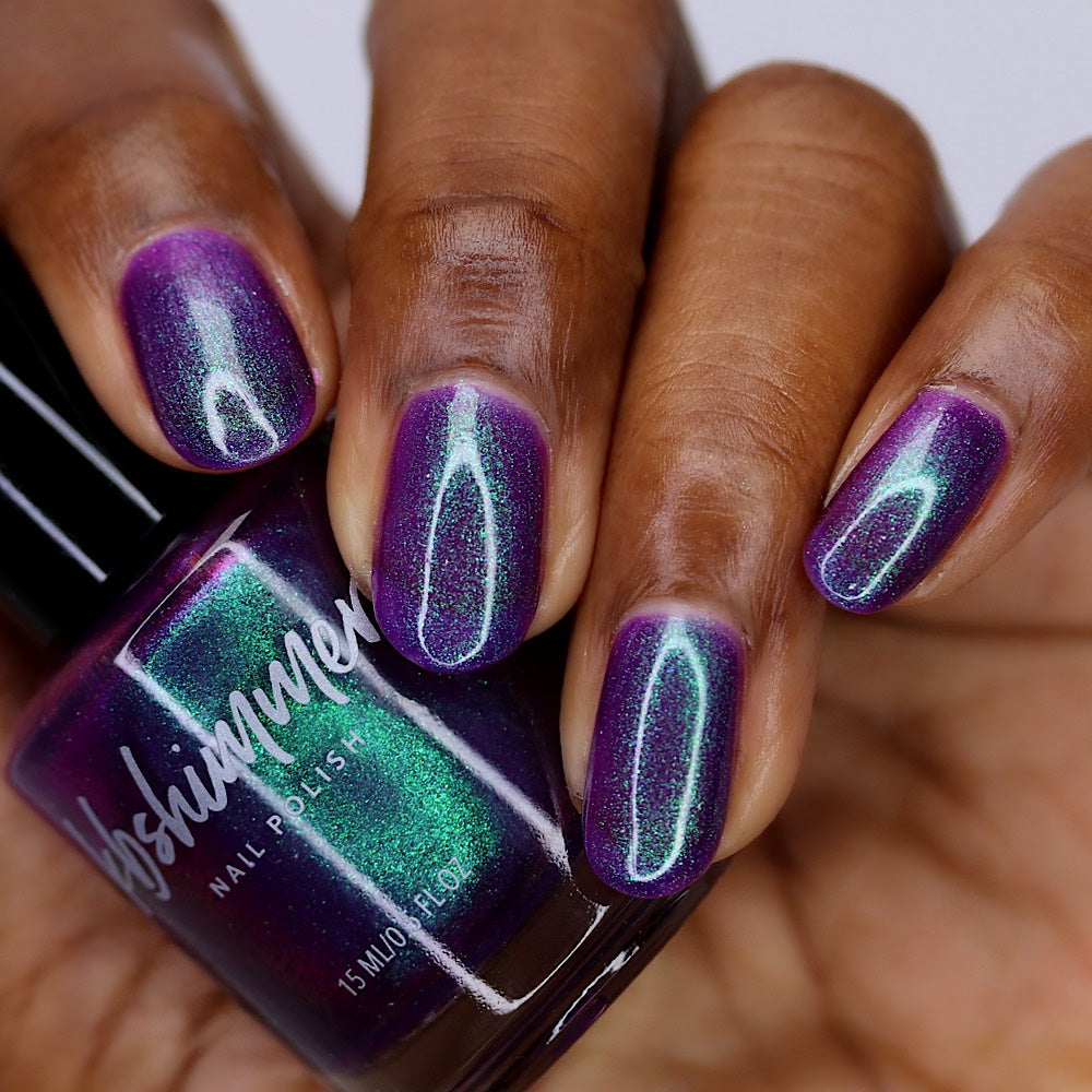 Sticky Situation nail polish is a shimmery nod to the beautiful wrapping paper we love to have but sometimes hate to use. This rich, jewel-toned purple shade leans toward grape, with hints of fuchsia visible at certain angles. A jade-green to dusty-teal shimmer fades into the purple base, creating a striking finish. Apply 2–3 coats, followed by Clearly On Top, for the best results.