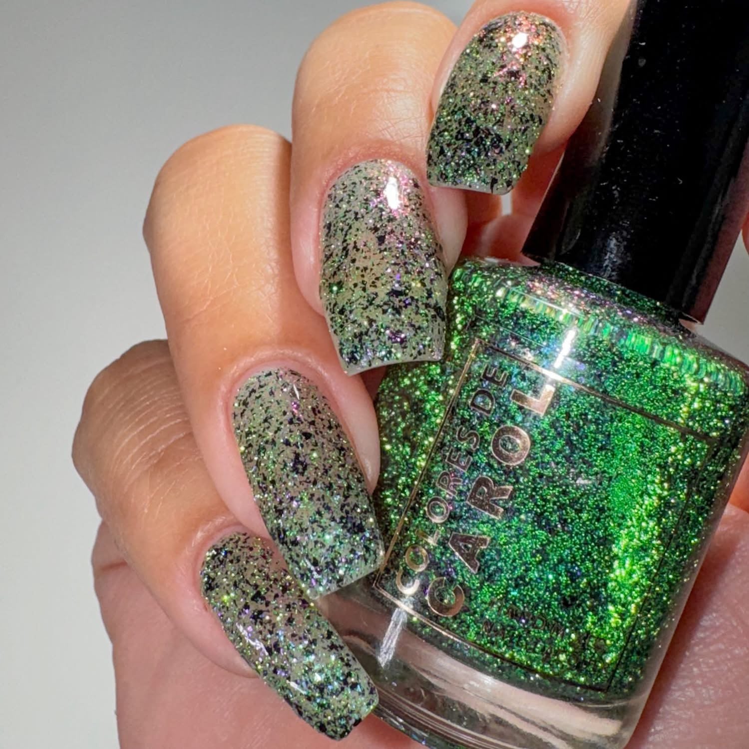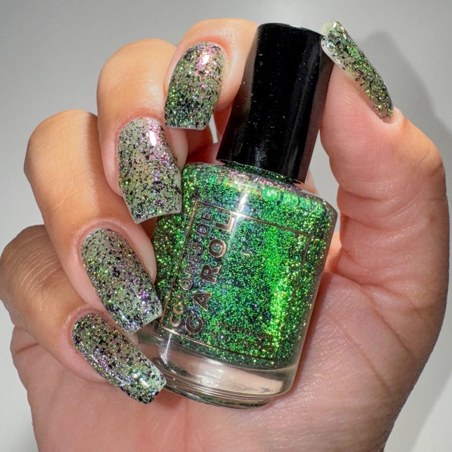 TOXIC TONIC, a full coverage color shifting reflective glitter (green/purple/pink/orange) and black micro flakes.