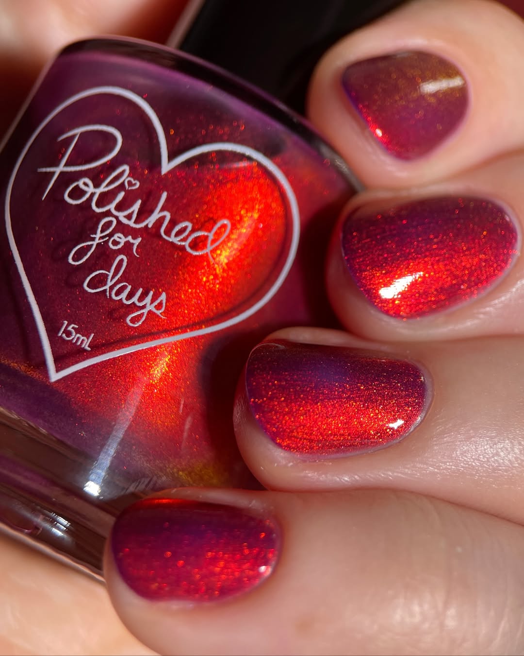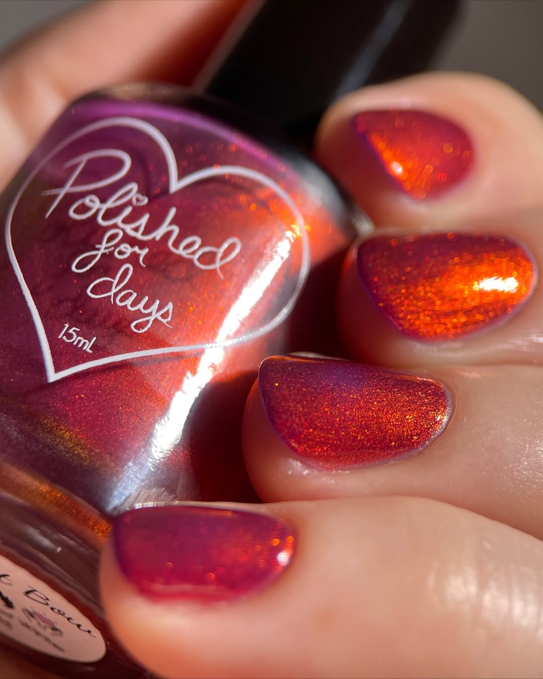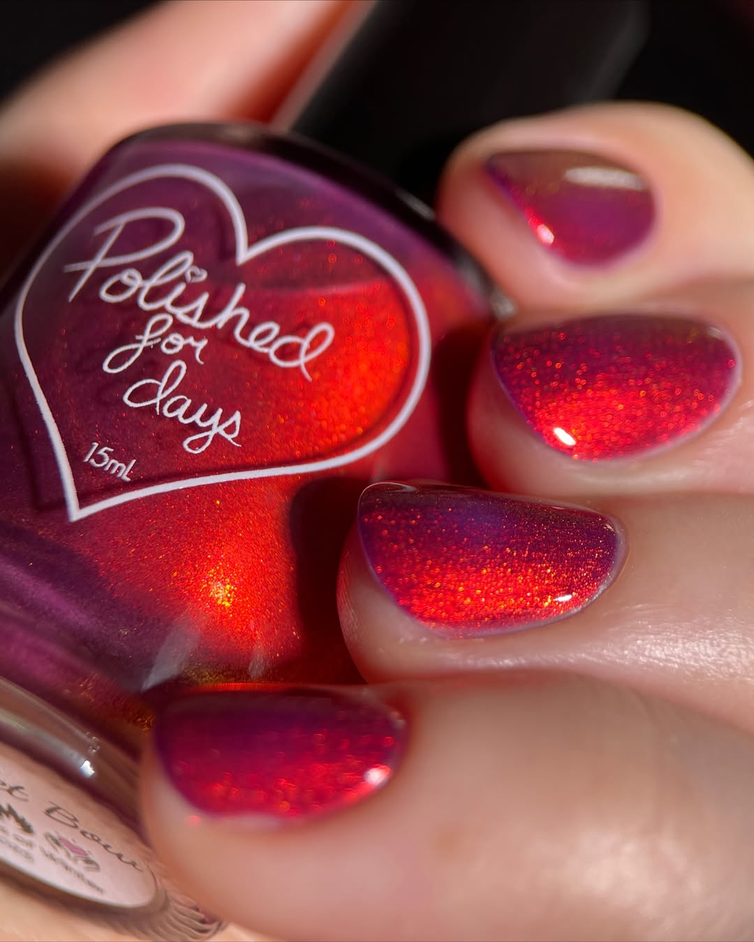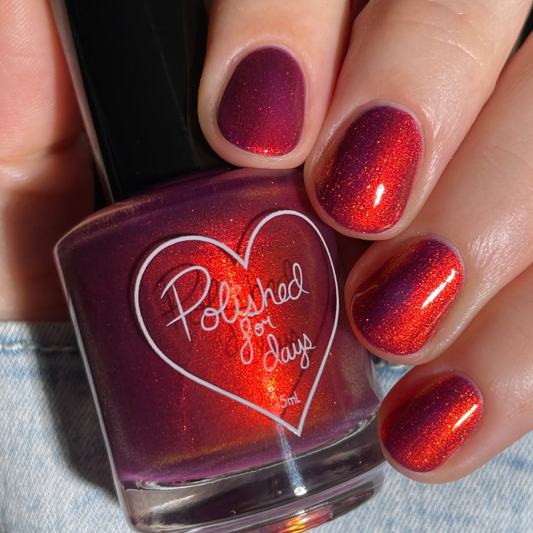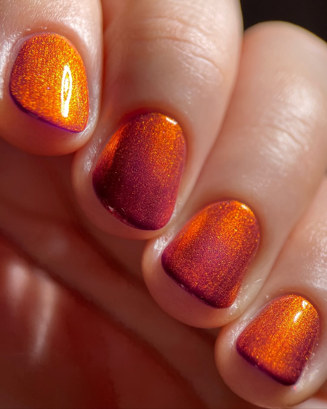 Velvet Bow - a warm toned deep purple base with orange-yellow shifting iridescent shimmer. (Sibling to Eternal Glow)