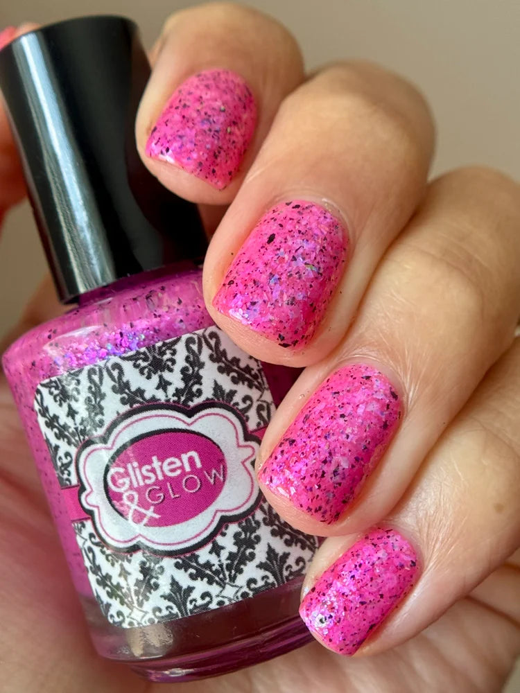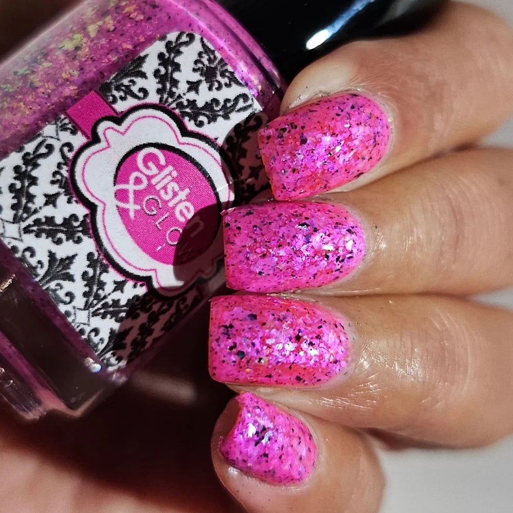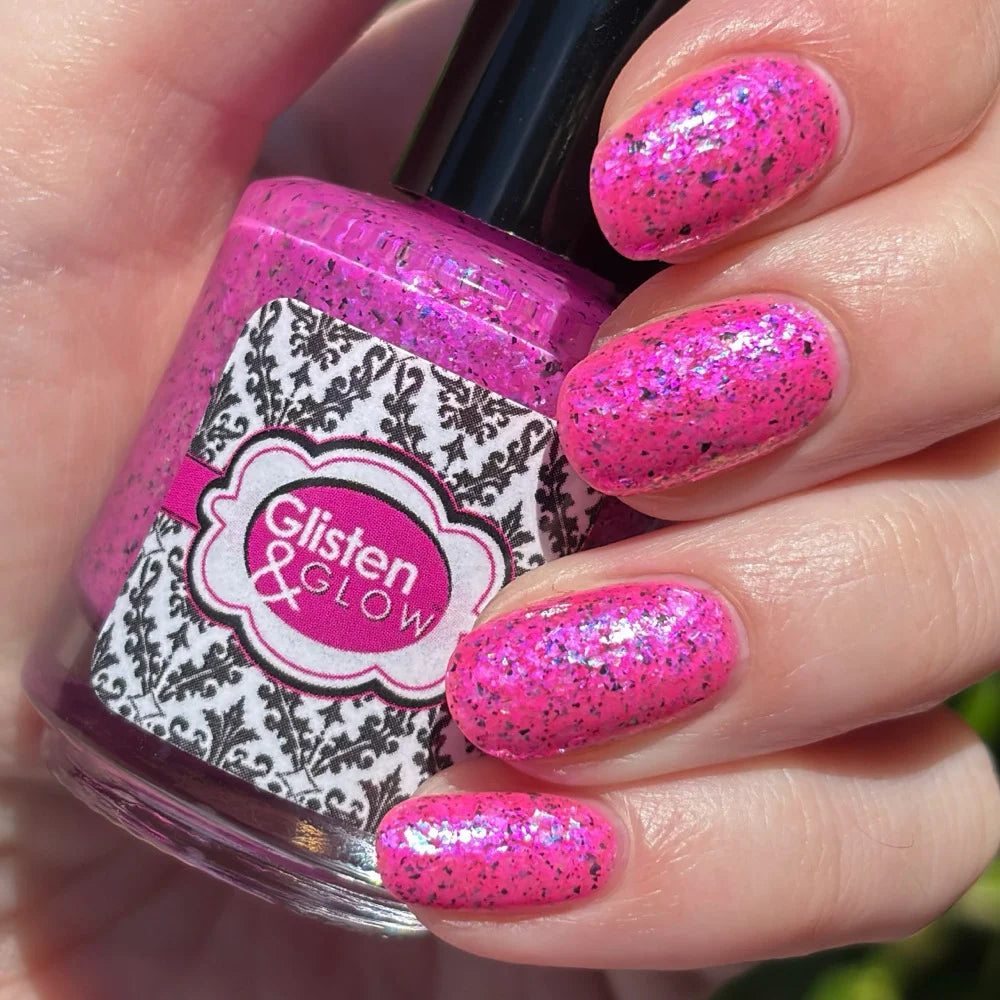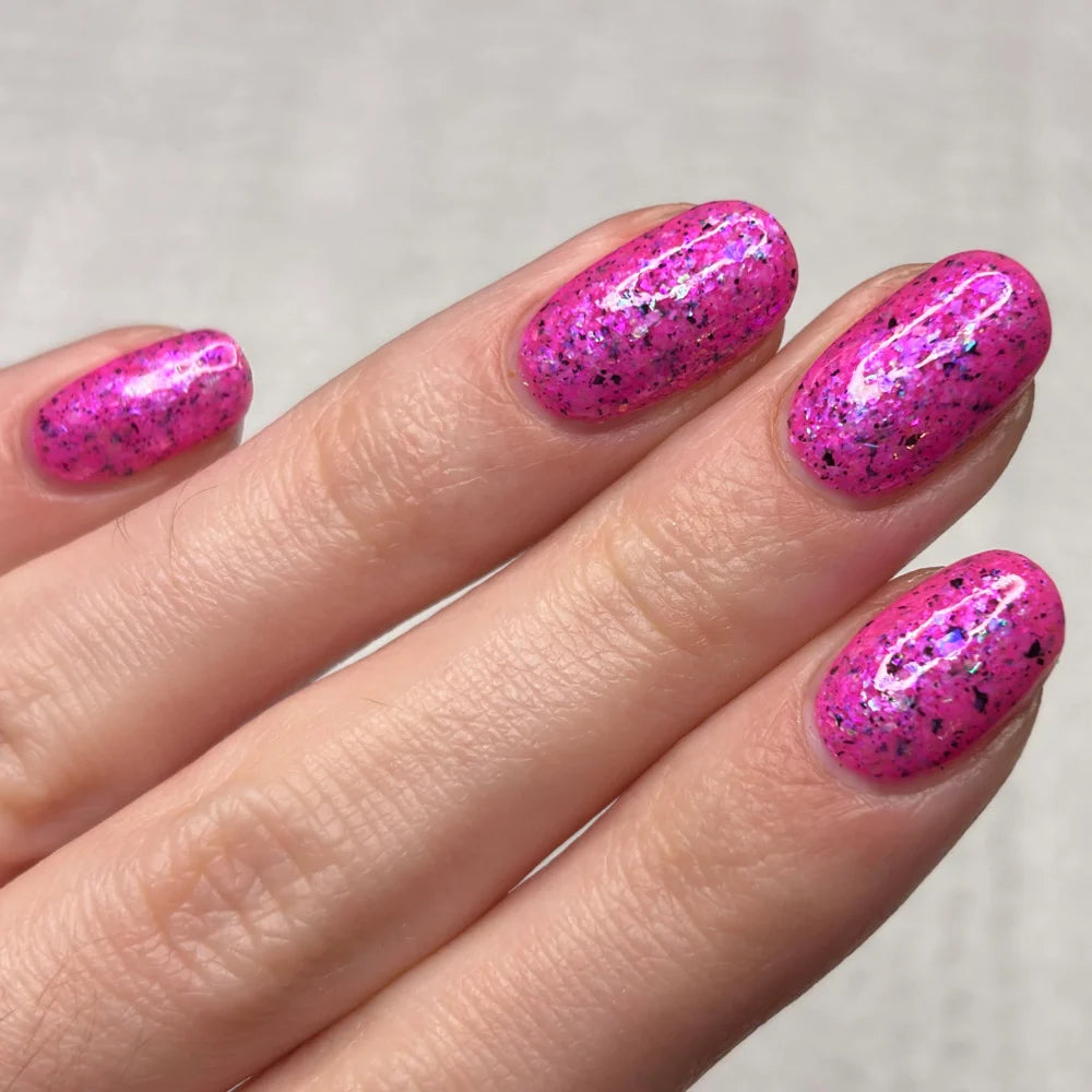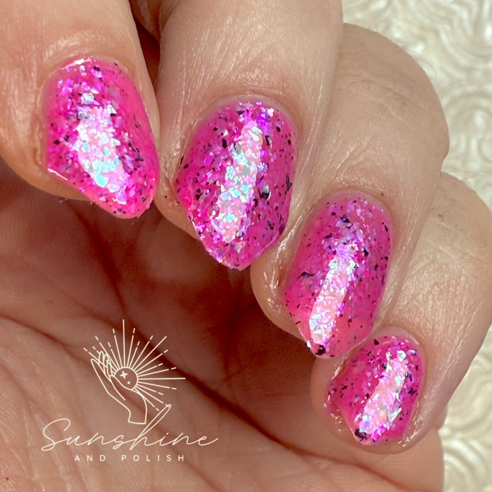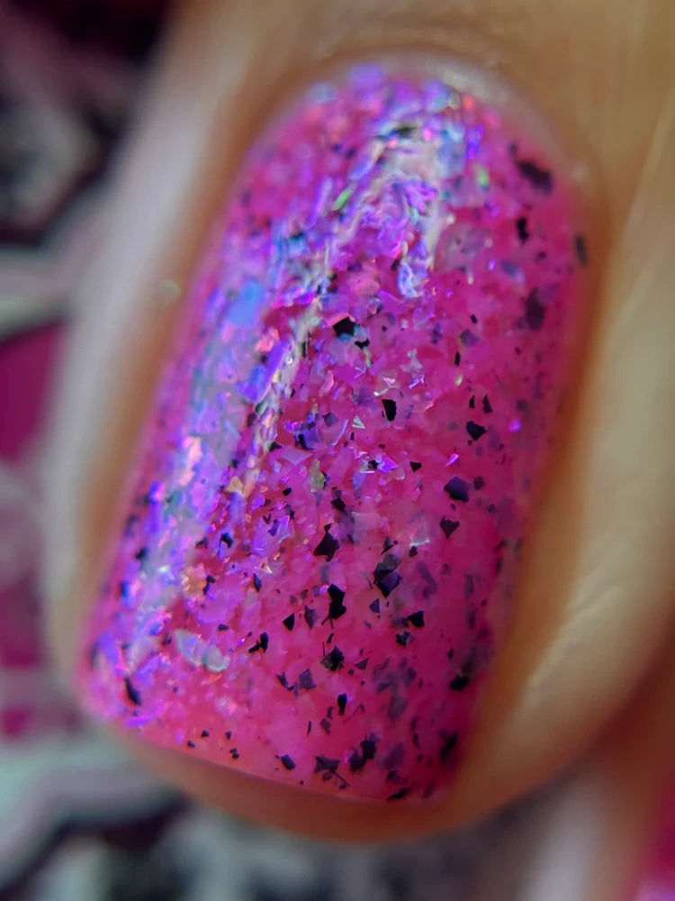 We Don’t Work, We Wife – bright pink jellie polish with 2 different types of color shifting iridescent flakes that shift pink/purple/orange and blue/green/yellow with black microflakes