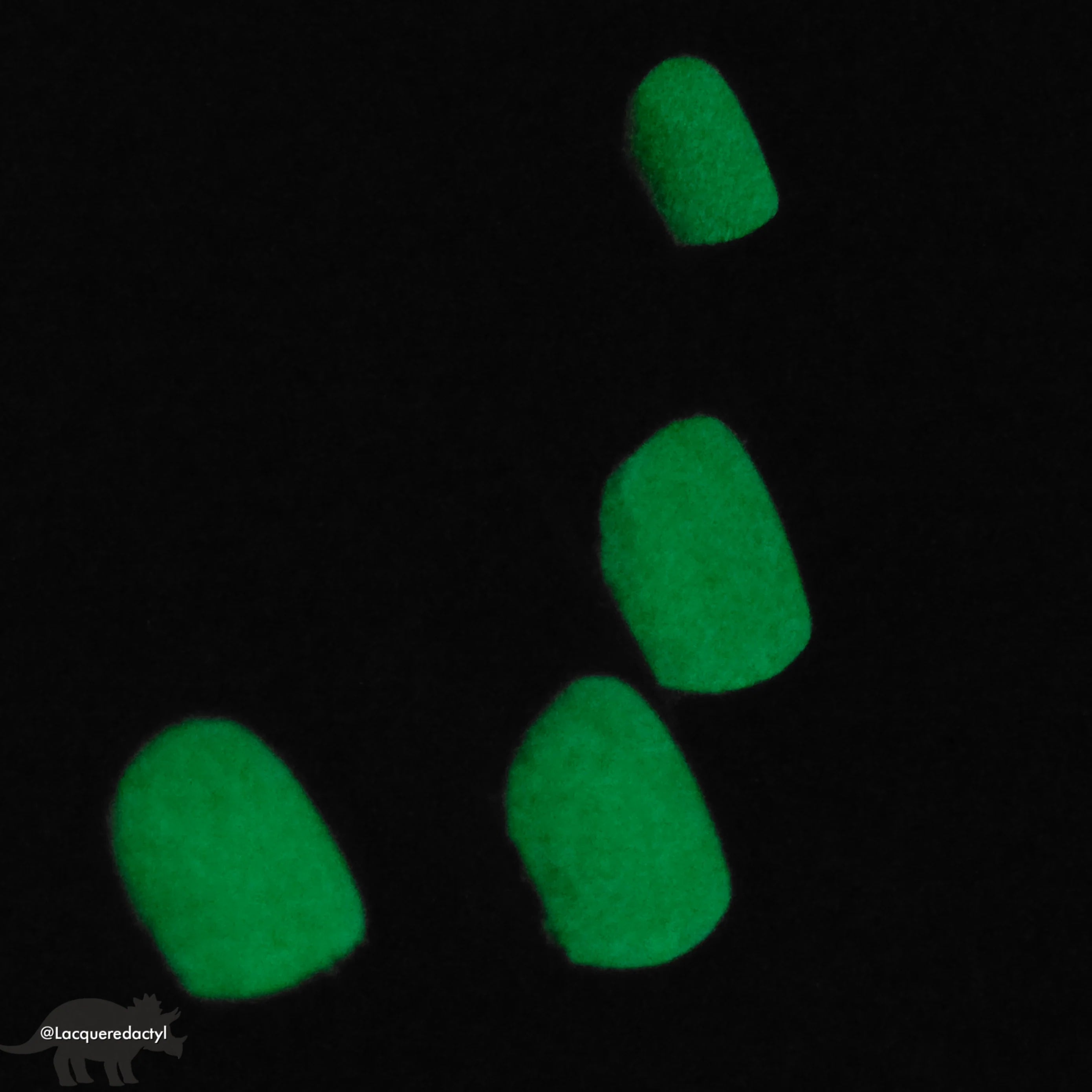 This shifty shimmer and glow in the dark polish was created as a custom polish for the Prugly Polish Pals Facebook group. This polish has a forest green base with orange and gold shifting shimmer. This one has an added effect and glows in the dark. Charging this polish under UV light or sunlight will increase it's effect.