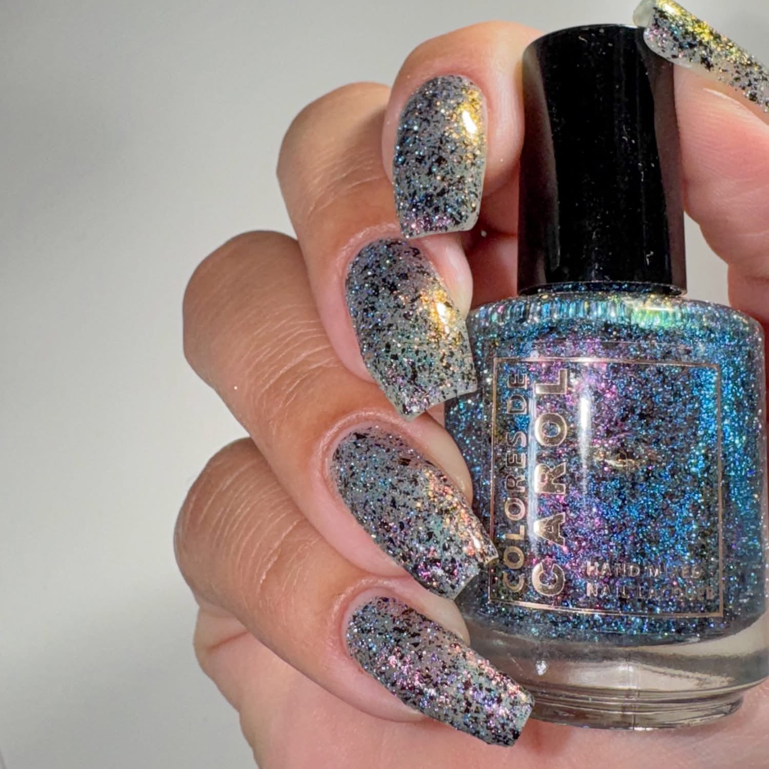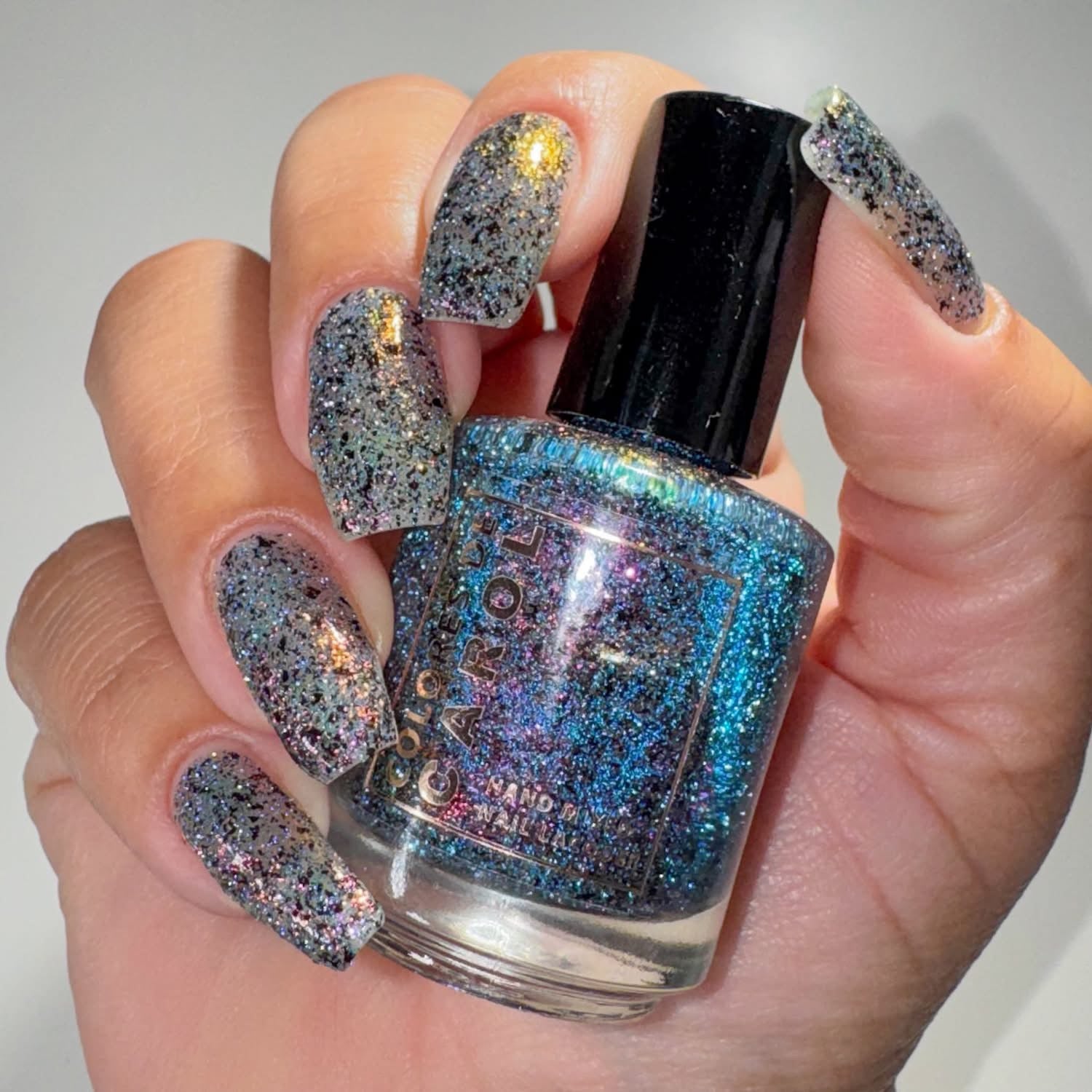 WITCH’S WINE, a full coverage color shifting reflective glitter (blue/pink/green) and black micro flakes.