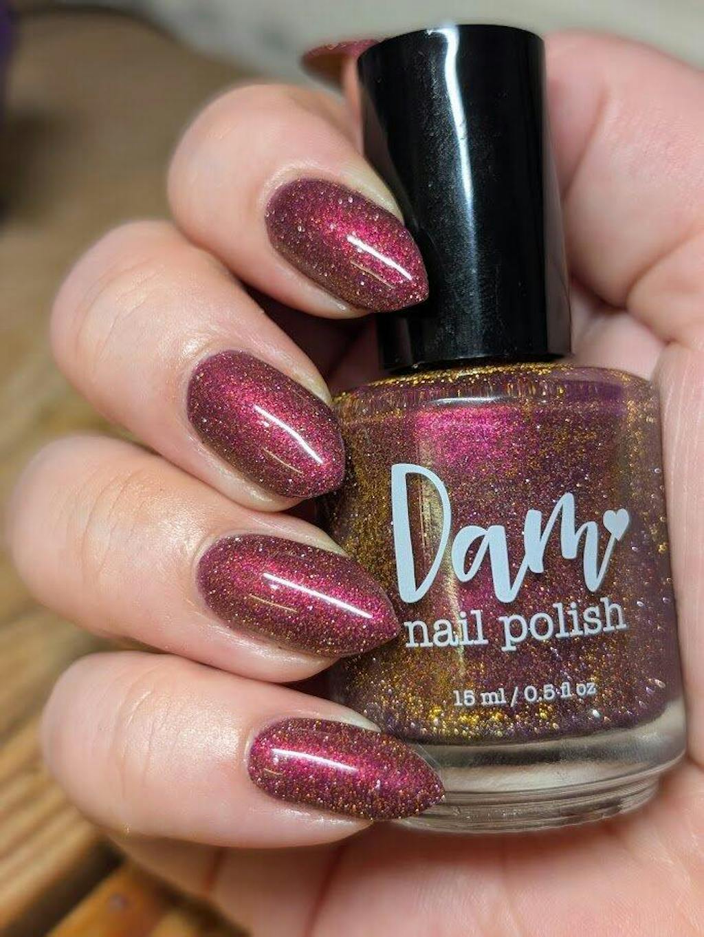 Raisin base with pink, gold, and green shifting shimmer and gold reflective glitters.