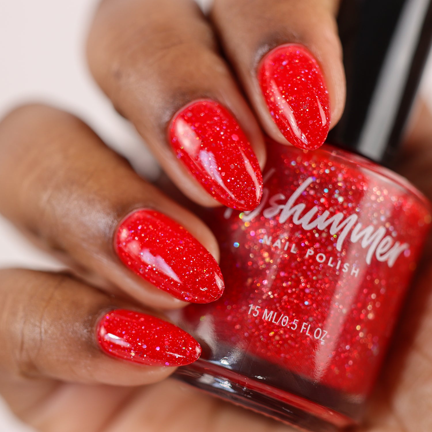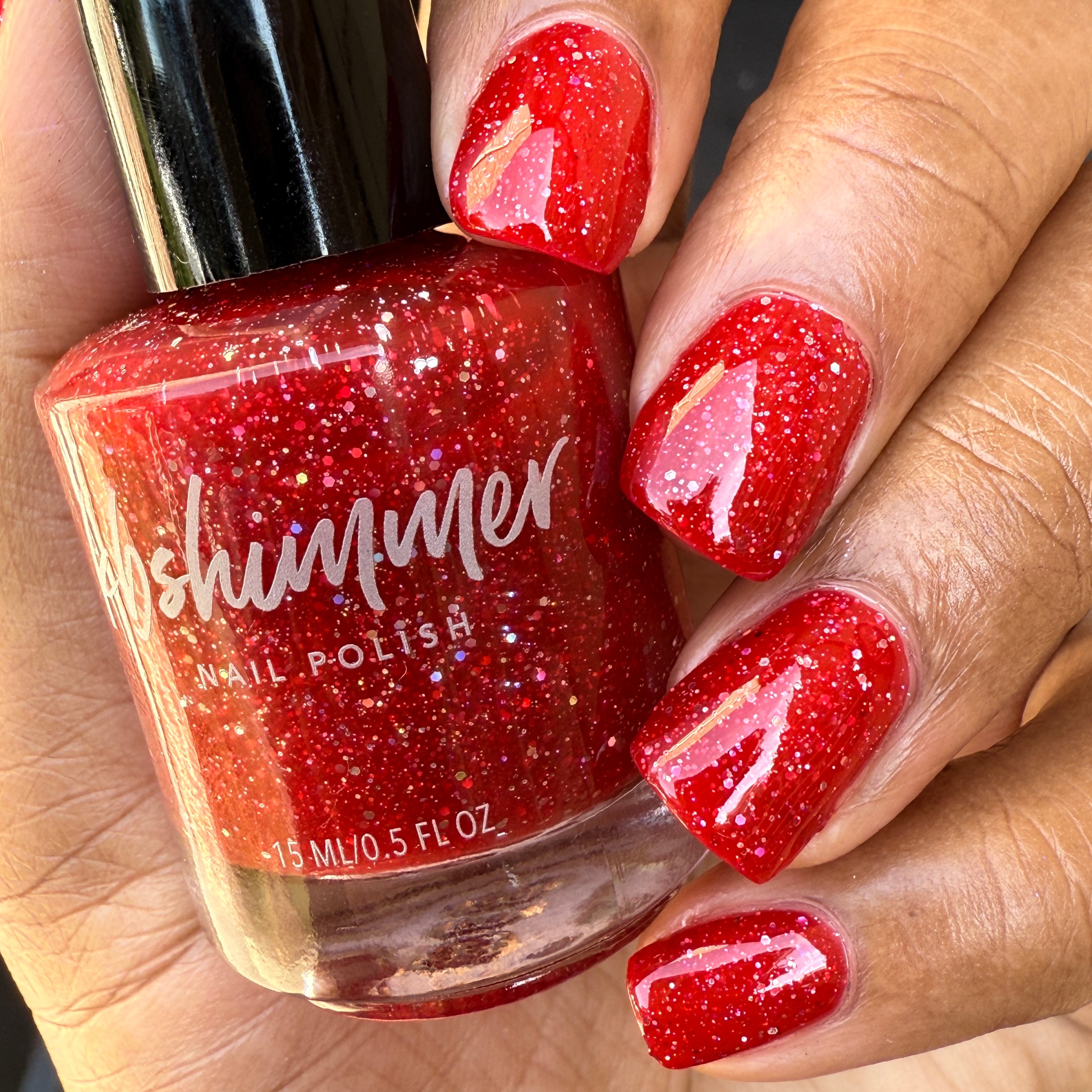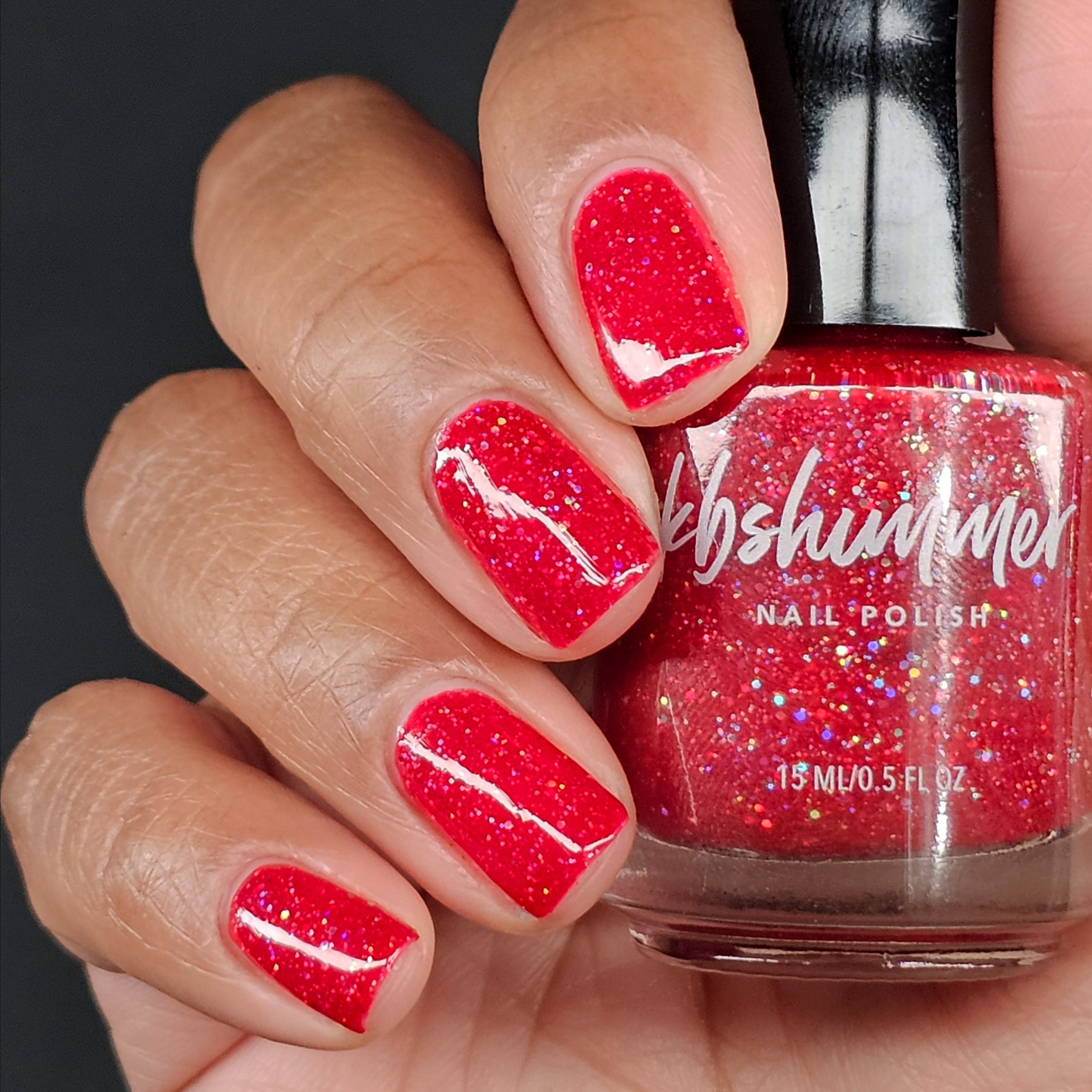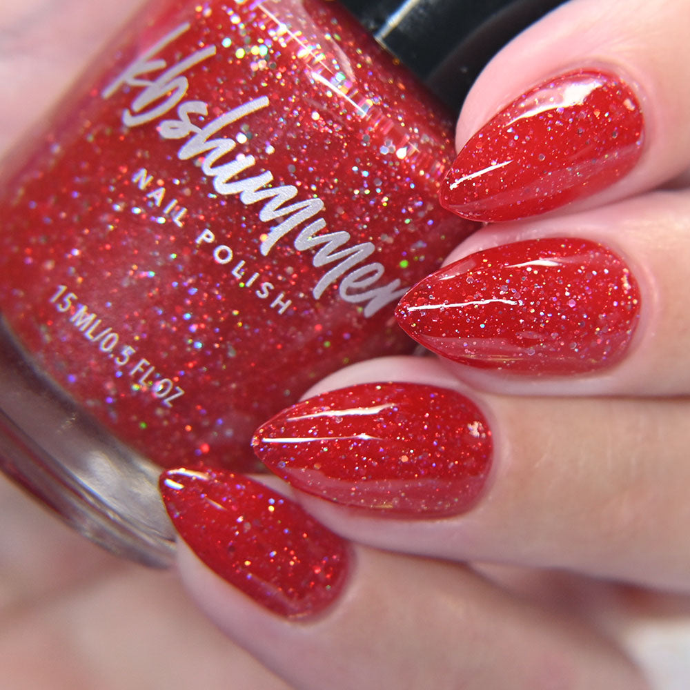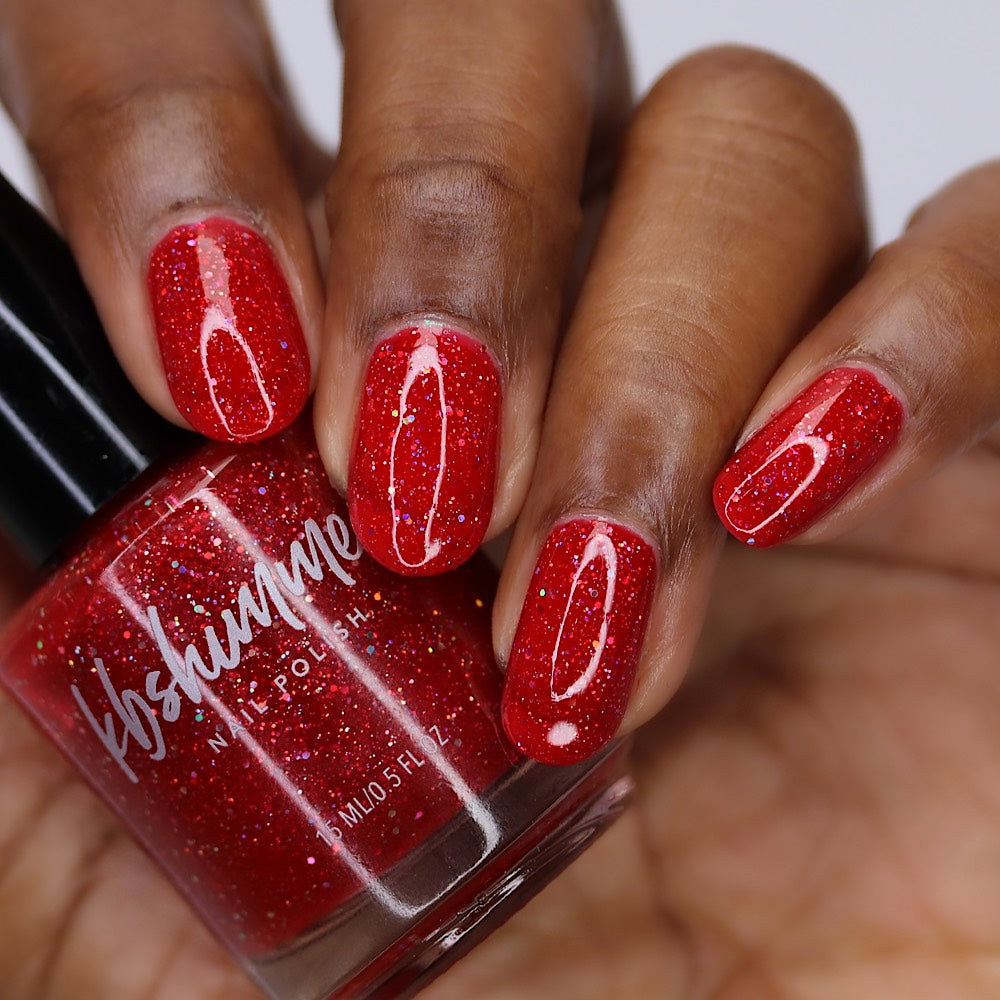 Cherry Fulfilling is a bright cherry-red jelly nail polish packed with an array of twinkling holographic glitters. These silvery hex holographic bits range from micro to small in size, catching the light like facets on jewels. Two coats plus a layer of Smooth Moves and Clearly On Top give a perfect finish, though those with longer nails may prefer a third coat.