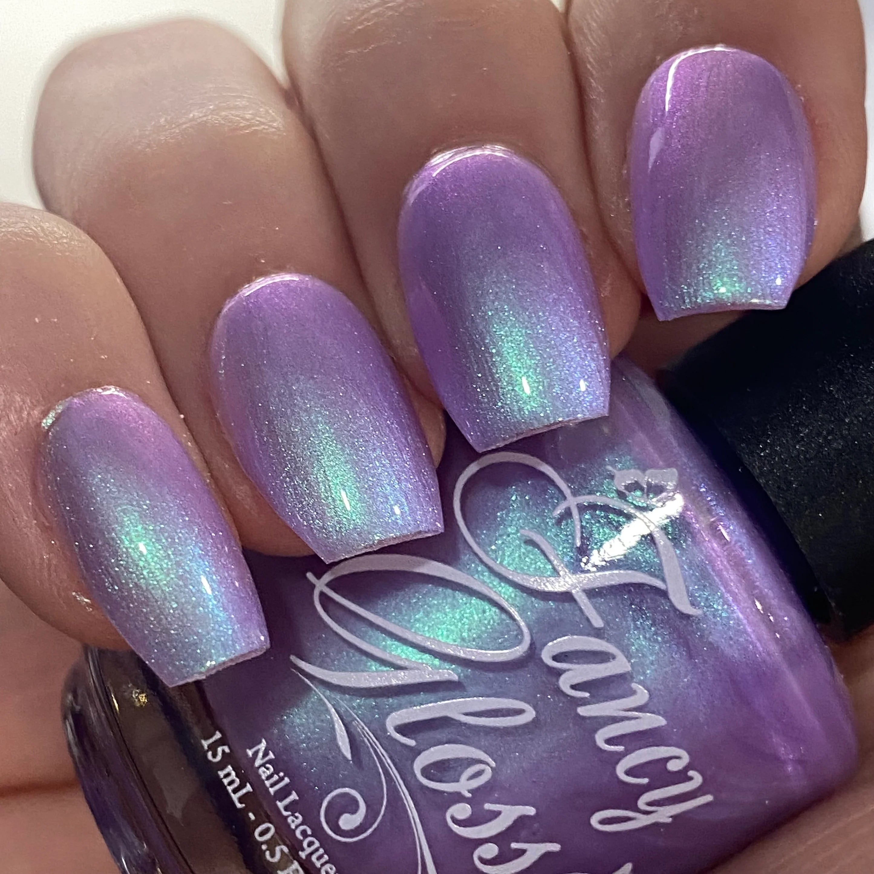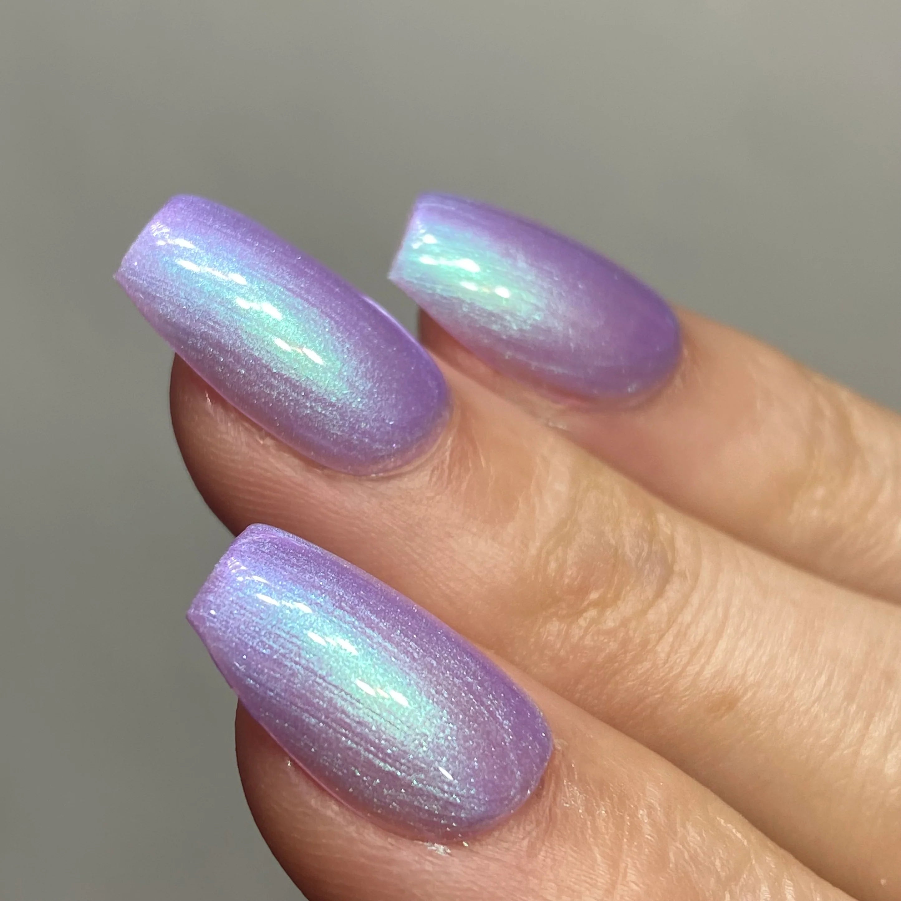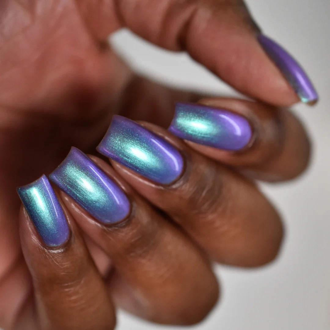 Light purple base with a strong turquoise/purple shimmer.