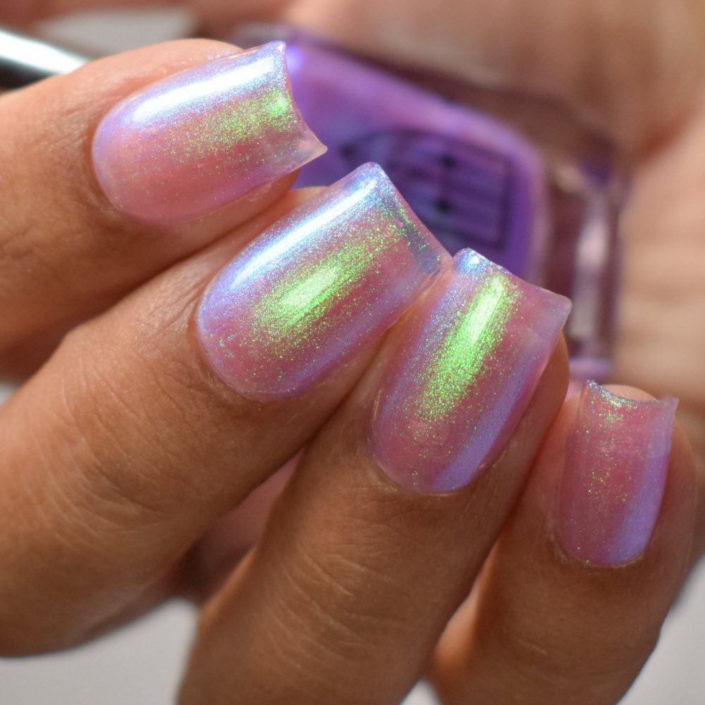 can be worn alone in three thin coats for a sheer finish or can add enchantment over any polish in one coat. Some swatches are shown over a black base