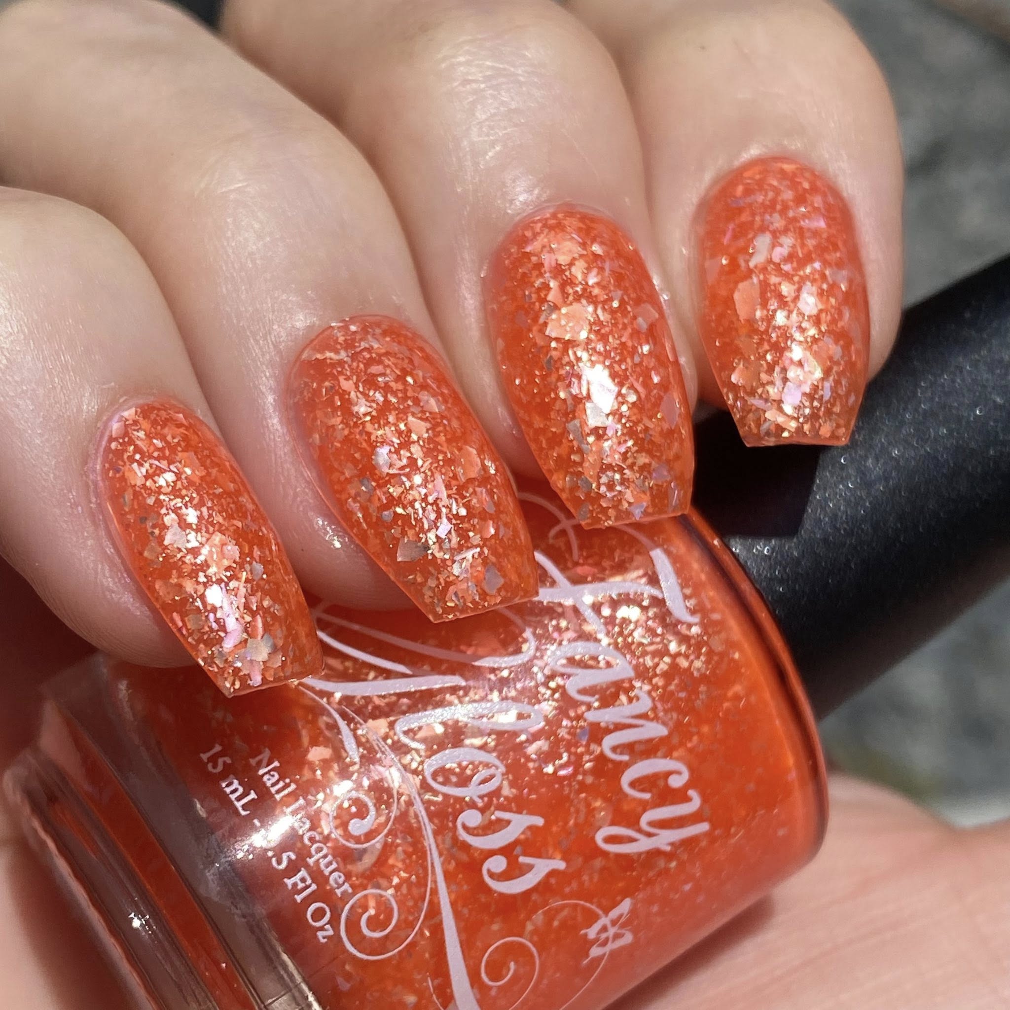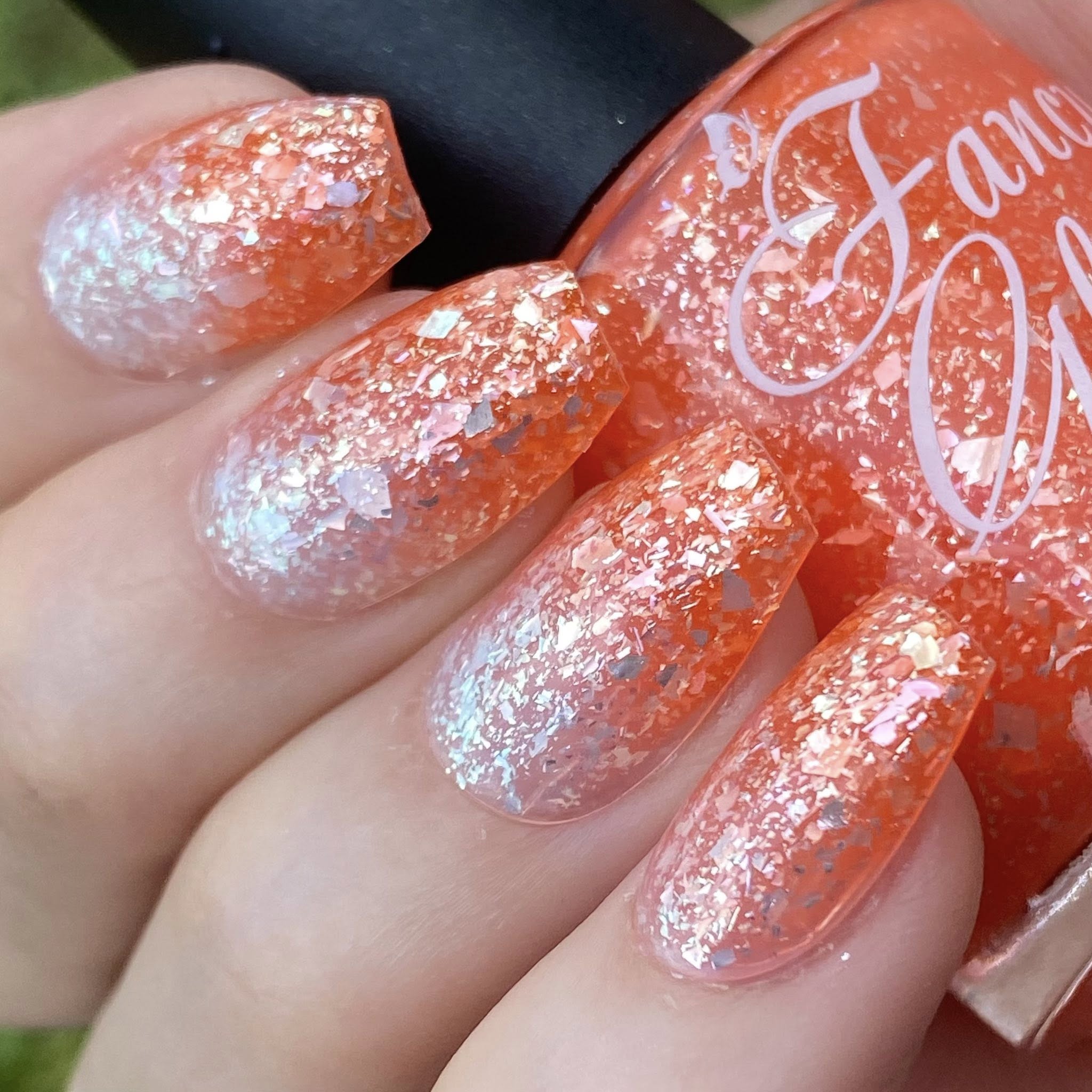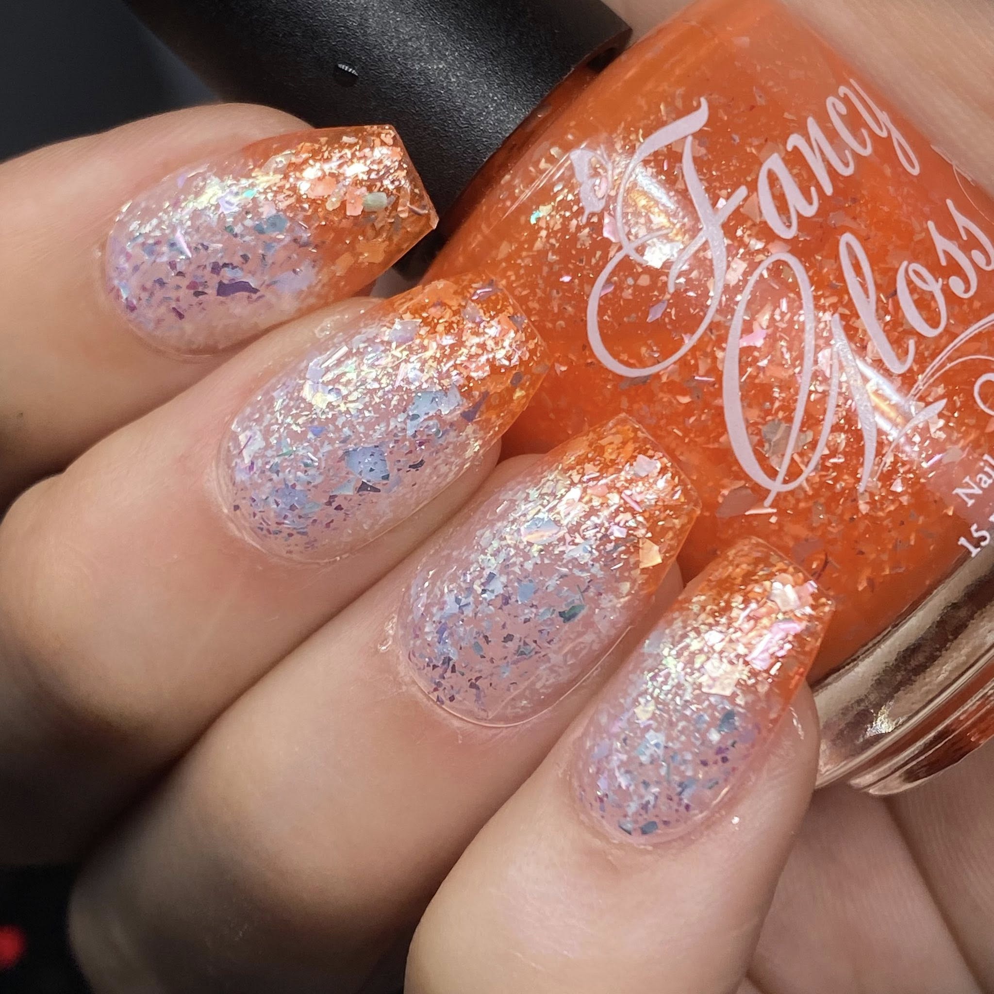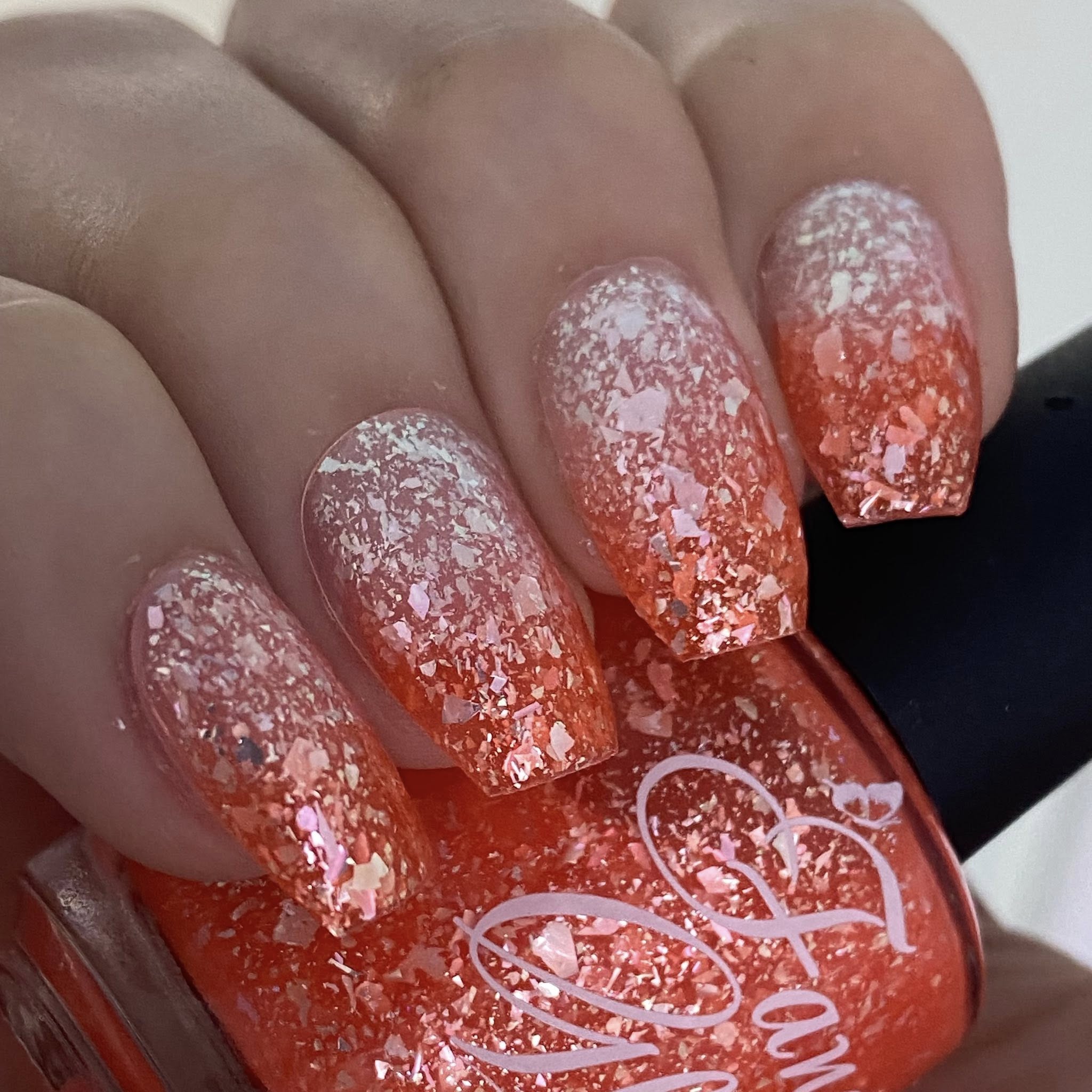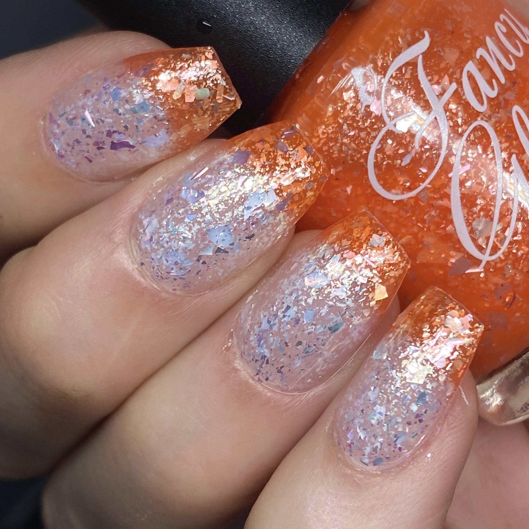 orange (cold) to white (warm) packed with silver/light blue/teal/light purple semi clear flakes