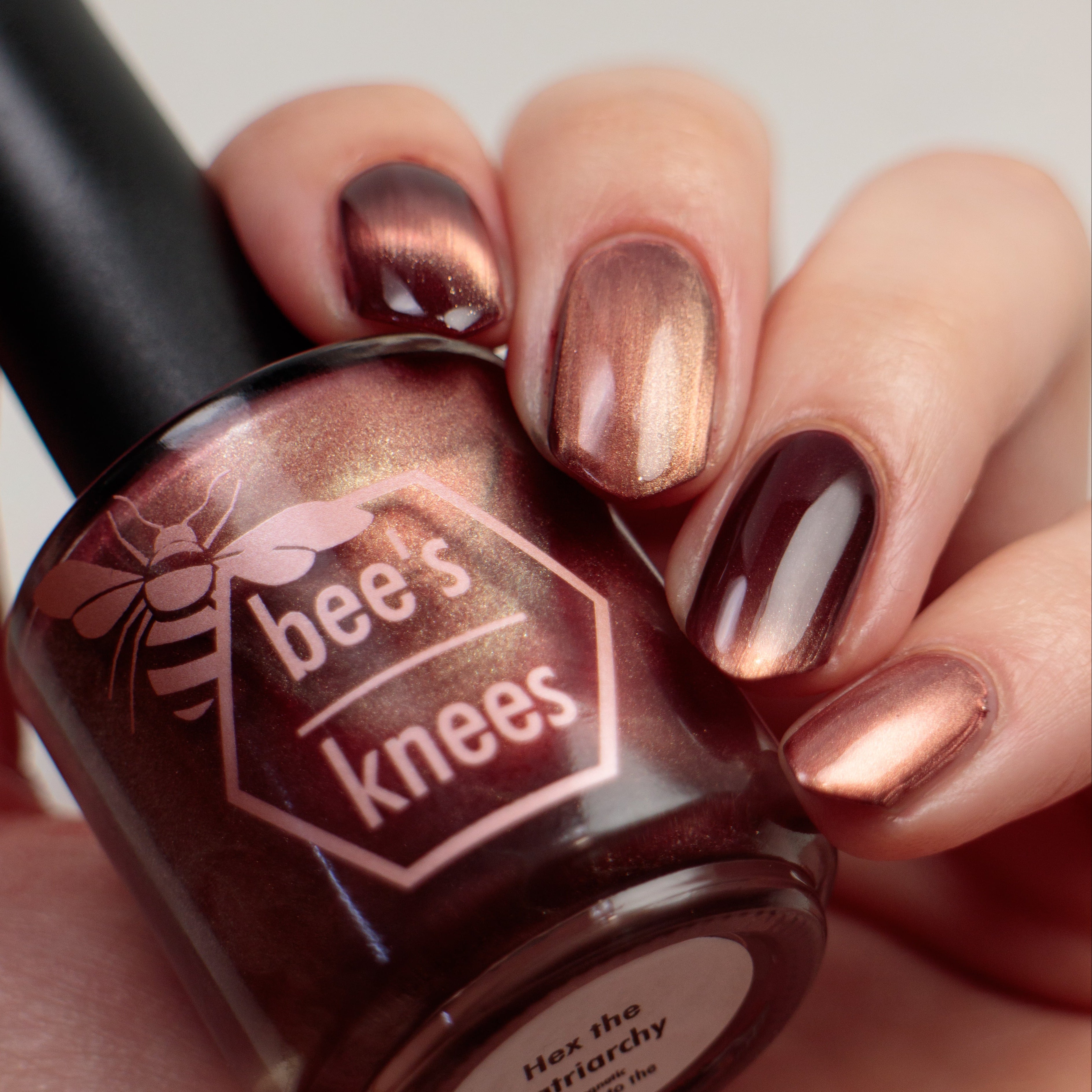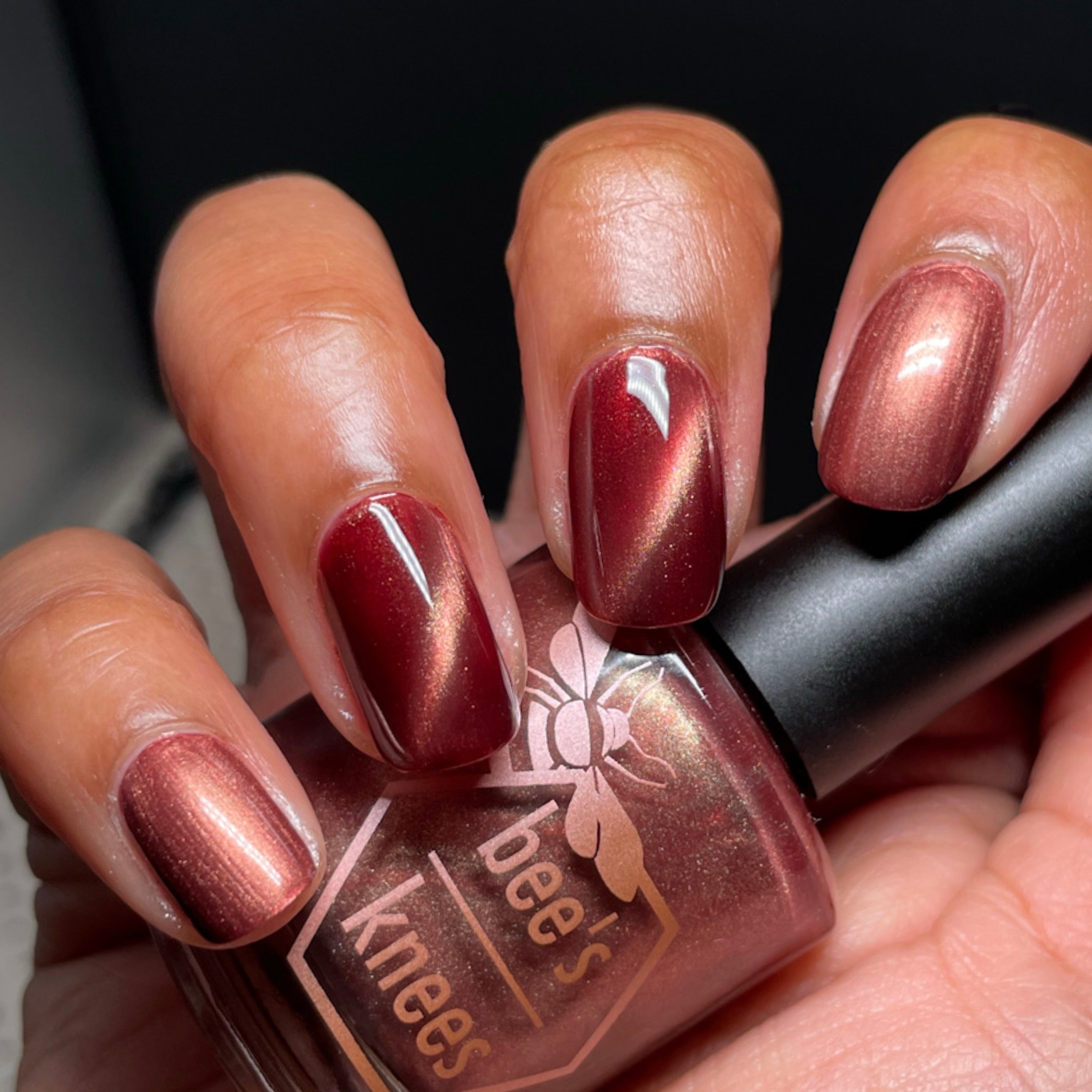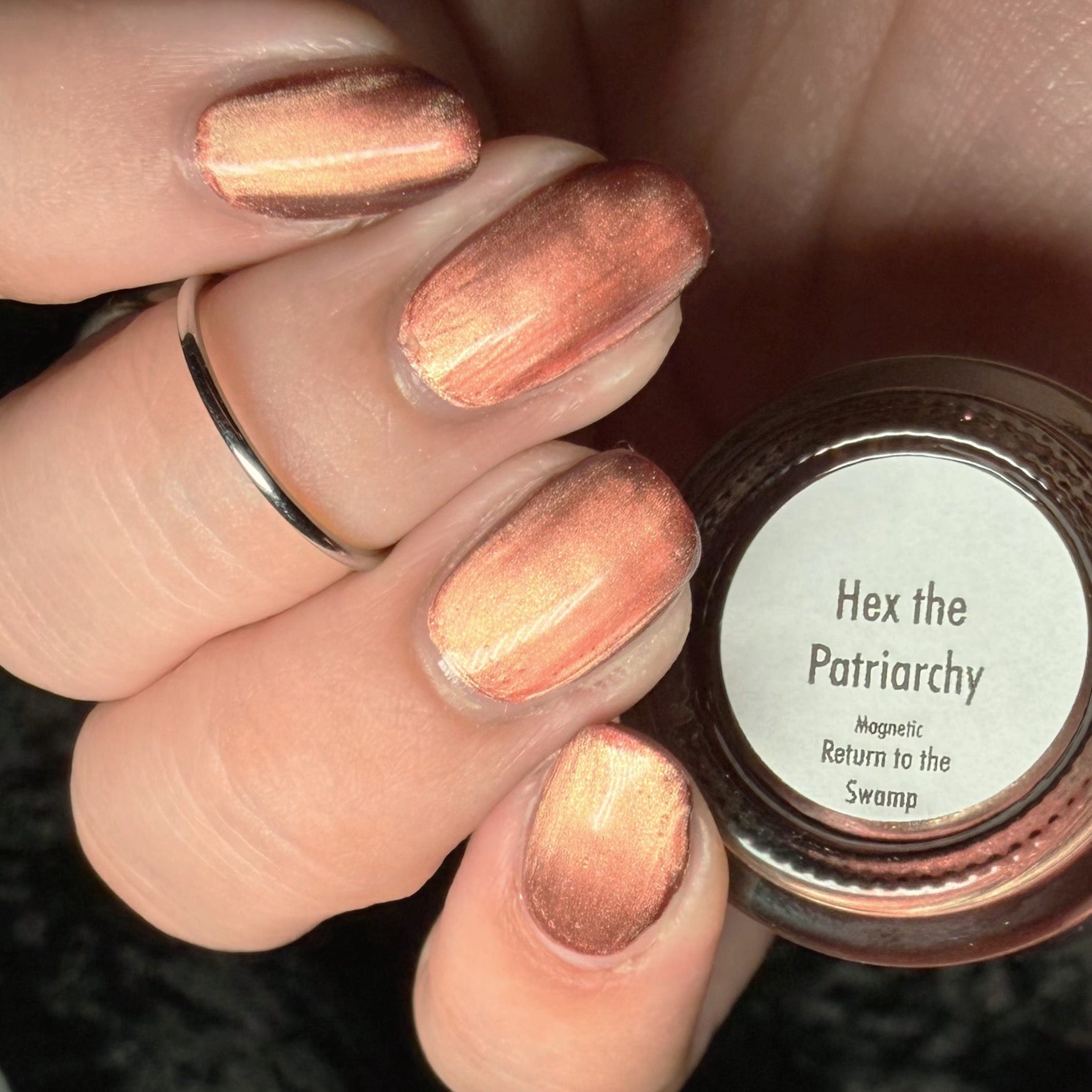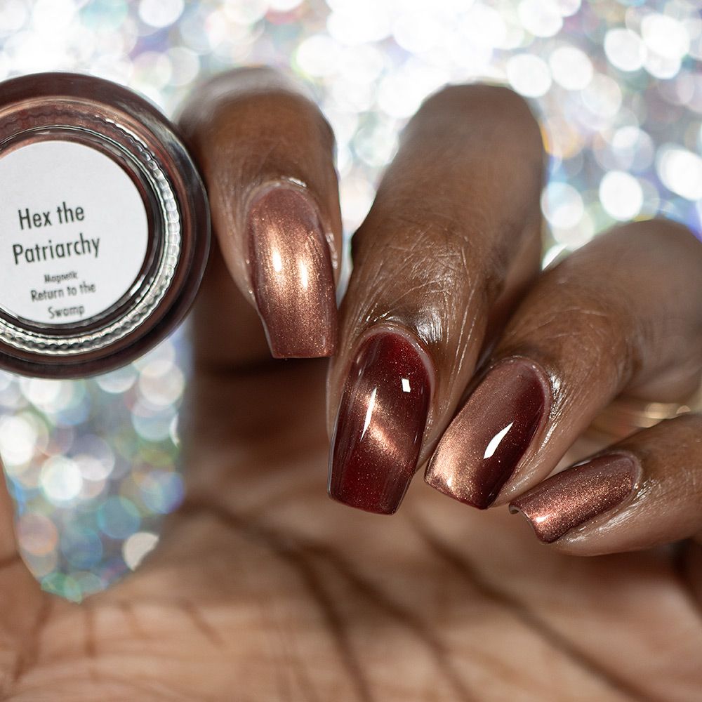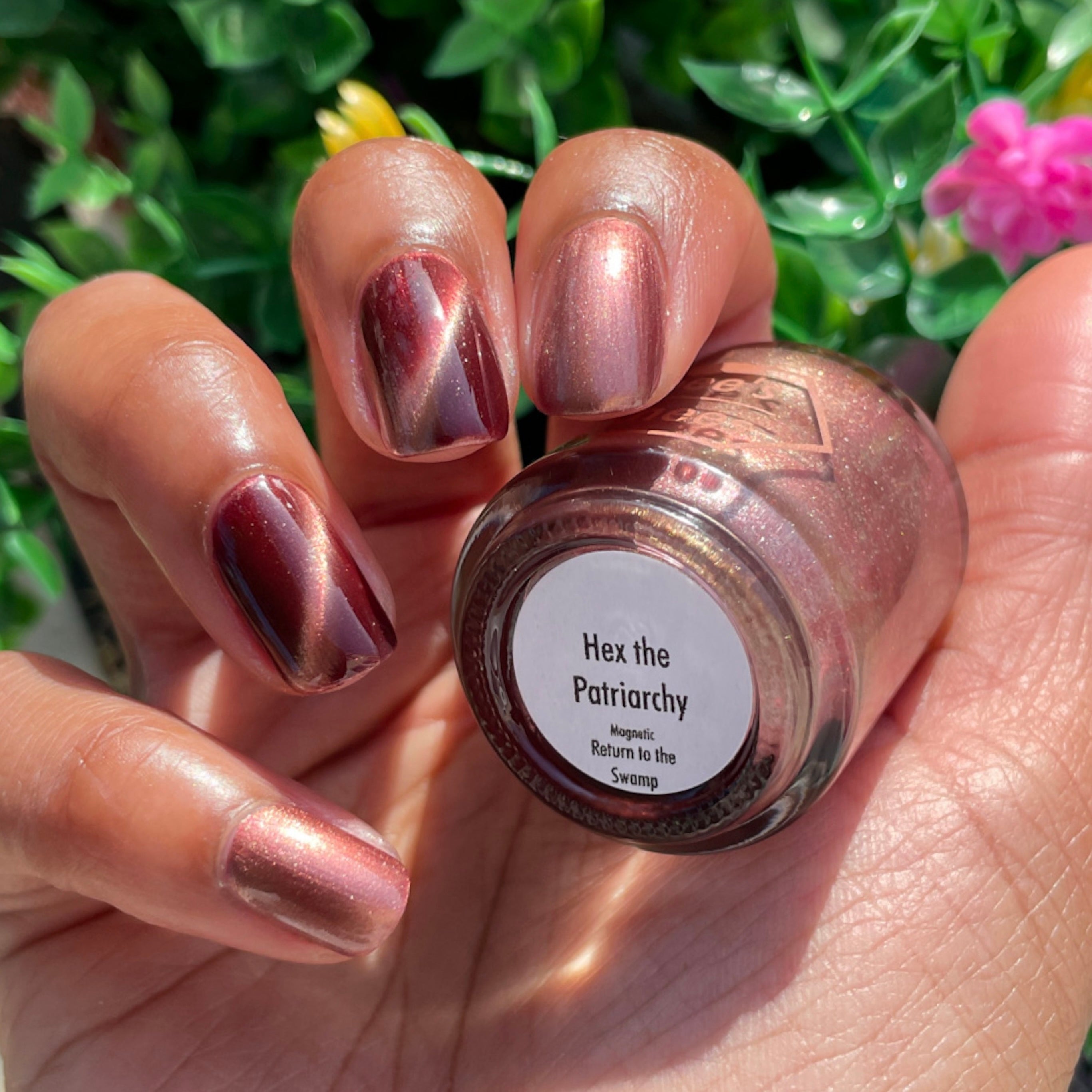 Hex the Patriachy - a burgundy Bog Dweller Sibling with silver magnetic shimmer that turns pale gold in the burgundy base.