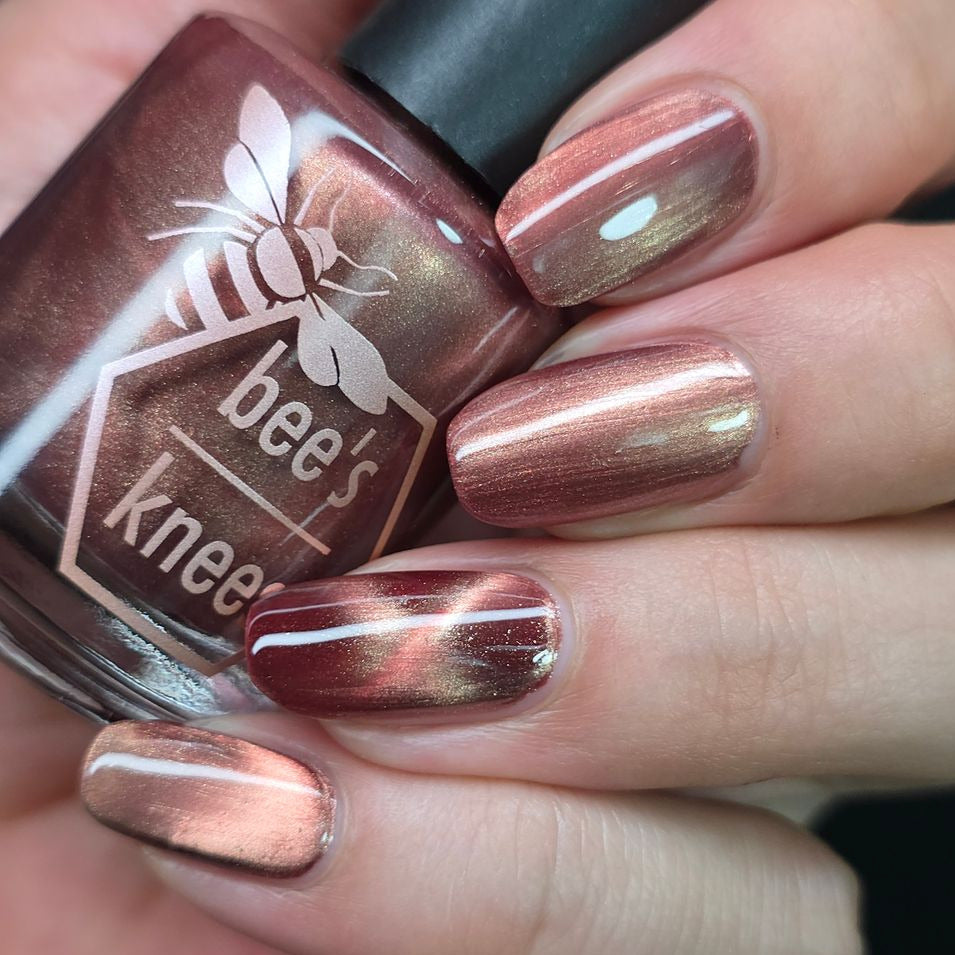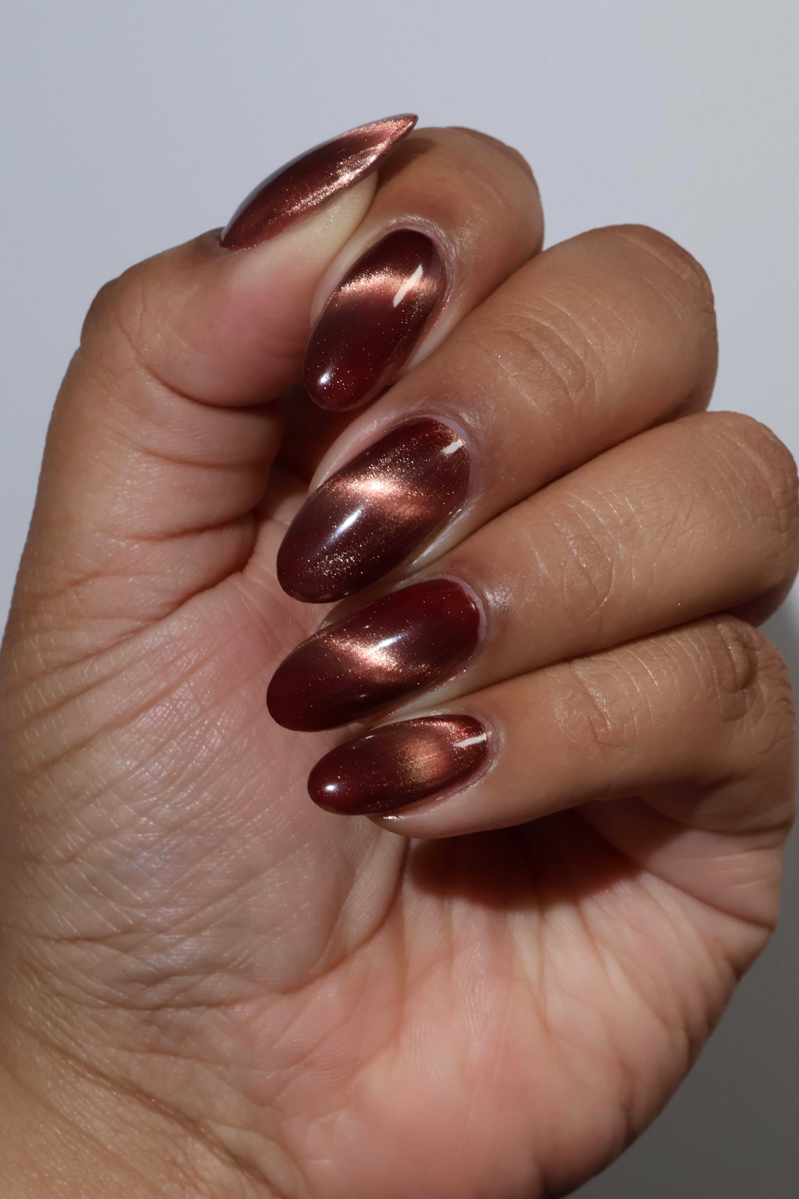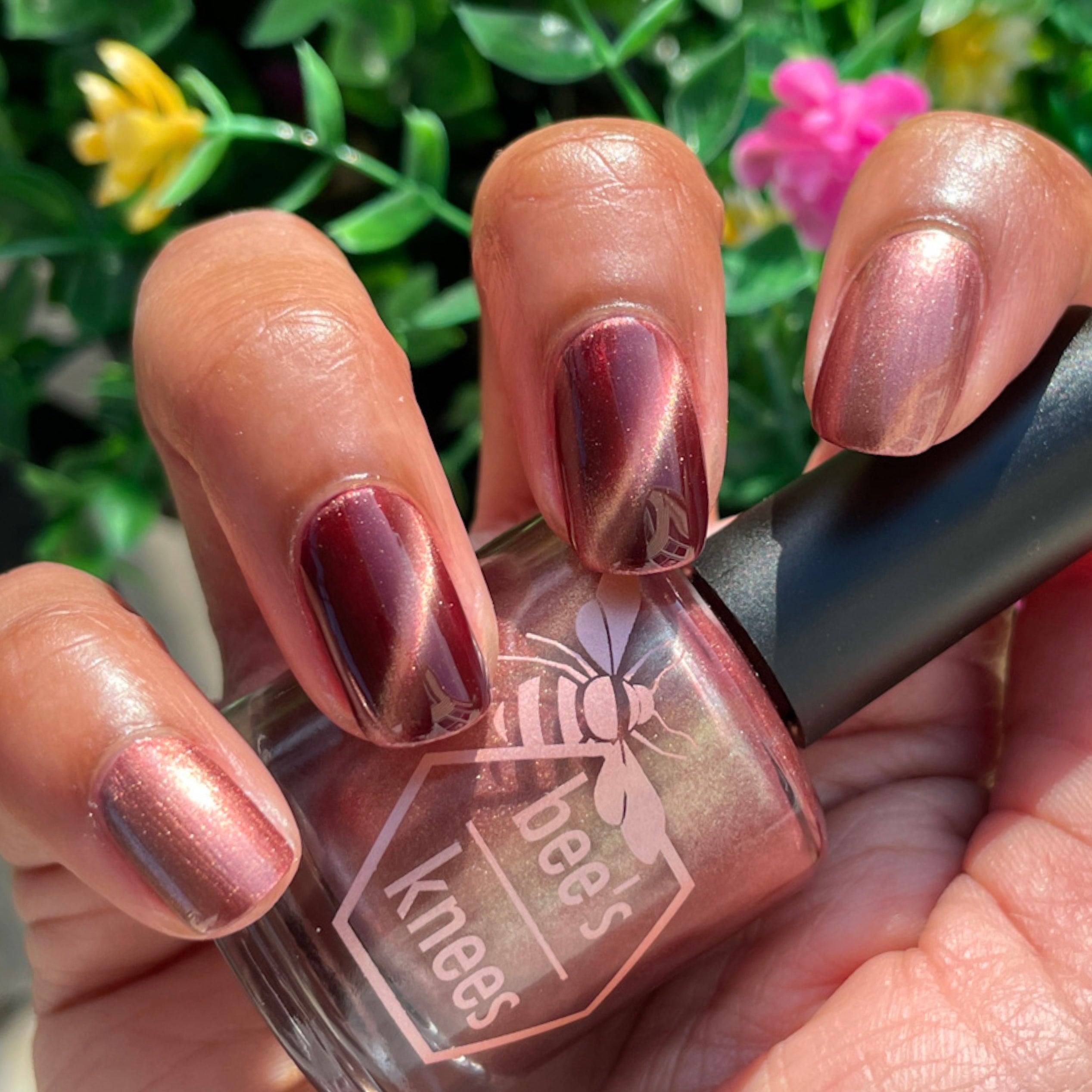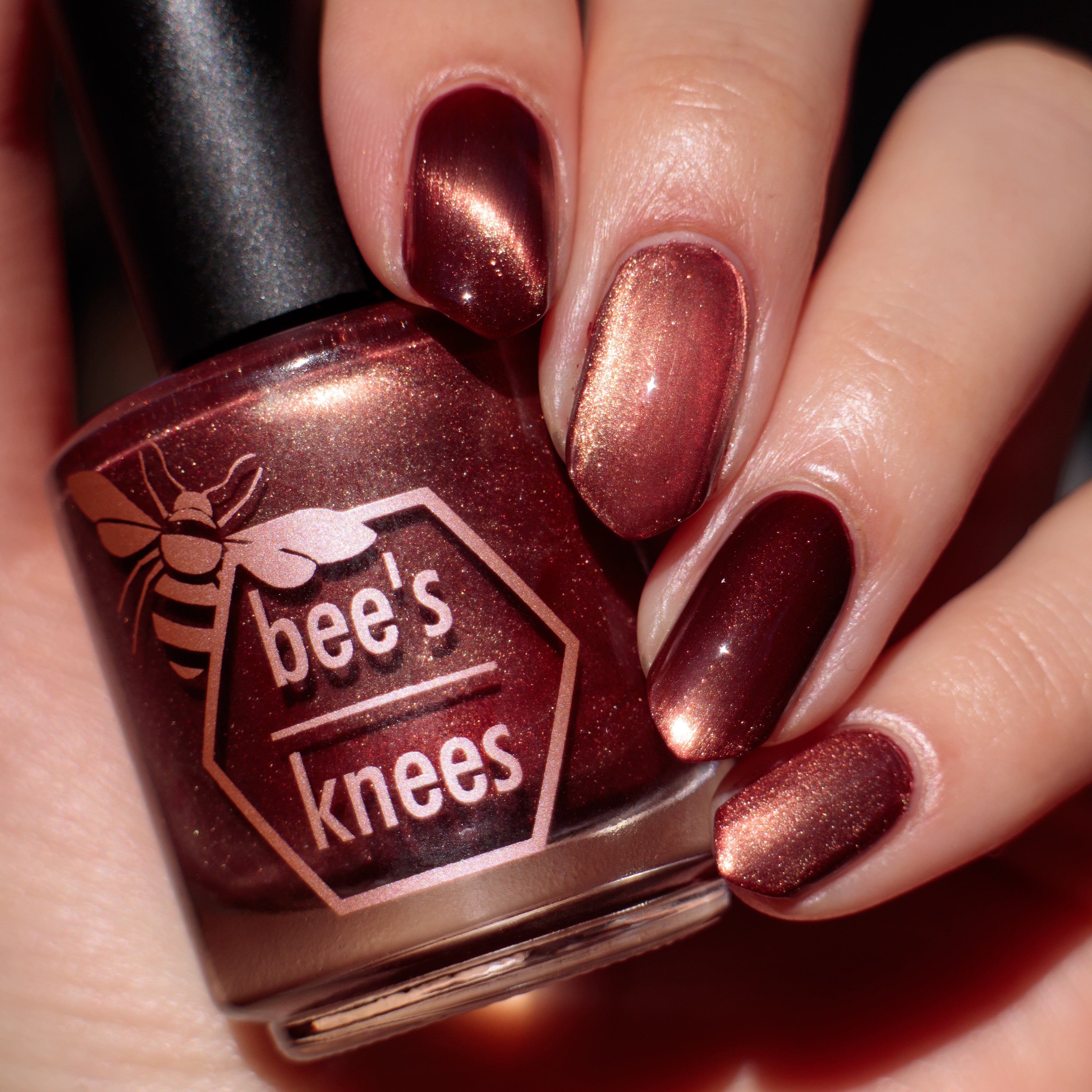 Hex the Patriachy - a burgundy Bog Dweller Sibling with silver magnetic shimmer that turns pale gold in the burgundy base.