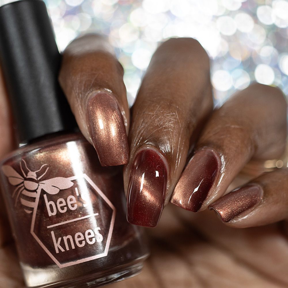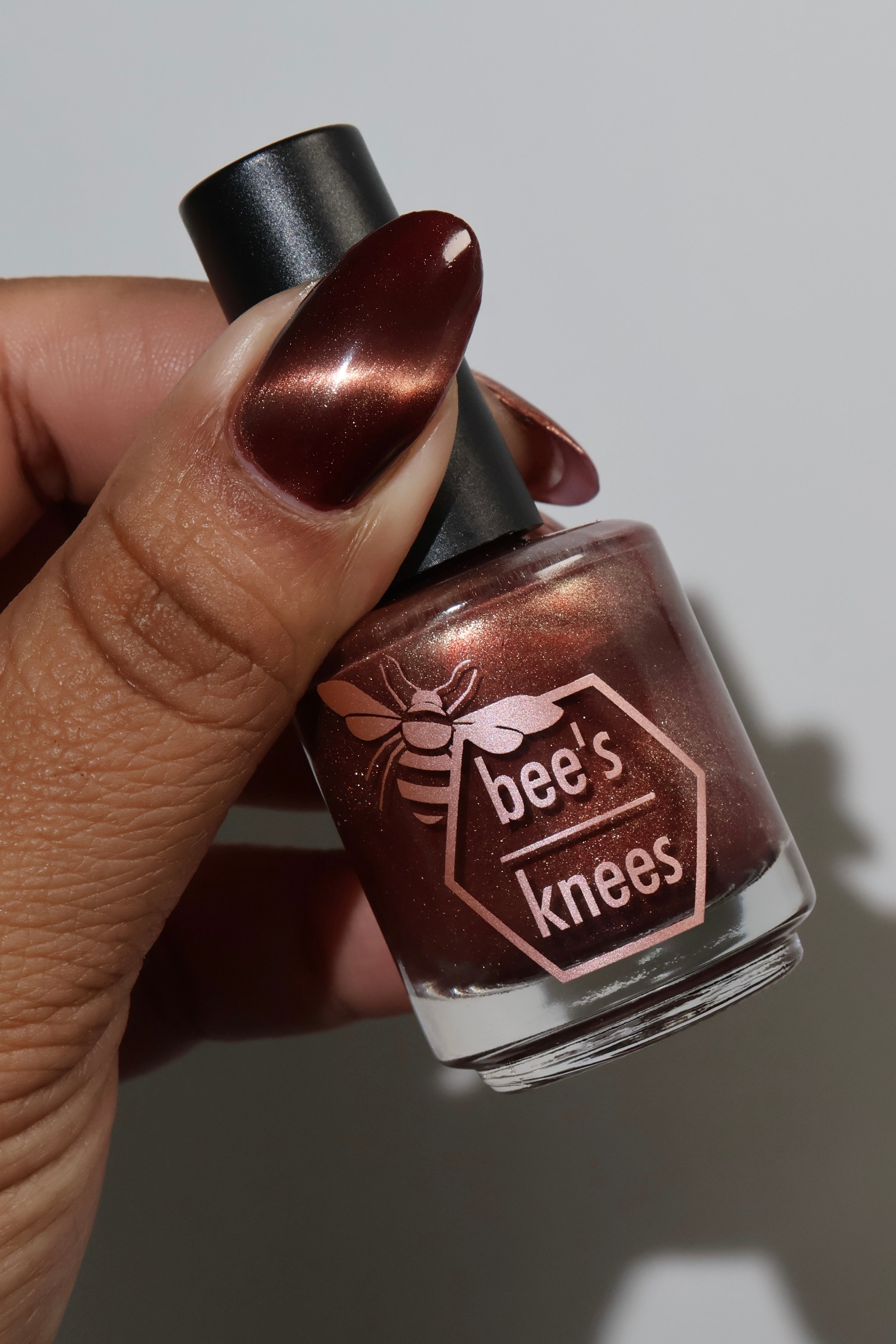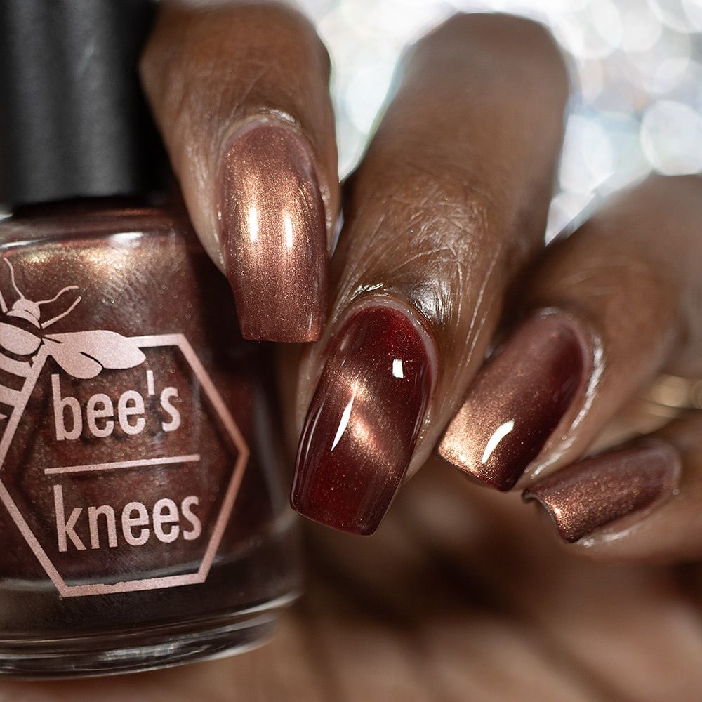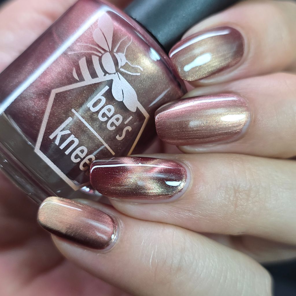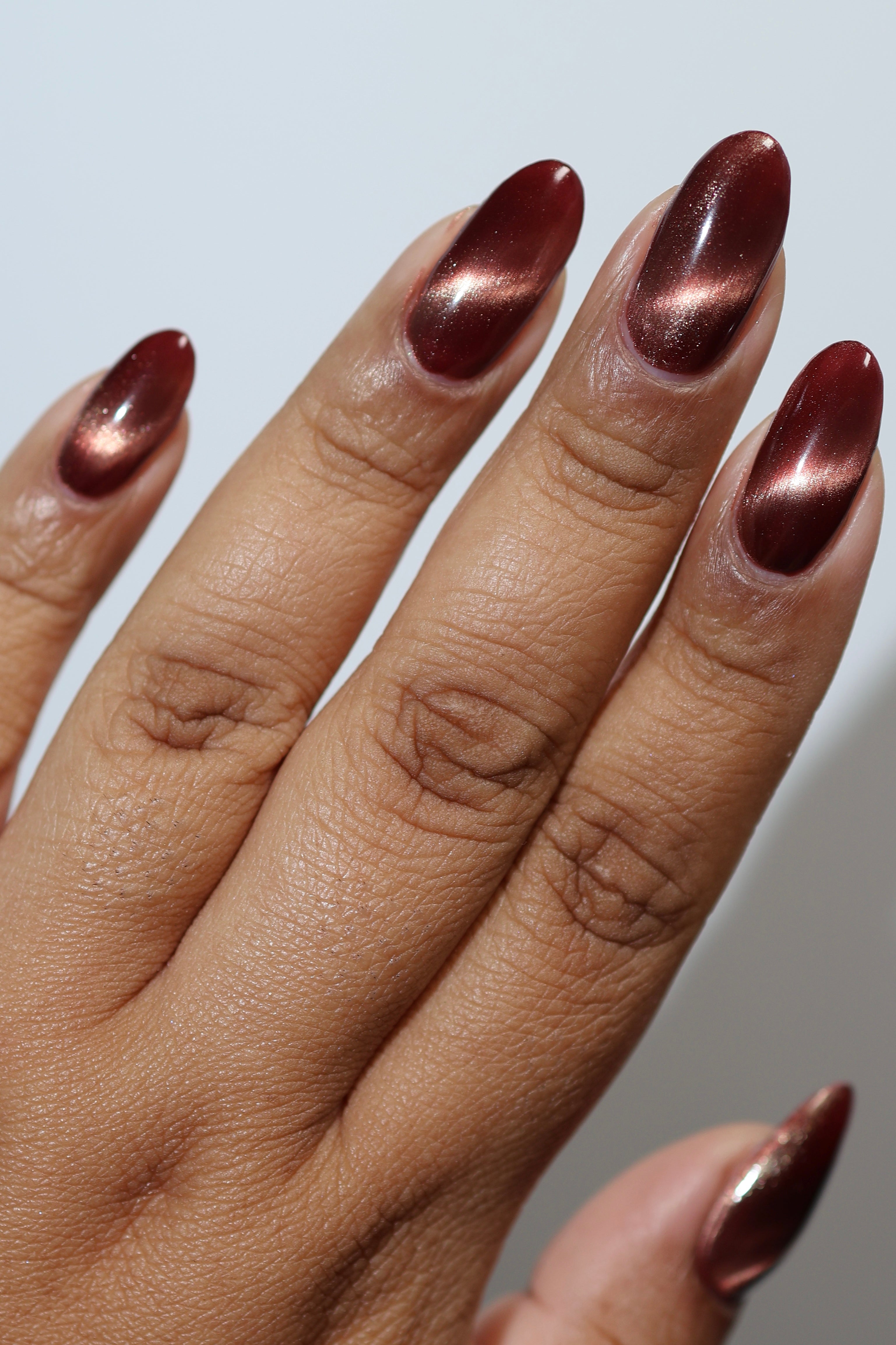 Hex the Patriachy - a burgundy Bog Dweller Sibling with silver magnetic shimmer that turns pale gold in the burgundy base.