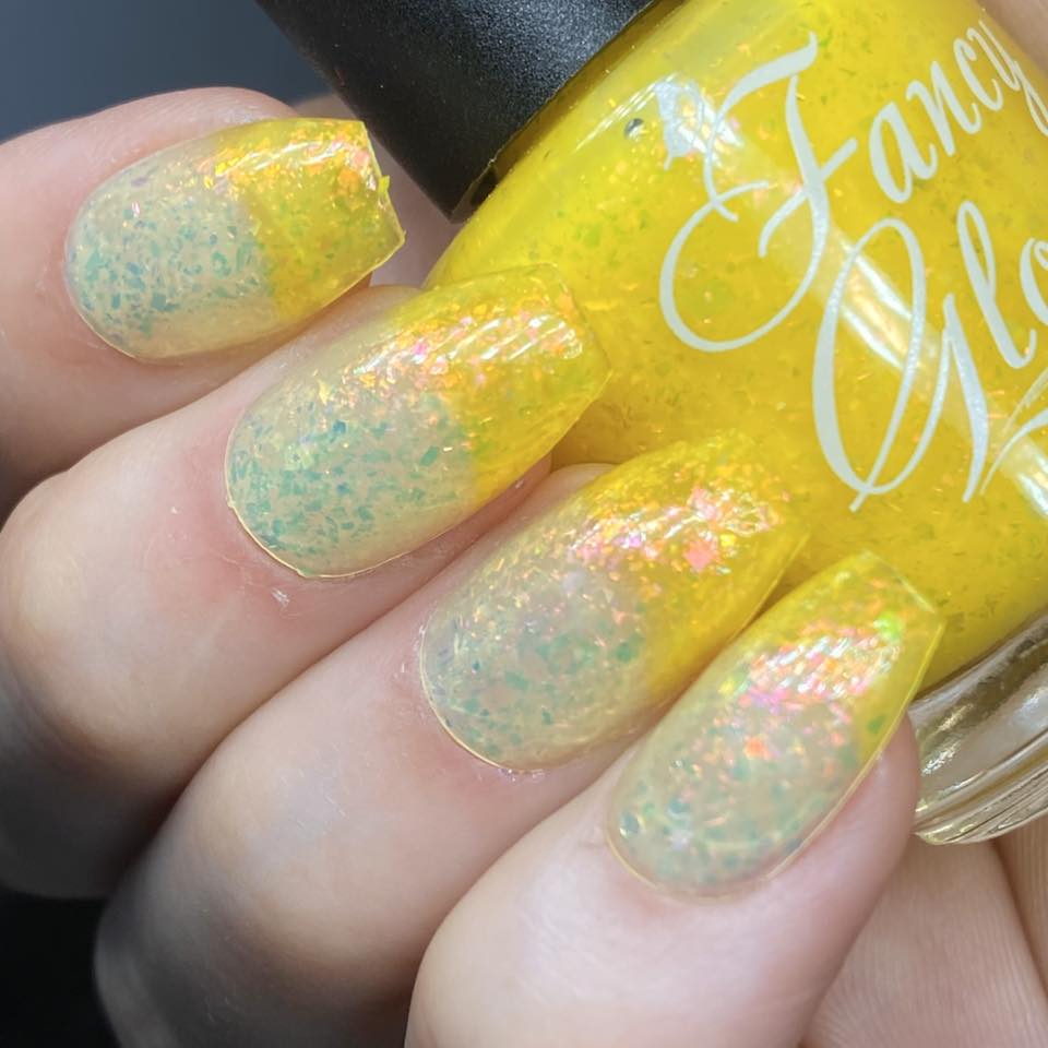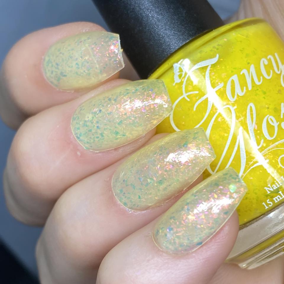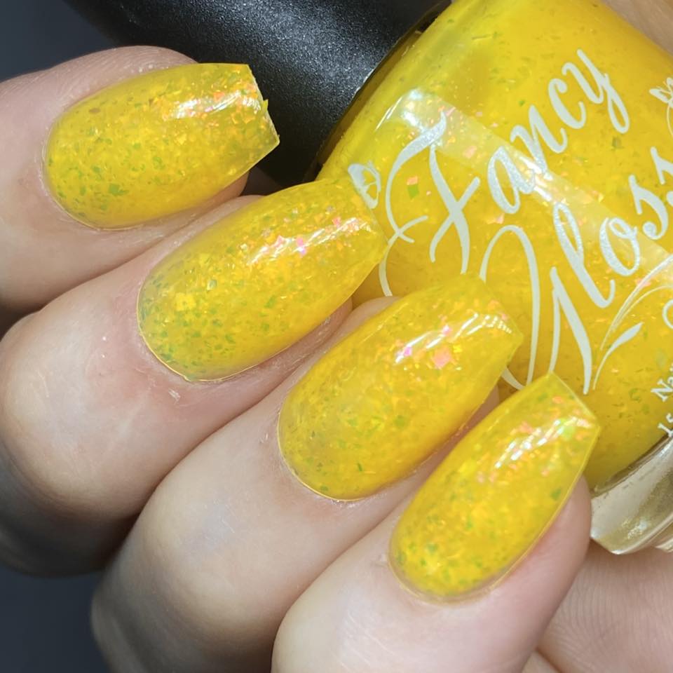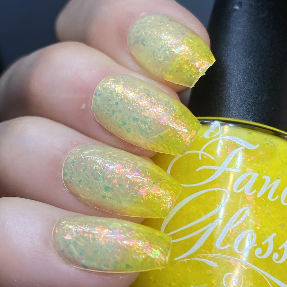 Yellow (cold) to pale yellow (warm) packed with pink/purple/green/copper/gold clear flakes.