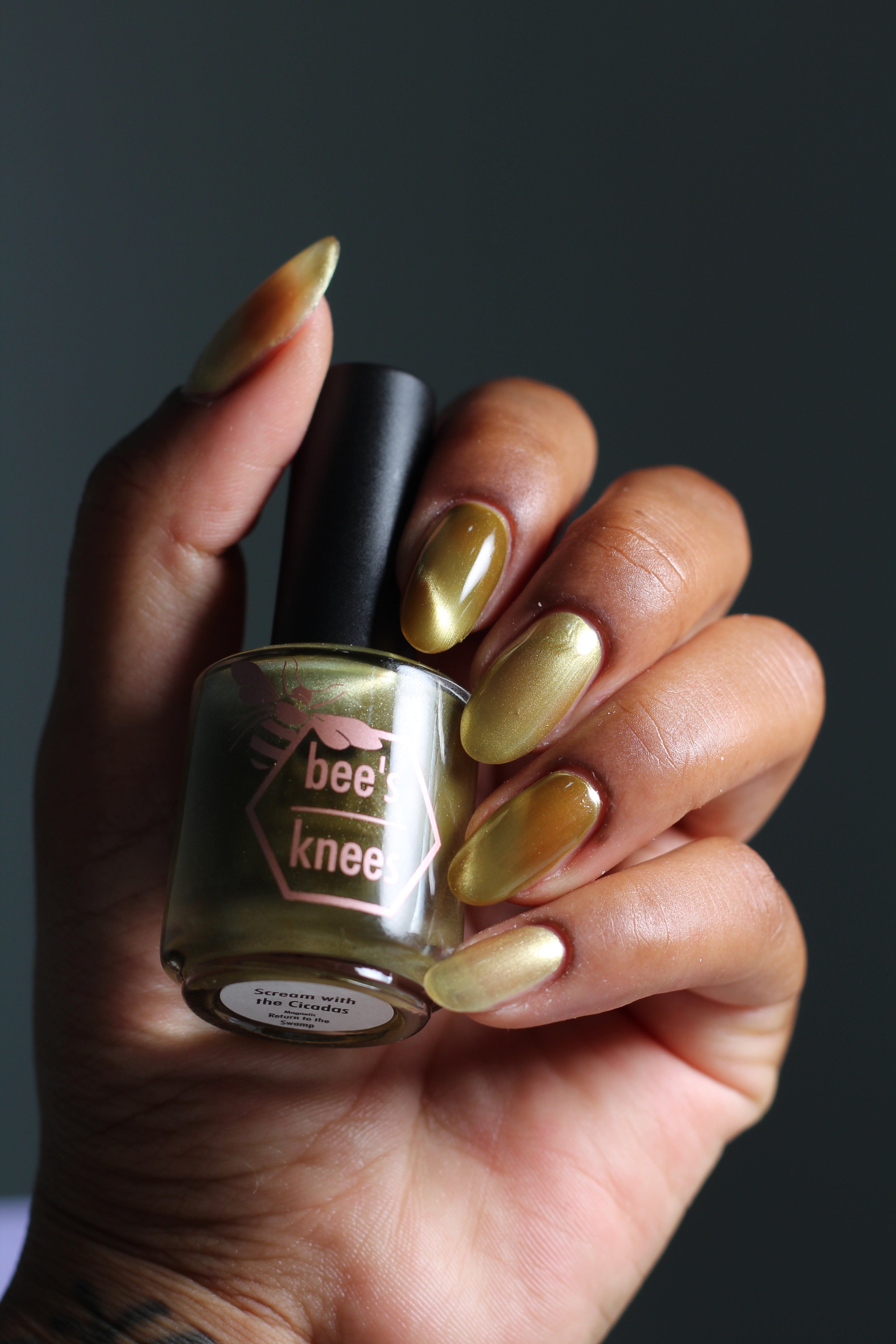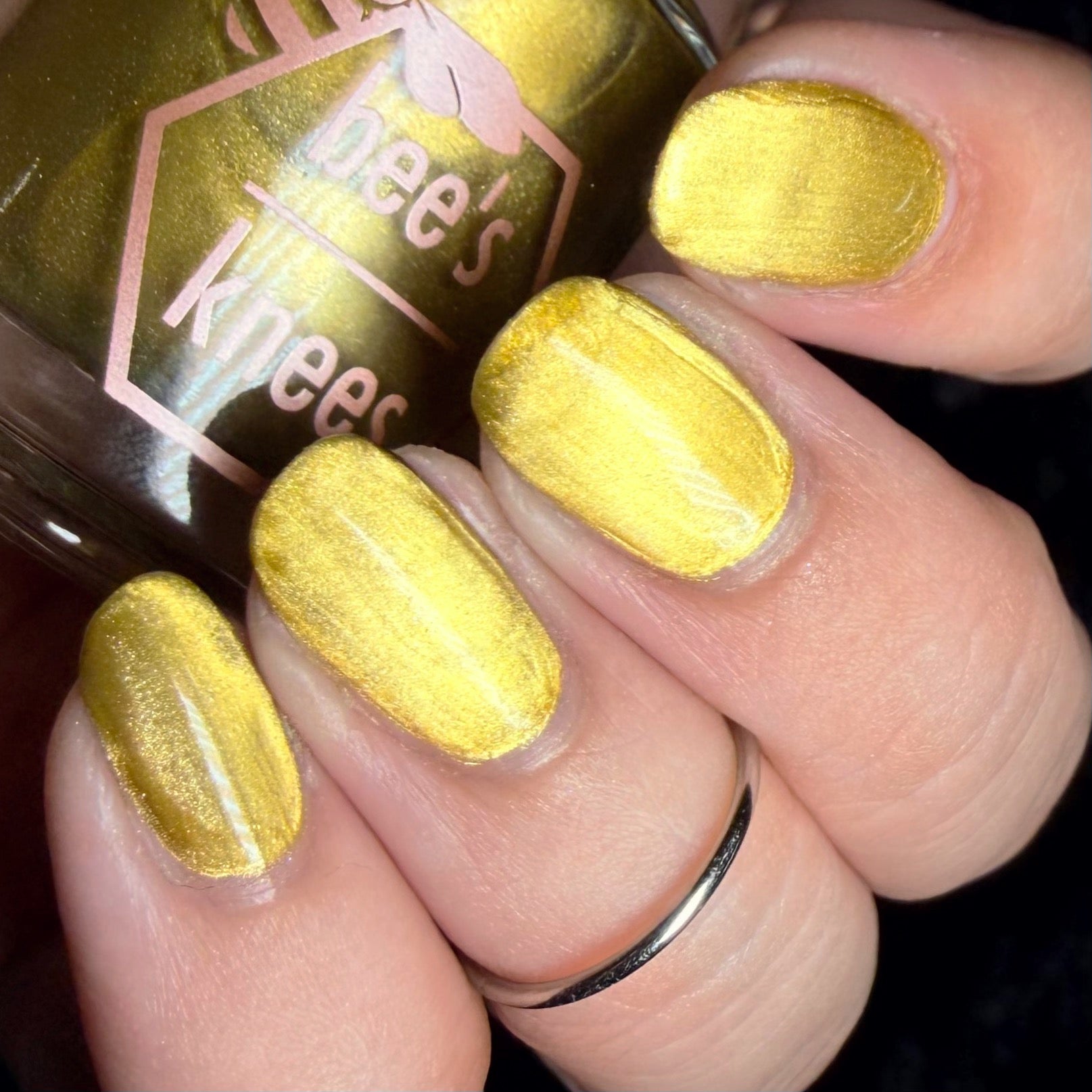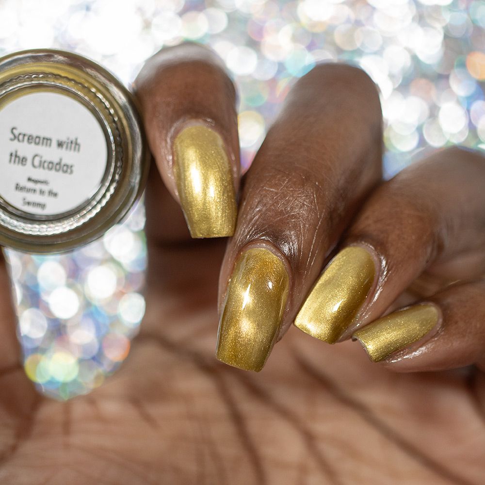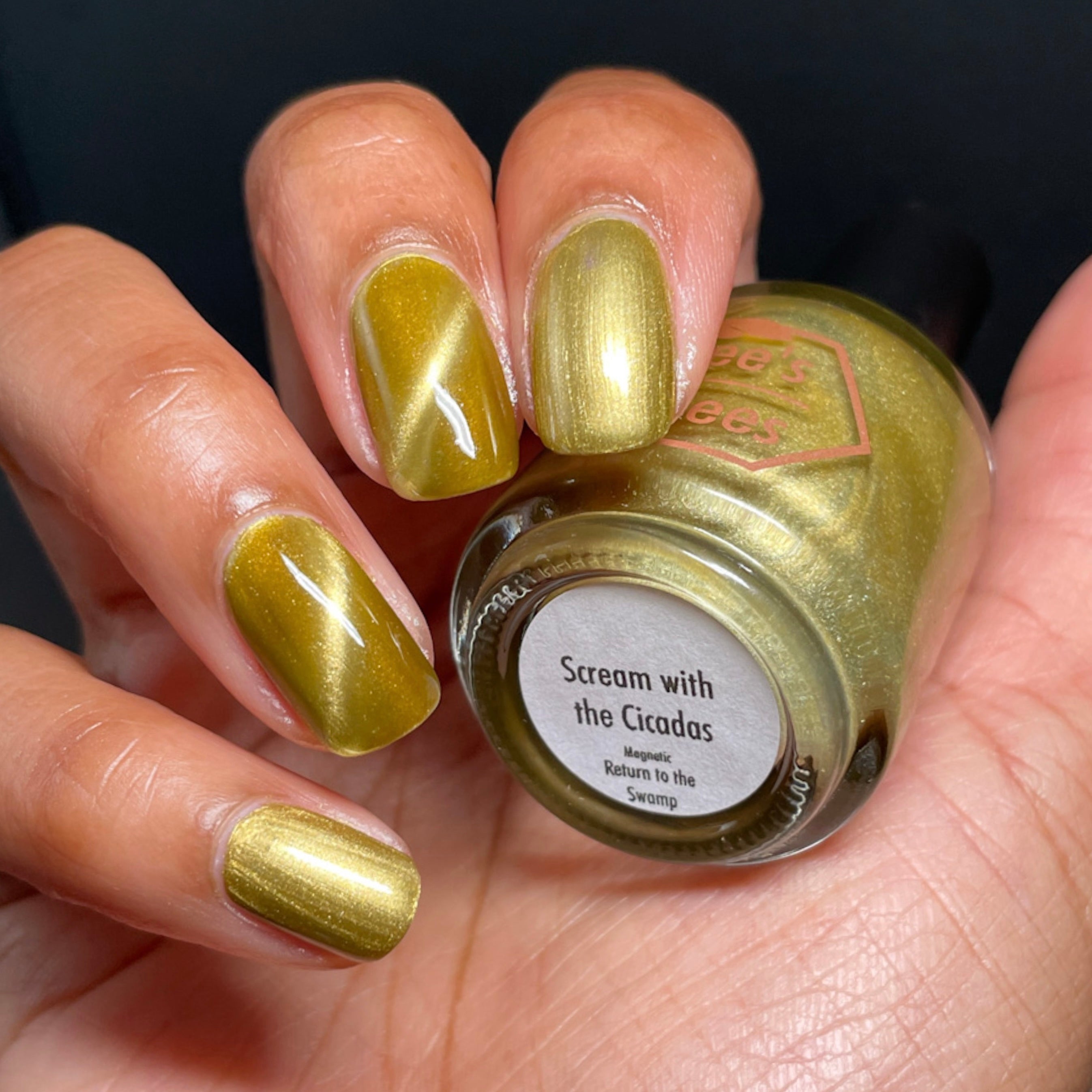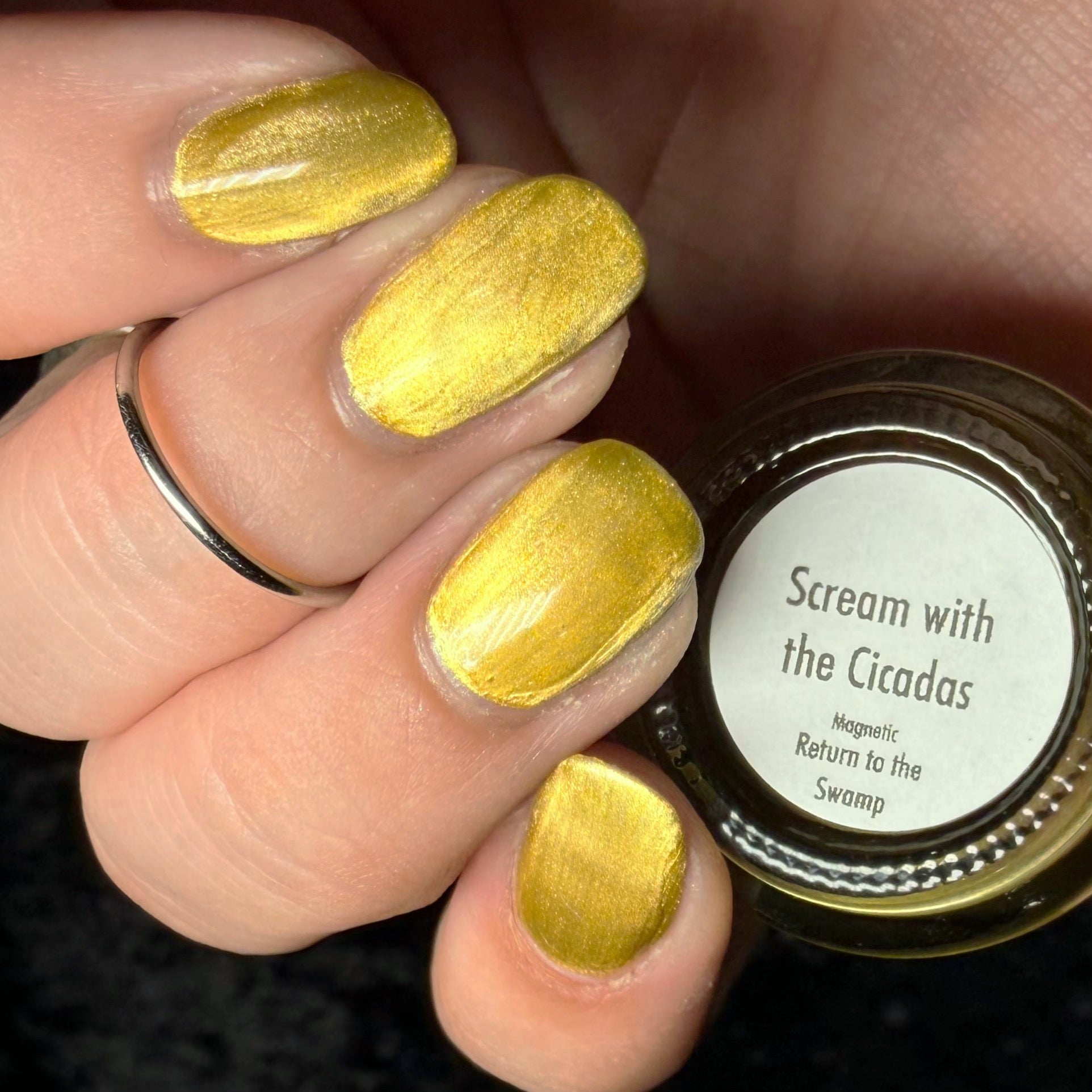 Scream with the Cicadas - a golden mustard Bog Dweller Sibling with silver magnetic shimmer that turns gold in the mustard base.