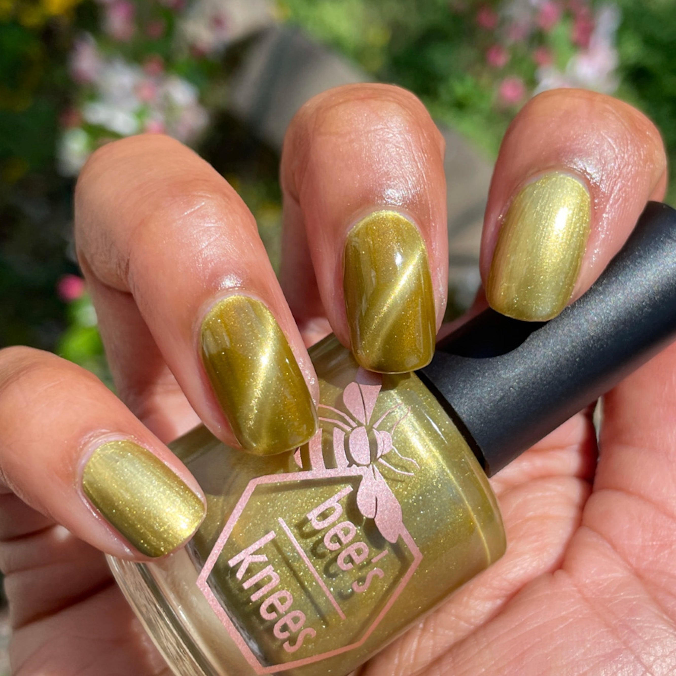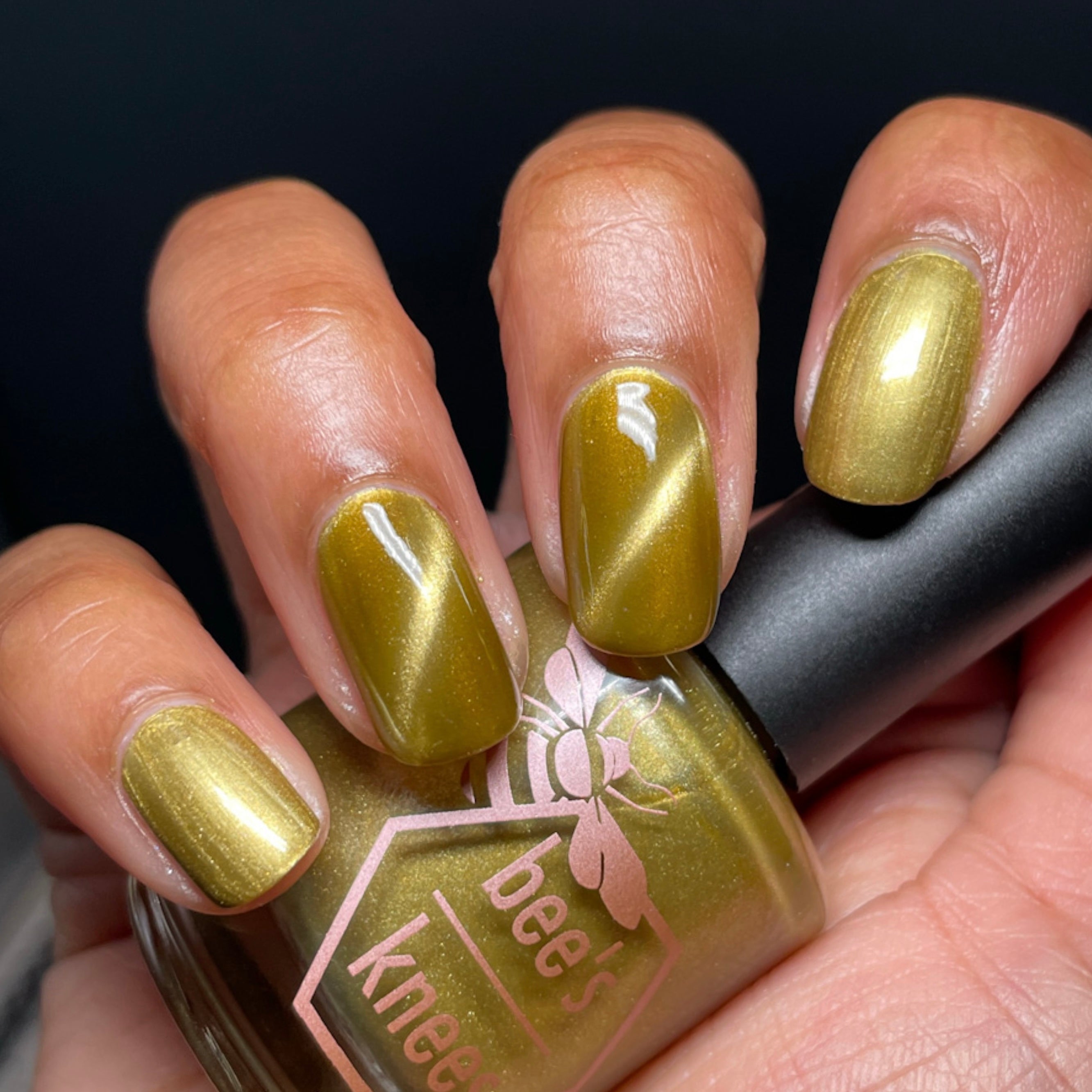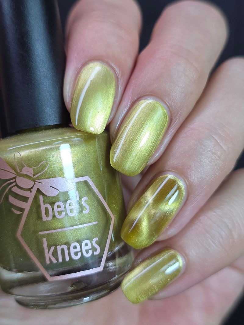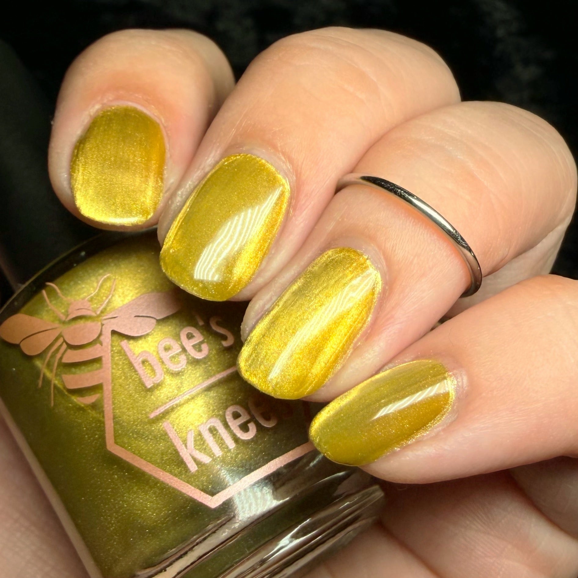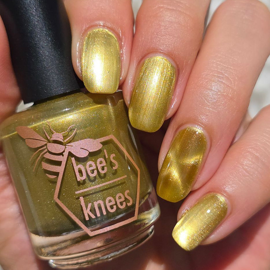 Scream with the Cicadas - a golden mustard Bog Dweller Sibling with silver magnetic shimmer that turns gold in the mustard base.