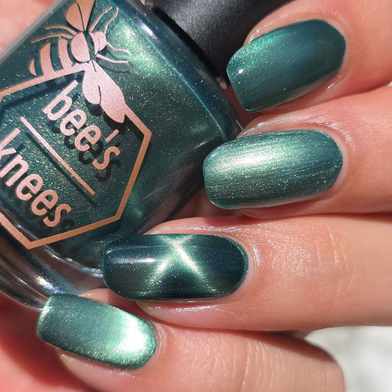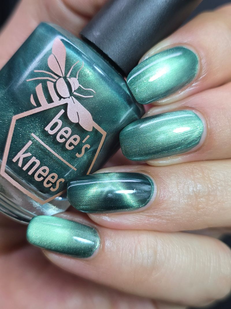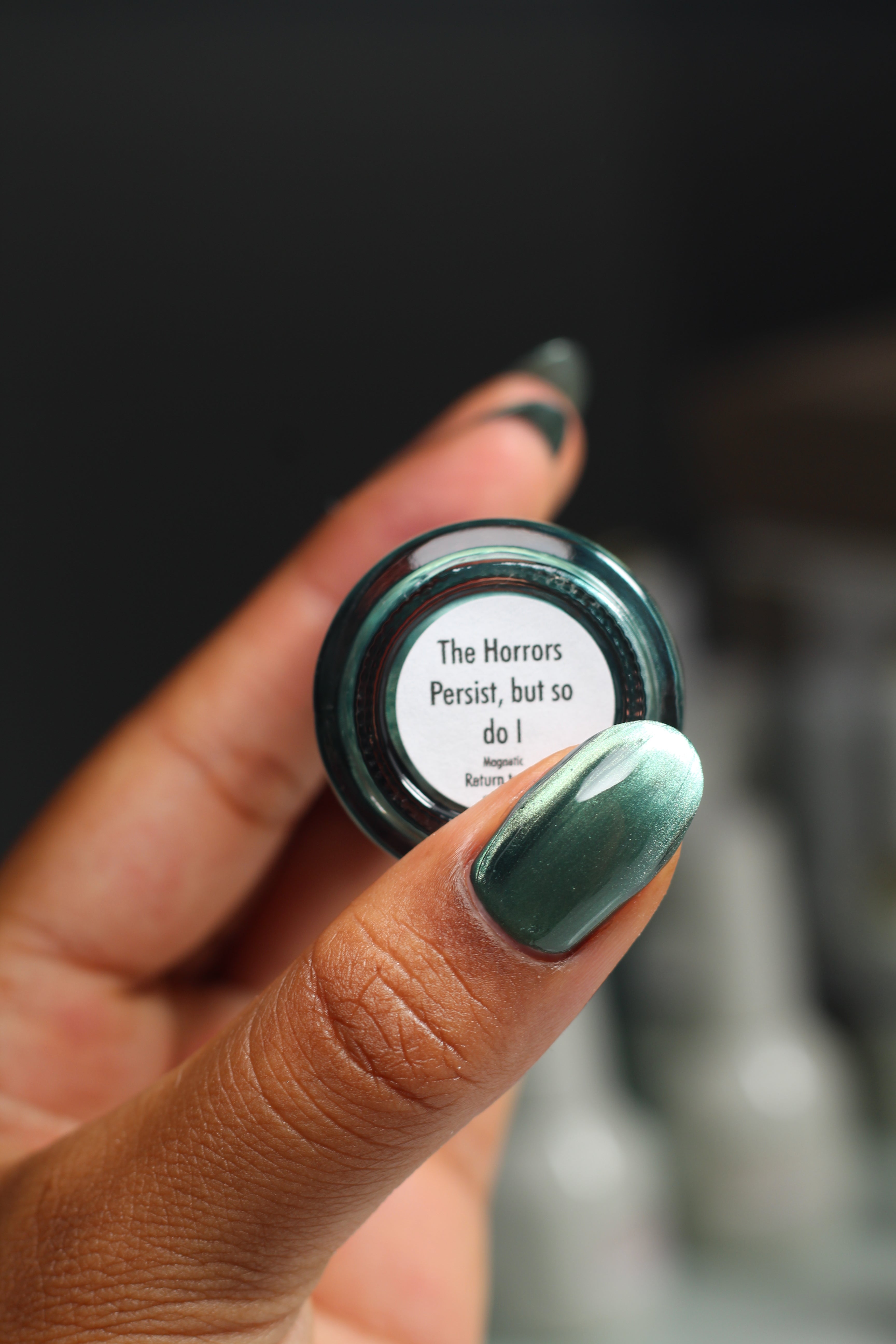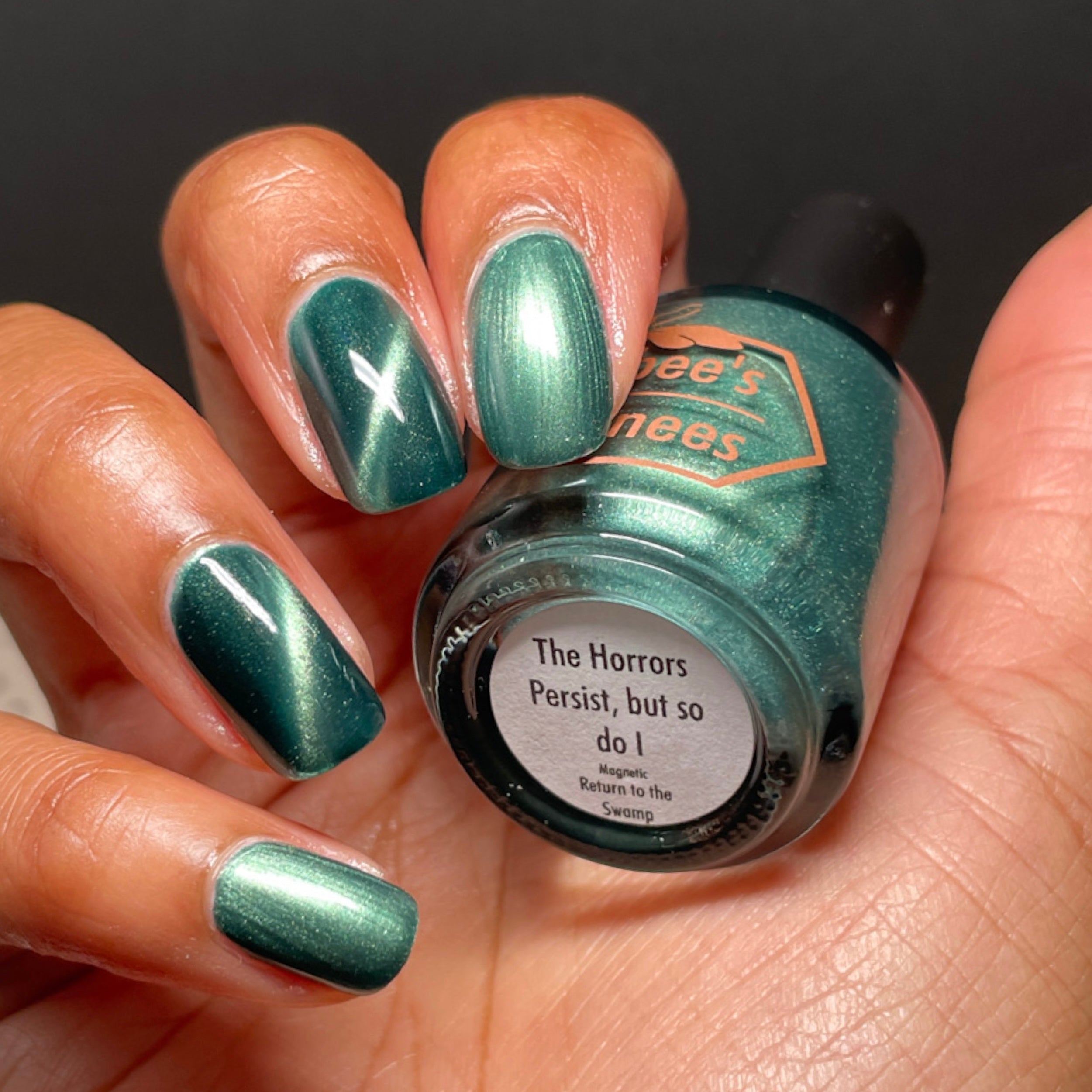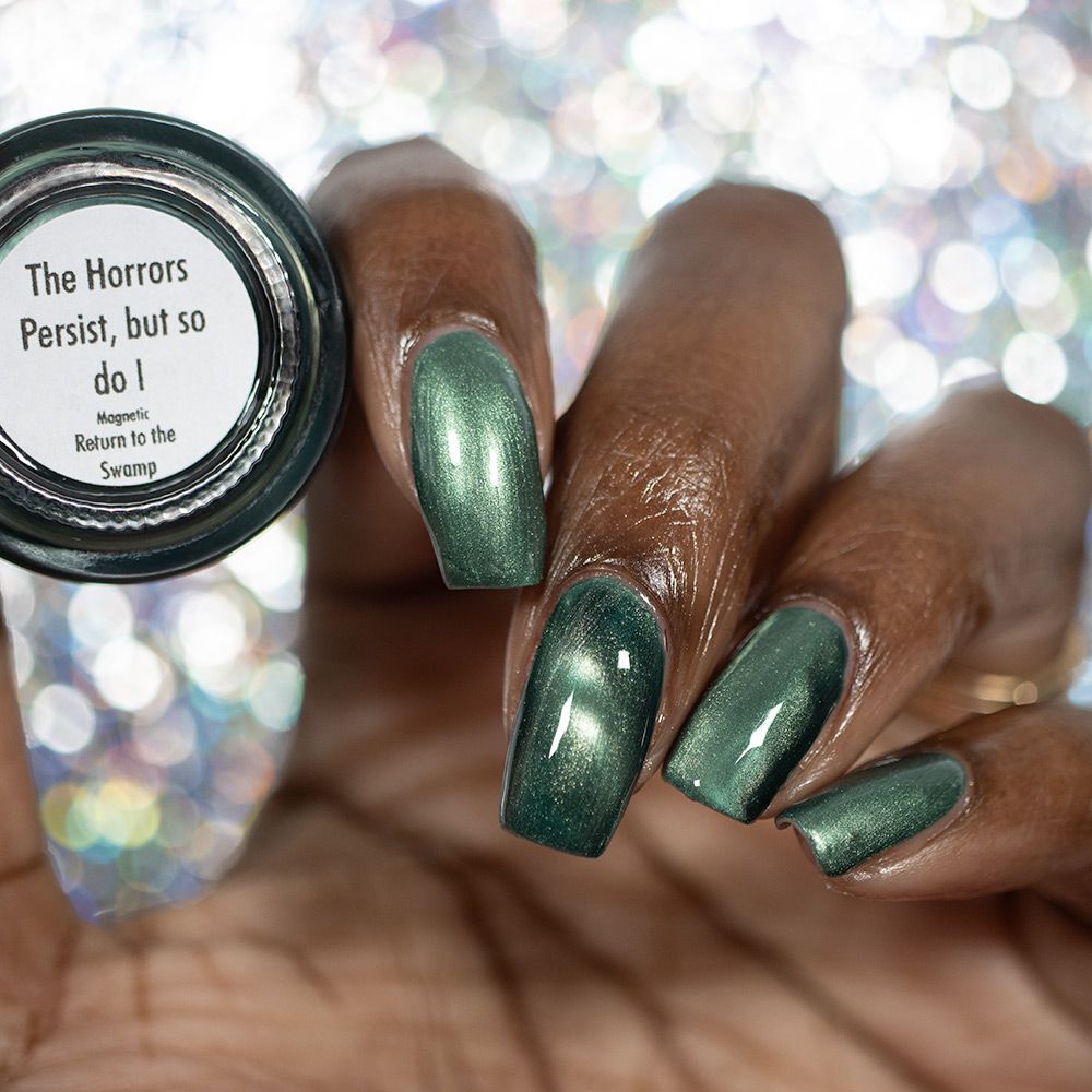 The Horrors Persist but So Do I - a dark teal Bog Dweller Sibling with silver magnetic shimmer.